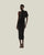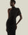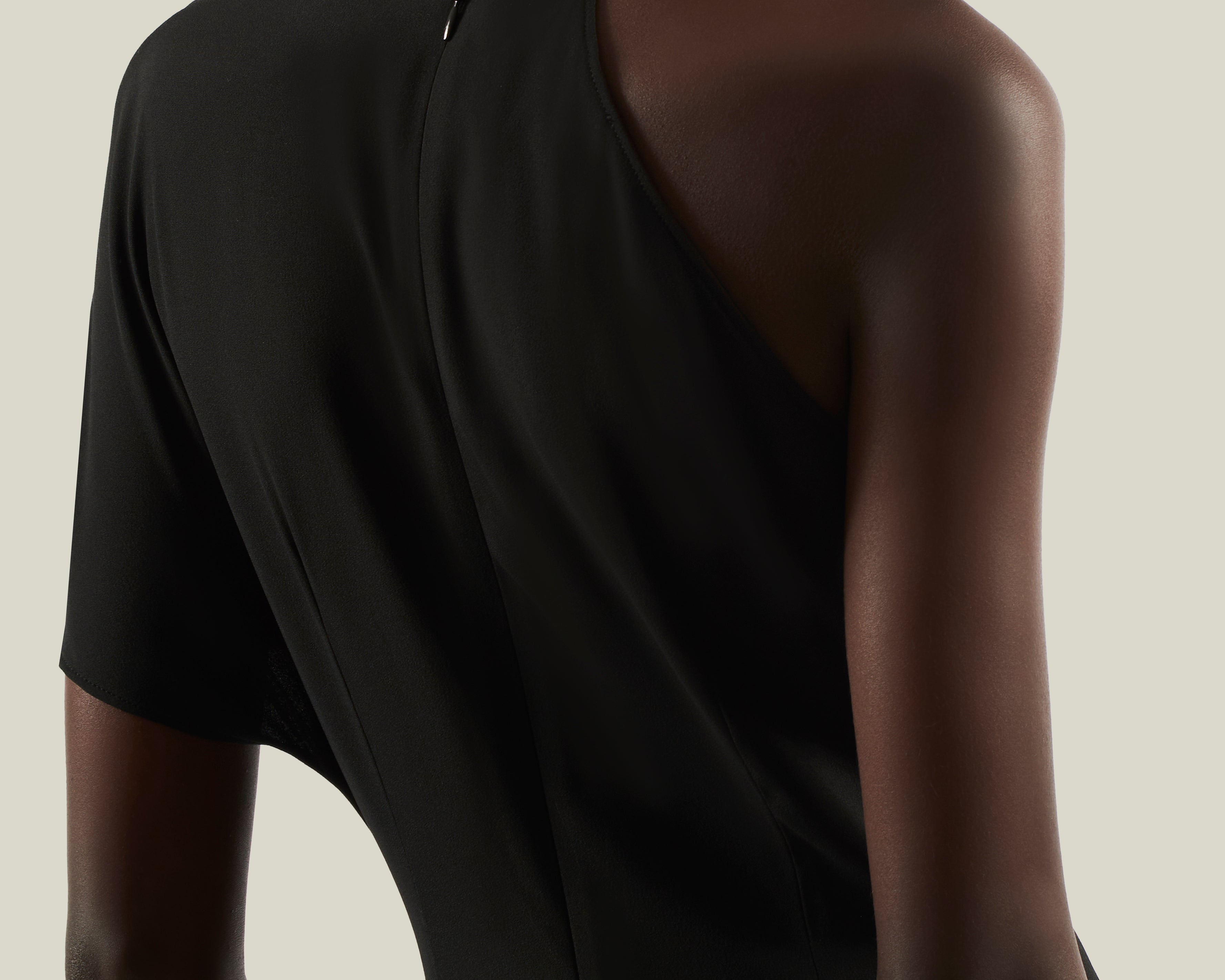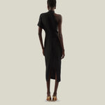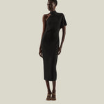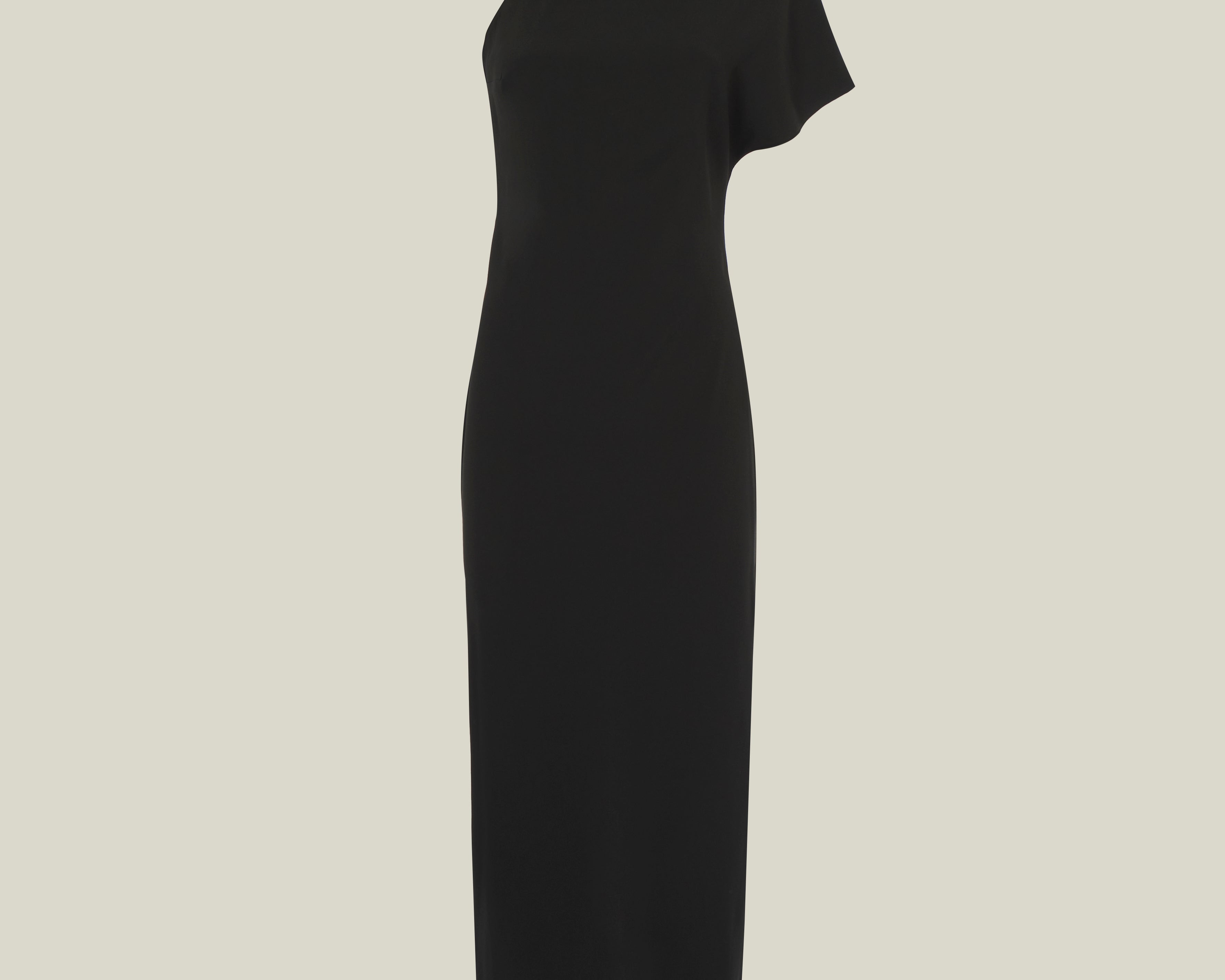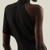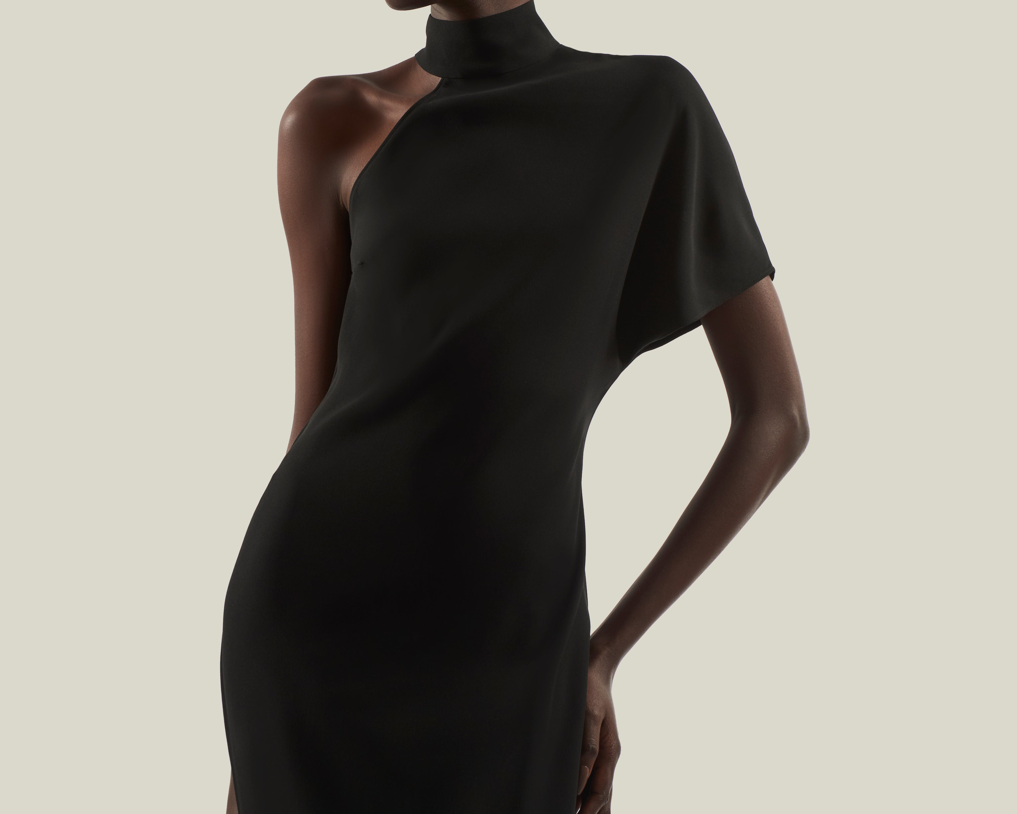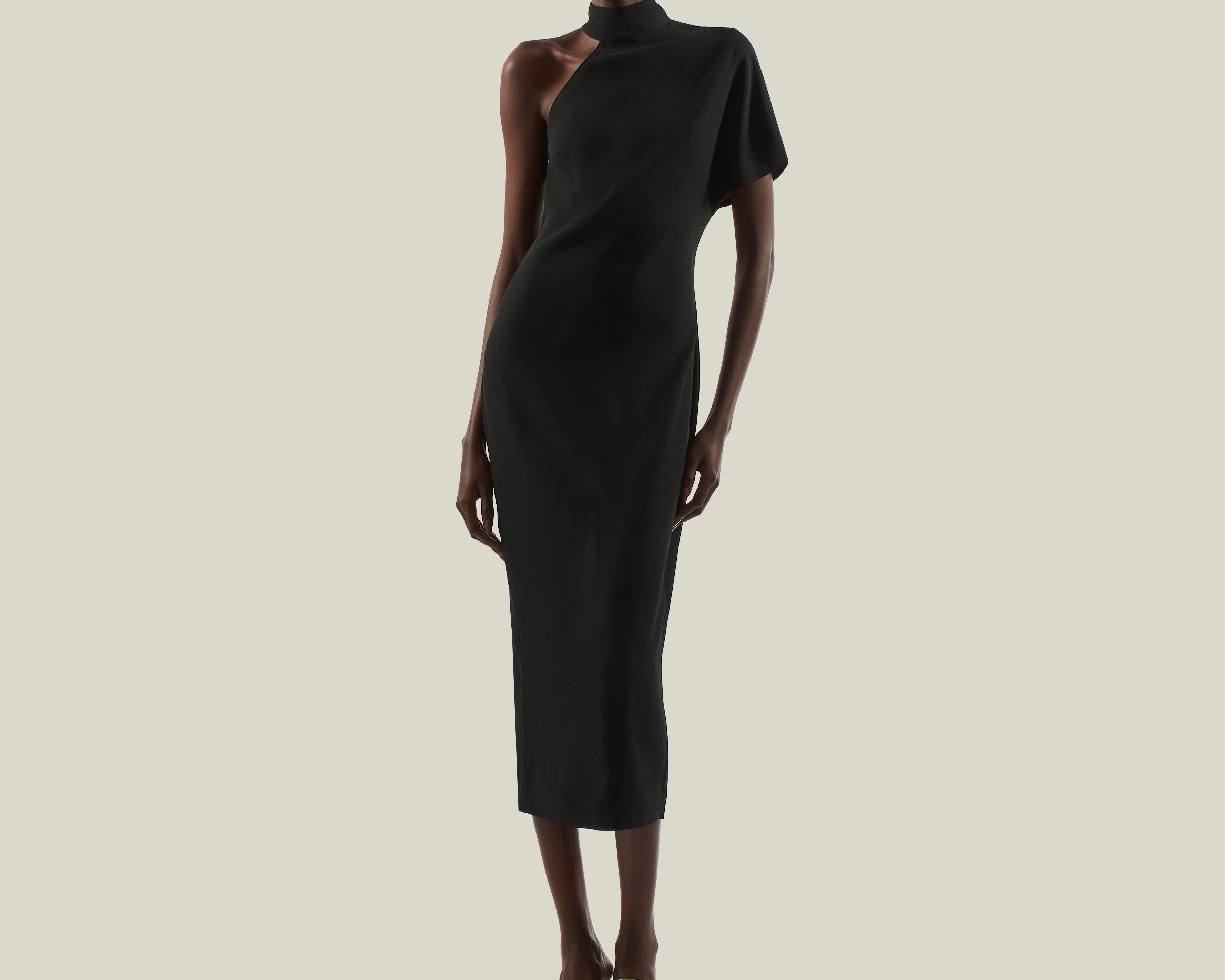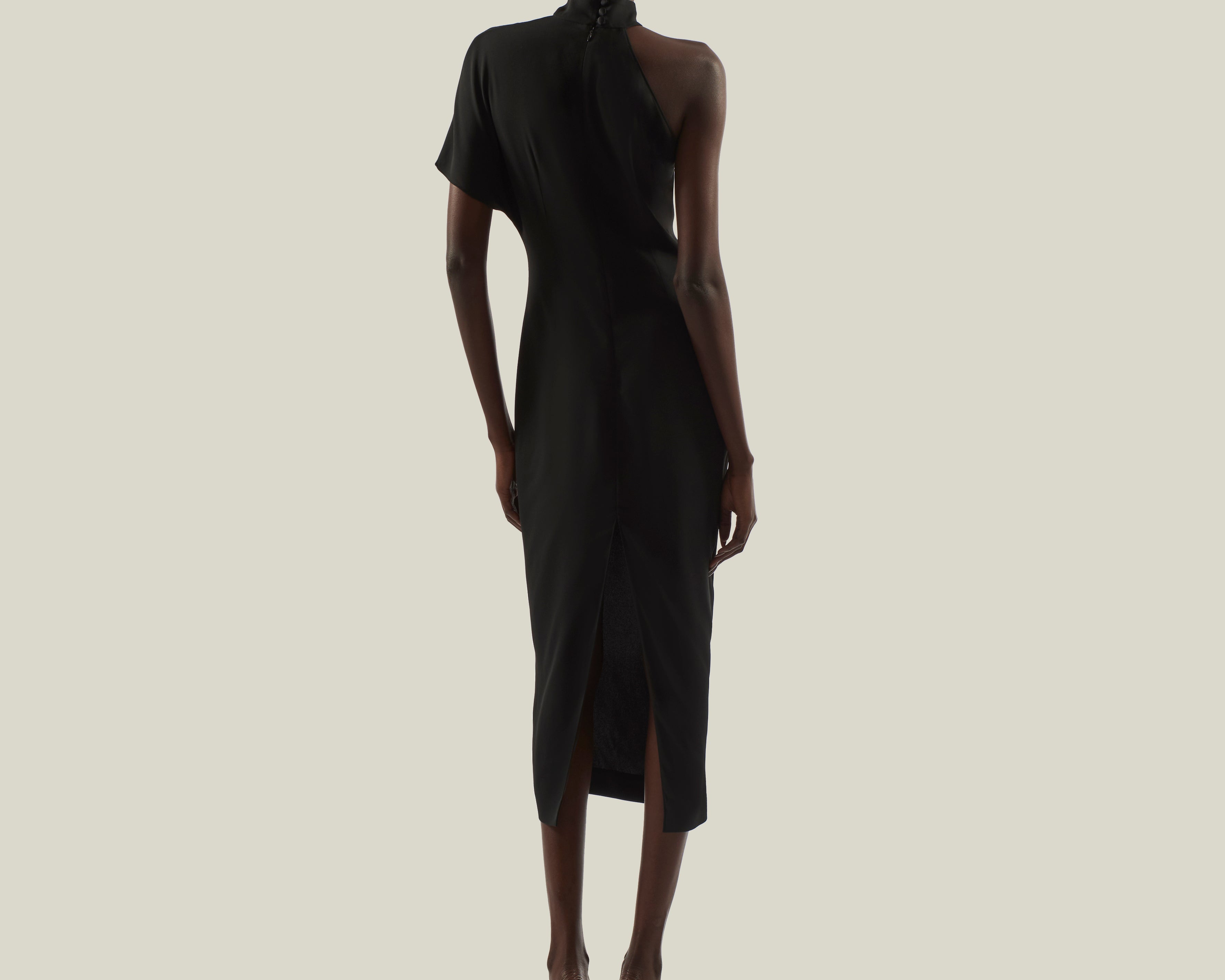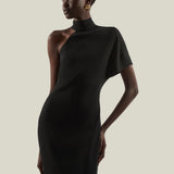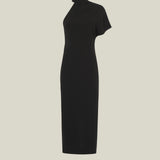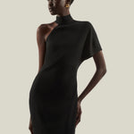 Cut from fluid crepe cady and designed with a striking asymmetrical silhouette the Absinthe features a high neckline and a single short sleeve on one side, leaving the other shoulder elegantly bare. The clean, elongated lines flow into a midi-length skirt, creating a sleek and modern profile. The back fastens with a covered button at the neck, adding a subtle finishing touch.