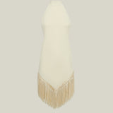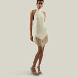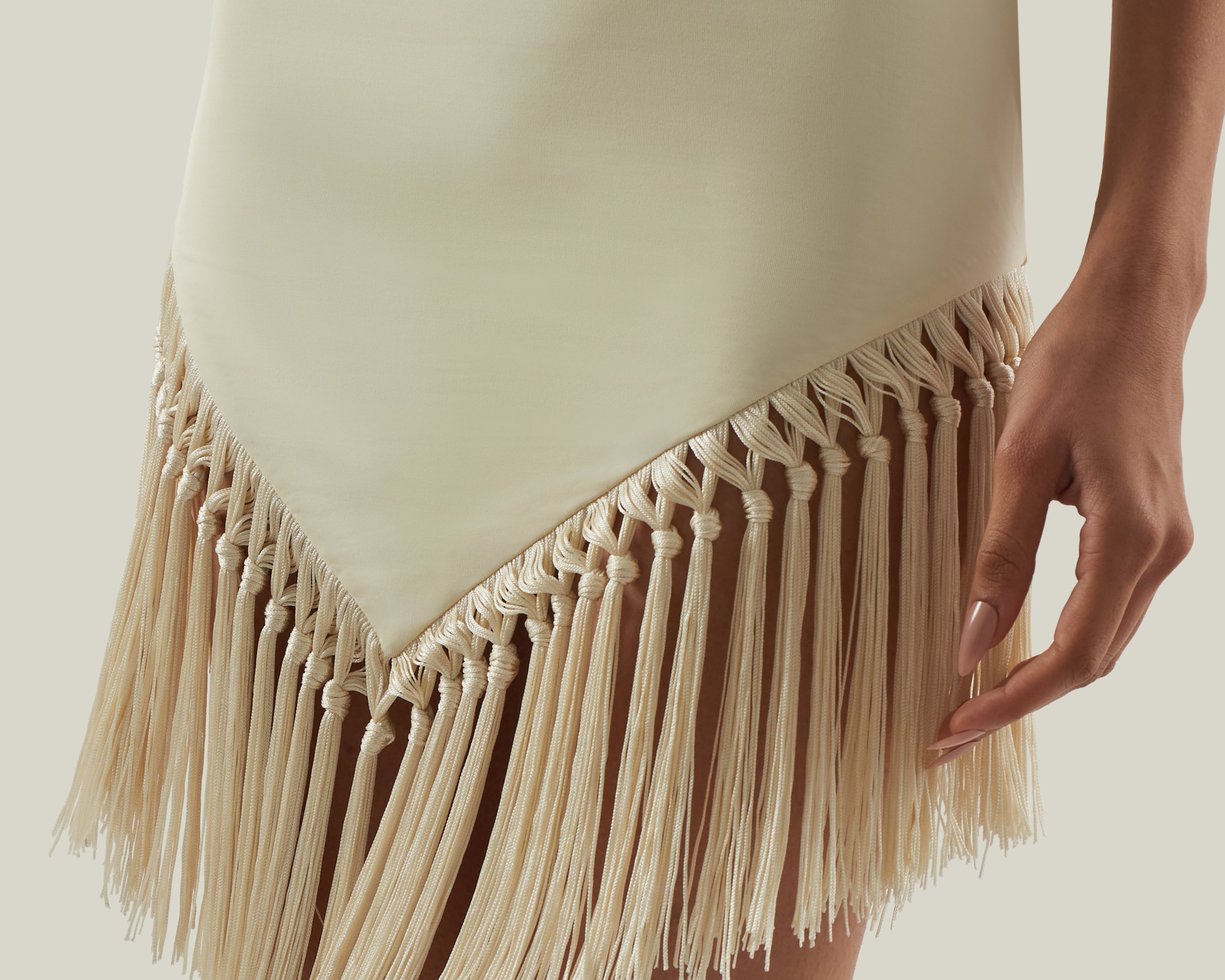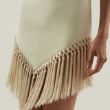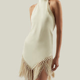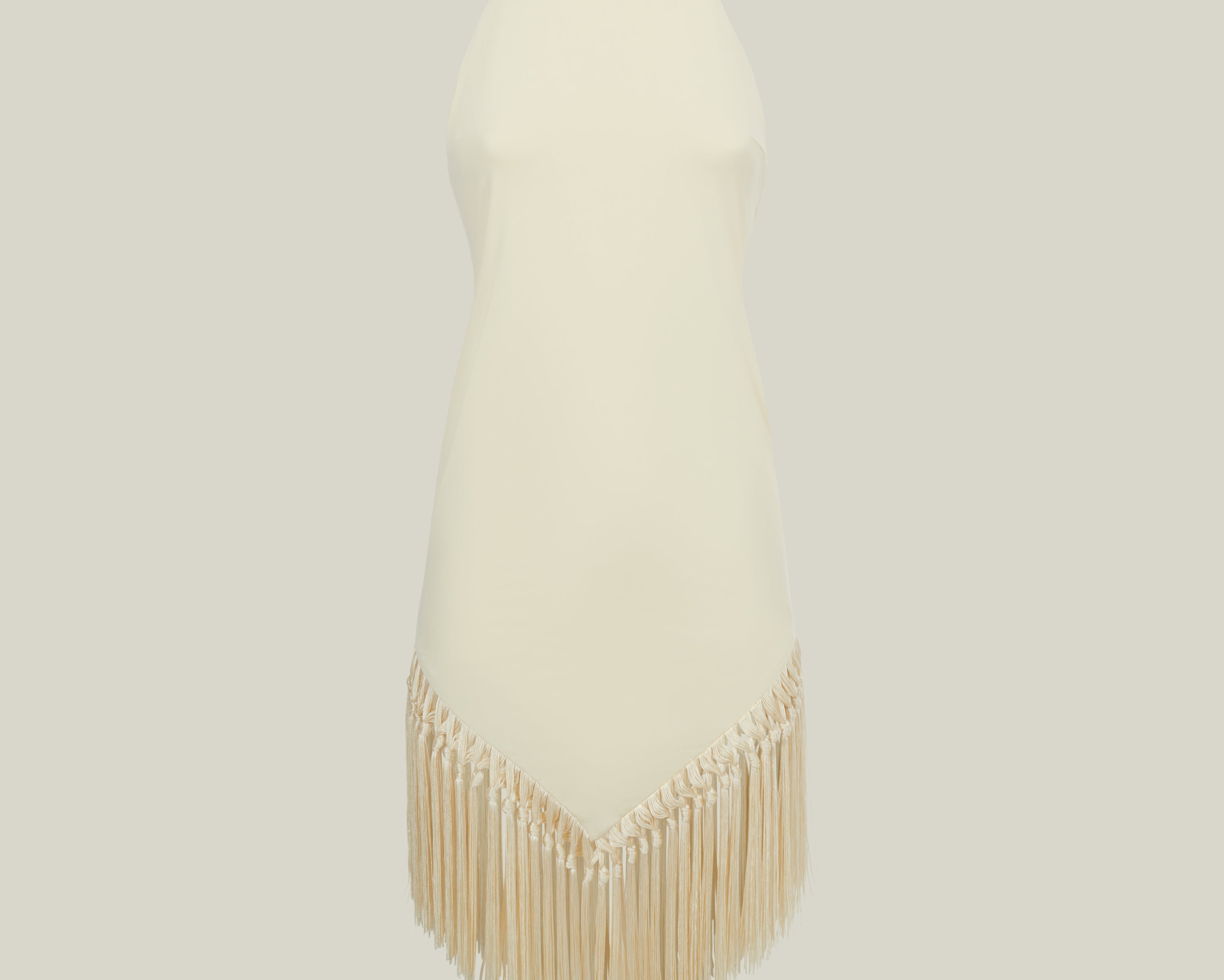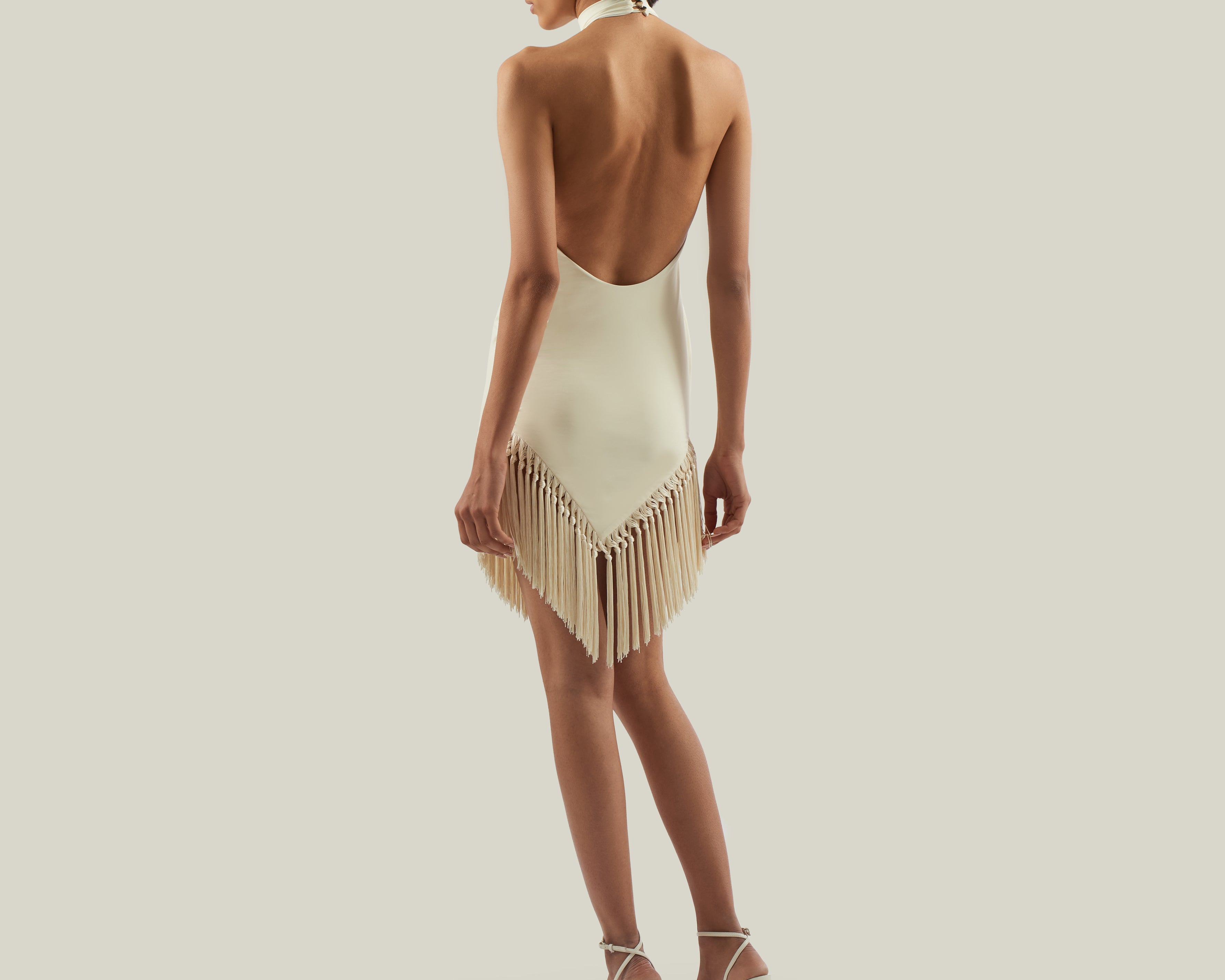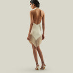 The Ares Dress is a playful halter-neck mini dress crafted from soft jersey, fully trimmed with hand-tied fringes along a V-shaped hem in a matching shade. Made from the same lightweight, stretch fabric as our swimwear, it moves fluidly with every step, exuding relaxed sophistication from beach to soirée.