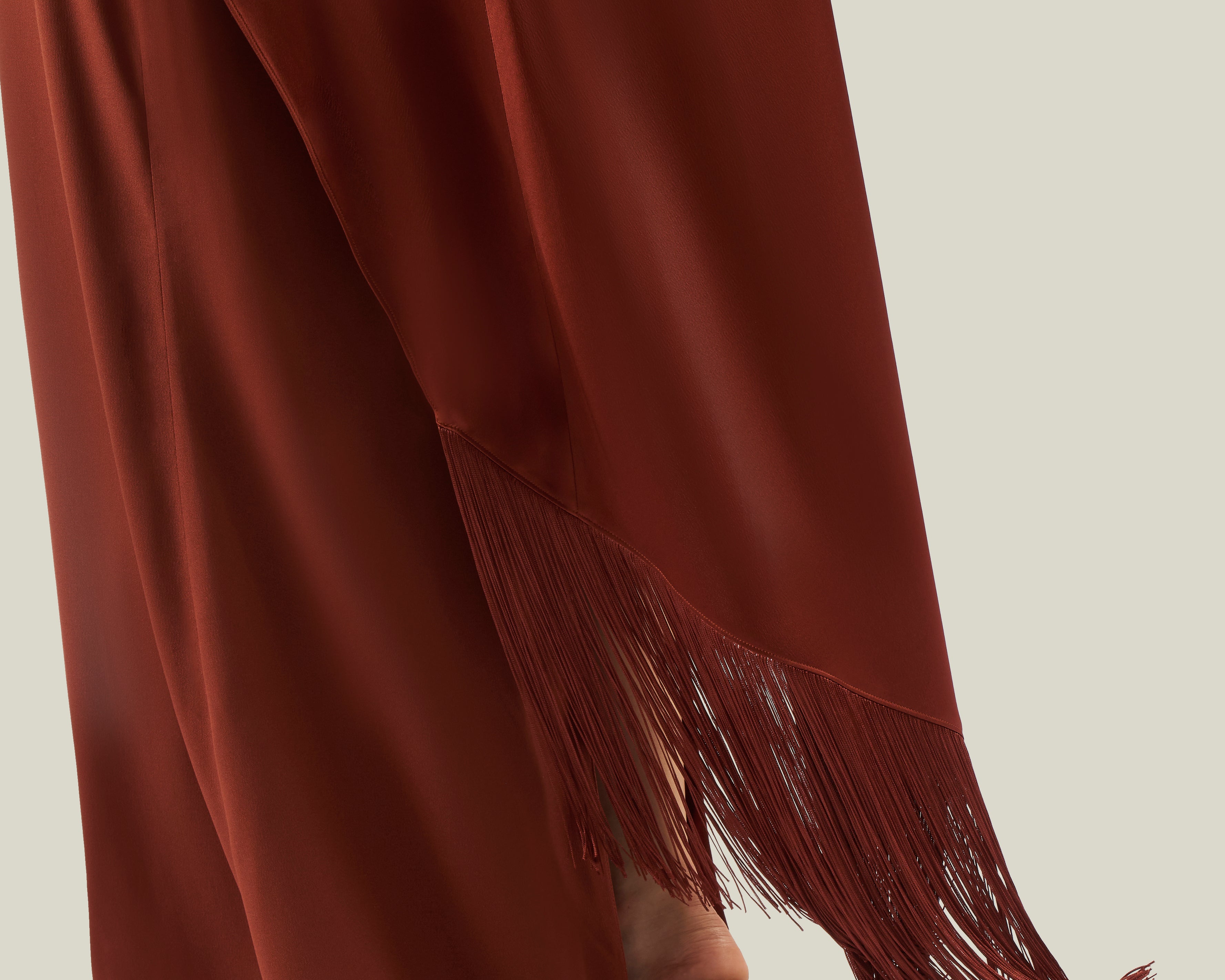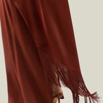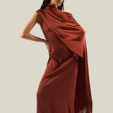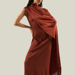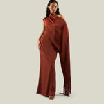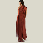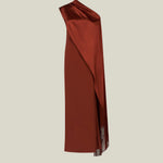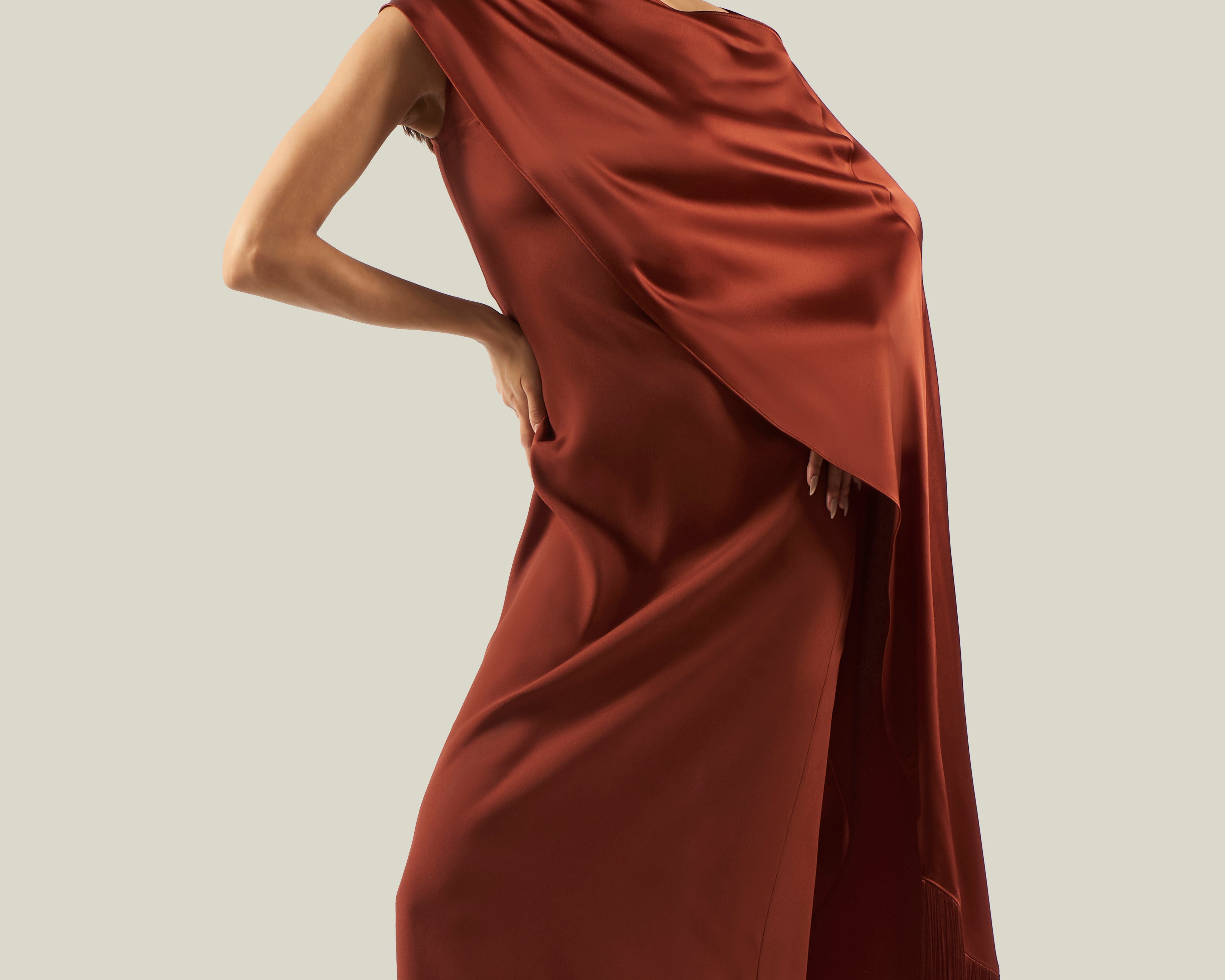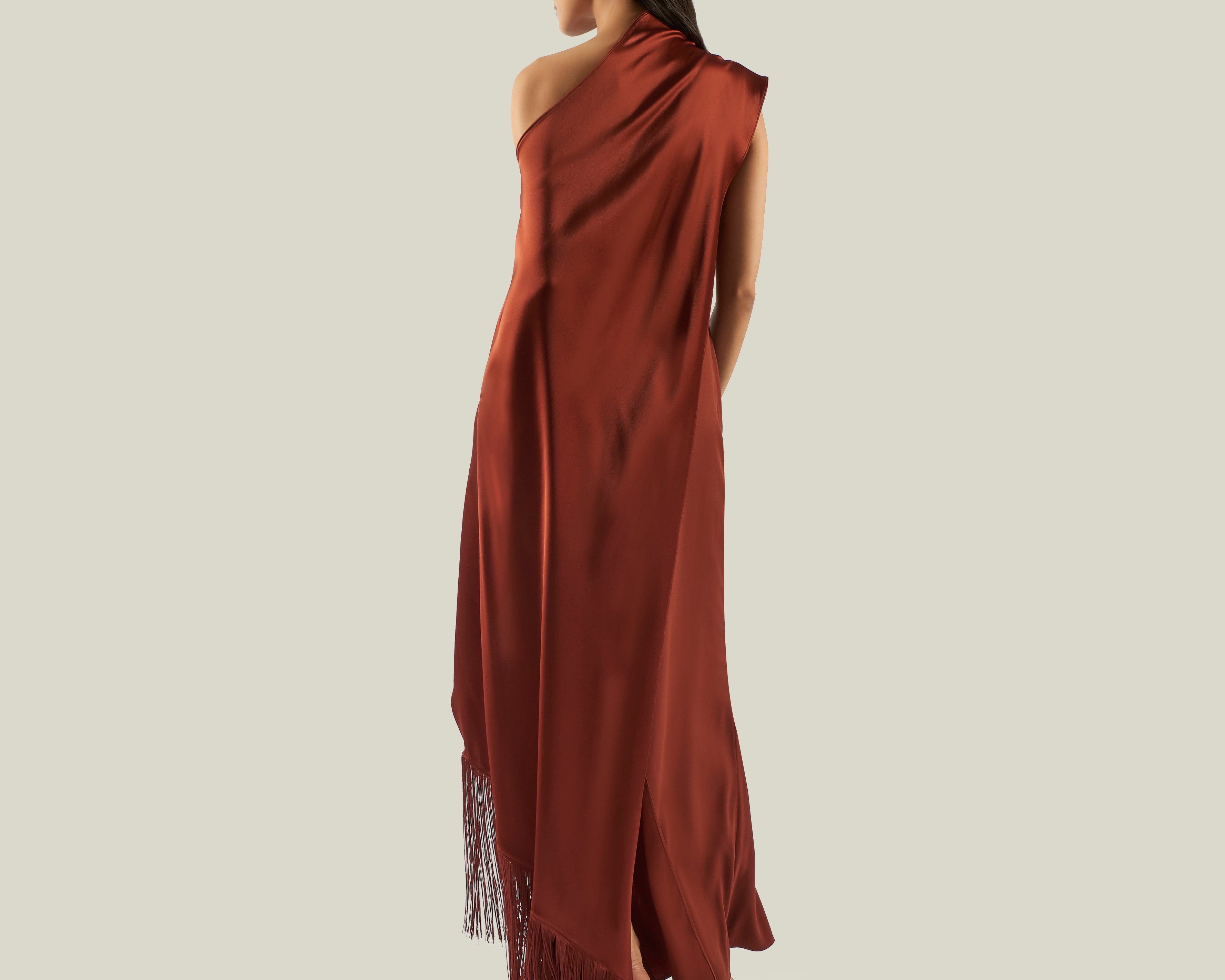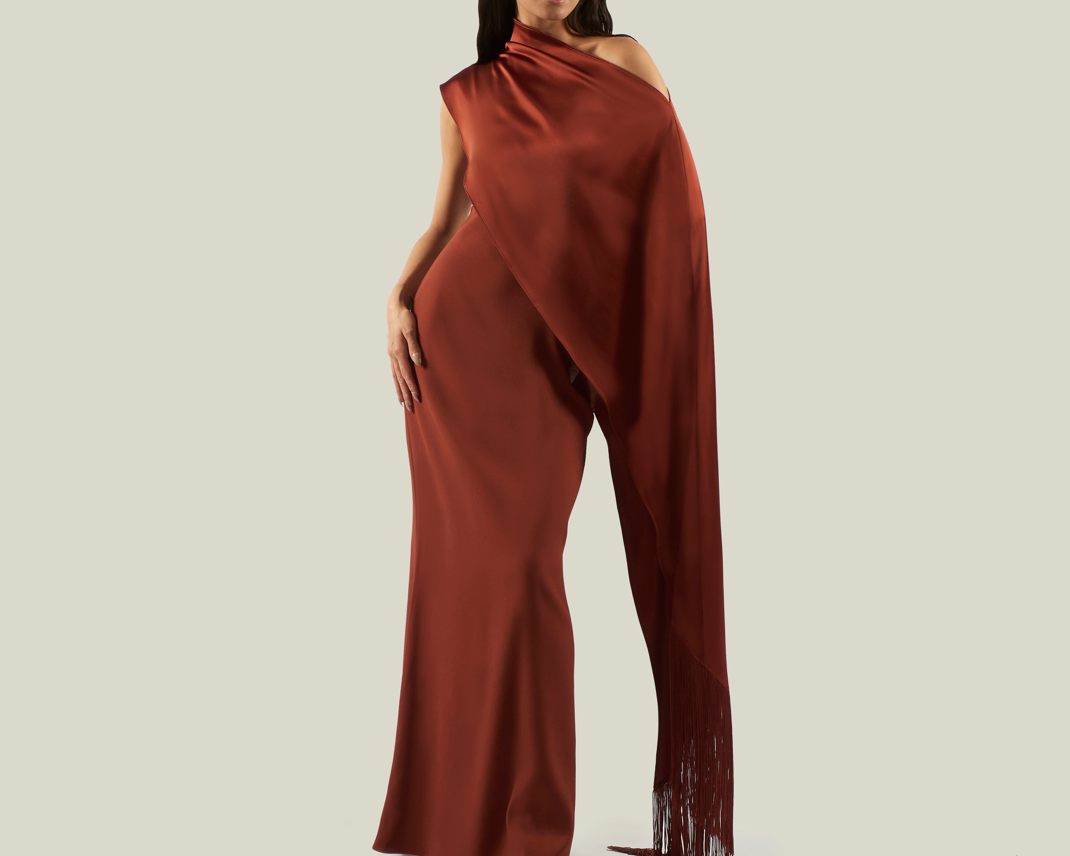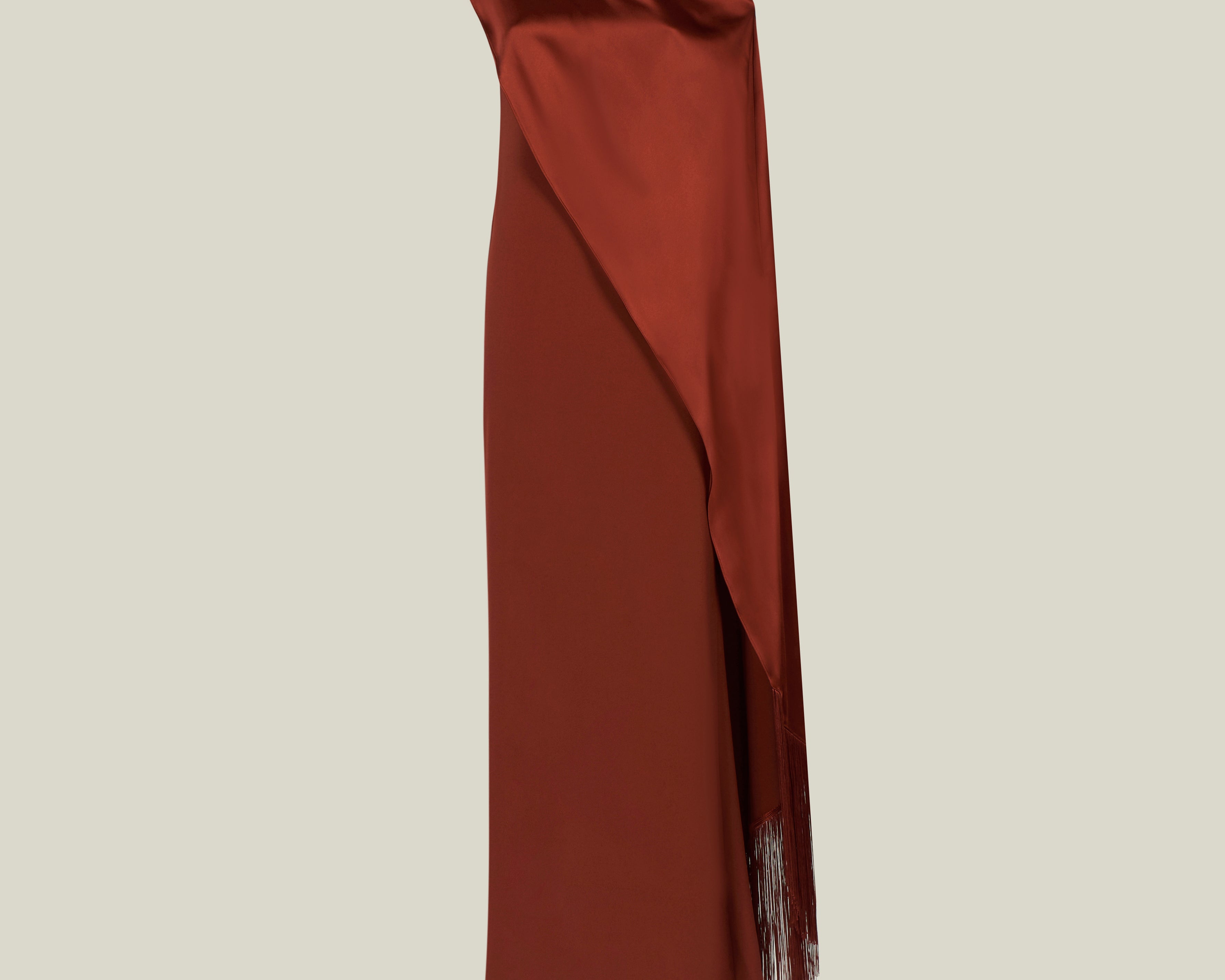 Named after the iconic supermodel, the Berenson is a one-shoulder column dress crafted from soft crepe cady. It features an elegant attached cape, fully trimmed with soft tonal fringes at the hem. This refined piece combines timeless style with a touch of dramatic flair.