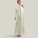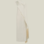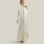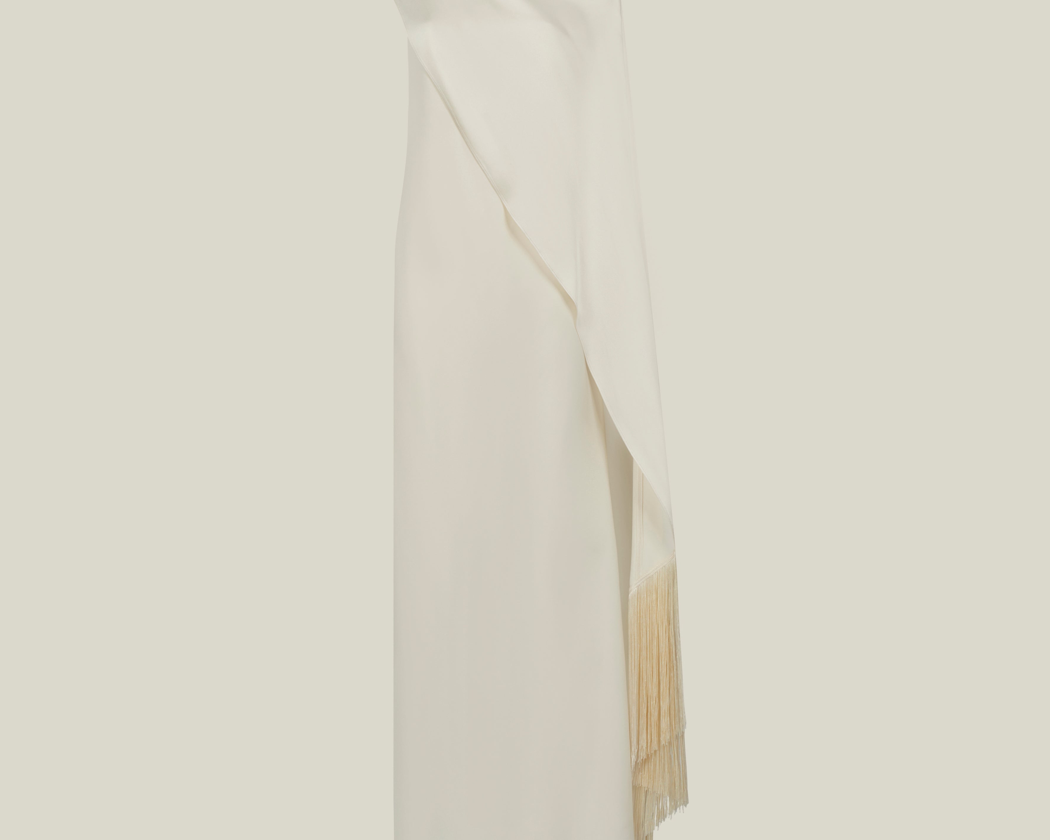 Named after the iconic supermodel, the Berenson is a one-shoulder column dress crafted from soft crepe cady. It features an elegant attached cape, fully trimmed with soft tonal fringes at the hem. This refined piece combines timeless style with a touch of dramatic flair.