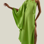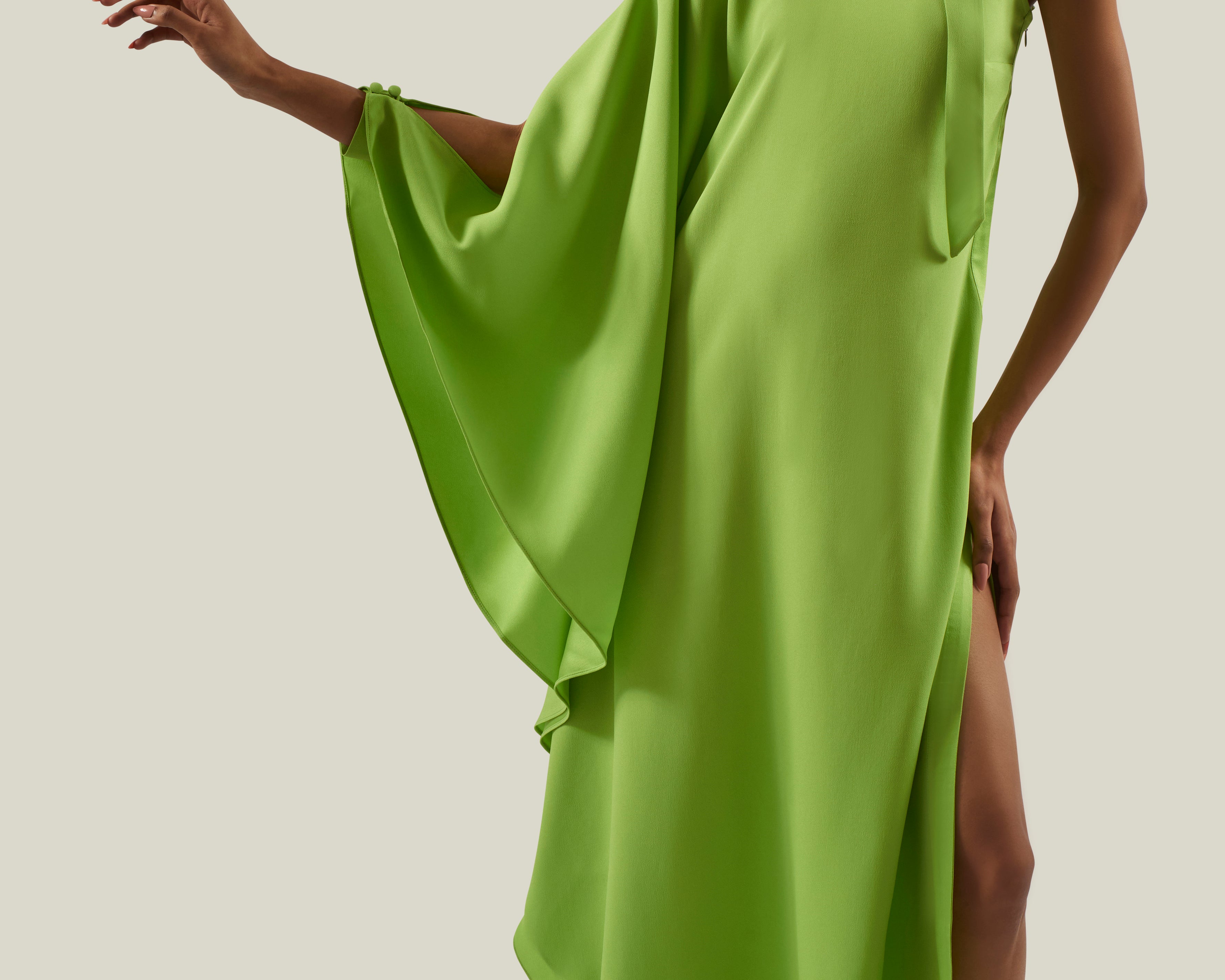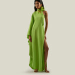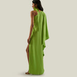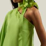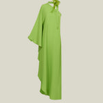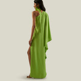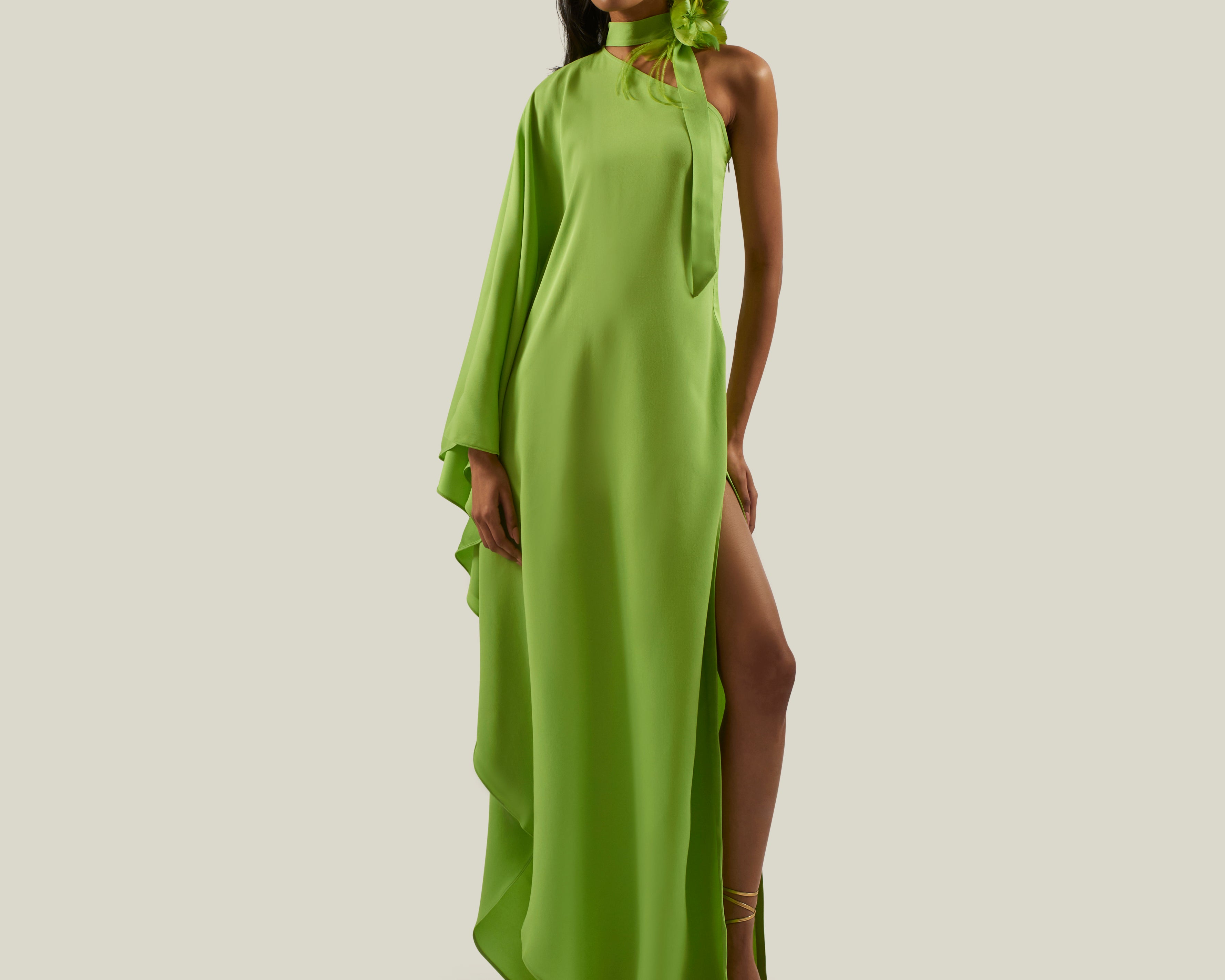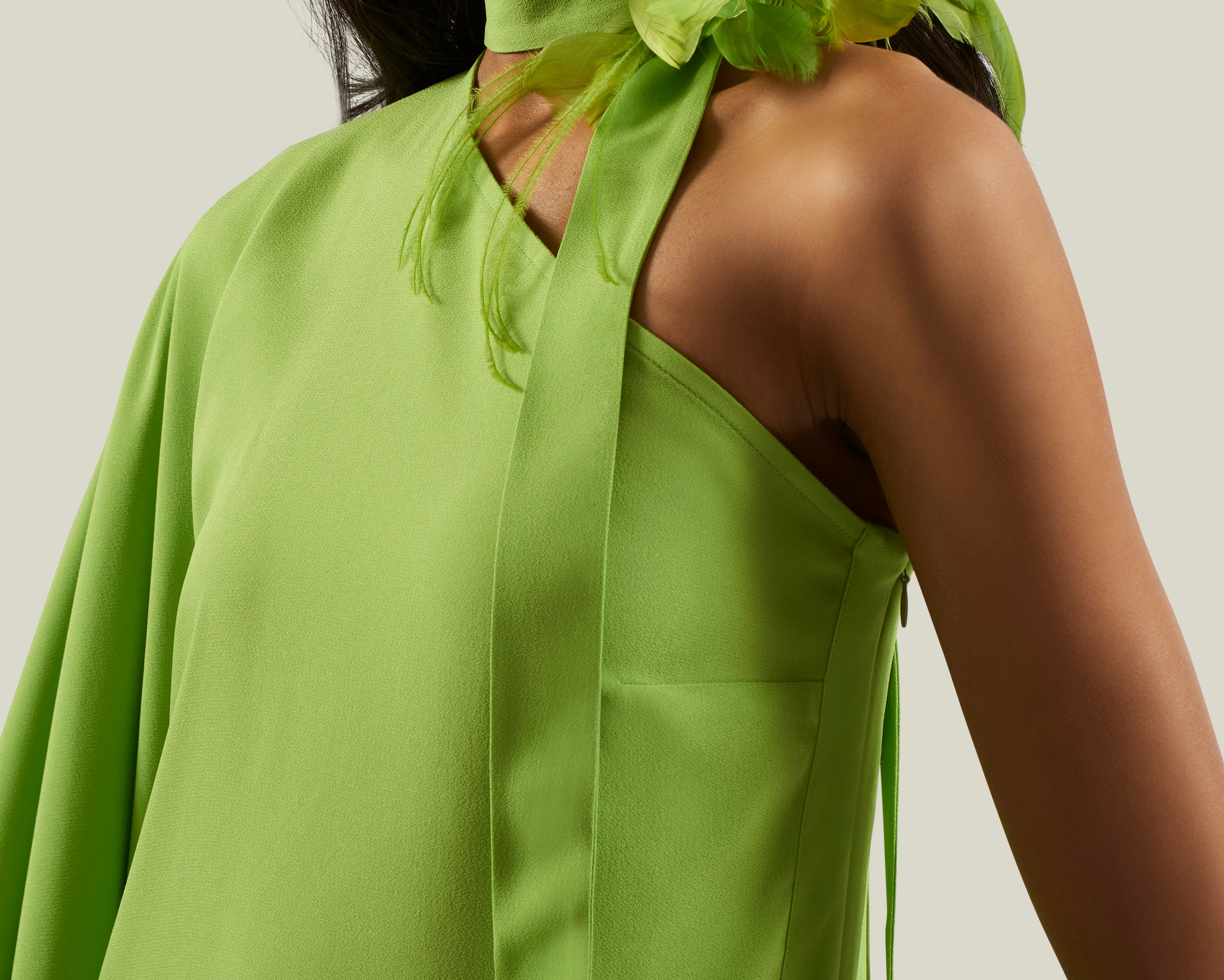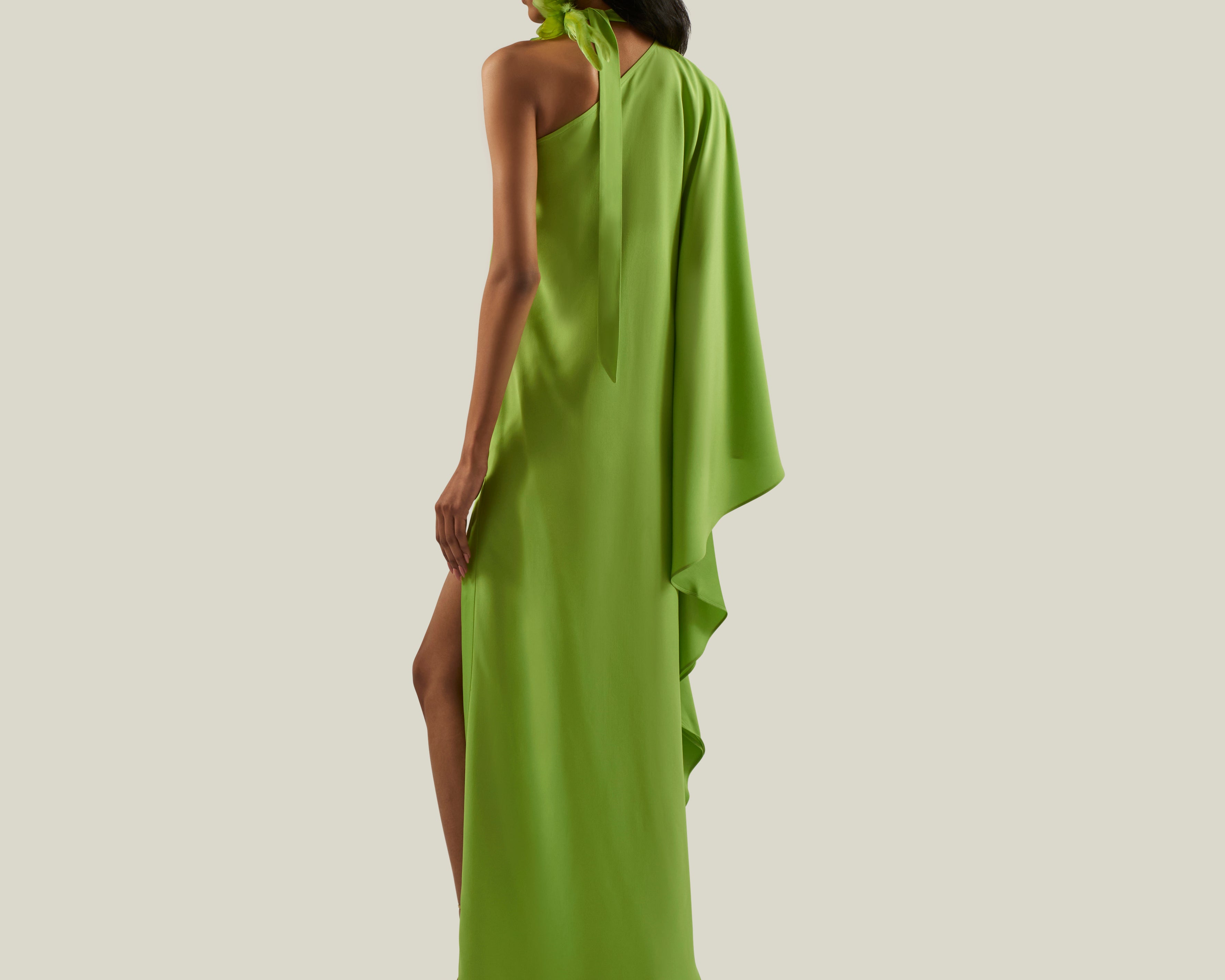 The new Garden version of our classic Bolkan Dress. Named after the sensual and fabulous Florinda, this dress is the most sensual one among the Taller Marmo Classics. Made from soft crepe cady, it features a thigh-high slit and a slit on the sleeve, covering and revealing the body as it moves. This one-shoulder dress is finished with a playful scarf neckline, adorned with a handcrafted ostrich feather flower that elegantly frames the neck with refined sophistication.