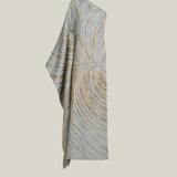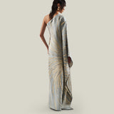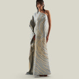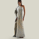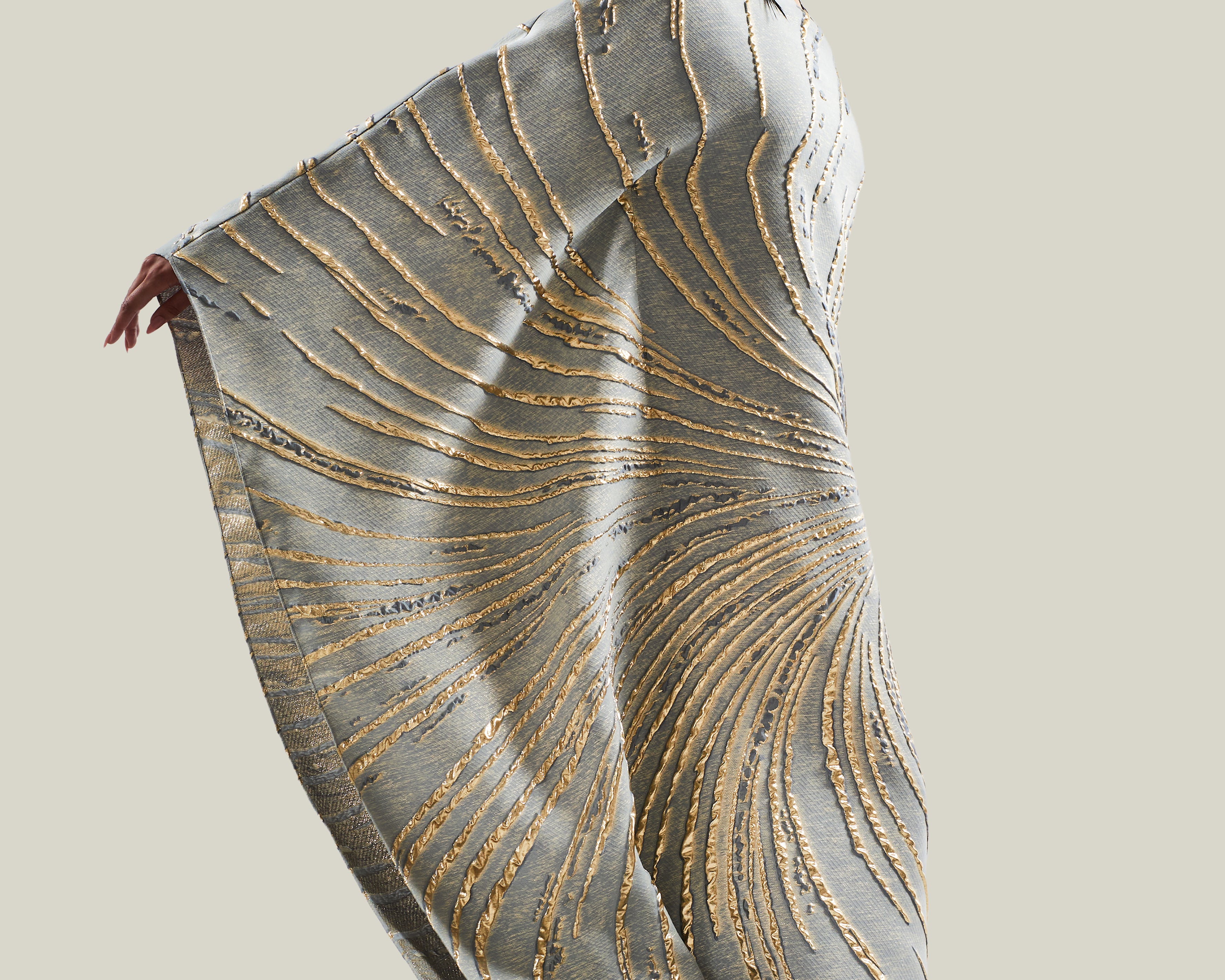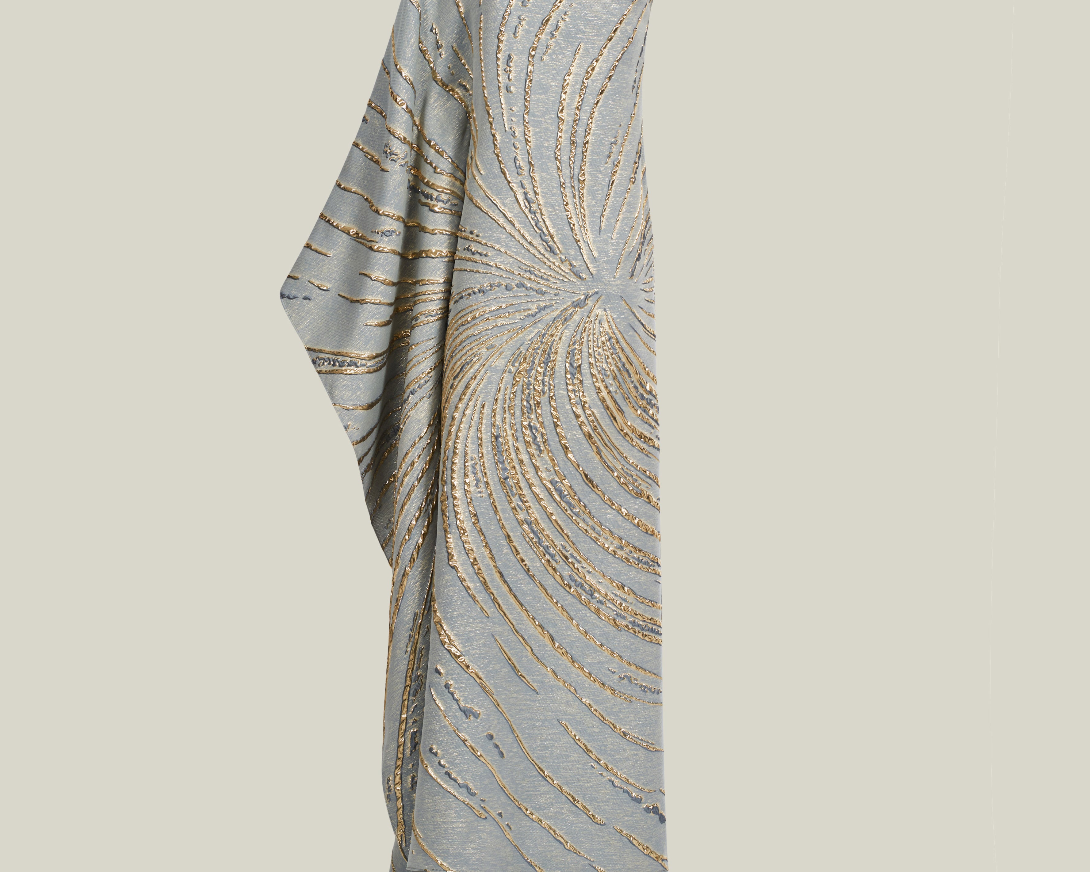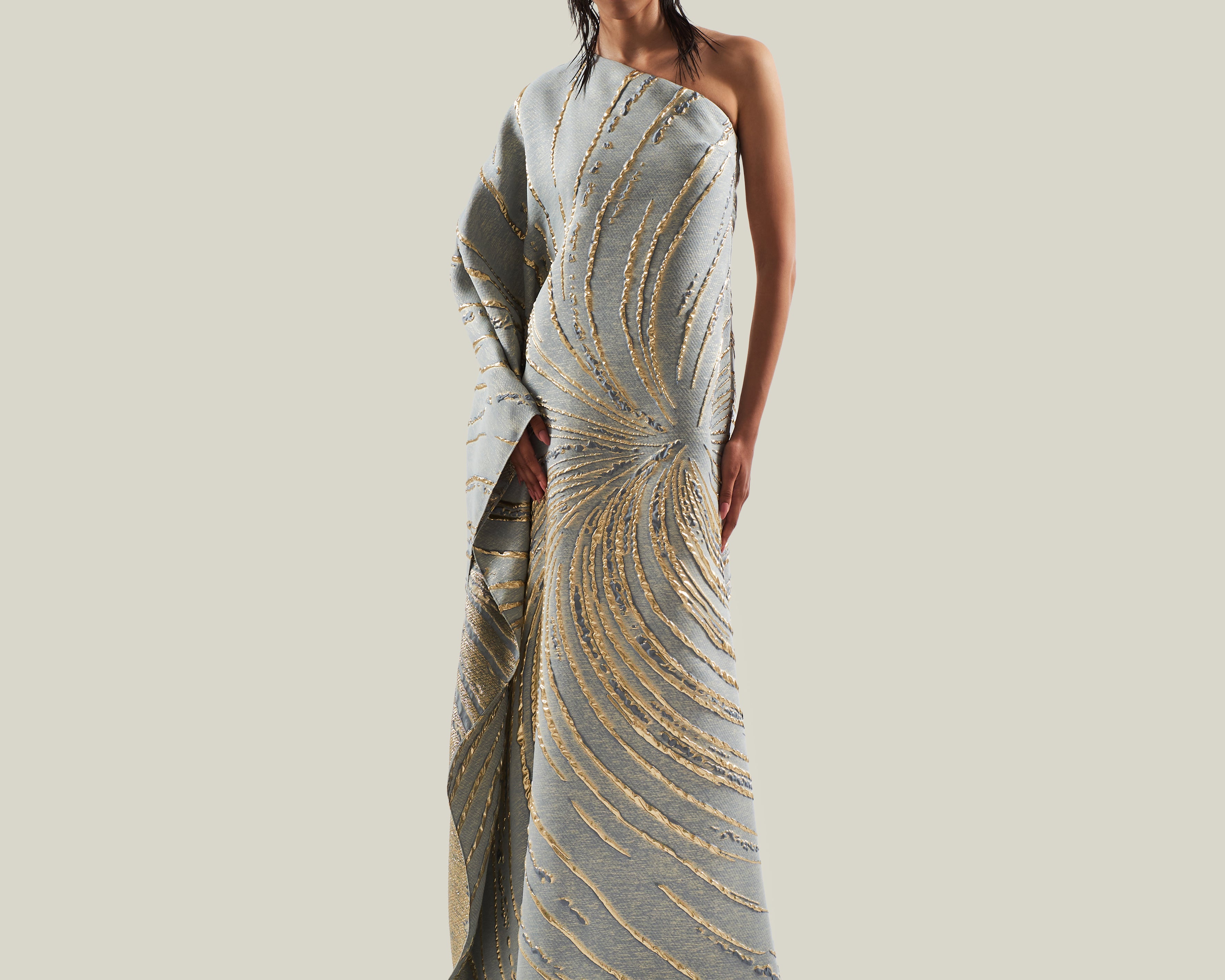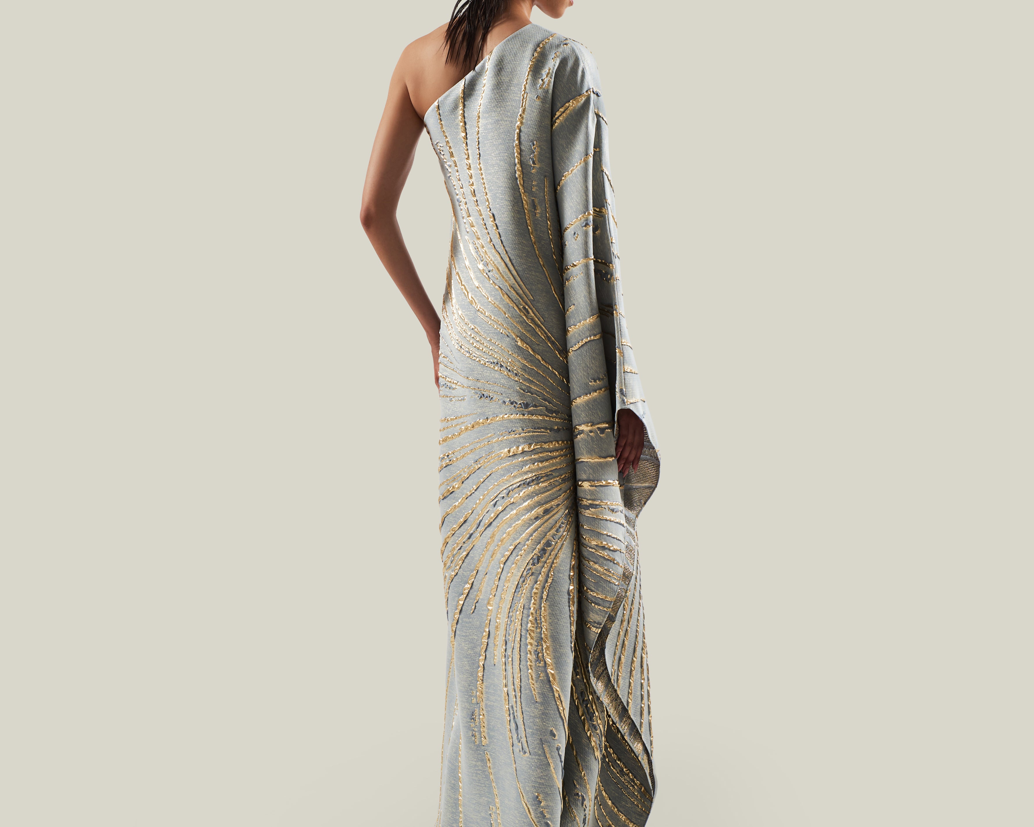 A luminous statement, the Cannes Dress captures the essence of timeless sophistication. Made from a three-dimensional jacquard featuring a radiant fireworks motif, woven in Como, Italy, it reveals a sculptural one-shoulder silhouette enriched by fluid draping and a dramatic wing sleeve. The intricate matelassé texture enhances the play of light across its golden threads, while a fully enclosed stretch crepe cady lining ensures a smooth, flawless fit.