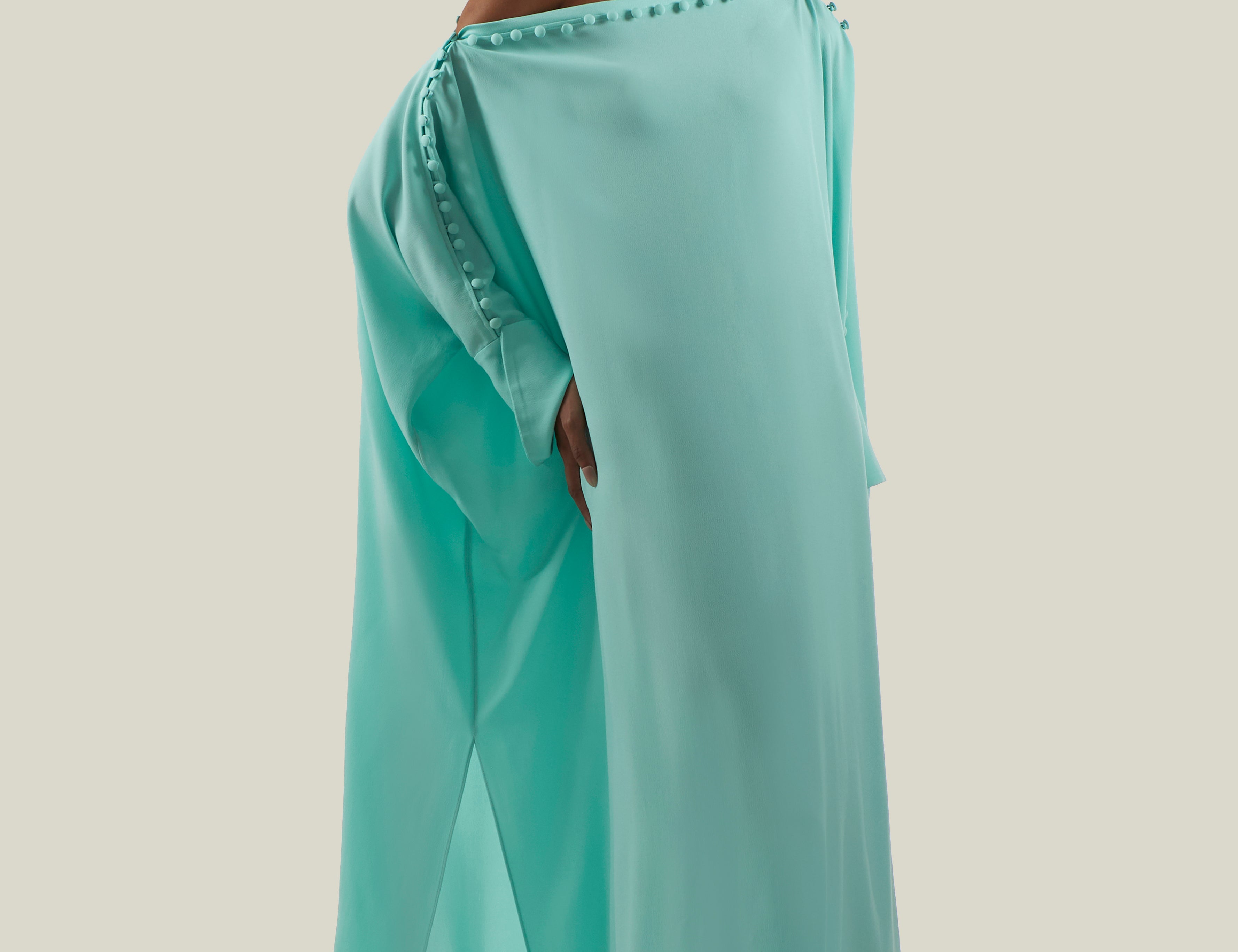 Made from fluid viscose-blend crepe cady, the Carrington Midi is an ankle length dress with a clean silhouette and a built-in cape-effect panel that starts at the front, creating a top-like effect, and extends to the back. The design features a high neckline with covered buttons at the back, a central back slit for ease of movement, and long sleeves with discreet slits at the cuffs.