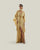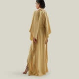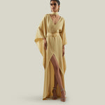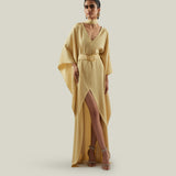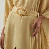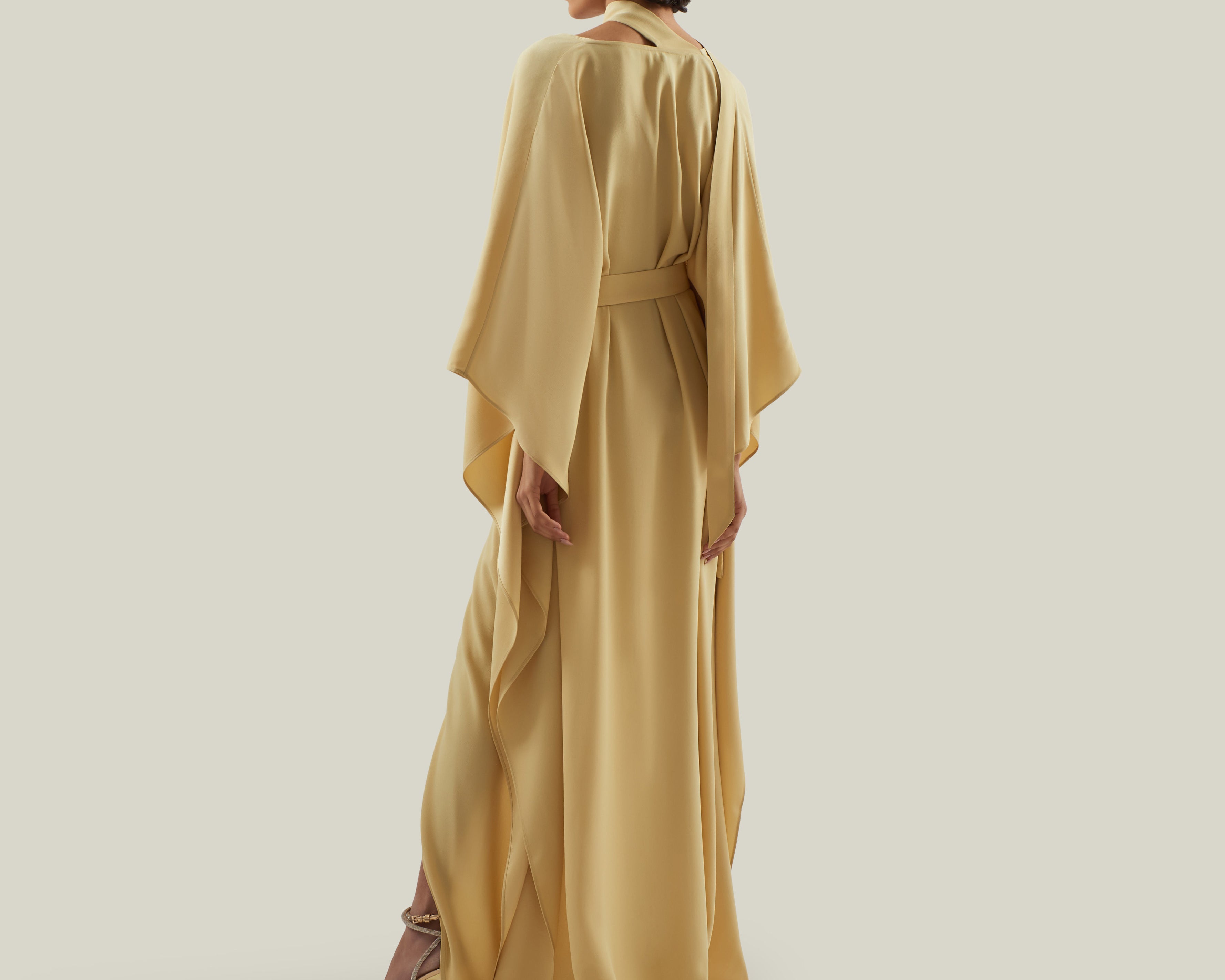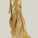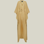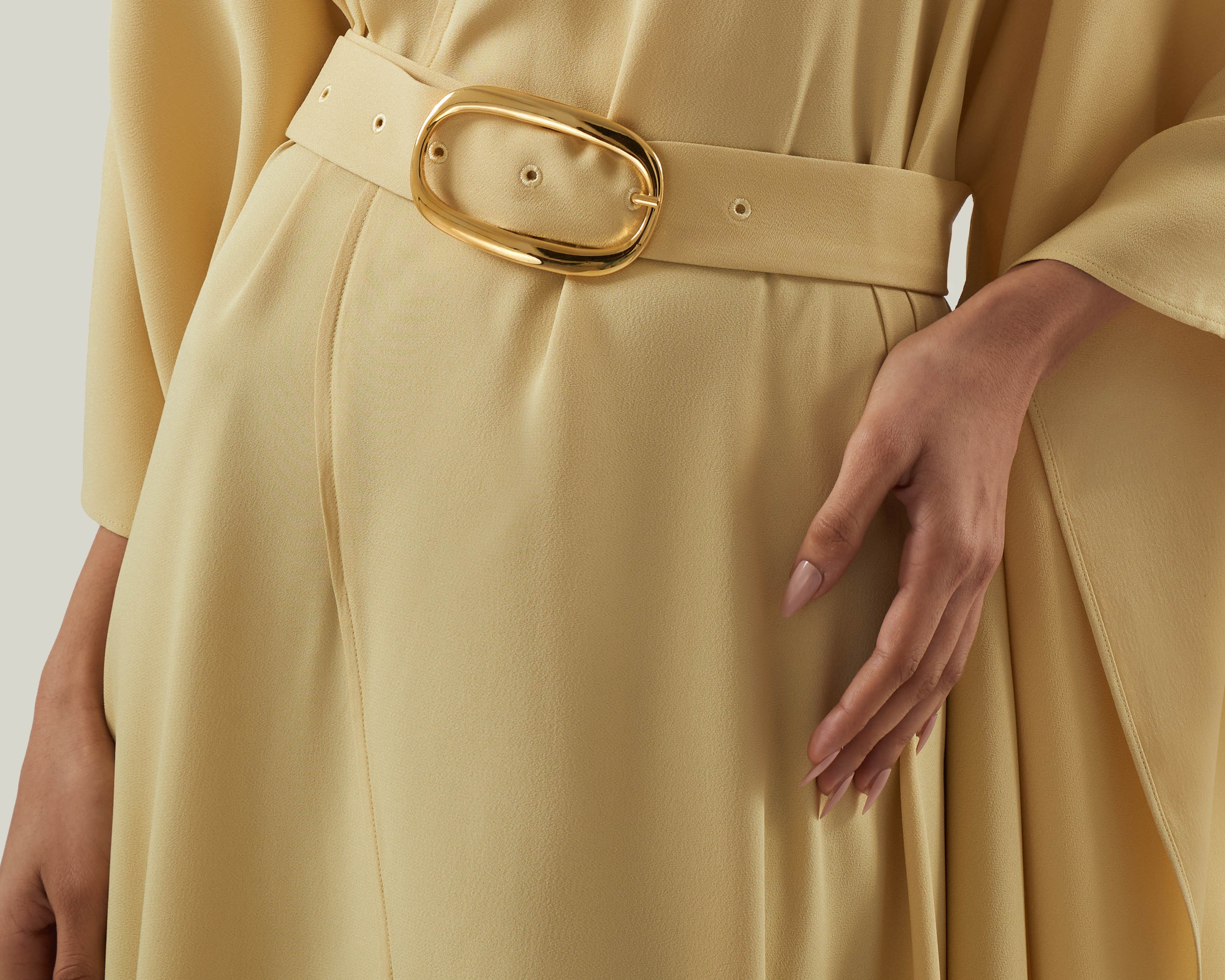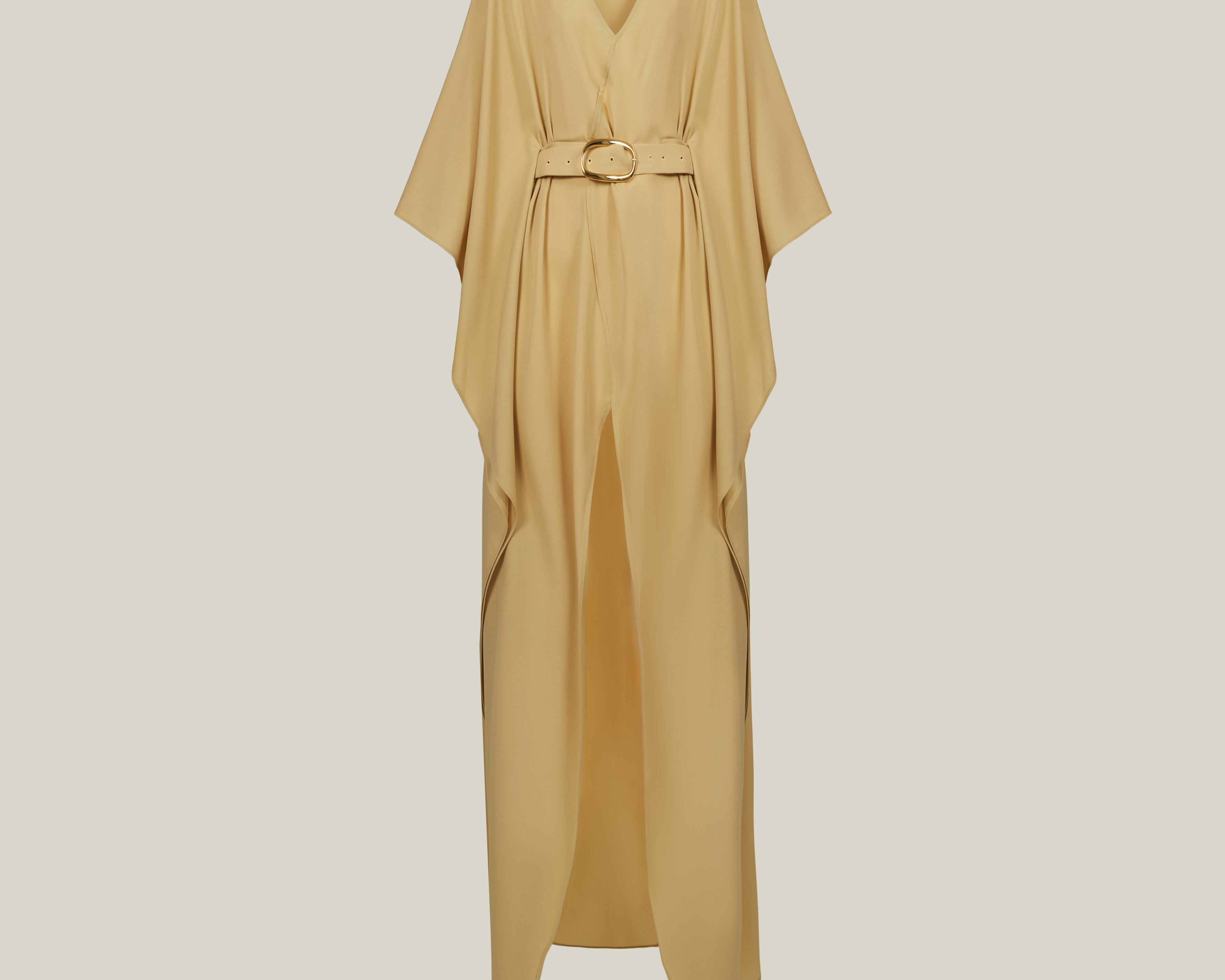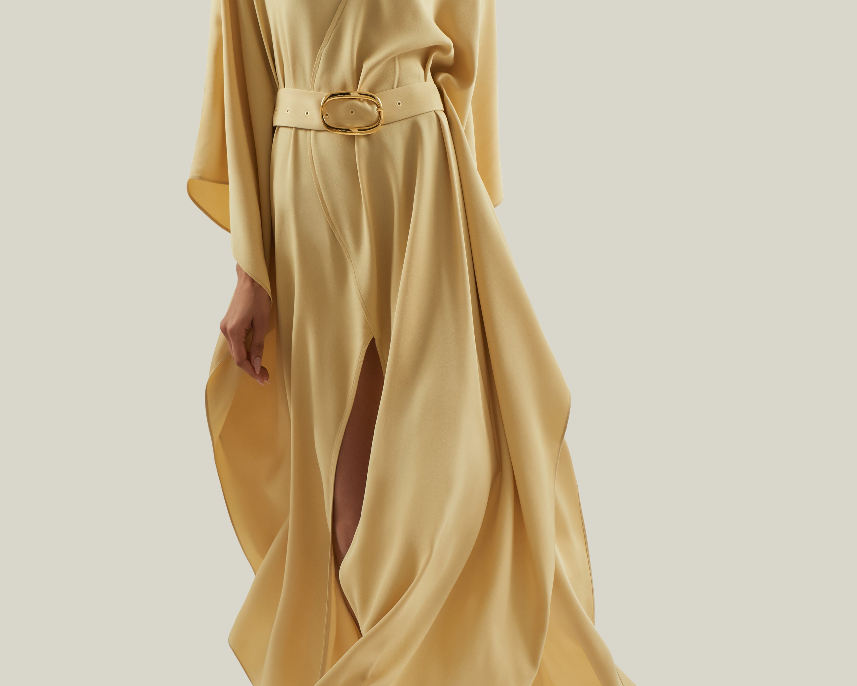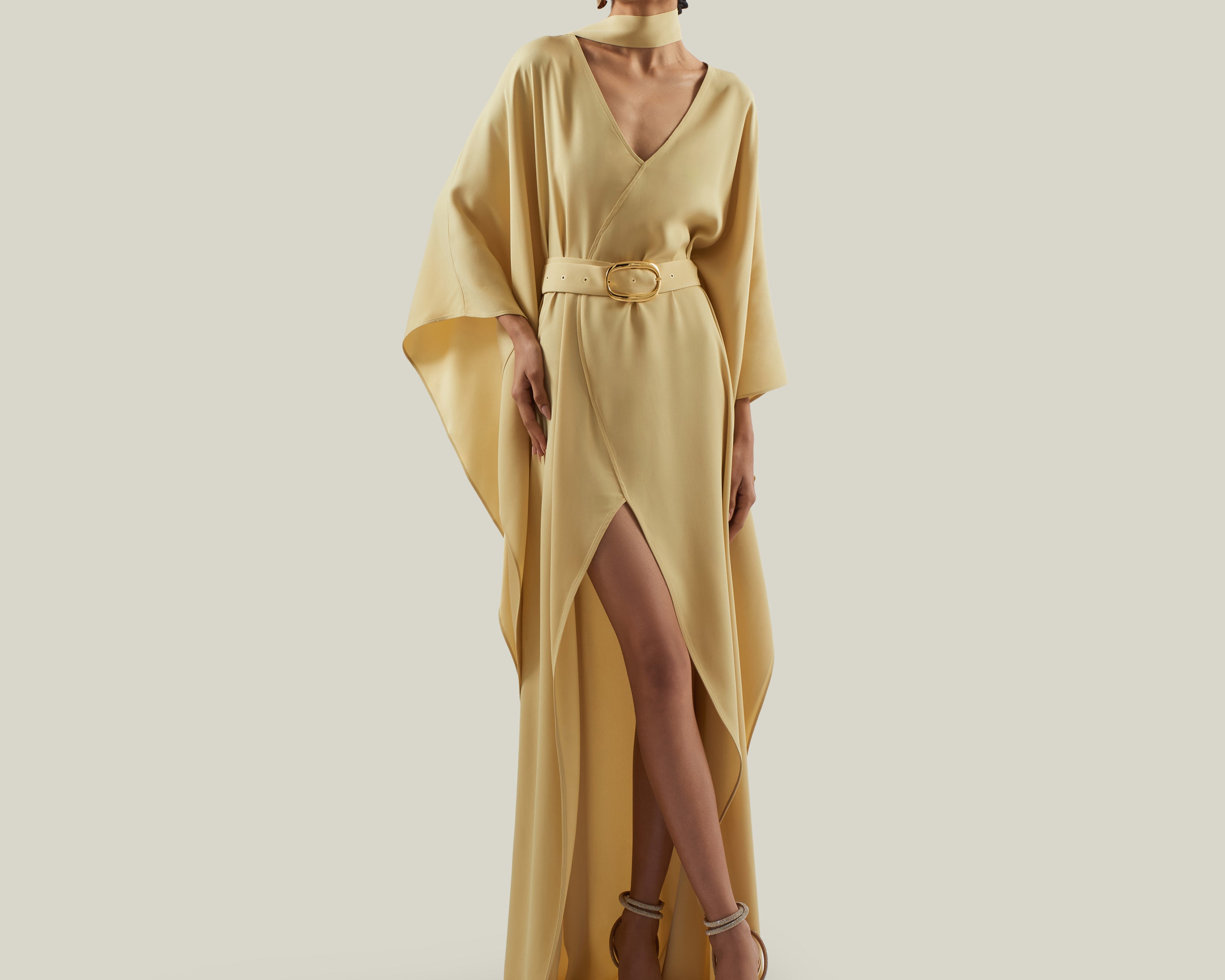 Crafted from smooth crepe cady, the Cassandra features a fluid silhouette defined by a deep V-neckline and a front slit that reveals the leg with effortless allure. The wide sleeves enhance its relaxed elegance, while the matching belt with a sculptural buckle defines the waist, creating a refined contrast between structure and movement. A coordinating scarf completes the look, adding a touch of sophistication to this timeless piece.