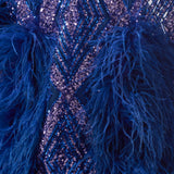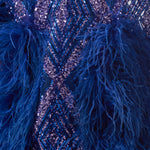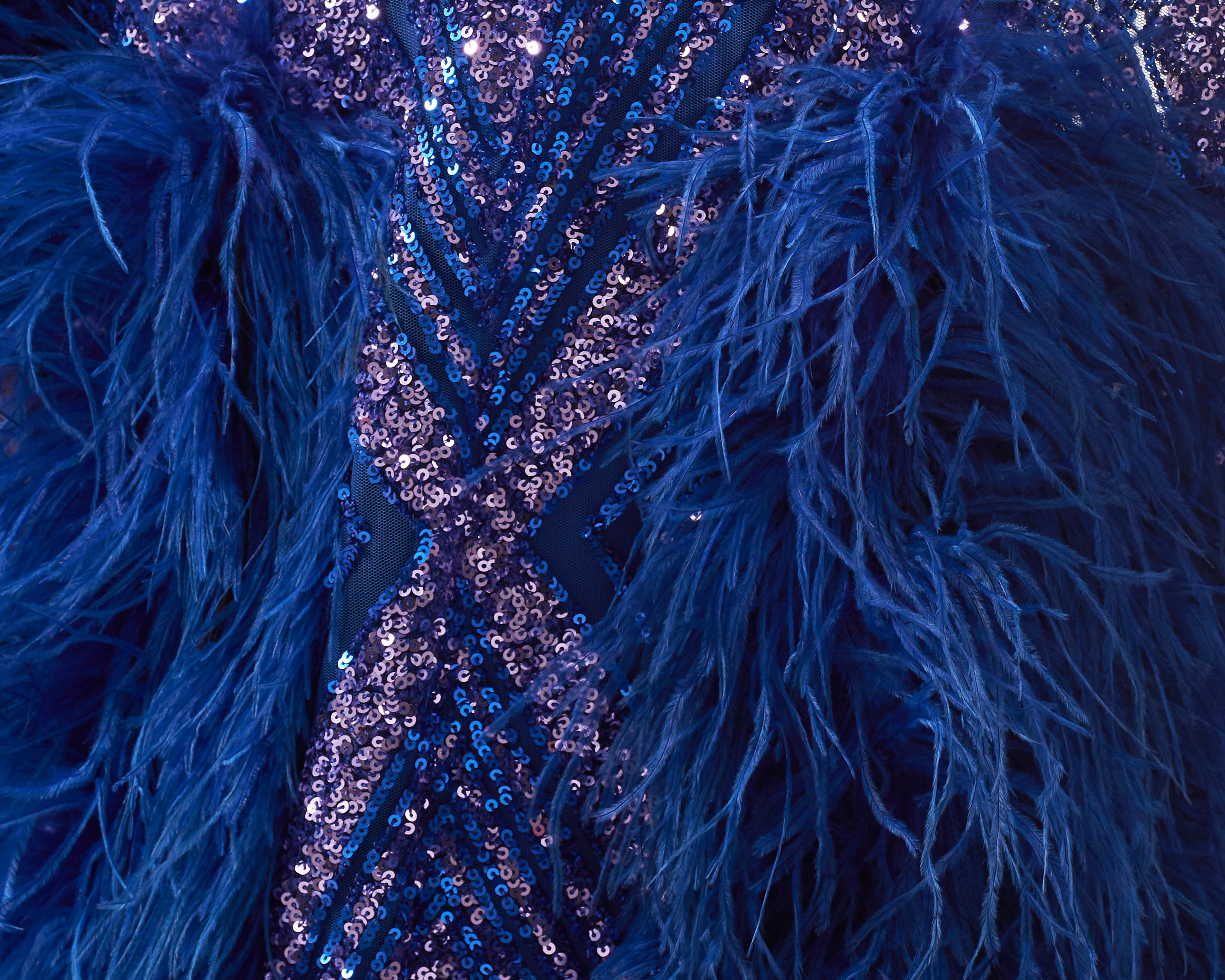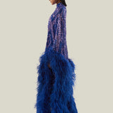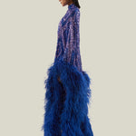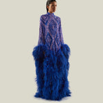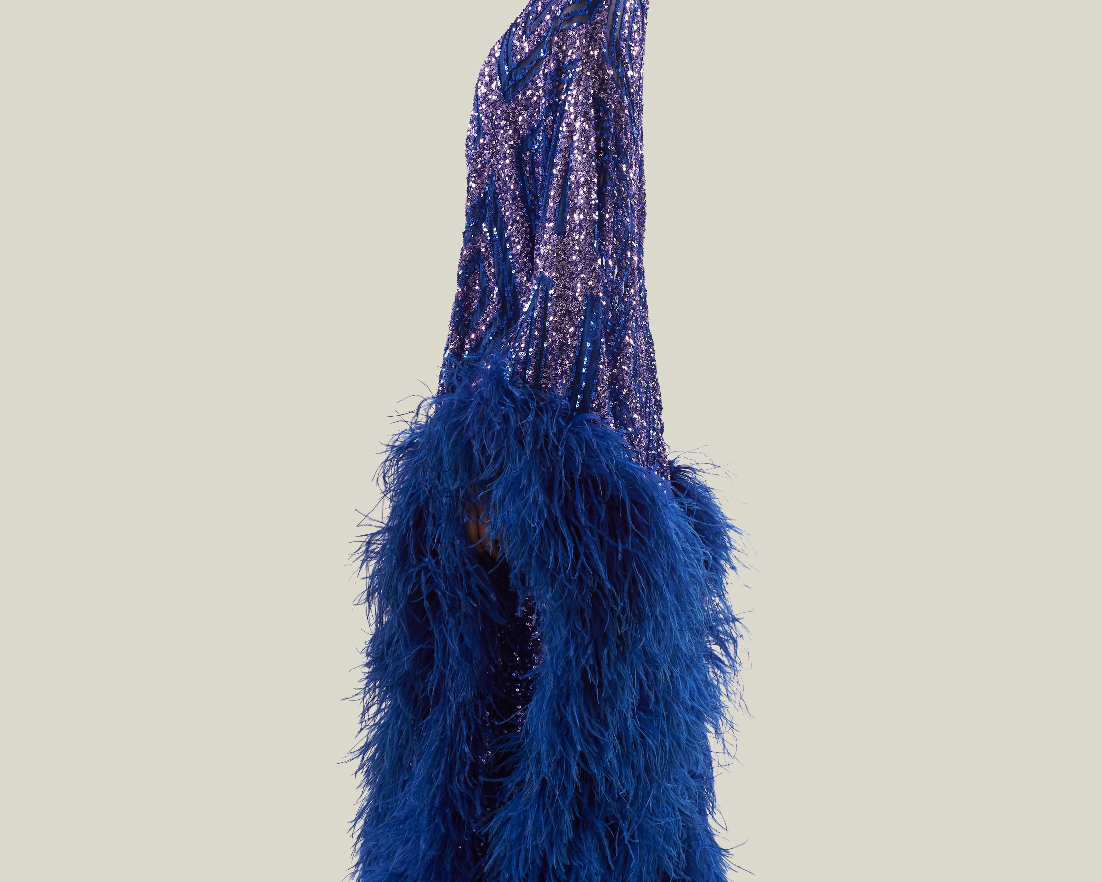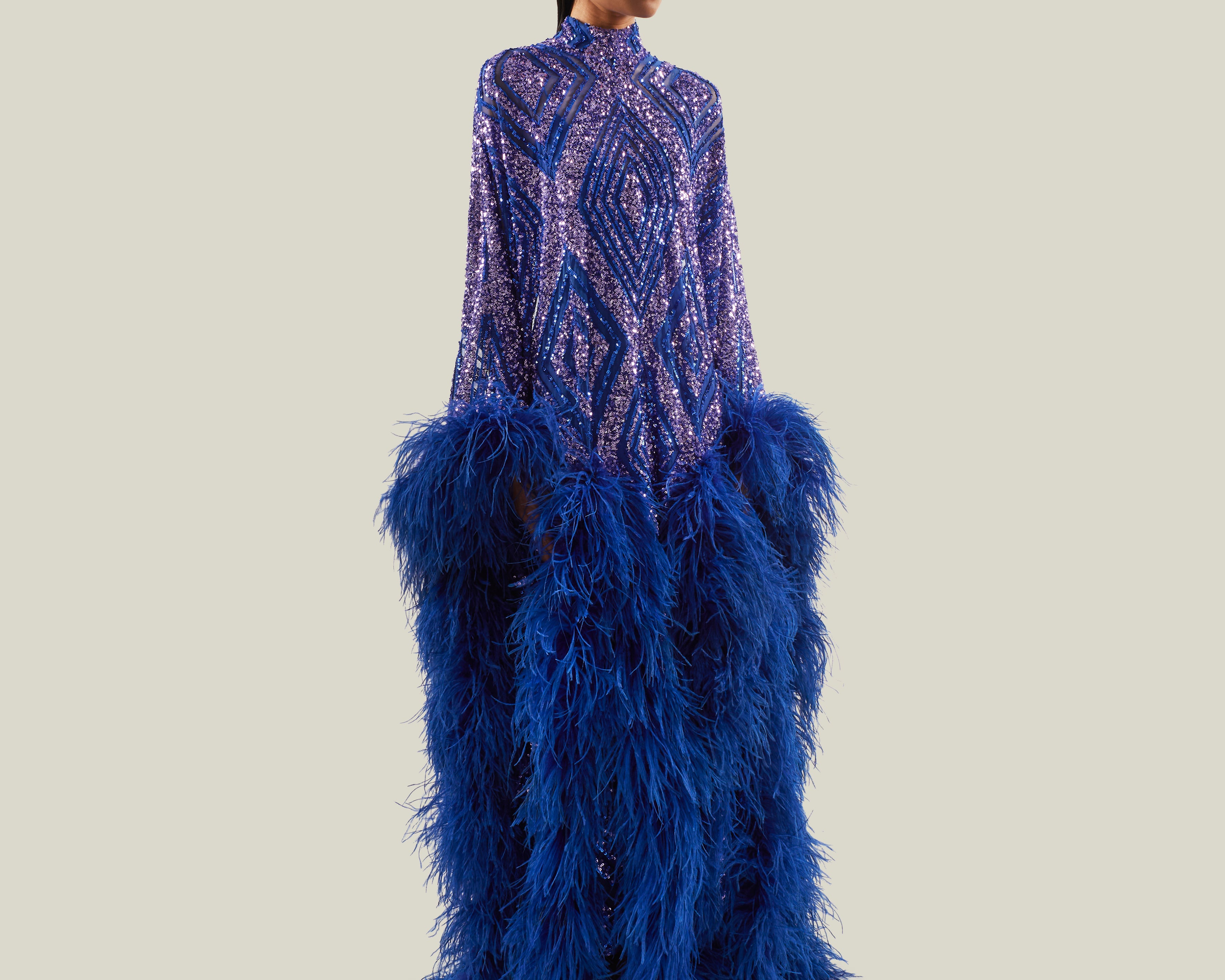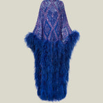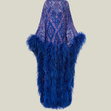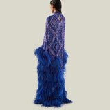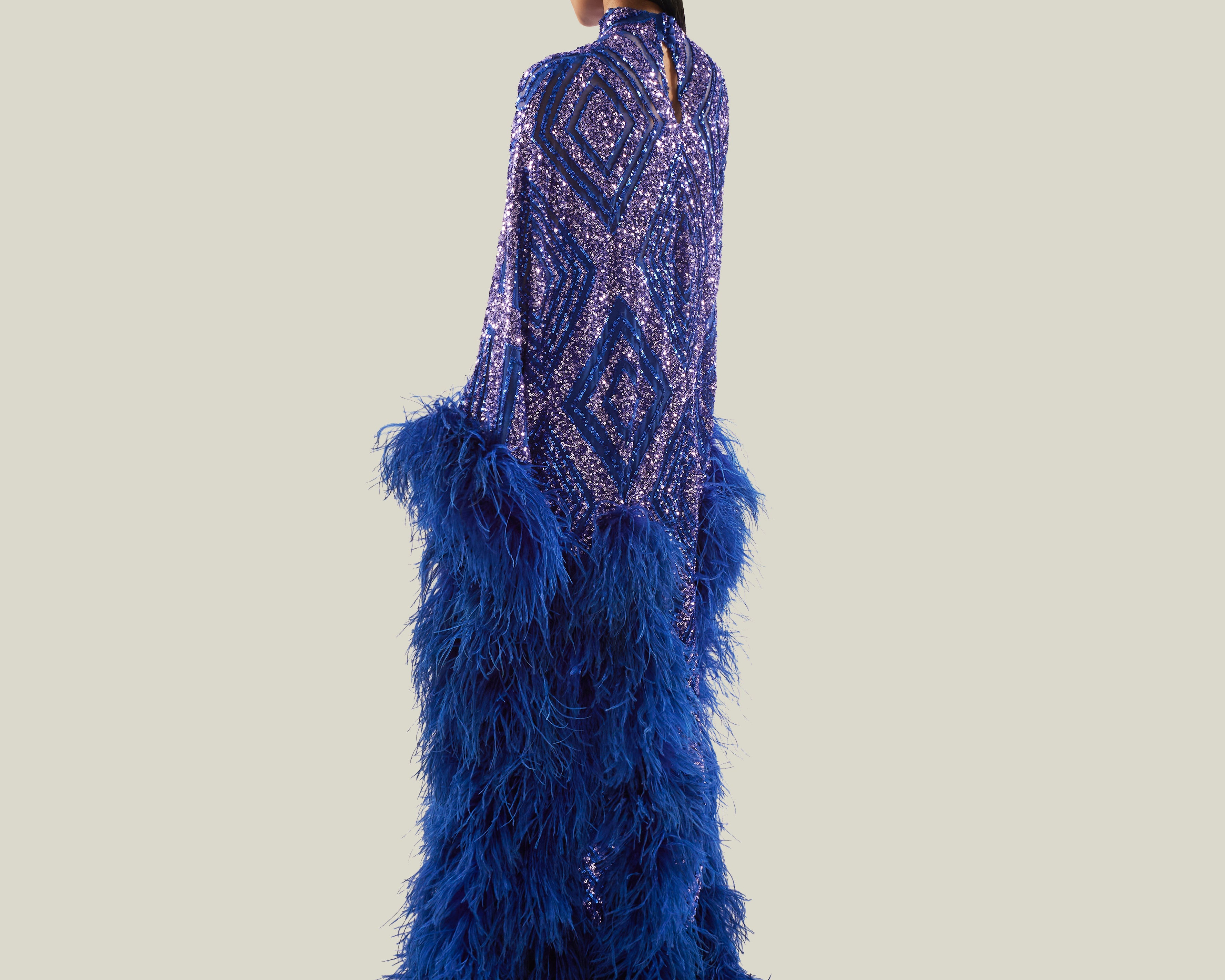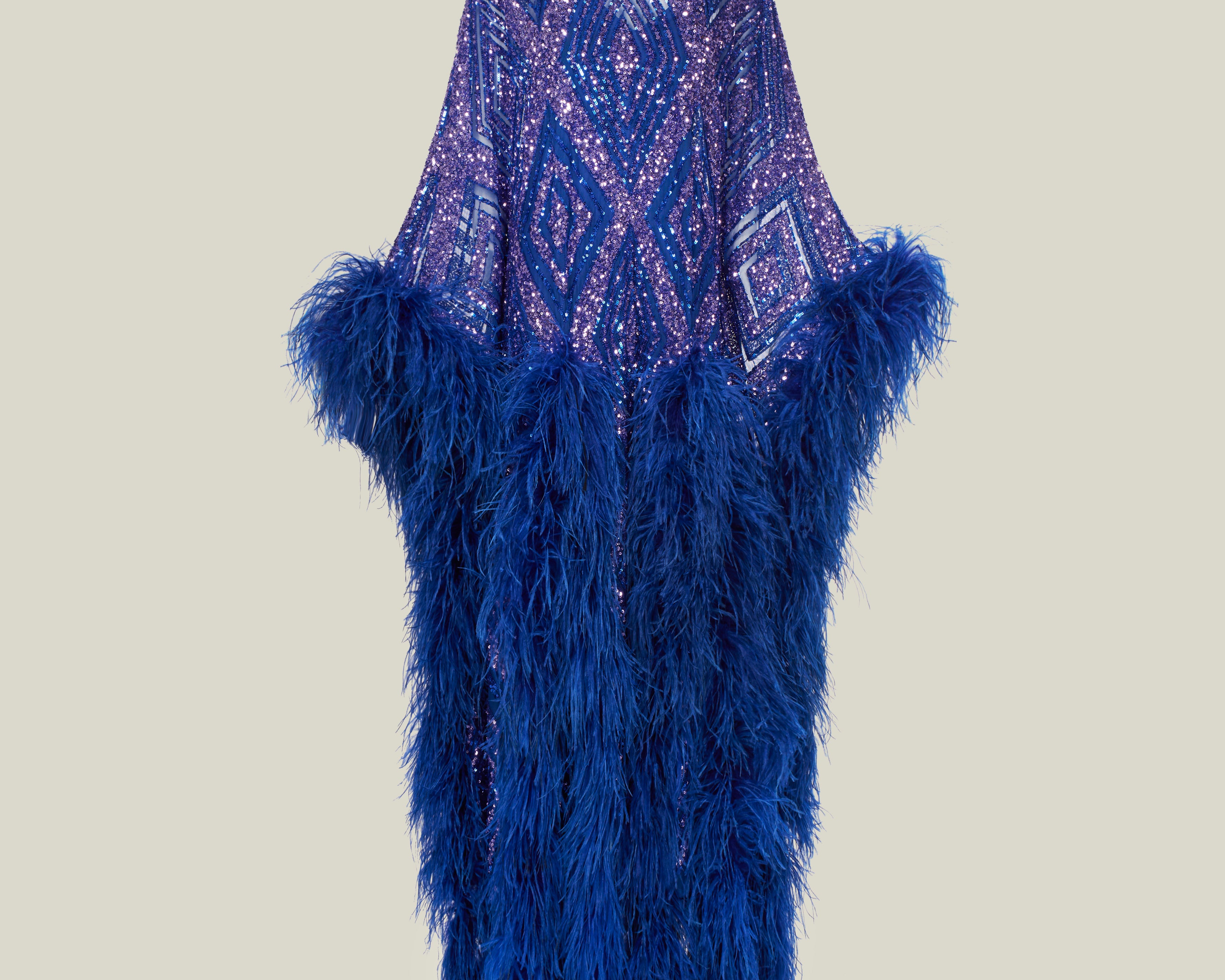 The most opulent design in the collection, the Casta Diva Follies is a theatrical kaftan entirely covered in geometric, bicolor sequin embroidery. Crafted from sheer tulle, the fabric plays with transparency and light, while the silhouette is defined by a high neck and long sleeves. A dramatic cascade of nearly 11 meters of ostrich feathers flows along the cuffs and down the front and back, amplifying movement and presence. A glamorous showpiece designed to dazzle with every step.