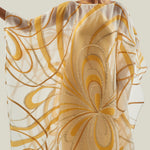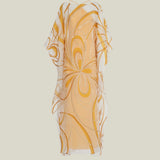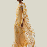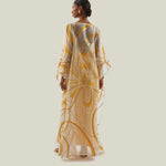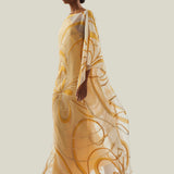 The Clarke Kaftan is a celebration of Italian craftsmanship, featuring a psychedelic 1960s-inspired pattern in multicolour three-dimensional fil coupé, expertly woven in Como. Underneath, a contrasting halter-neck slip in stretch viscose-blend crepe cady creates a dynamic interplay of colour and transparency, amplifying the kaftan’s bold, free-spirited elegance with a modern, layered twist.