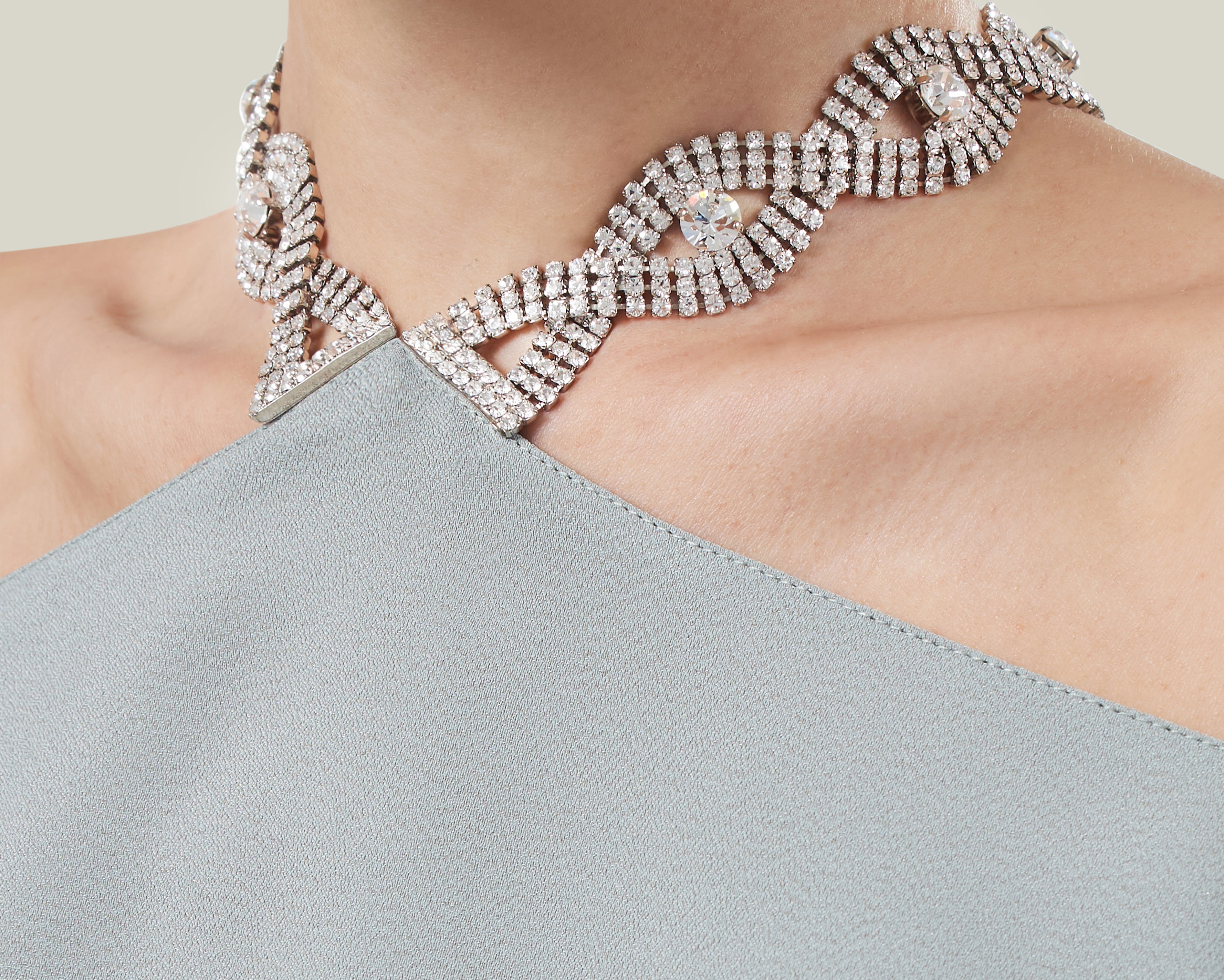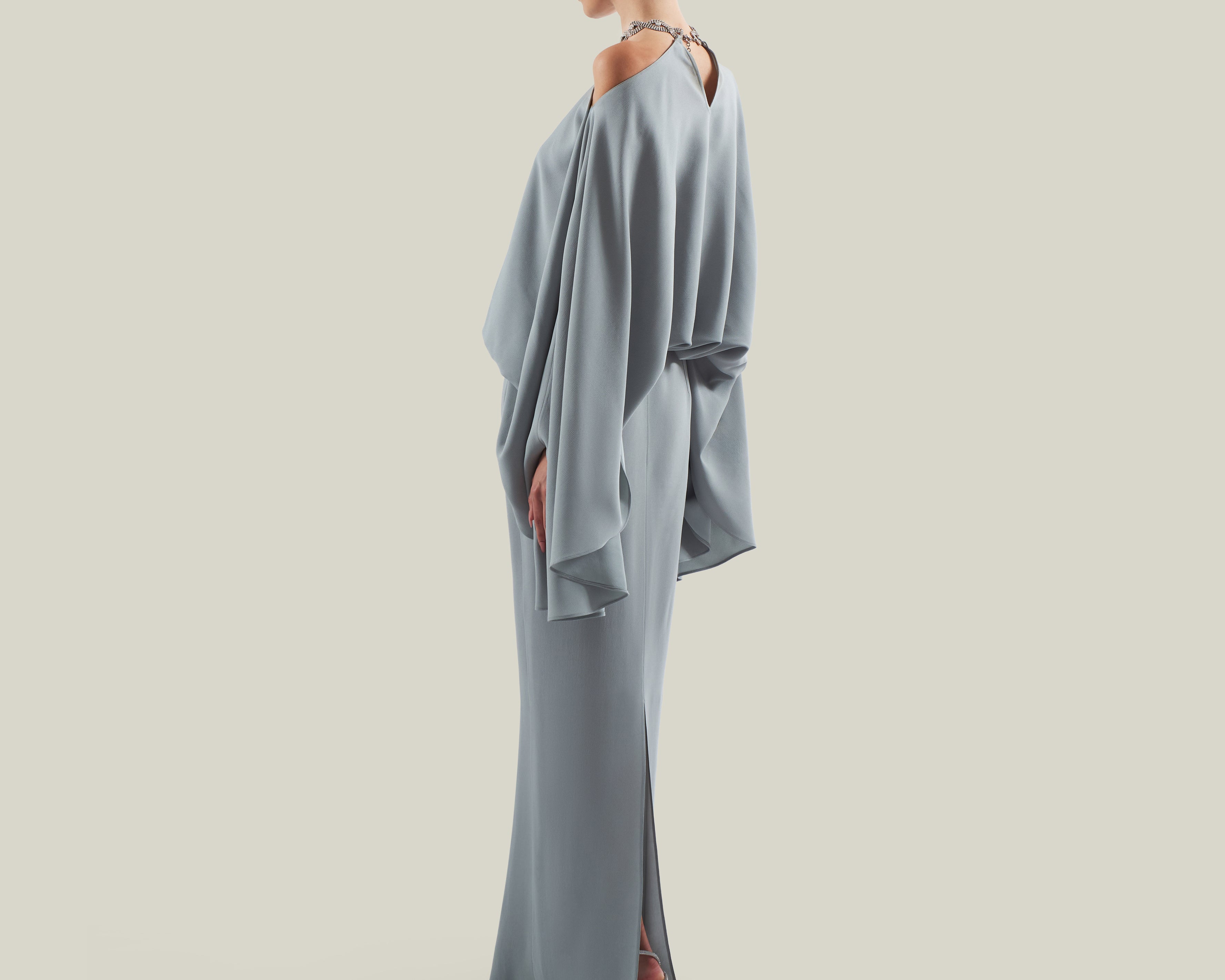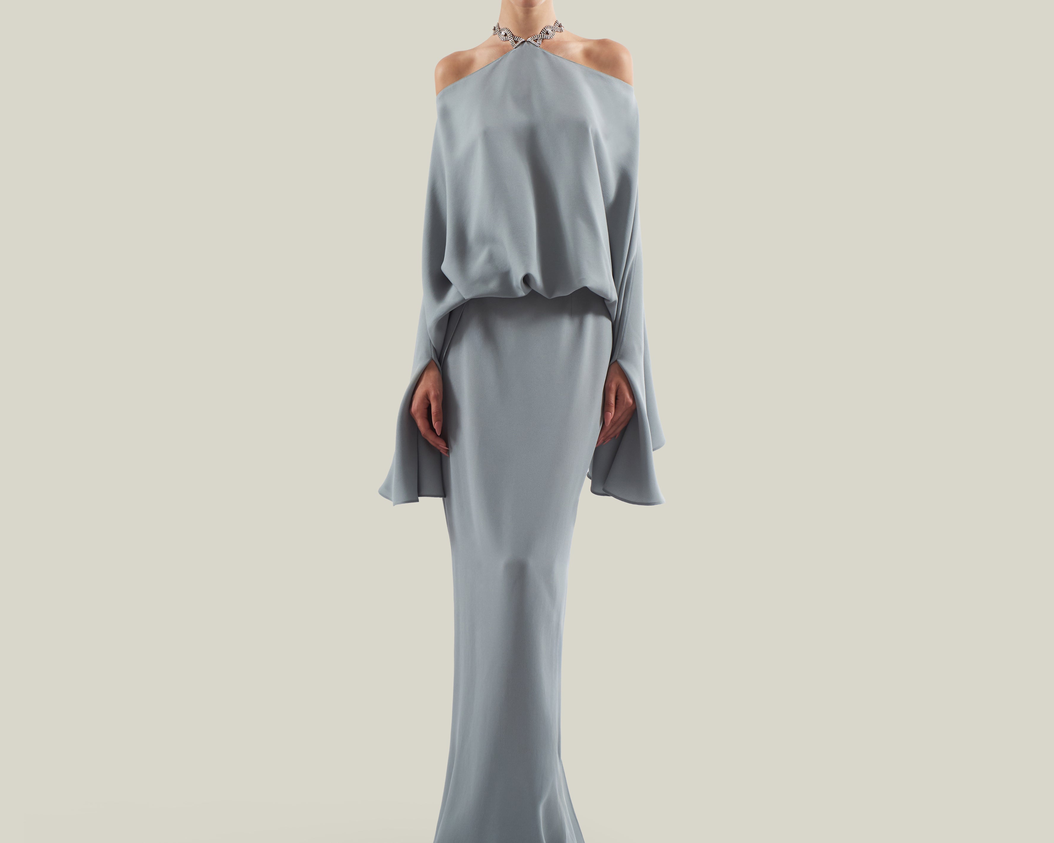 Crafted from fluid viscose-blend crepe cady, the Cyclades Crystal embodies refined simplicity and luminous grace. The dress features a cold-shoulder halter-neck blouson that drapes fluidly into a column skirt, creating an elegant, elongated silhouette. At the neckline, a radiant crystal choker necklace, crafted in Italy, adds a touch of light, elevating the piece into a statement of understated glamour.