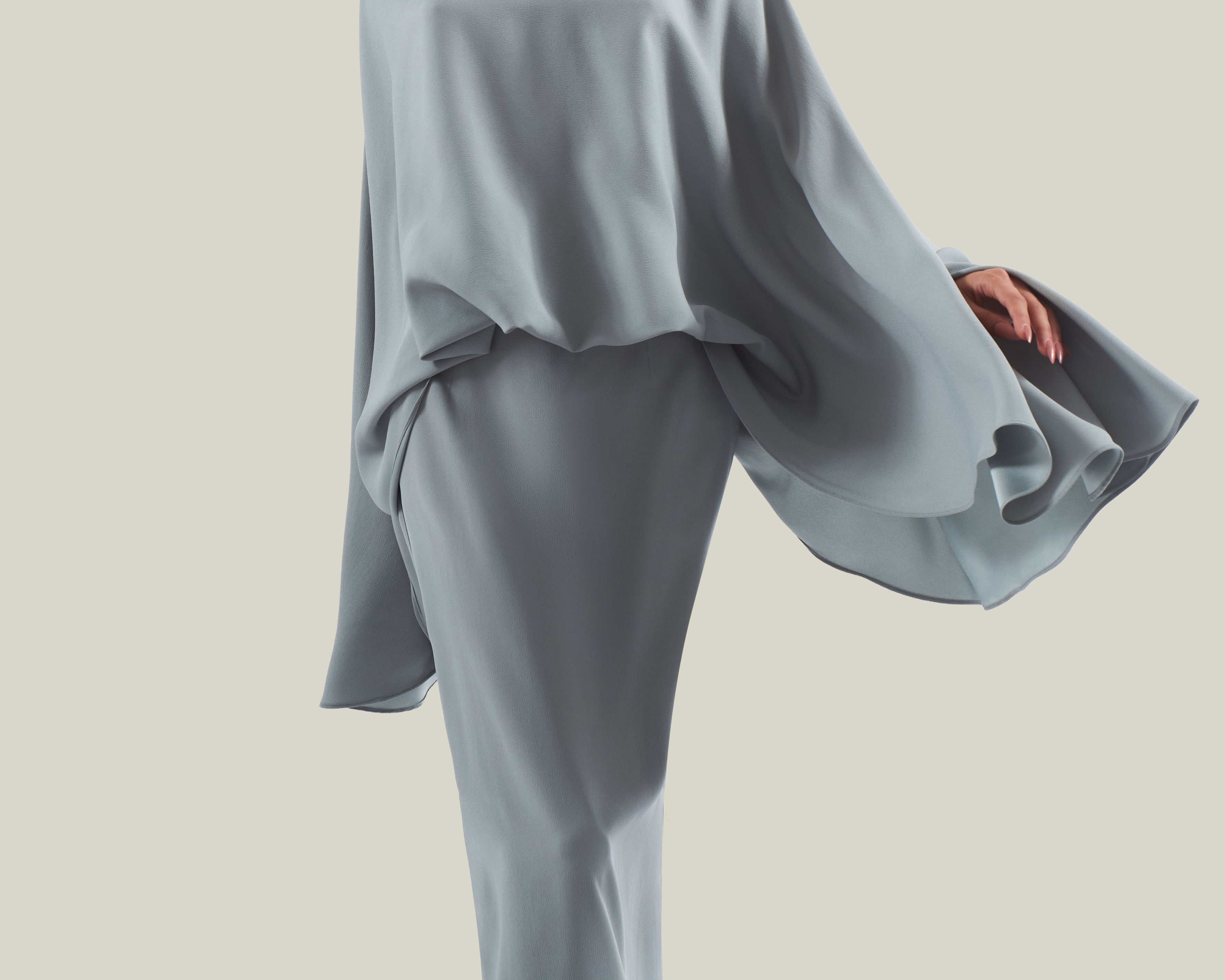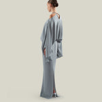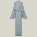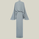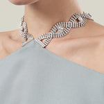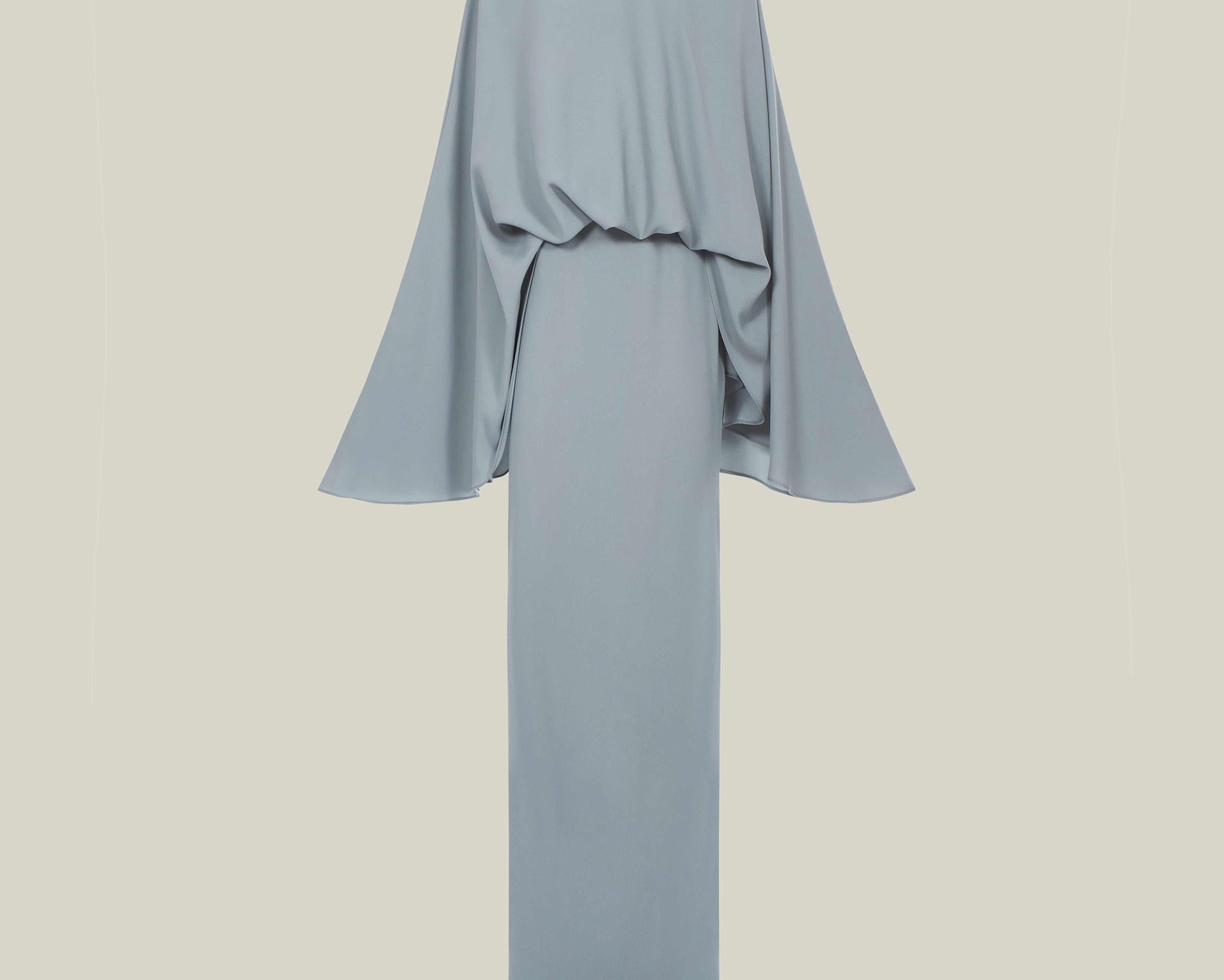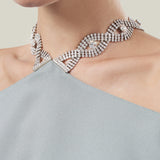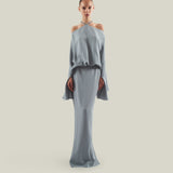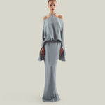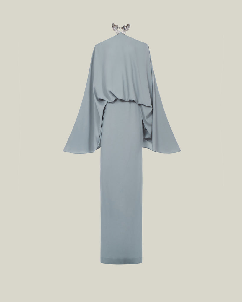 Crafted from fluid viscose-blend crepe cady, the Cyclades Crystal embodies refined simplicity and luminous grace. The dress features a cold-shoulder halter-neck blouson that drapes fluidly into a column skirt, creating an elegant, elongated silhouette. At the neckline, a radiant crystal choker necklace, crafted in Italy, adds a touch of light, elevating the piece into a statement of understated glamour.