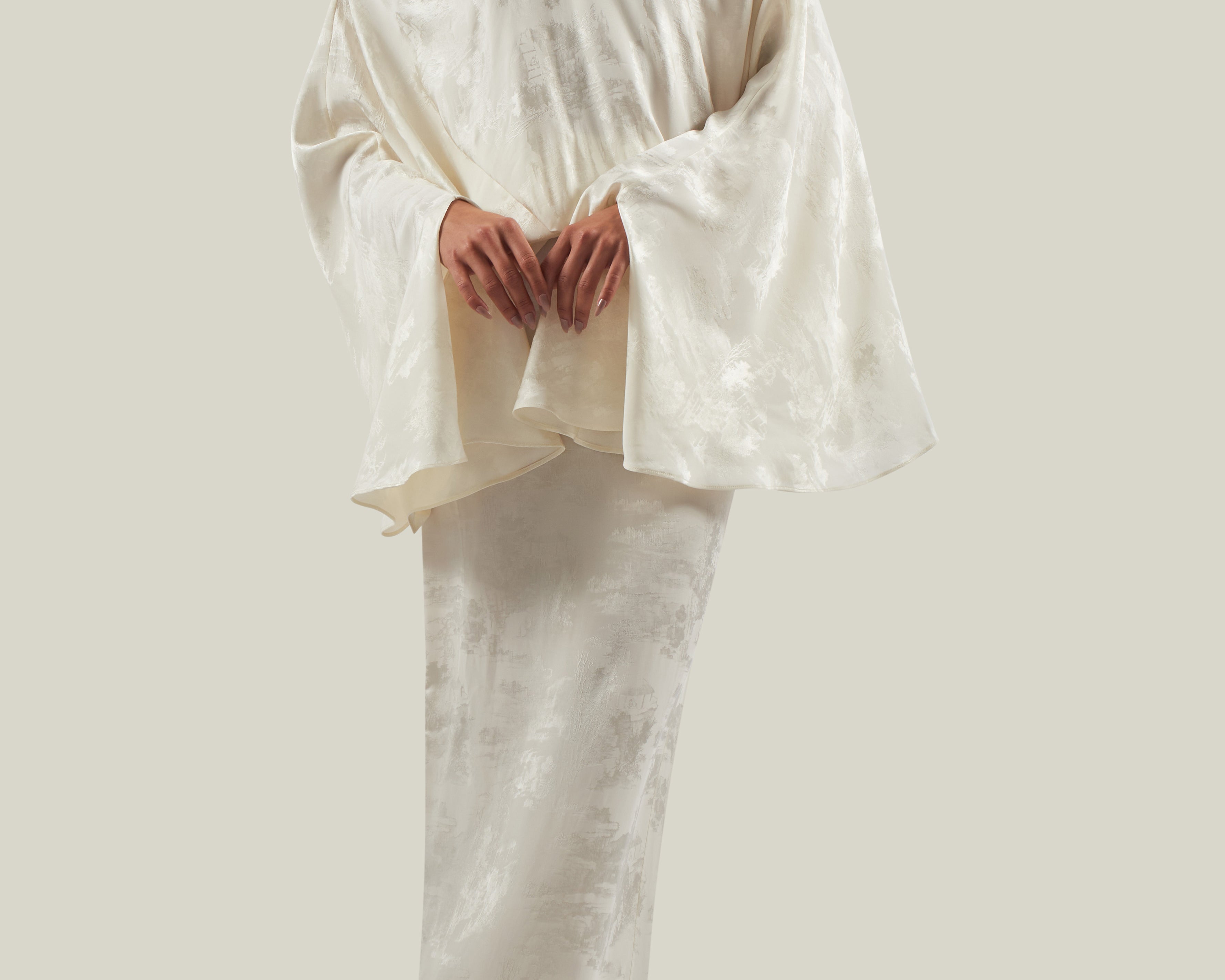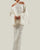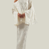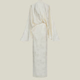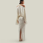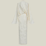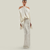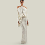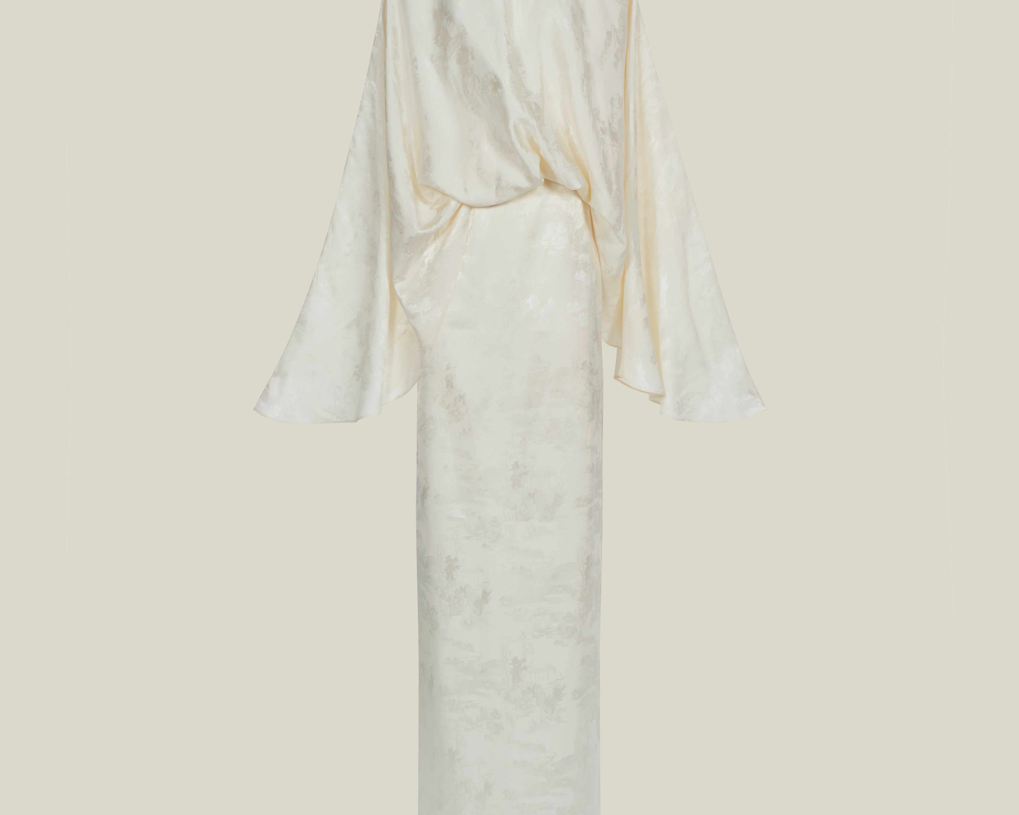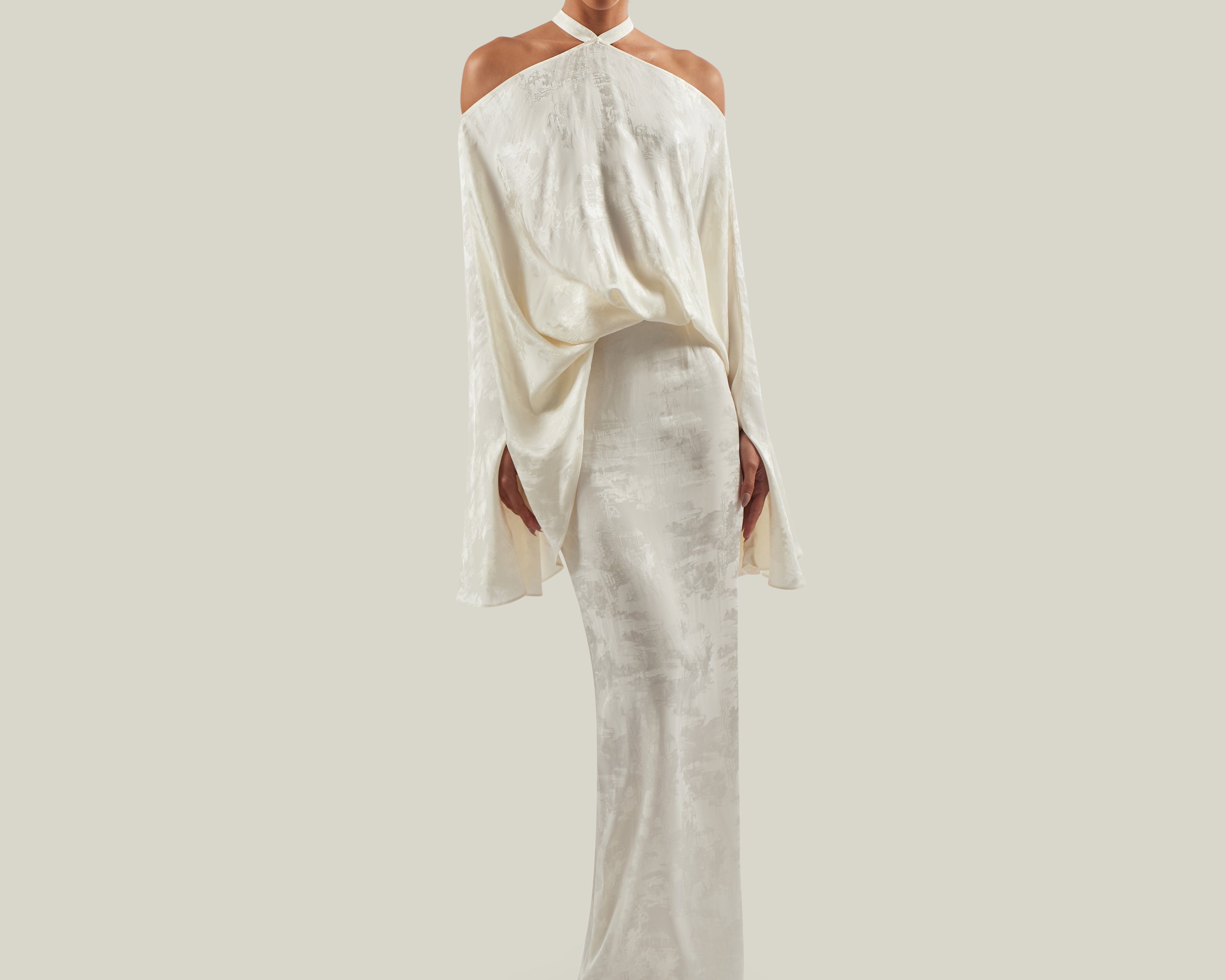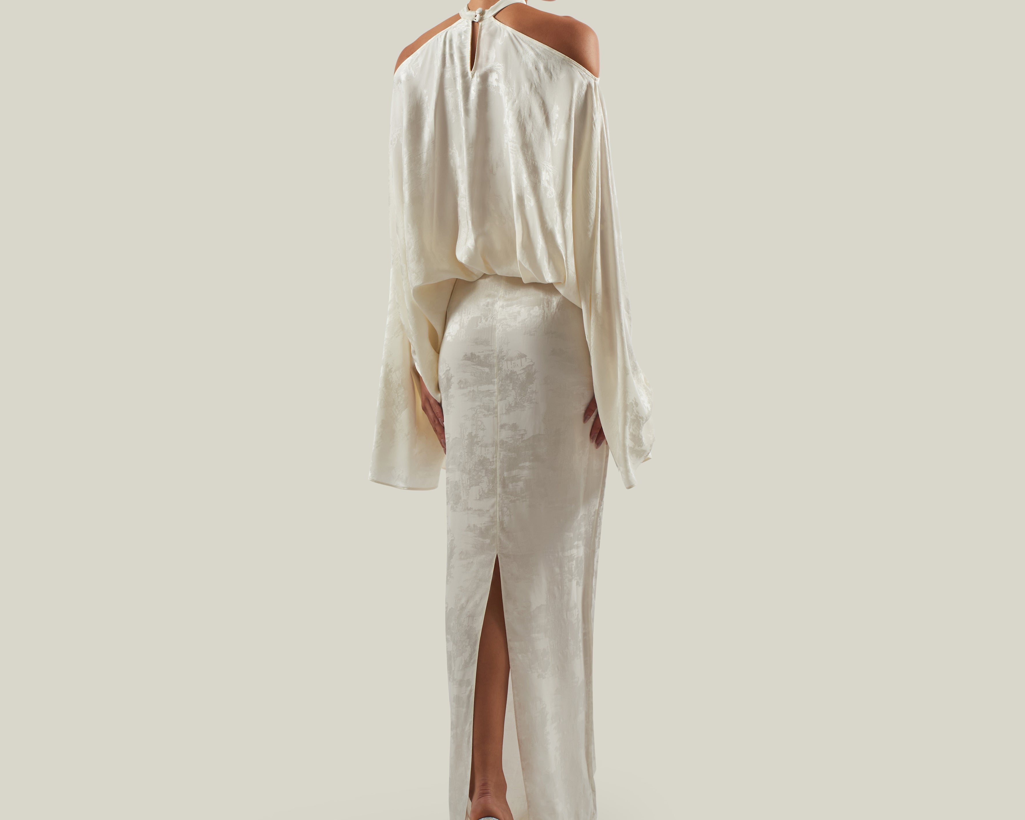 The Cyclades Toile Dress is made from a Toile-De-Jouy motif jacquard made in Como, Italy. features a cold-shoulder halter-neck blouson softly tucked into a floor-length column skirt, creating a harmonious balance between structure and ease.