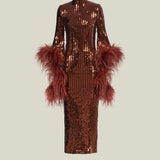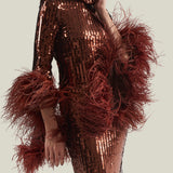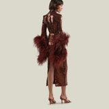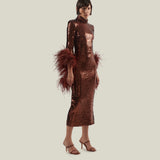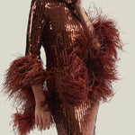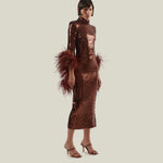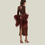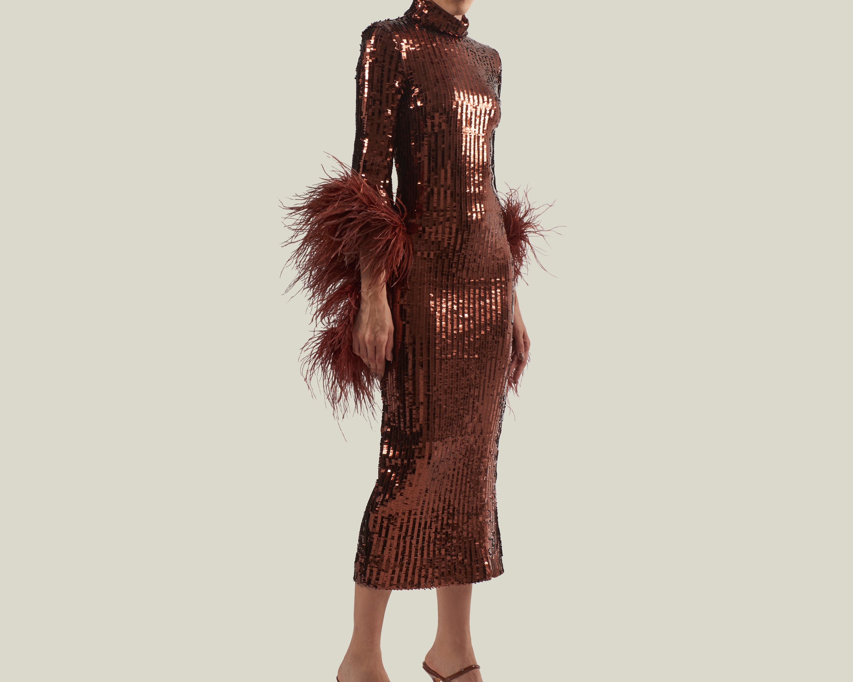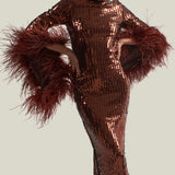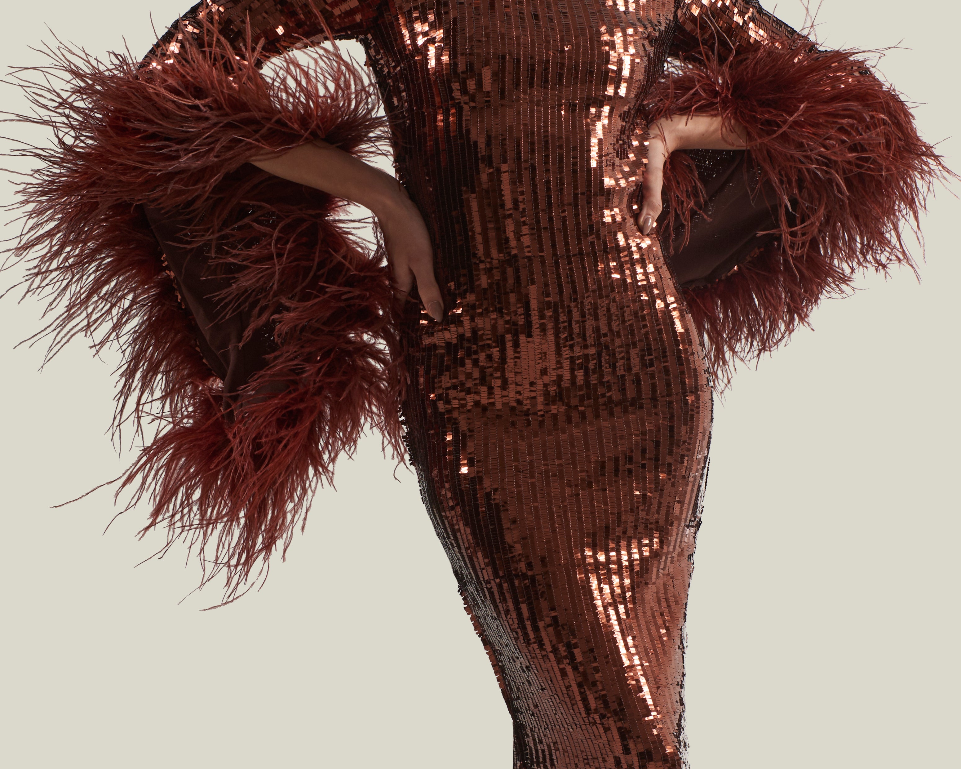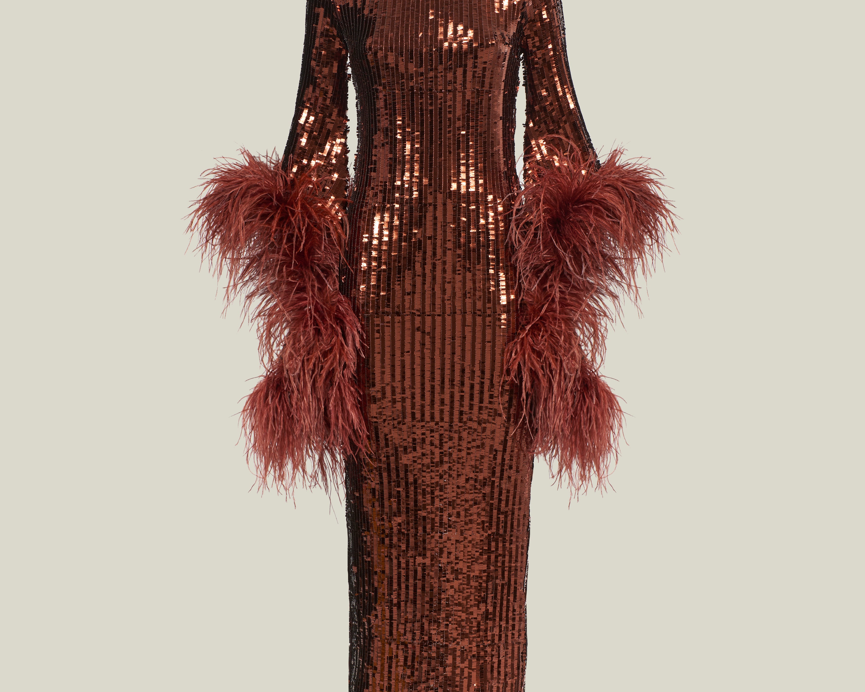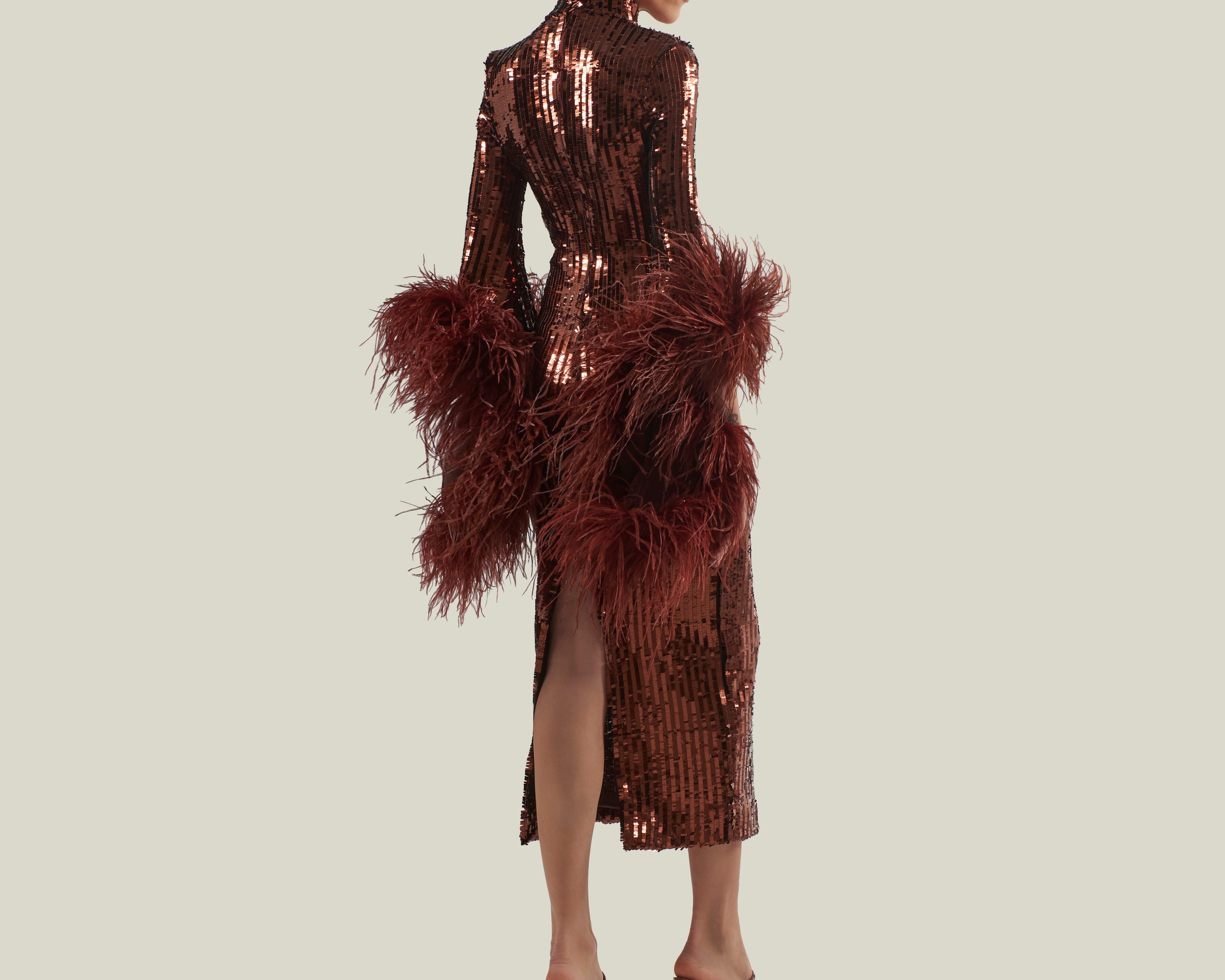 A showstopper. The Del Rio Disco is an ankle-length column dress made from rectangular metallic sequins, with bell sleeves fully trimmed with ostrich feathers that evoke pure Old Hollywood Glamour.