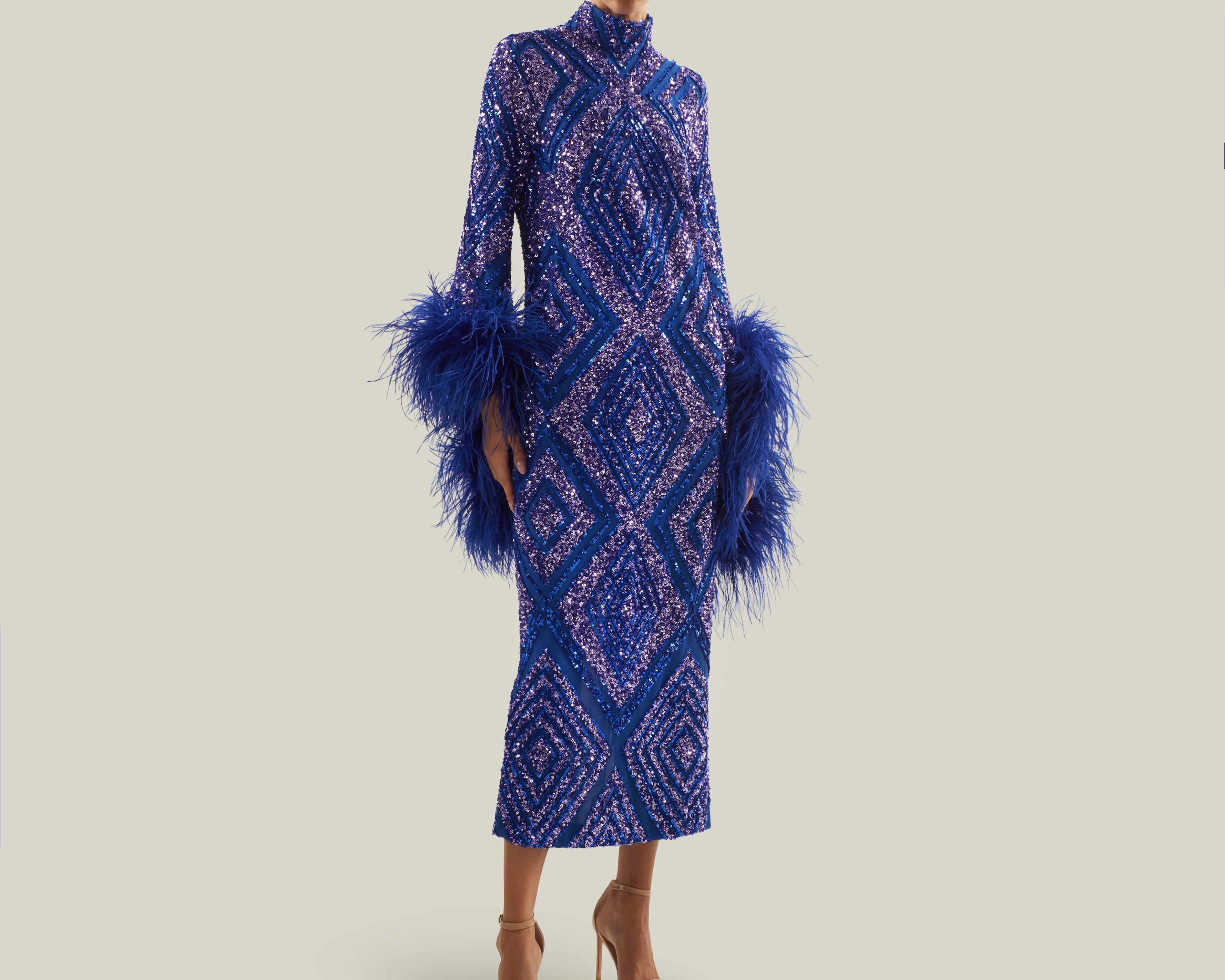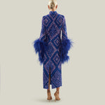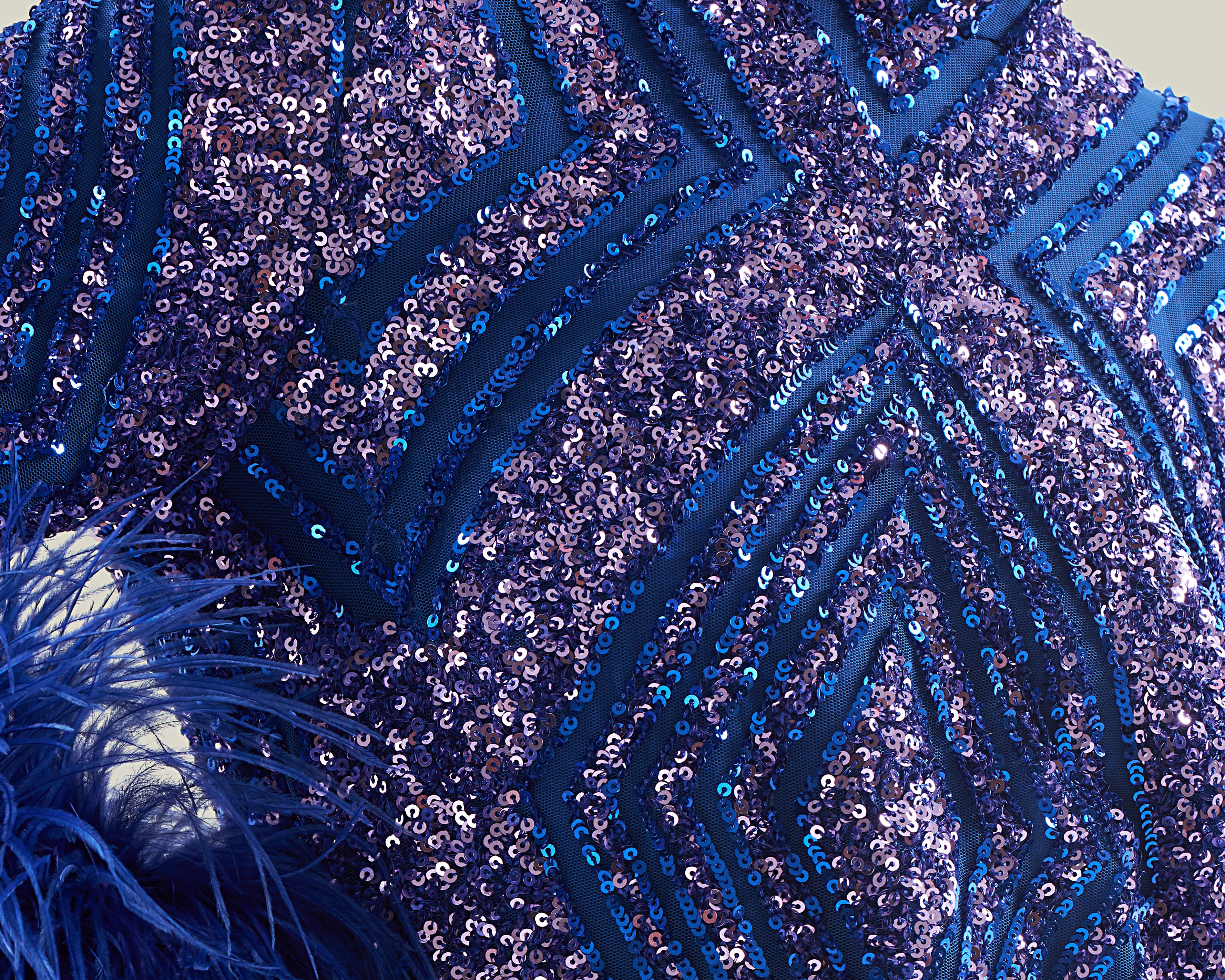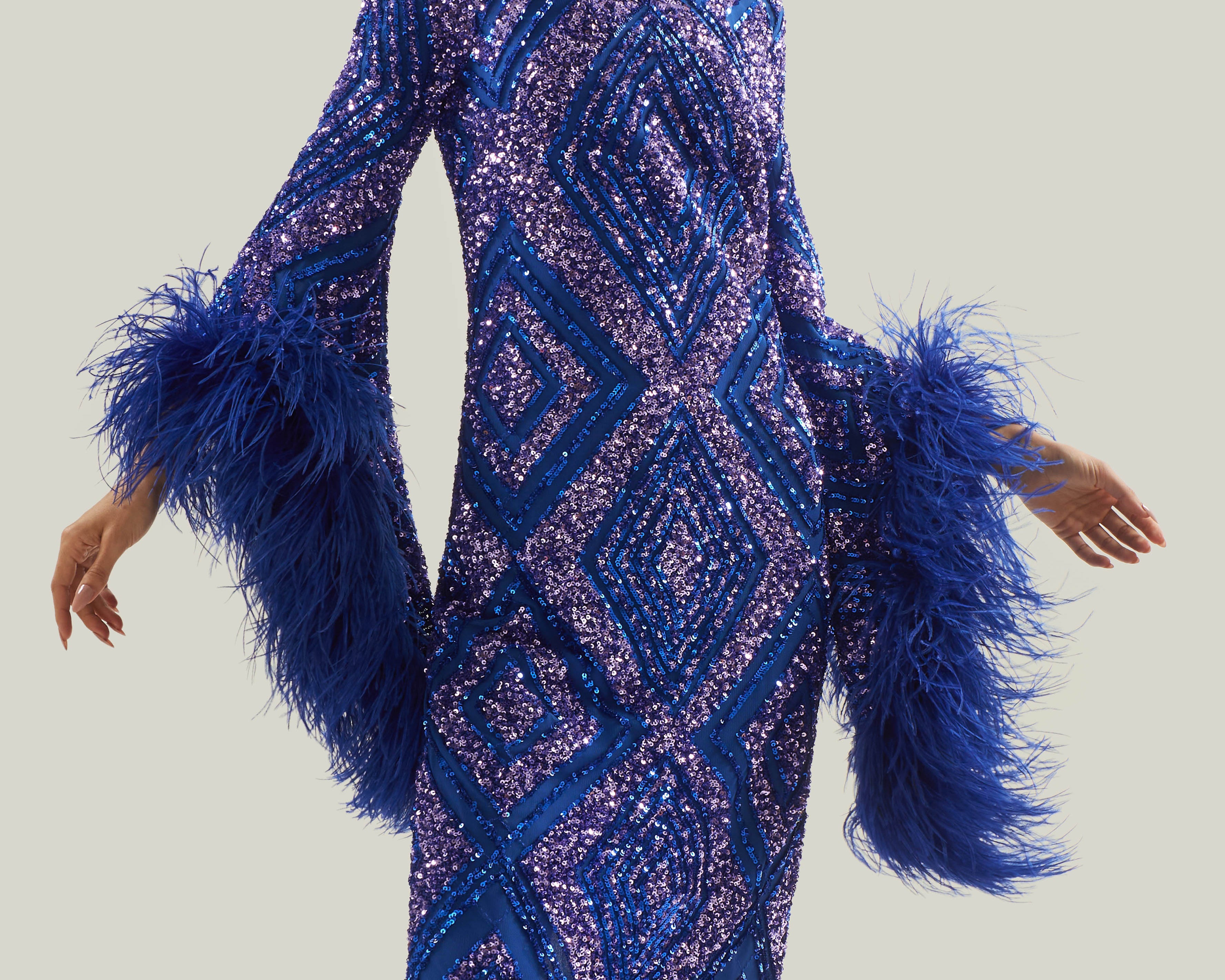 The Del Rio Disco is a stunning ankle-length column dress, shimmering with geometric bi-color sequins and adorned with bell sleeves fully trimmed in ostrich feathers. This show-stopping piece radiates vintage disco glamour with every movement, perfect for unforgettable nights and dazzling entrances.