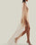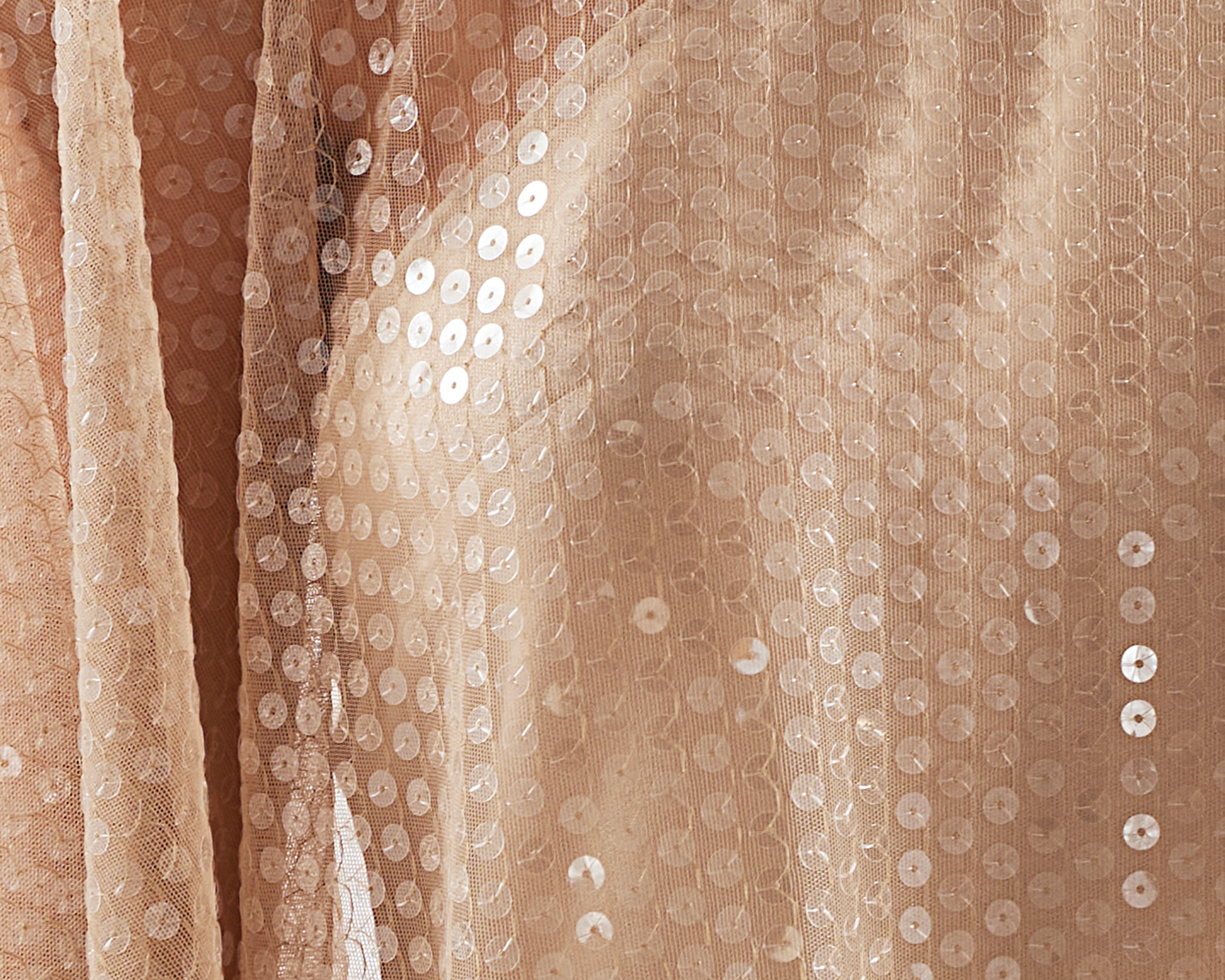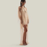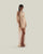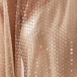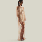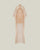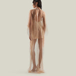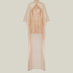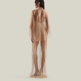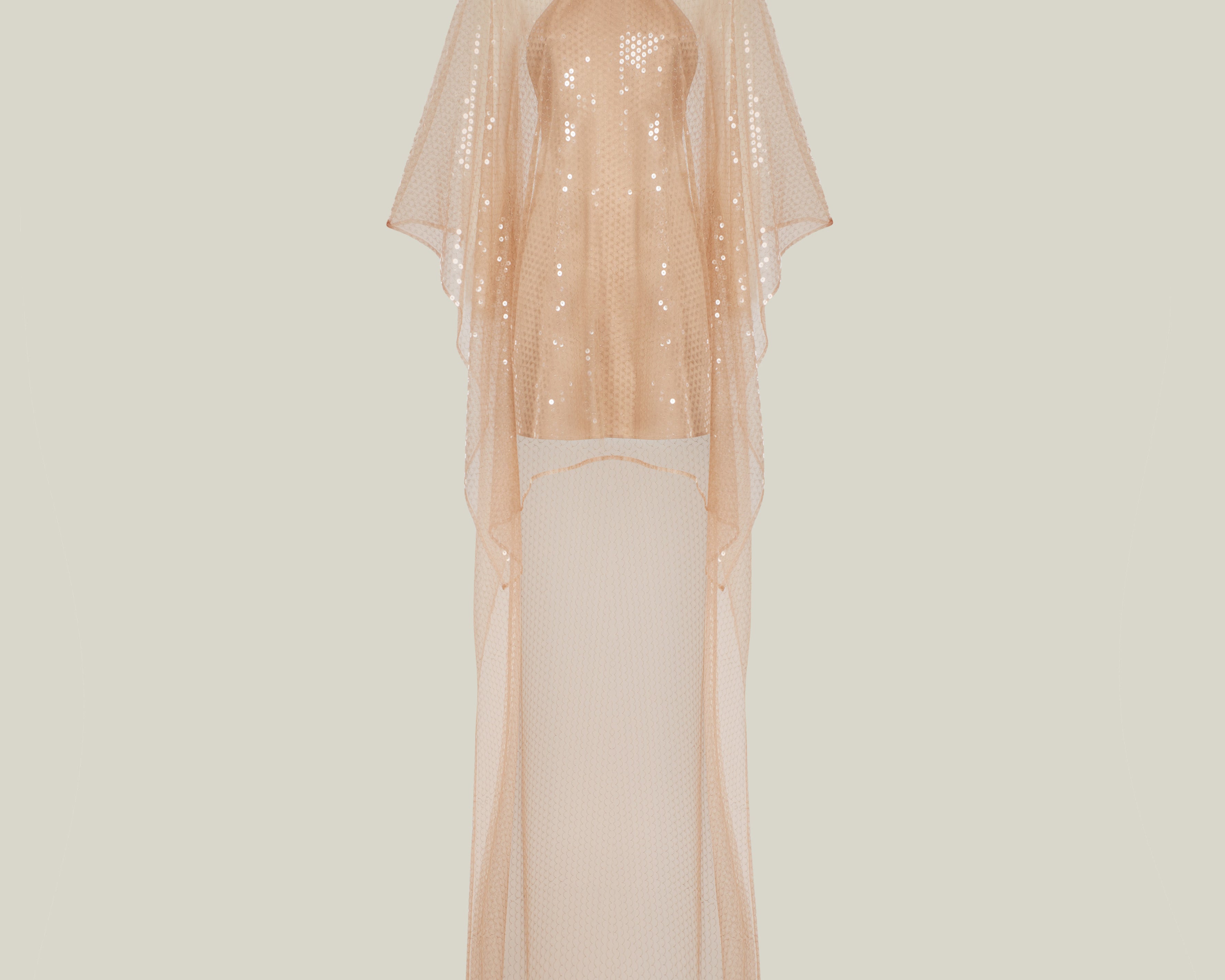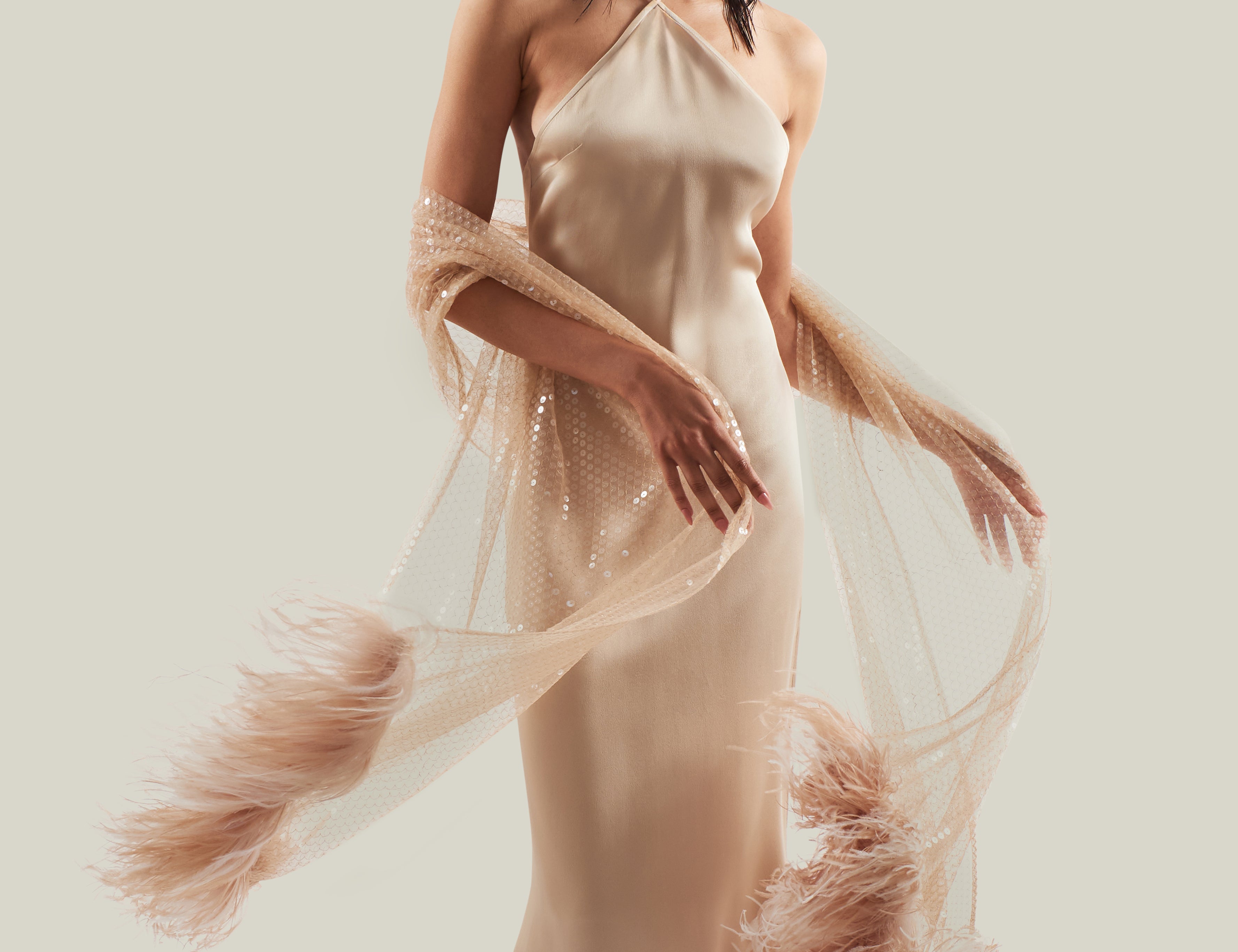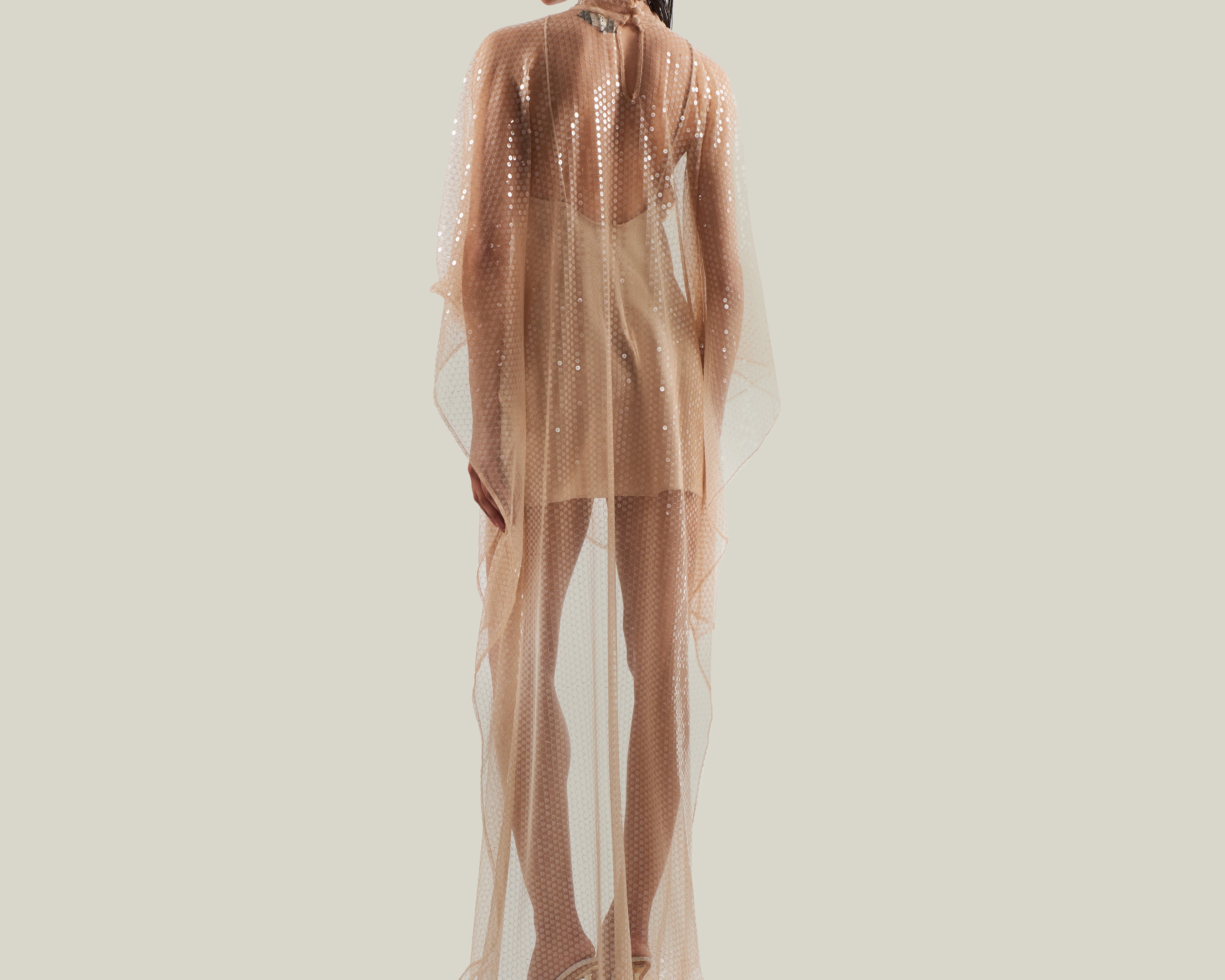 Soft luminosity and fluid sparkle define the Denver Disco, a sequined high-neck, high-low hem kaftan. Entirely embroidered with sequins that capture the light with every movement, the look is completed by a halter neck slip mini dress in stretch crepe cady, adding a touch of sensual balance beneath the shimmer.