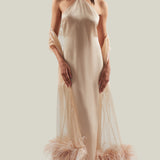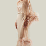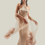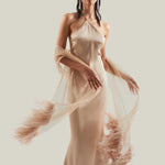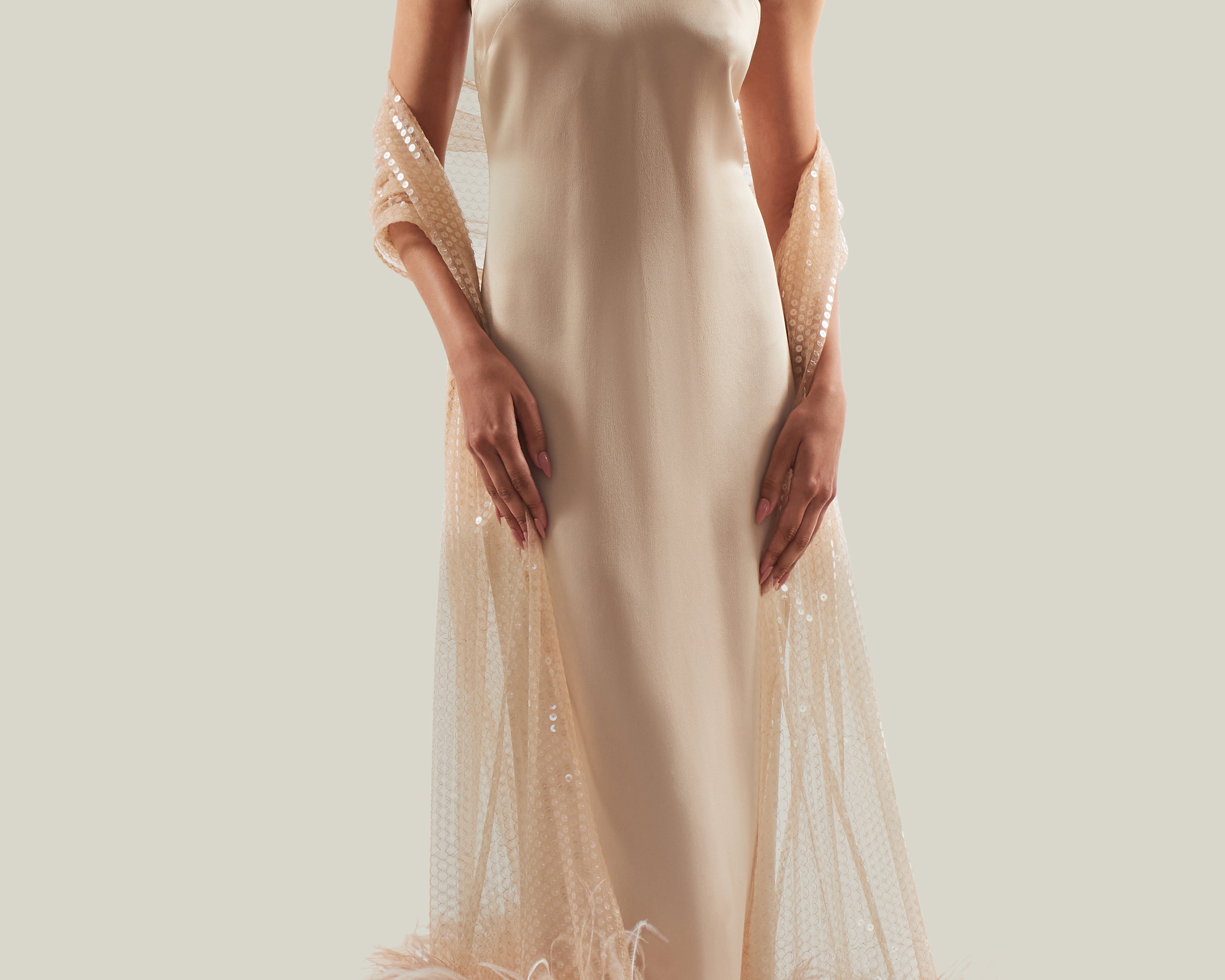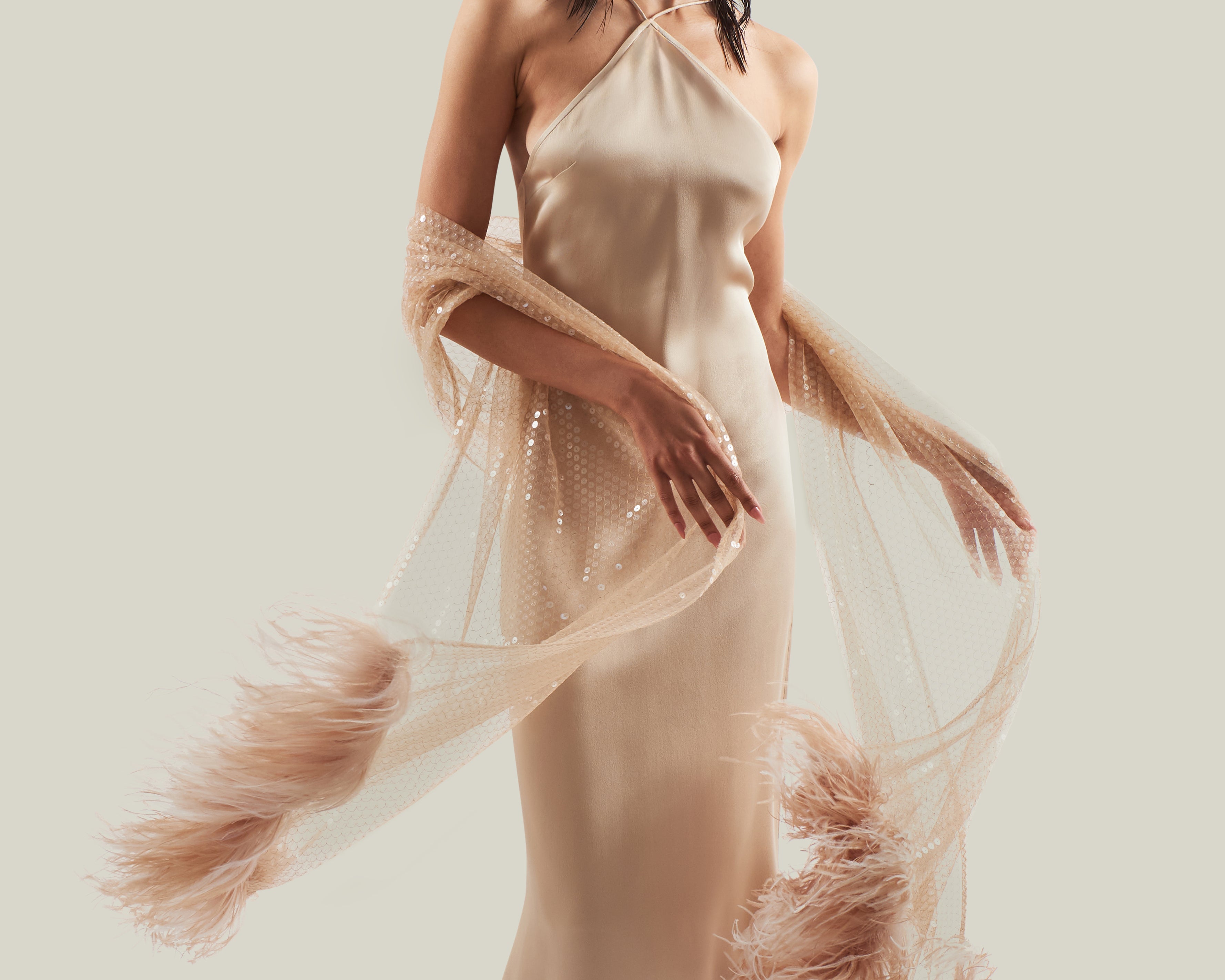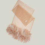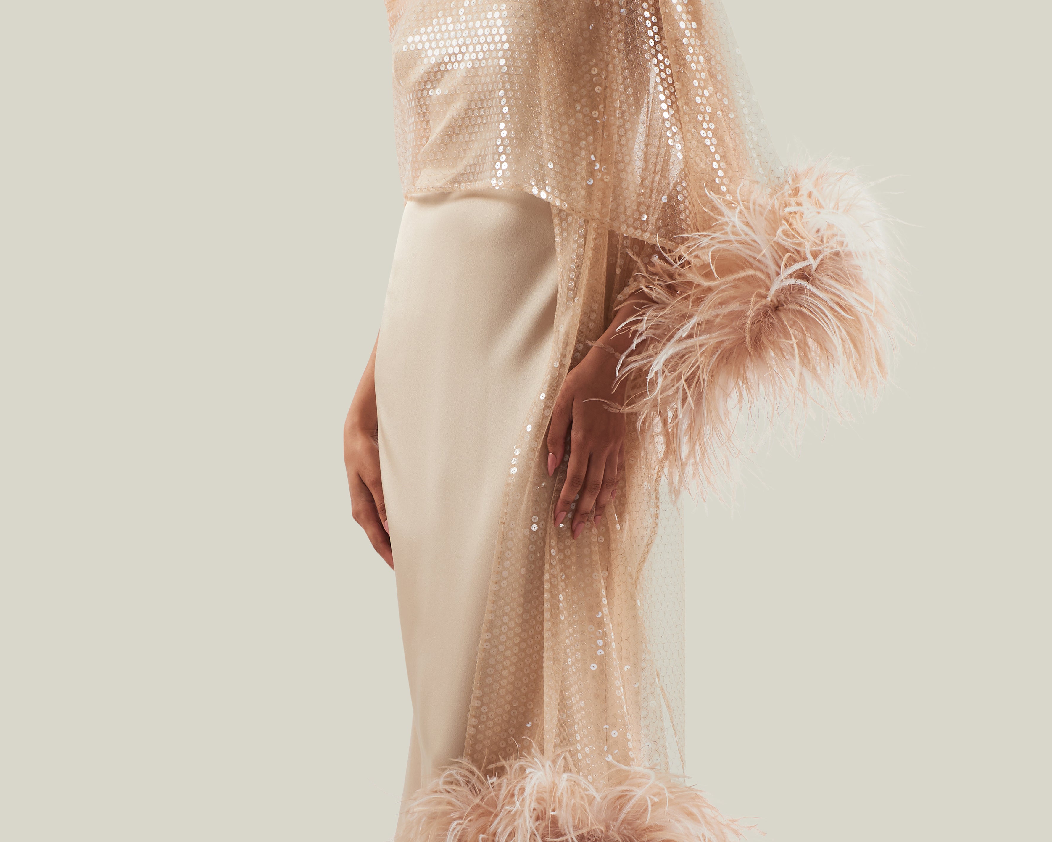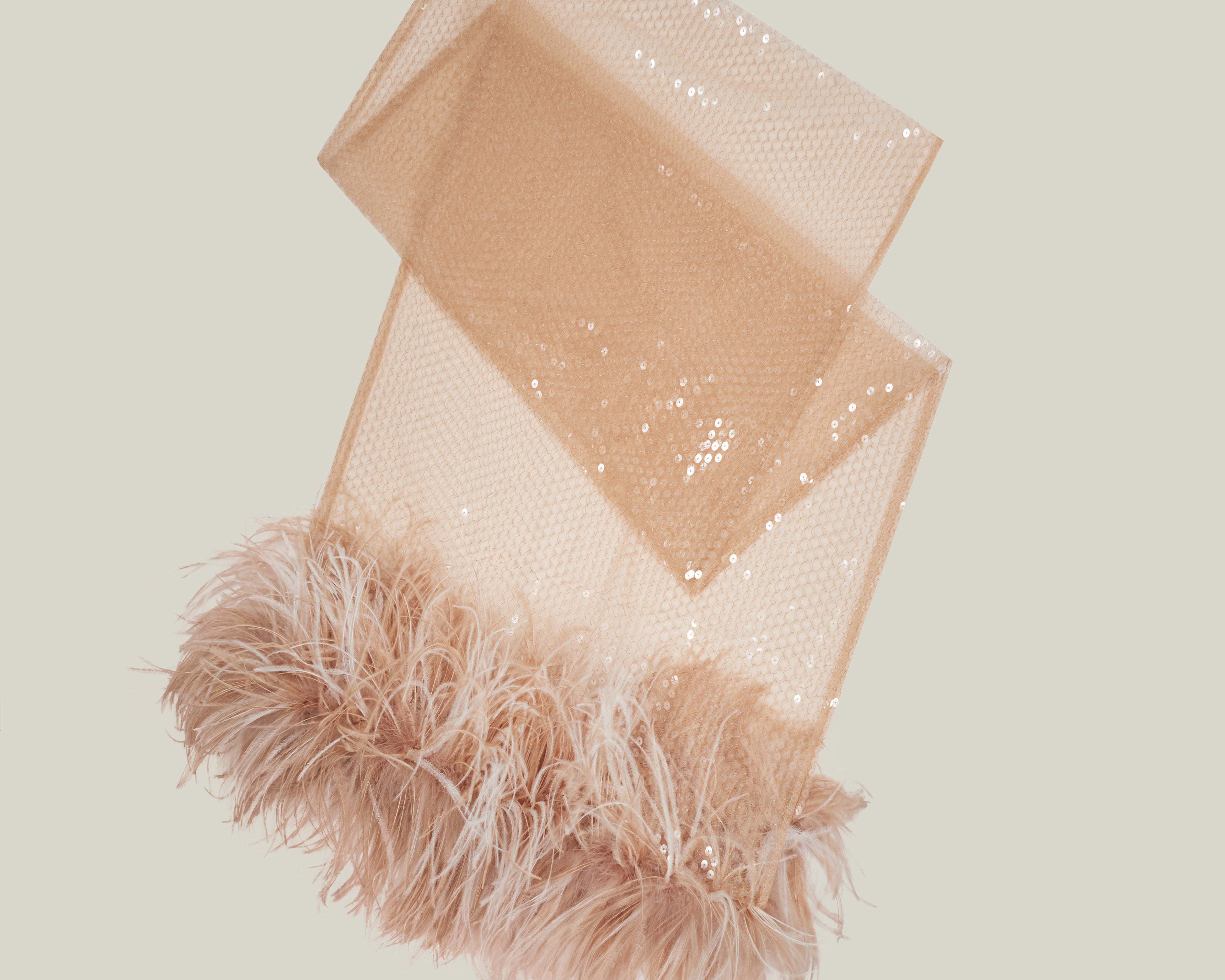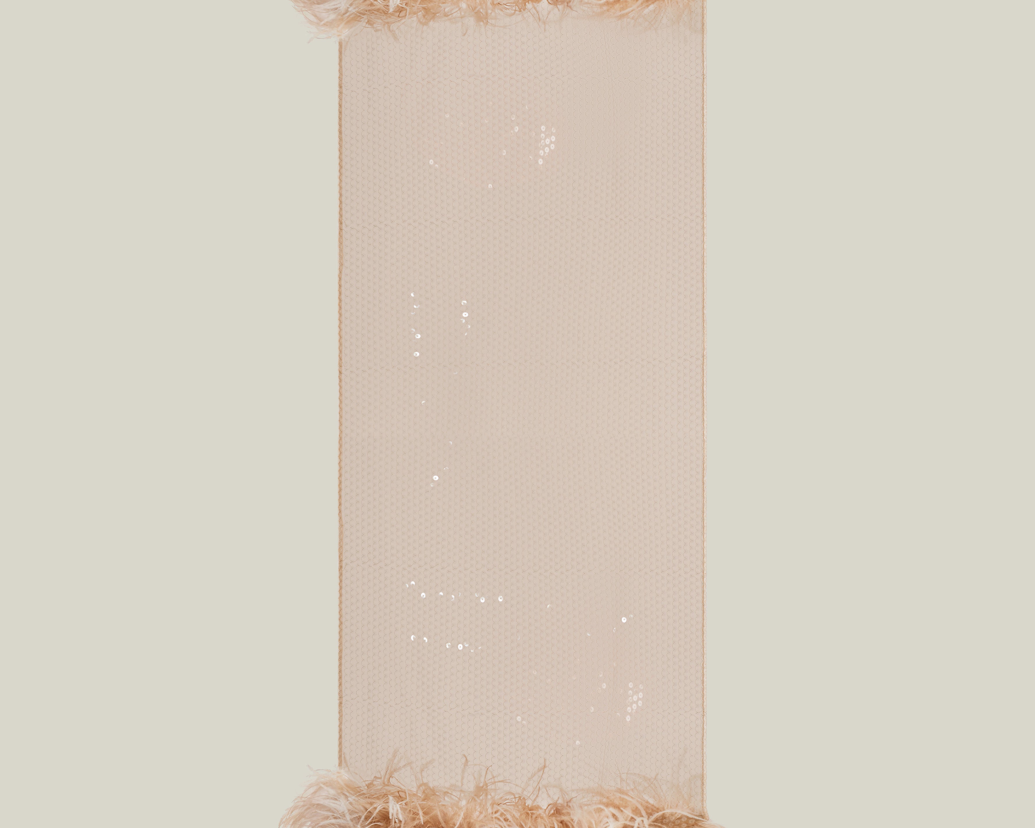 The Dita Disco Stole is crafted from semi-transparent sequins that shimmer with light at every movement. Trimmed with soft feathers at both ends, it adds a glamorous touch to any look. Draped over the shoulders, it becomes the perfect finishing detail for evening ensembles, embodying the playful yet refined spirit of celebration.