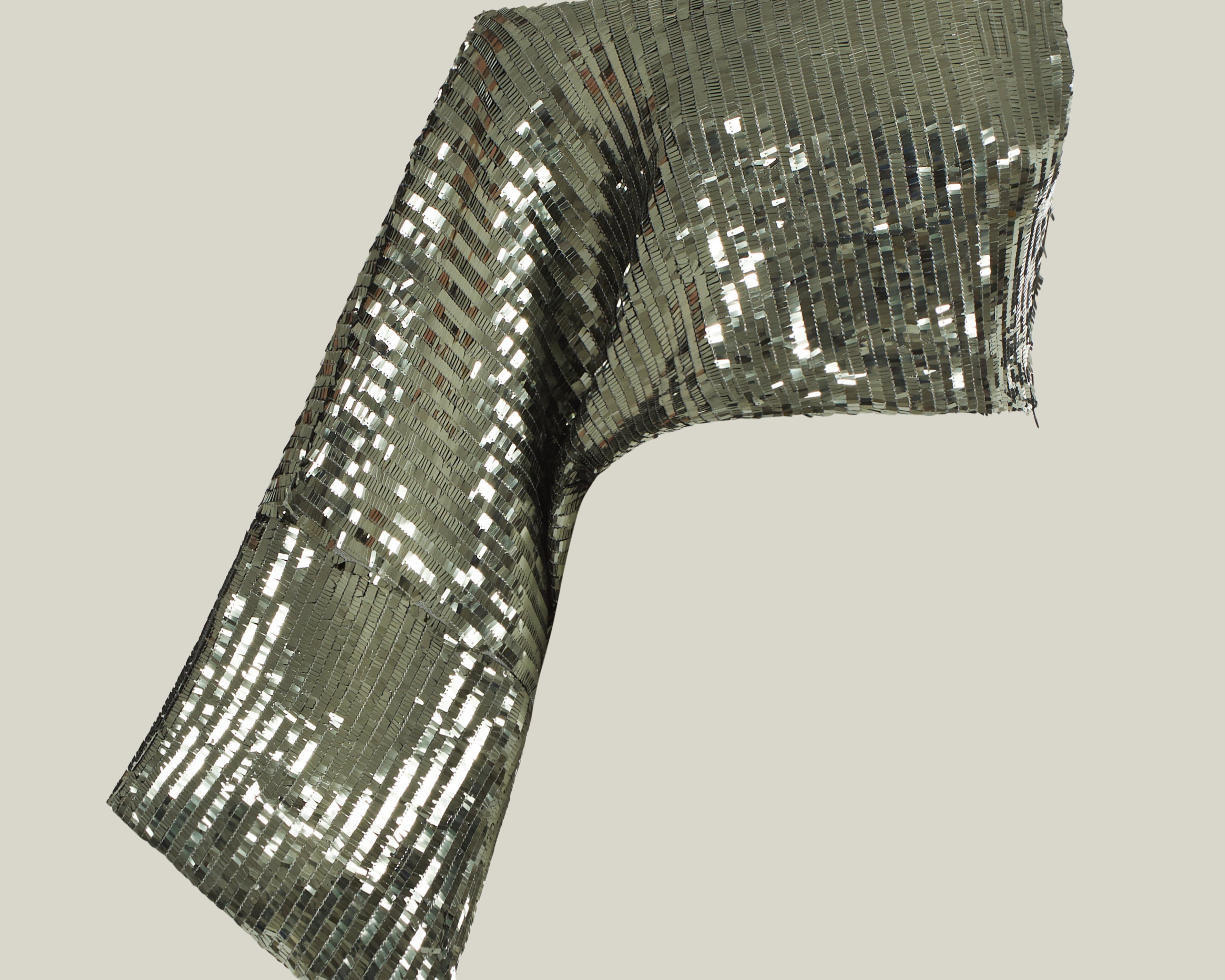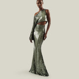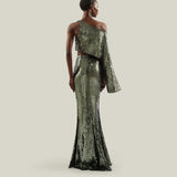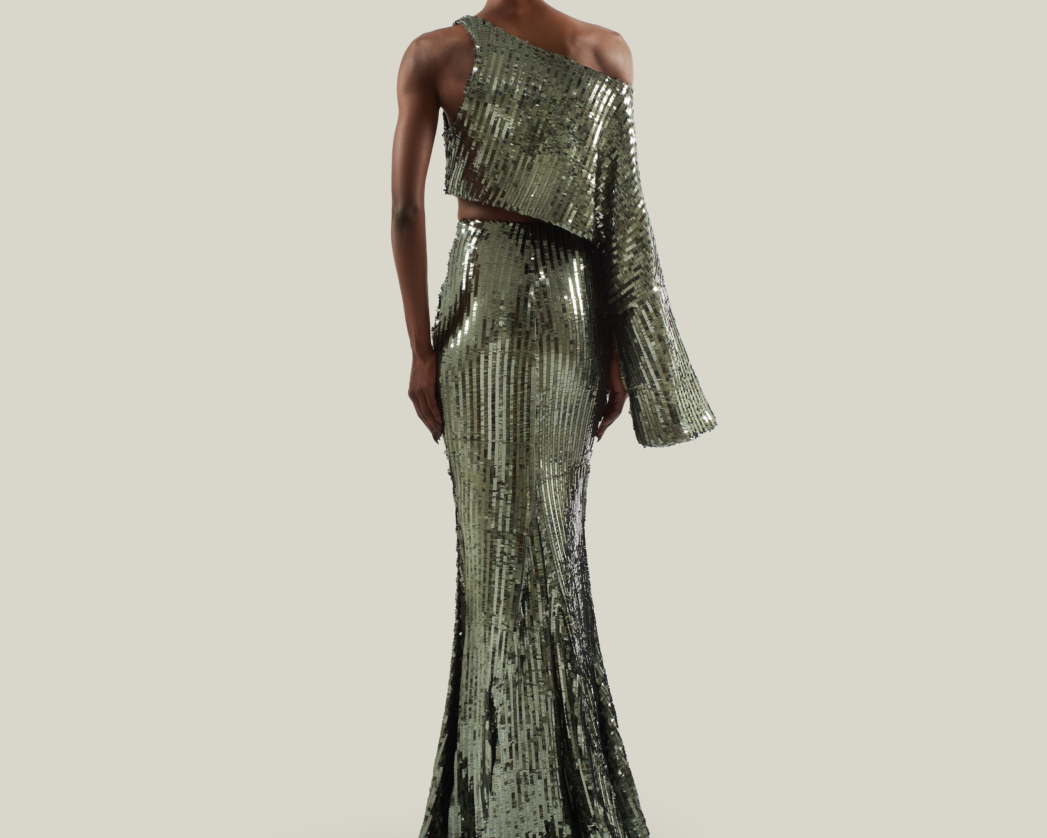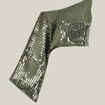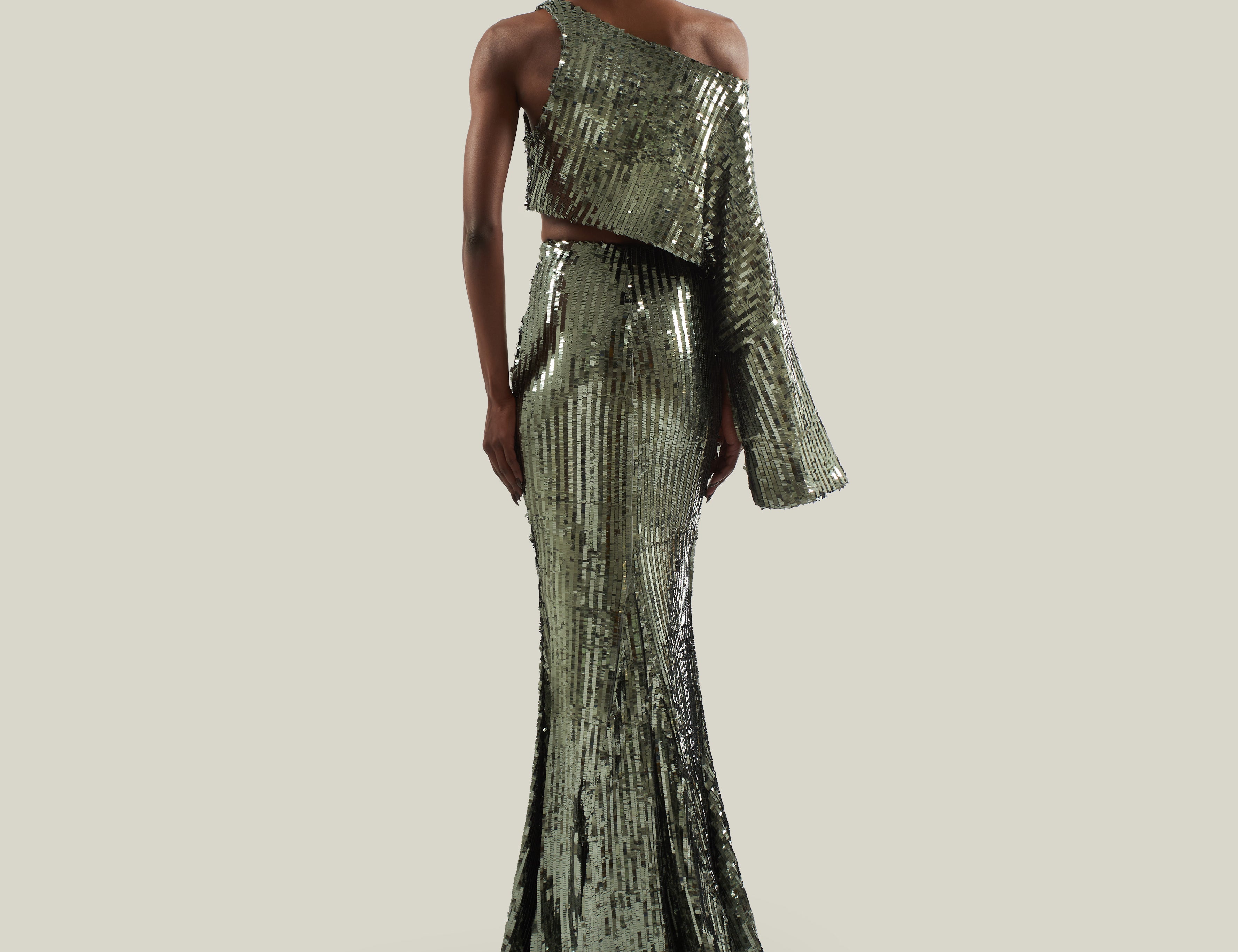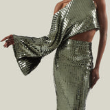 A bold sequined blouse designed with a striking asymmetrical silhouette, featuring a single sleeve balanced by an off-shoulder cut on the opposite side. The wide cuff adds a dramatic touch. Covered in luminous rectangular sequins, this statement piece is made to shine under the lights and elevate any party look. Pair it with the Ariel Disco Skirt for a show-stopping ensemble that celebrates glamour and confidence.