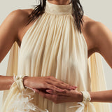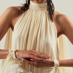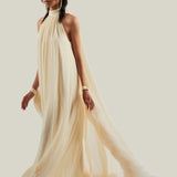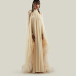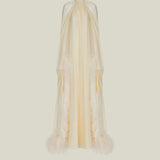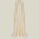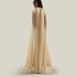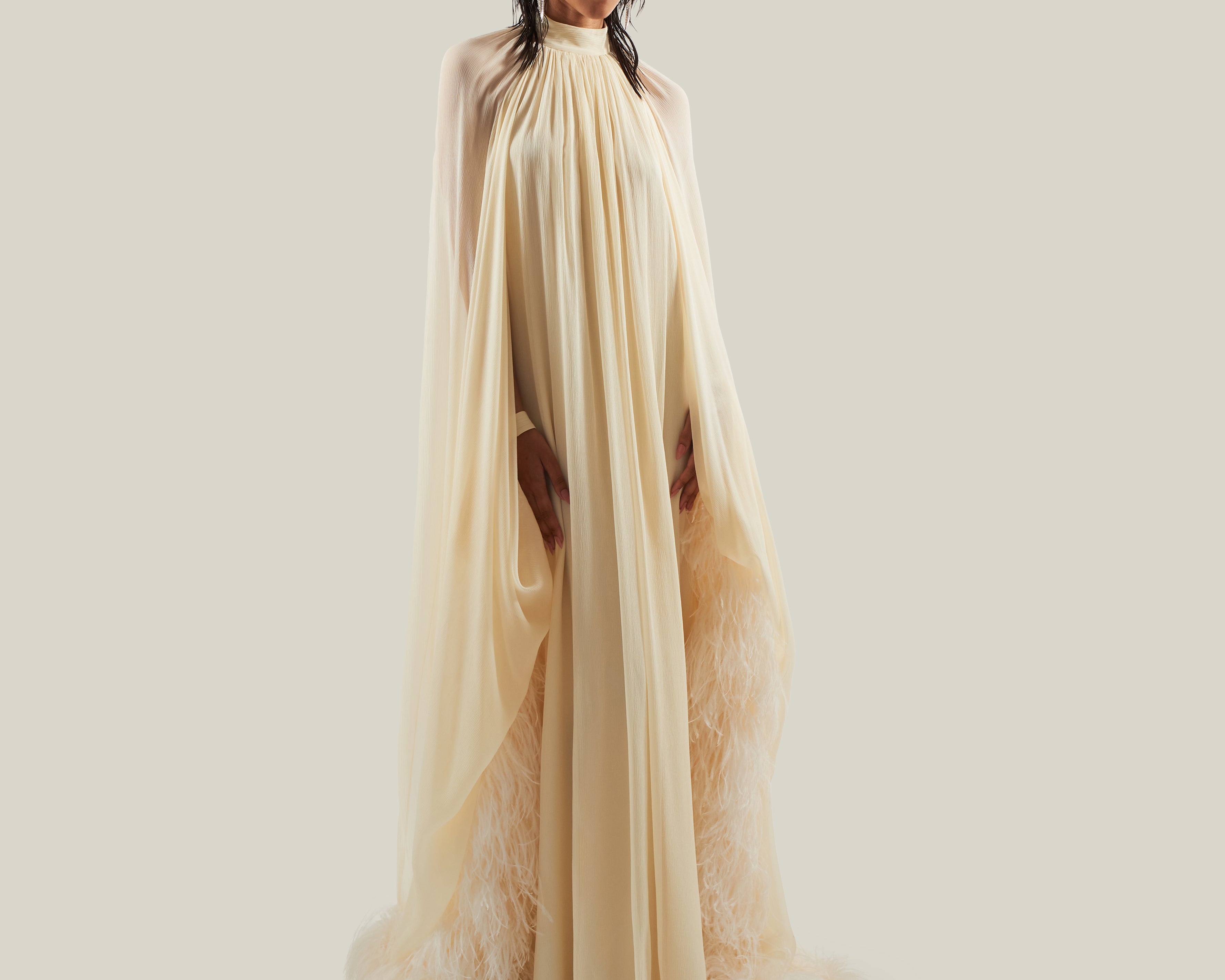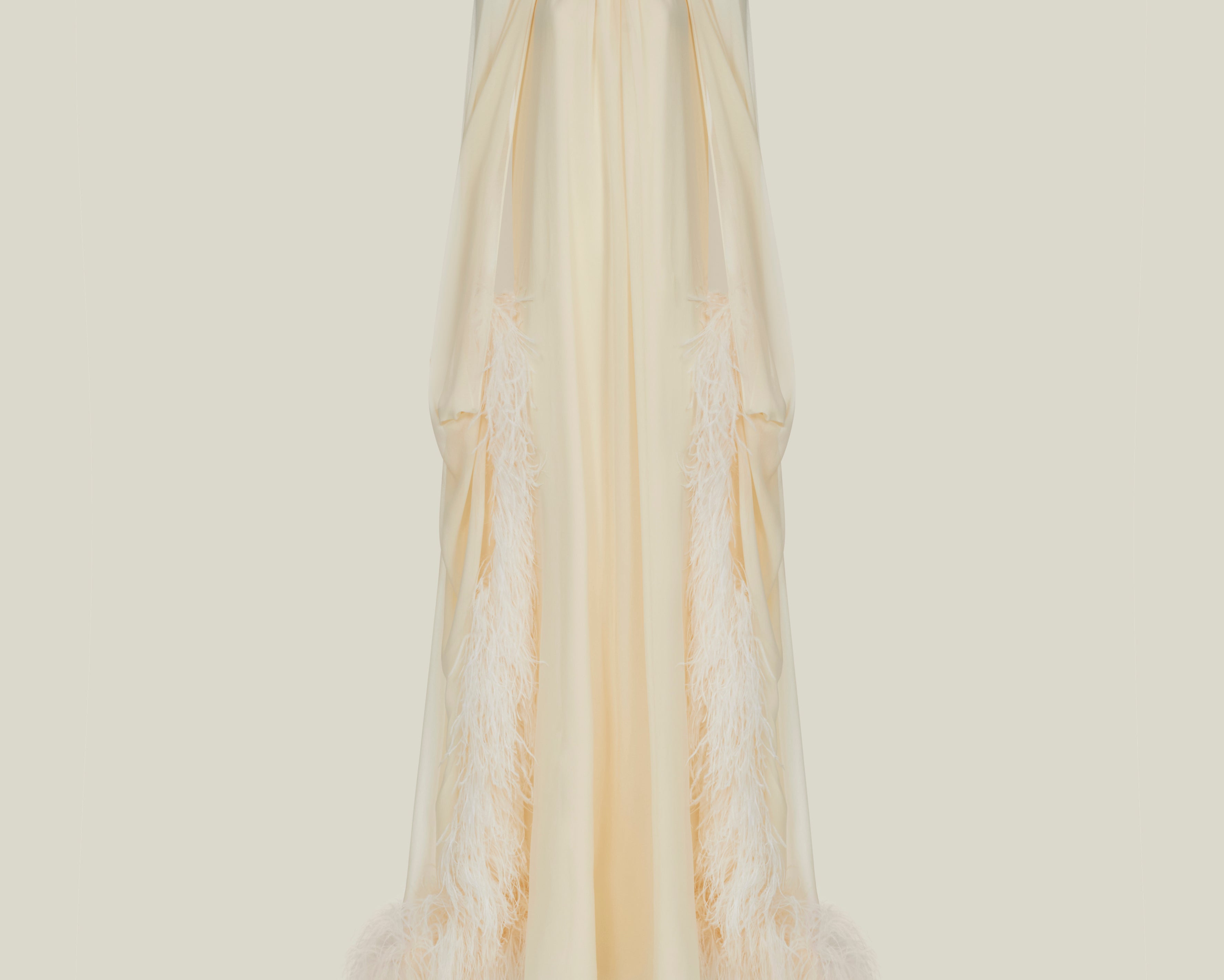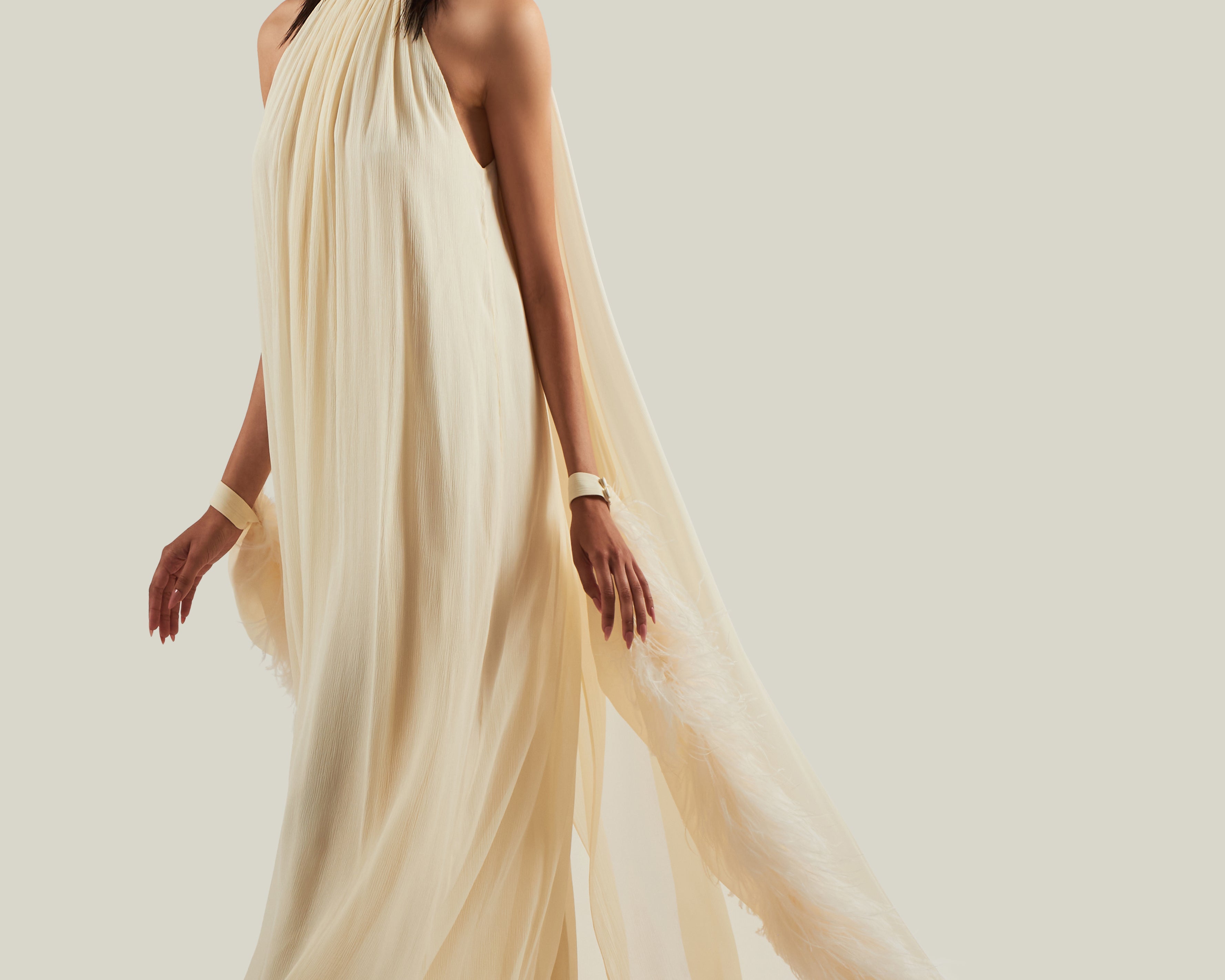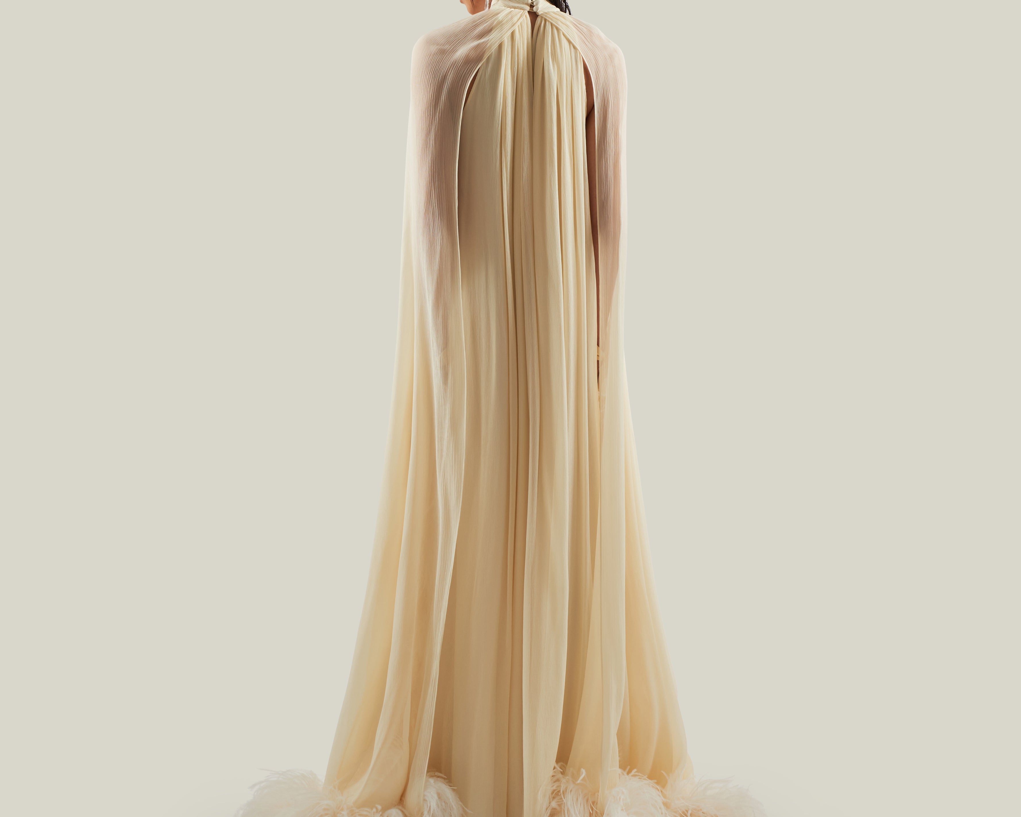 Combining airy construction with bold and sophisticated detailing, the Feathered Eterea is crafted from fluid crepe silk chiffon that gracefully drapes the body. This gown features a halter-neck bodice that accentuates the neckline and a dramatic cape-effect back. The cape are trimmed with tonal ostrich feathers, enhancing the garment’s texture and movement. The Feathered Eterea effortlessly balances lightness and opulence, making it a standout piece for any refined occasion.