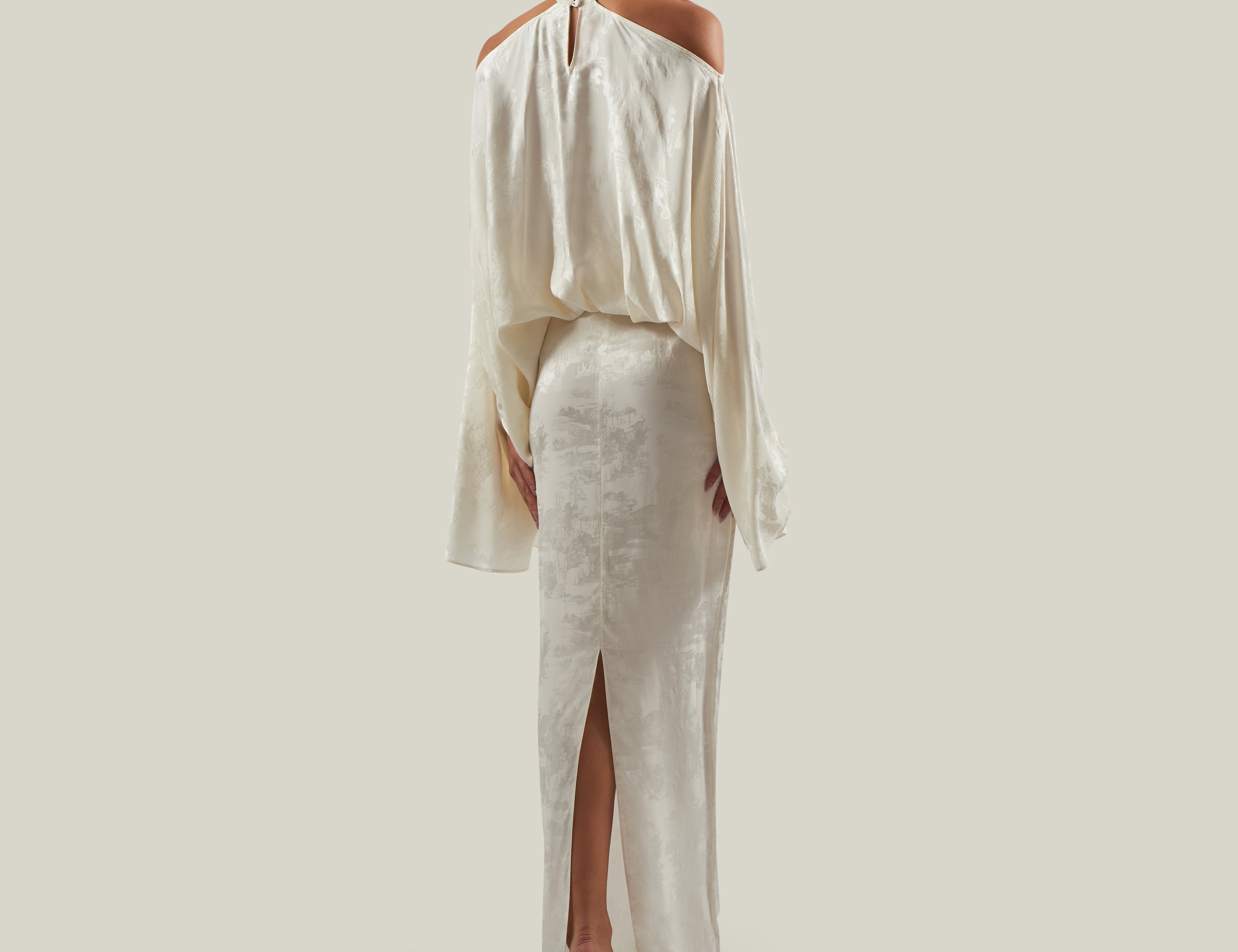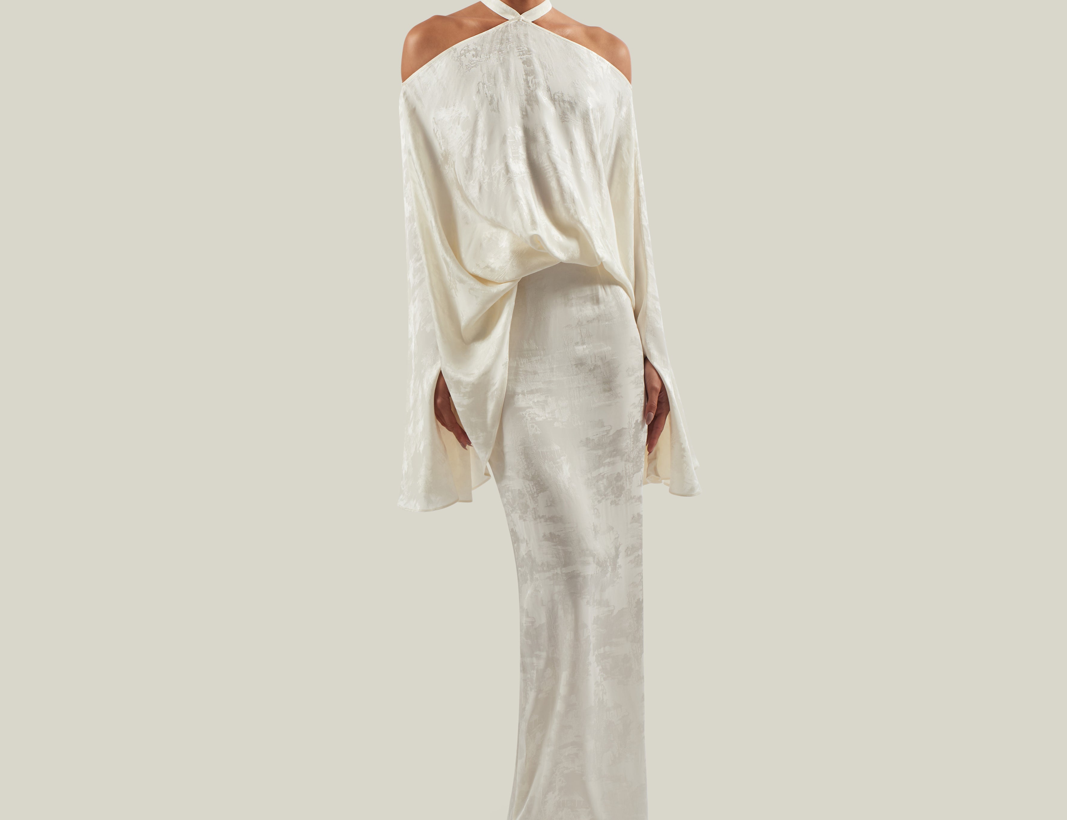 The floor-sweeping Grace cape is made from lightweight pure silk chiffon, and it is adorned with a soft boa of ostrich feathers along the hem, which floats beautifully behind you as you walk. Two self-fabric straps close the neckline gracefully.
