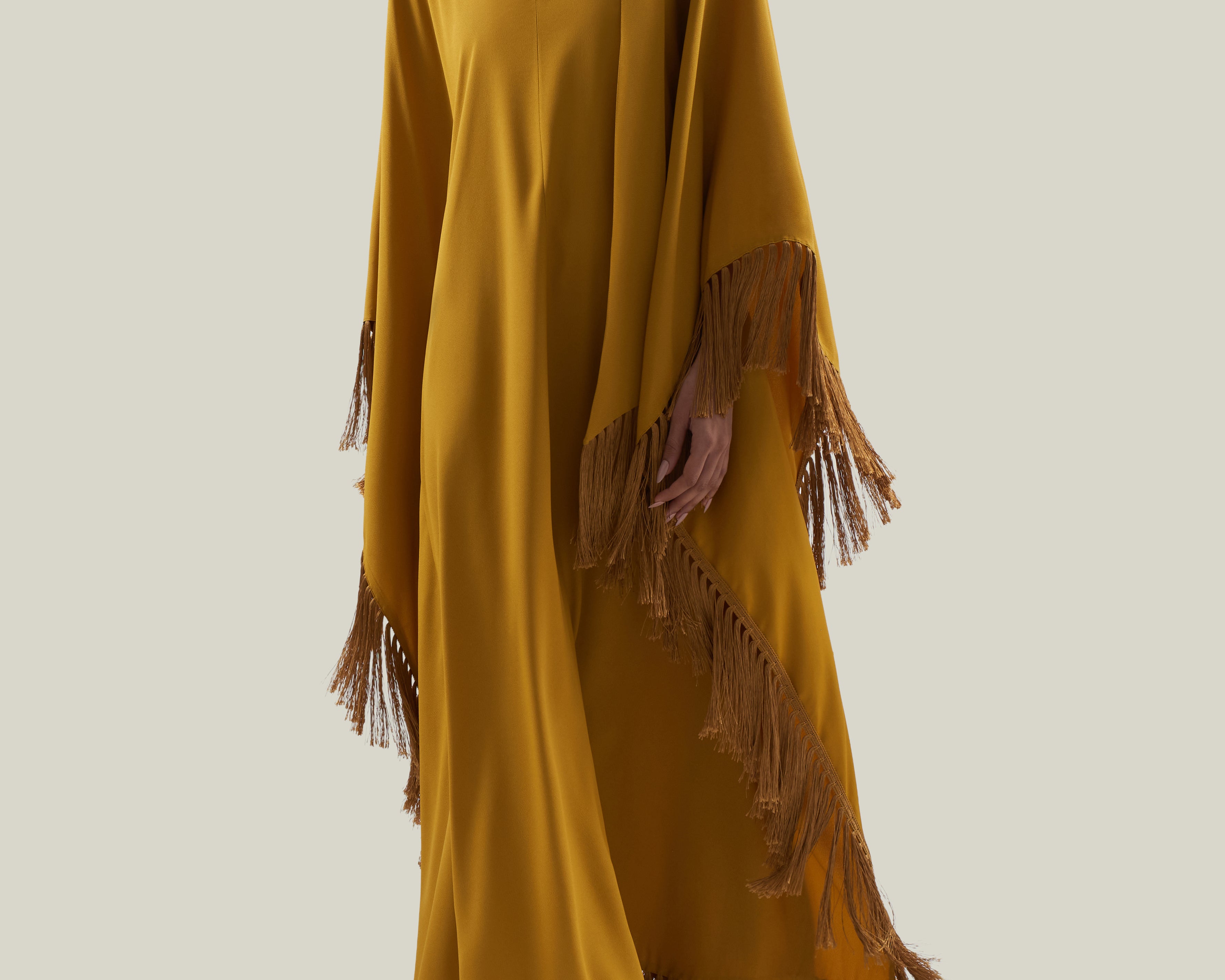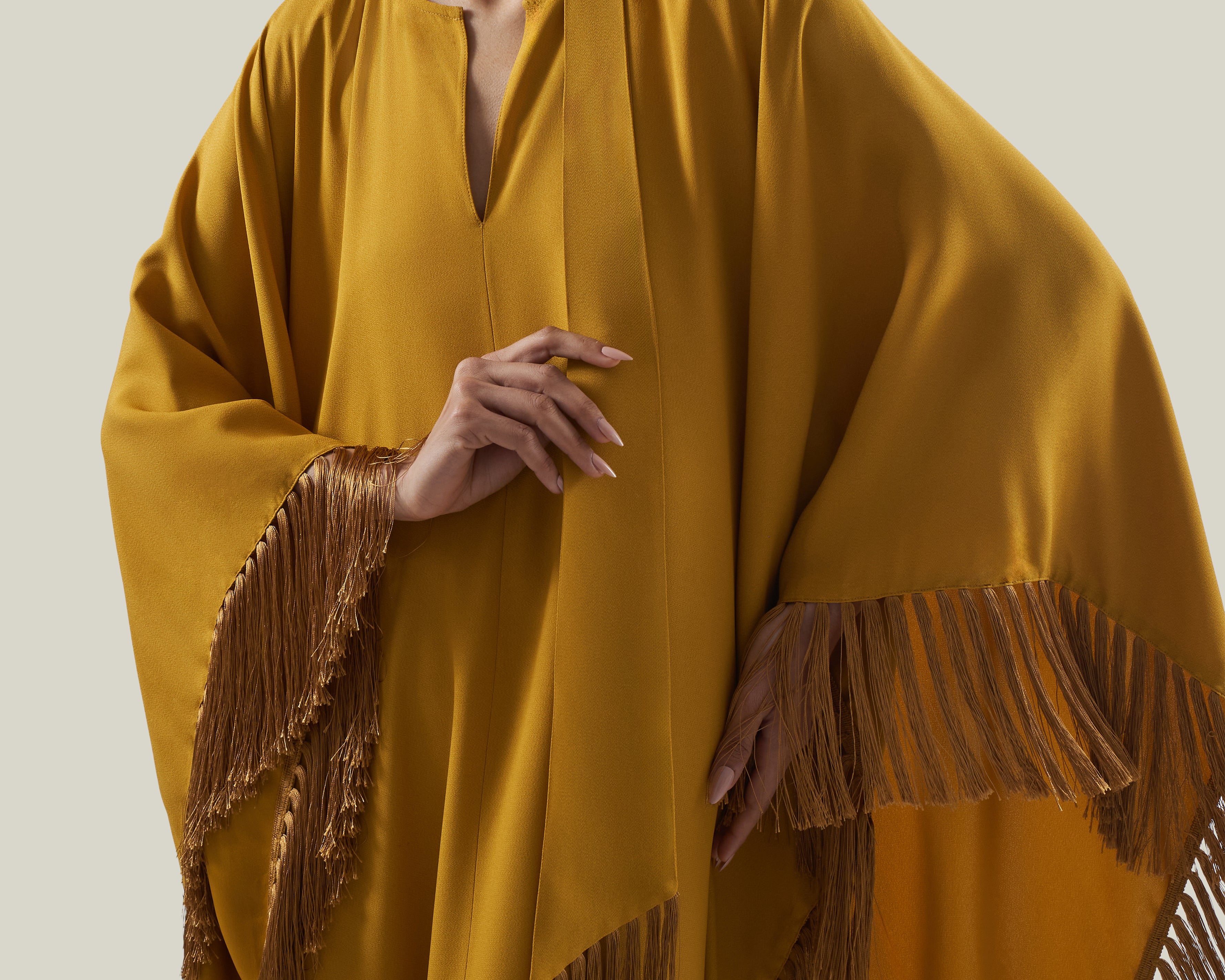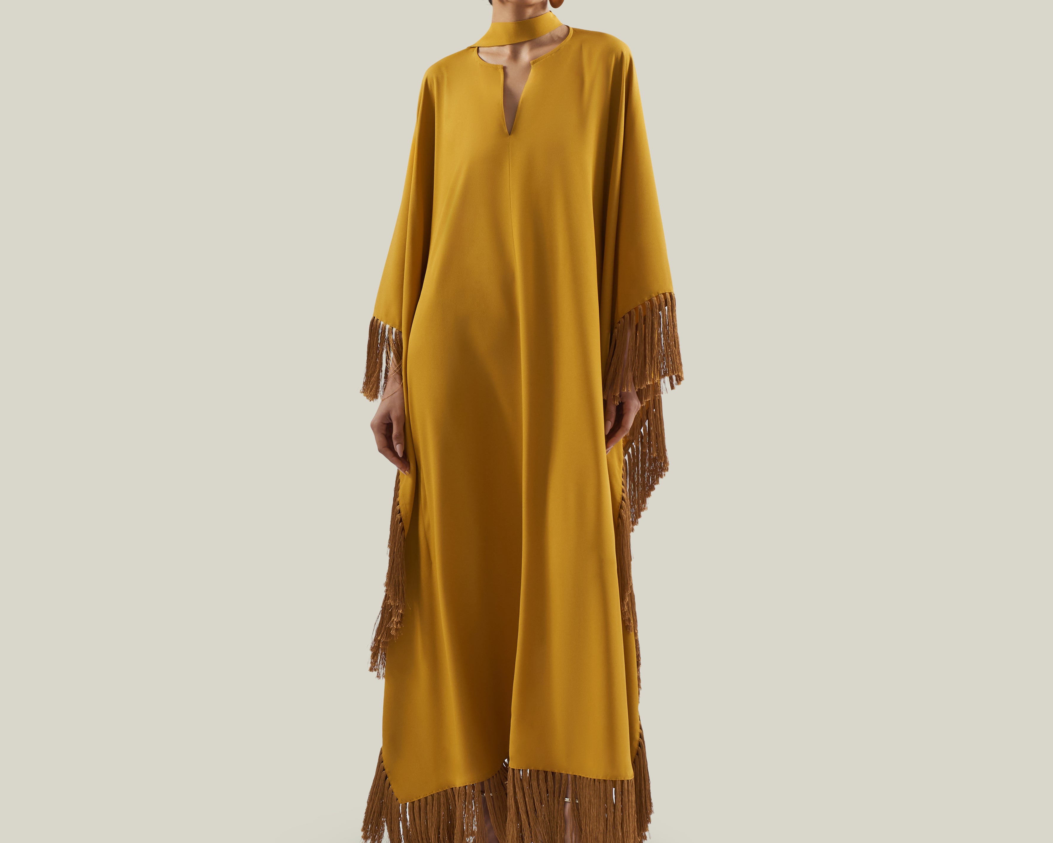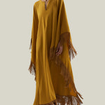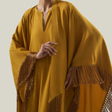 The Hammamet is a relaxed-fit, tunic-style kaftan crafted from sleek viscose-blend crepe cady. It features a softly rounded neckline with a subtle V-slit, offering a refined yet effortless charm. Fully trimmed with tonal soft fringes, it is finished with our signature attached fringed scarf that completes the neckline, adding movement and a laid-back attitude to the garment.