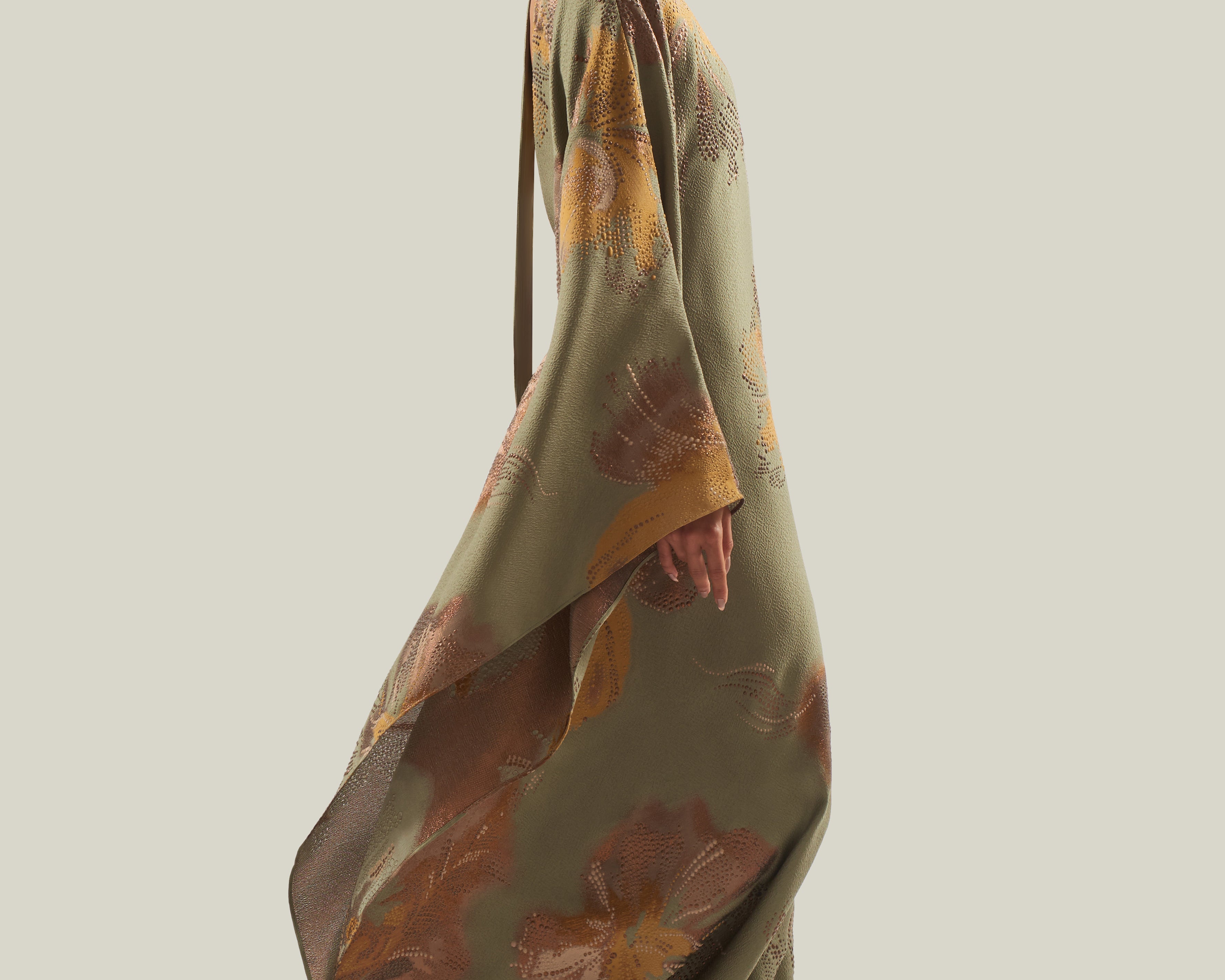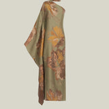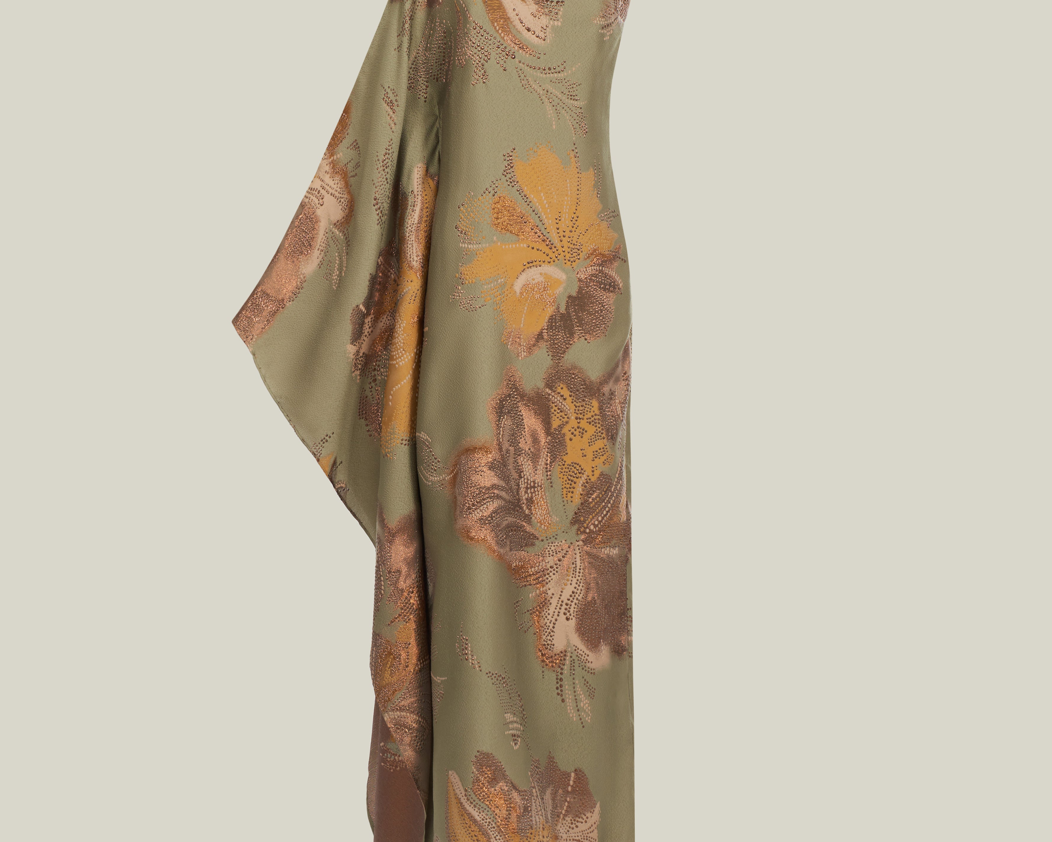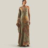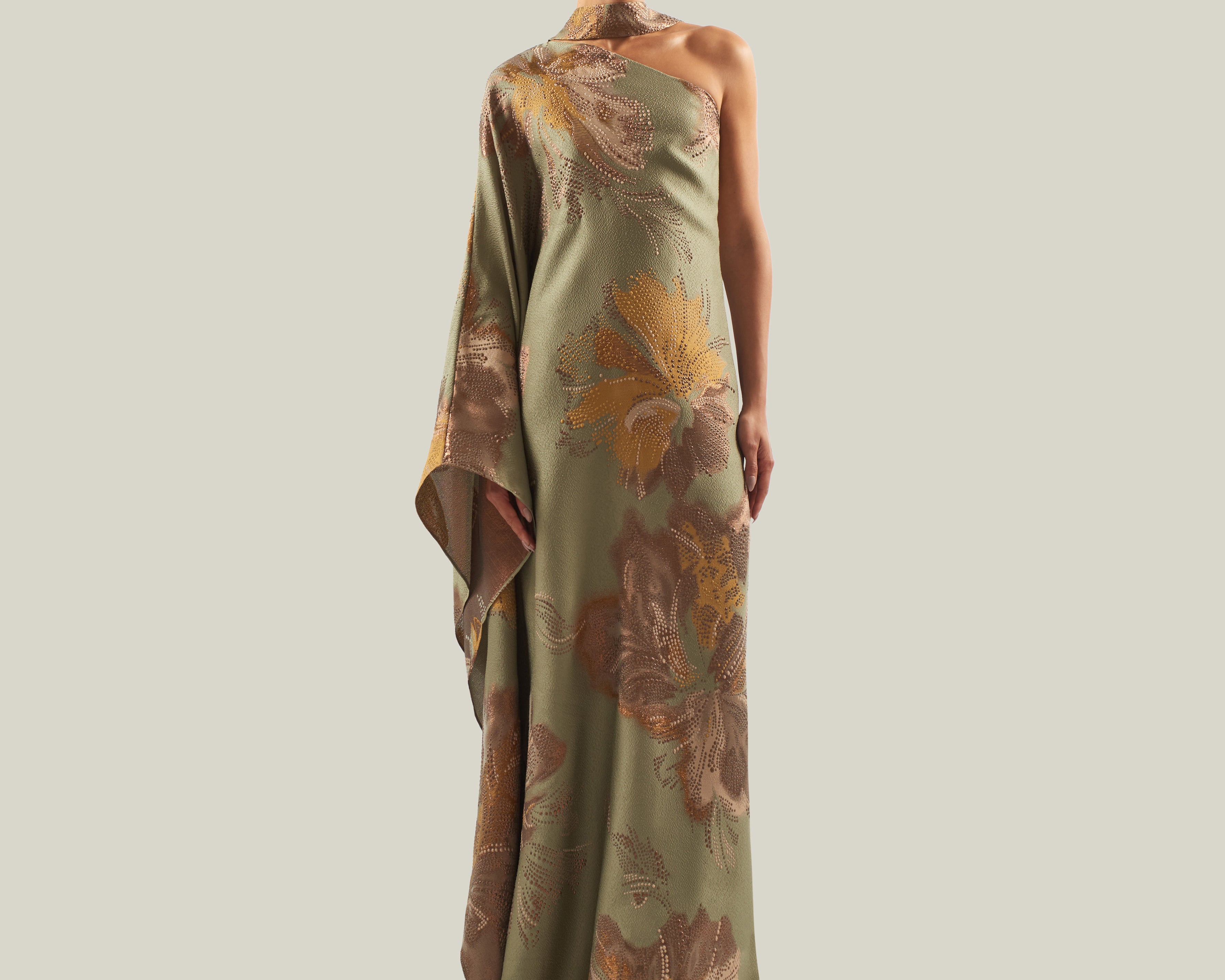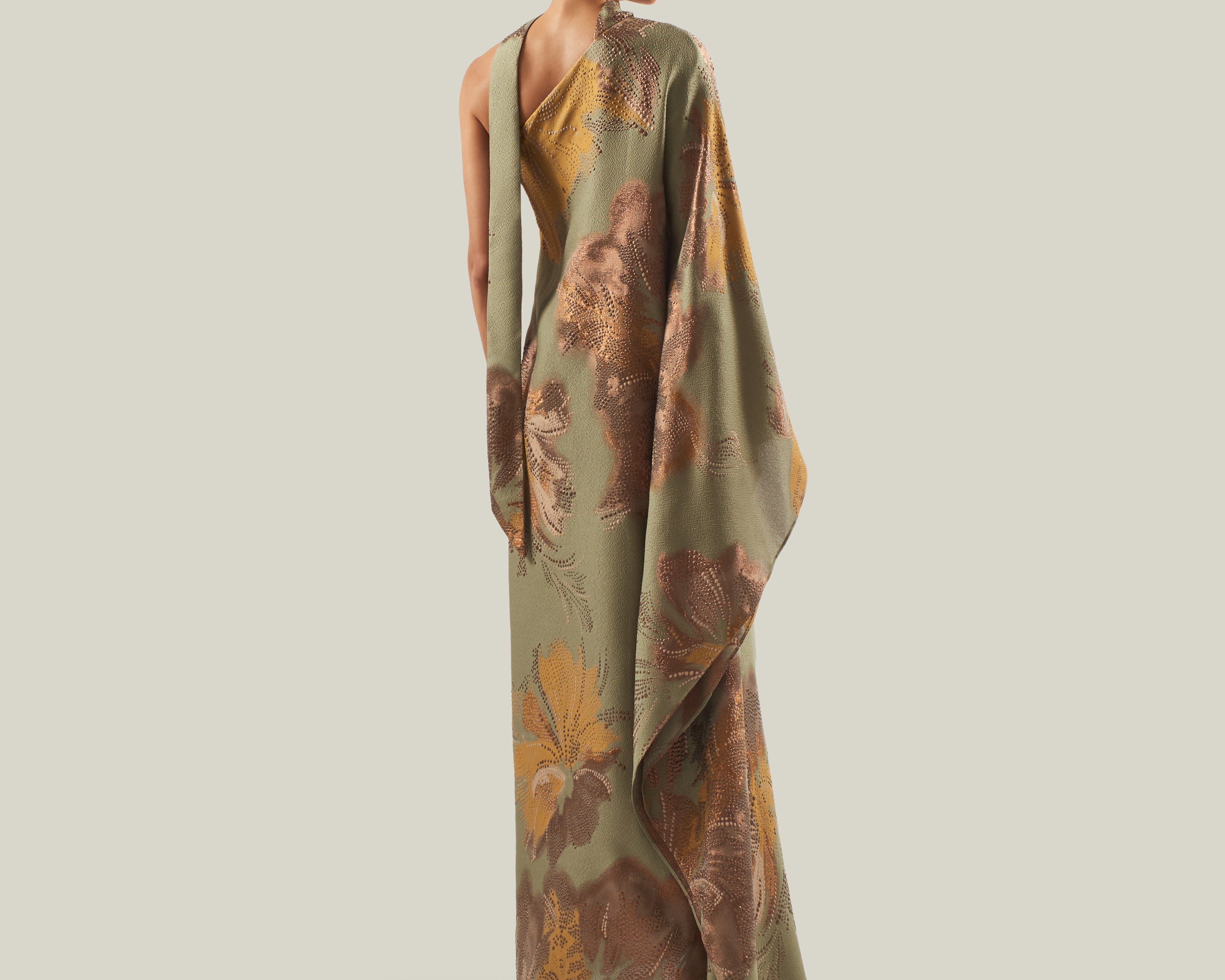 The Hardison Bloom is a one-shoulder column gown crafted from a luminous three-dimensional jacquard made in Como, Italy, which enhances the fluidity of its silhouette. The fabric reveals a refined floral motif, articulated through layered tonal nuances and subtle metallic highlights, adding depth and texture. Completed with a matching scarf, the piece exudes poised elegance, highlighting its sculptural lines with a refined sense of ease.