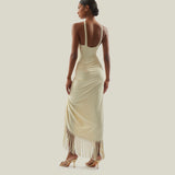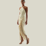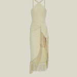 Halter neck swimsuit with dettached hand-tied fringed long pareo