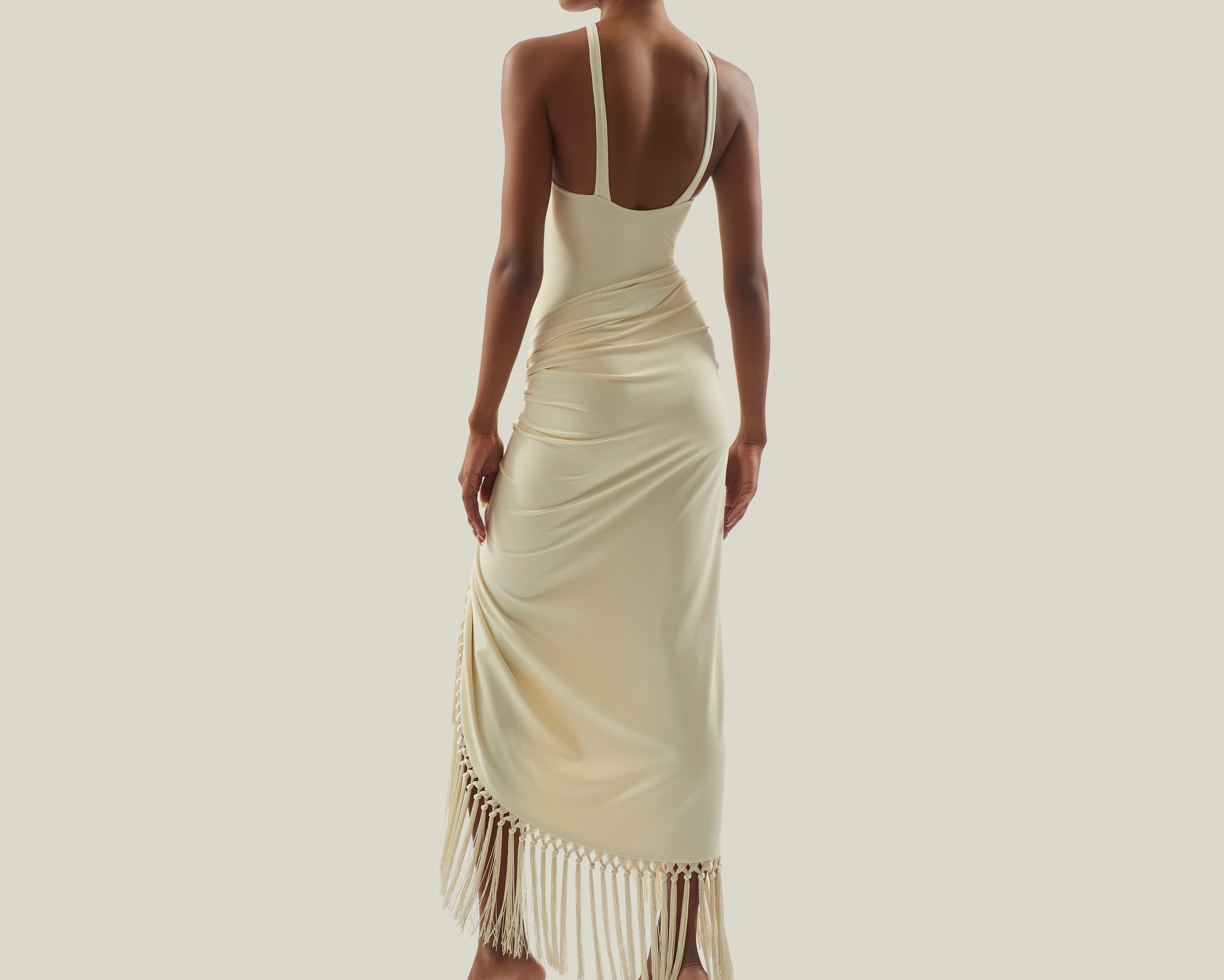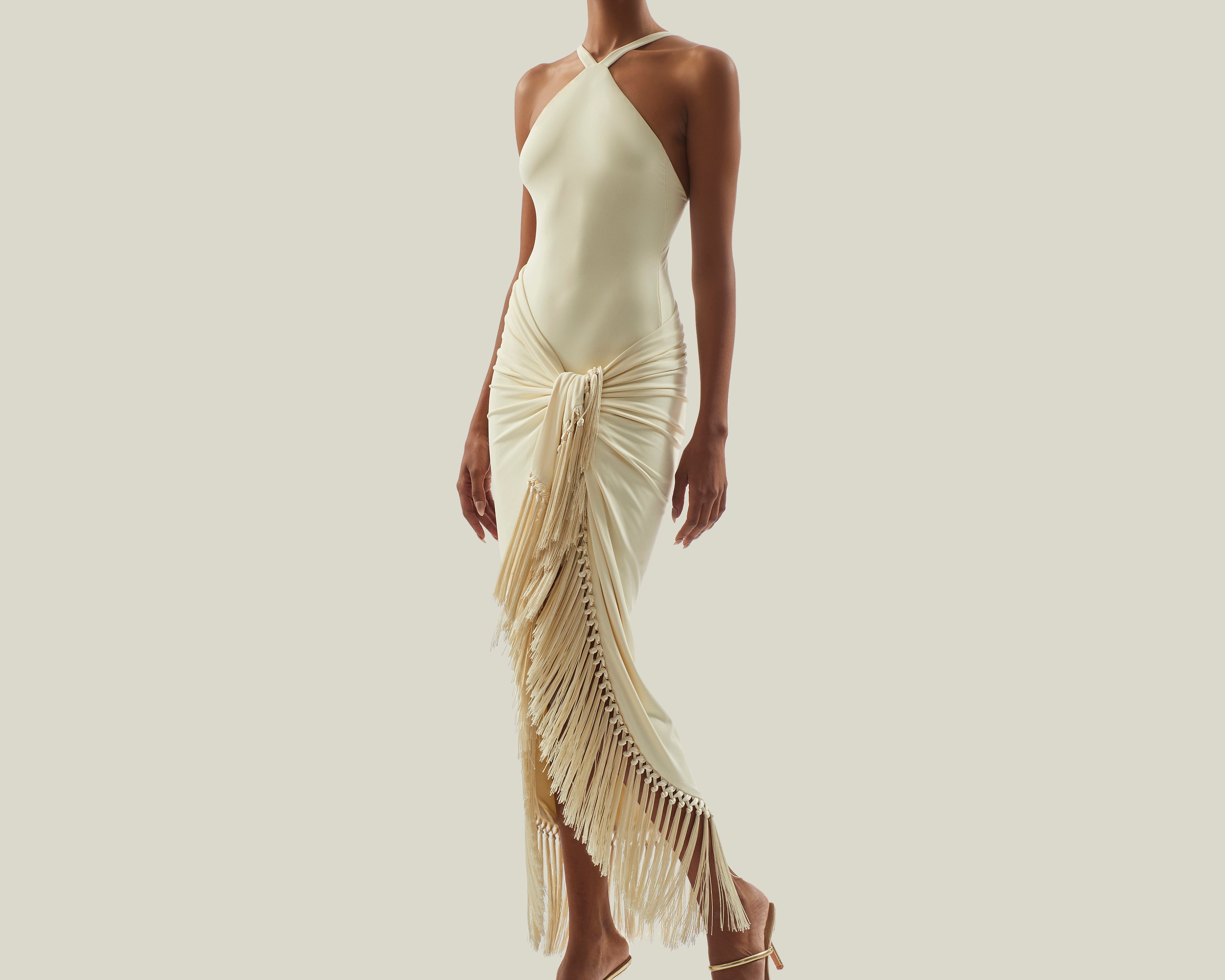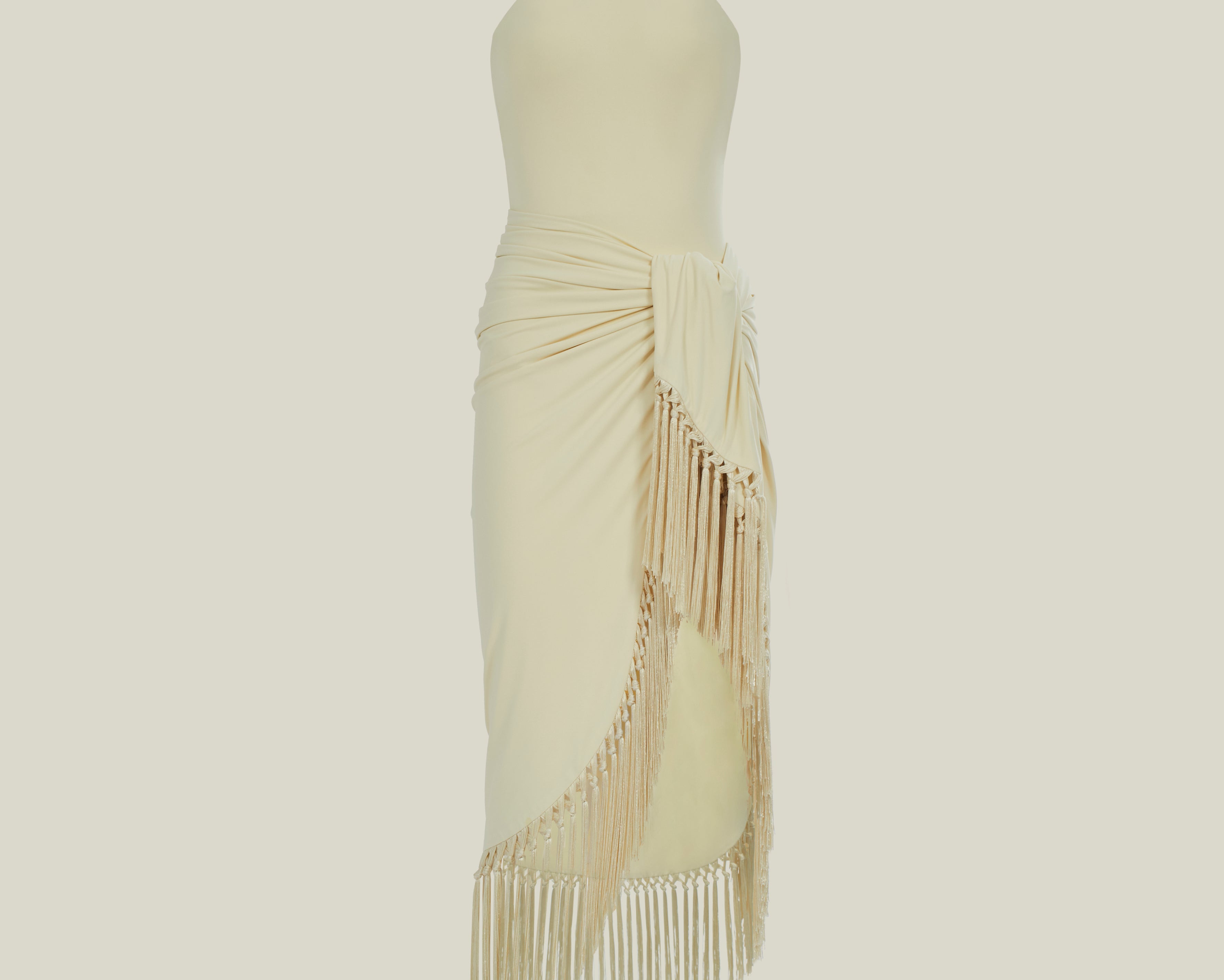 The Hera Artisanal is a jersey halter-neck one-piece swimsuit, paired with a detachable long pareo for versatile styling. The pareo, in a matching color, is adorned with tonal hand-tied fringes, adding movement and texture, while infusing a touch of playful elegance into your beachside look.