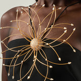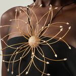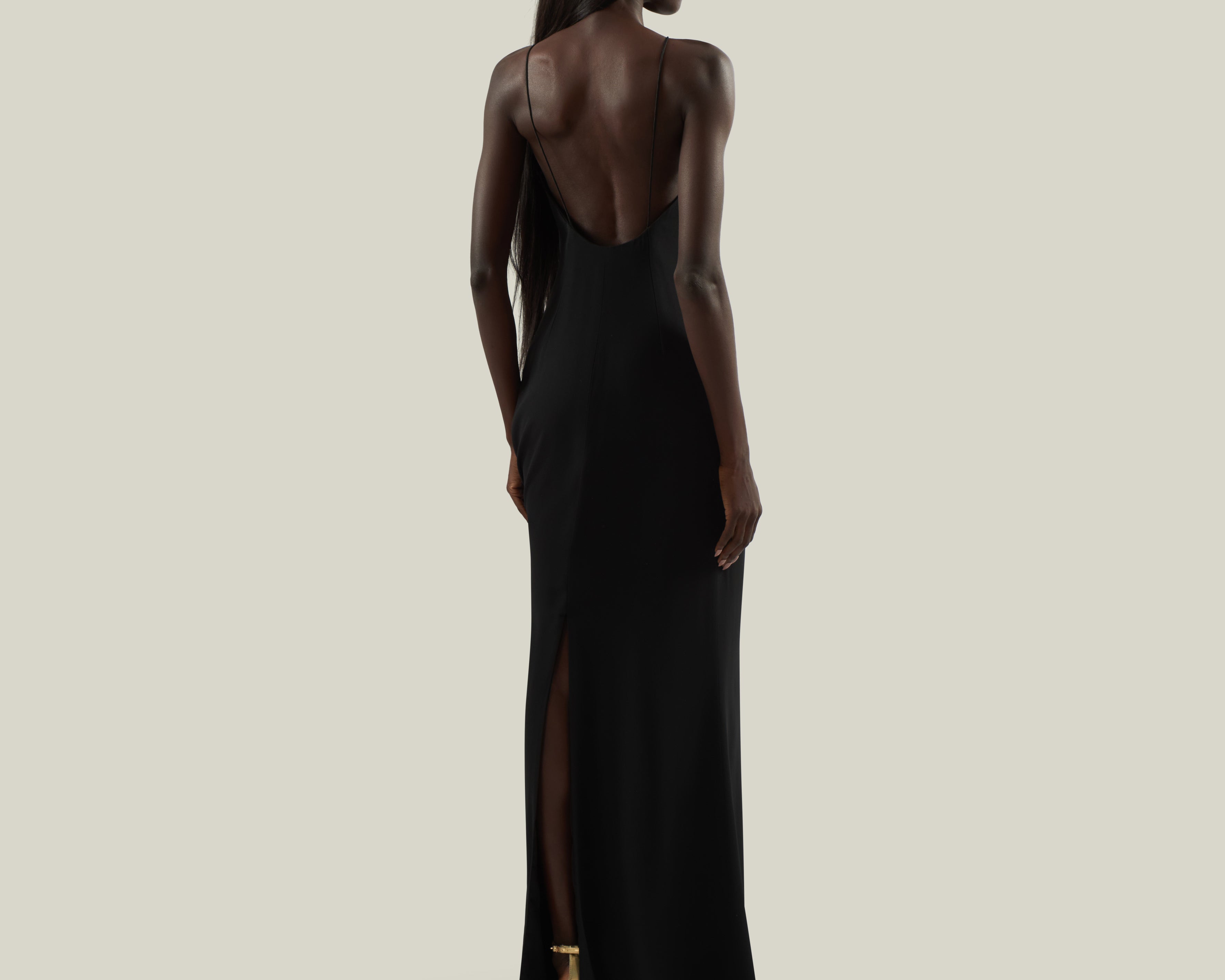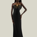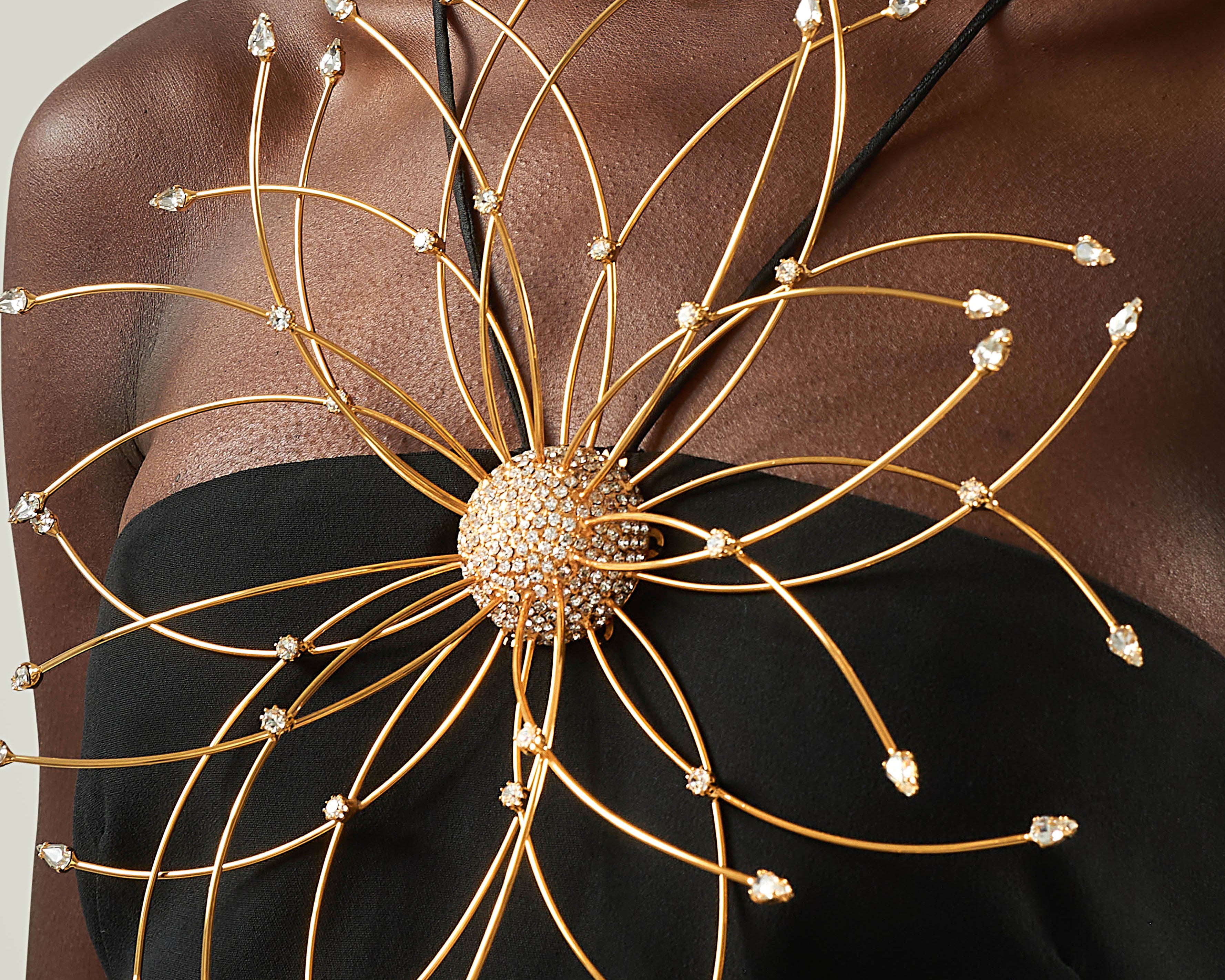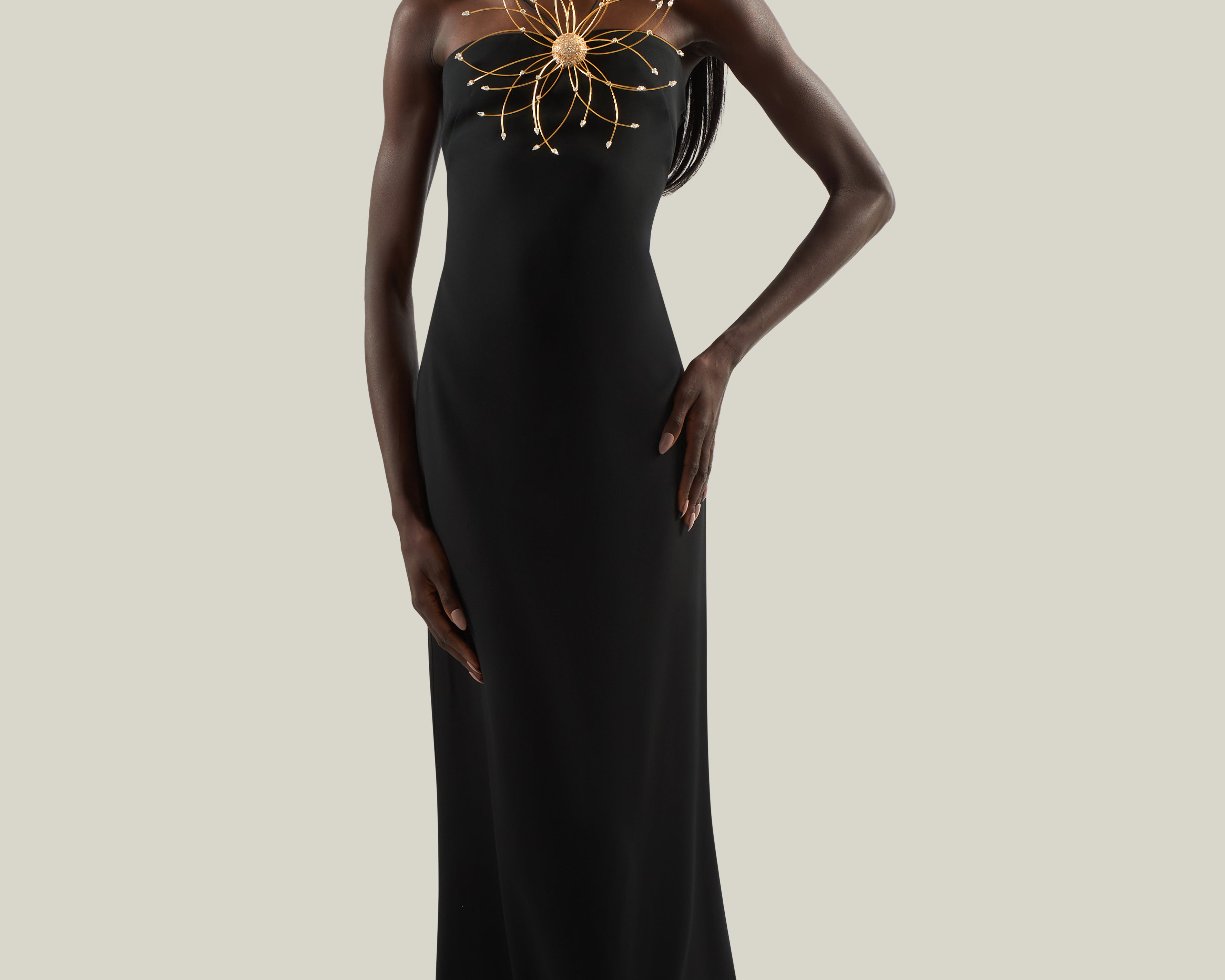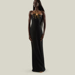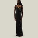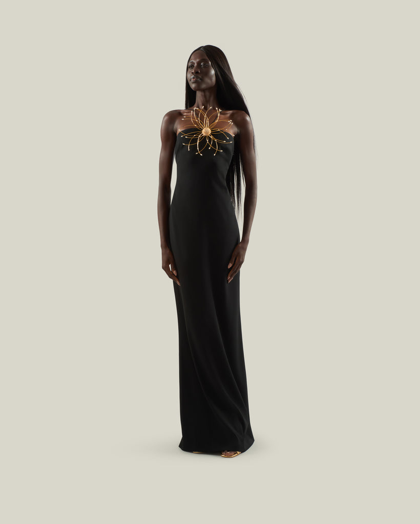 A refined balance in contrast between purity of line and decorative impact. Crafted from soft viscose-blend crepe cady, this slip dress features a fluid, floor-length silhouette with fine straps, a deep back neckline, and a center-back slit for ease of movement. The design is elevated by a striking maxi flower bijoux: radiating from a central rounded button, concentric golden rays form a sculptural floral motif, enriched with crystals that catch the light. Entirely crafted in Italy, the jewel introduces a bold note of artistry, transforming a minimalist dress into a statement piece designed for unforgettable entrances.