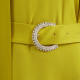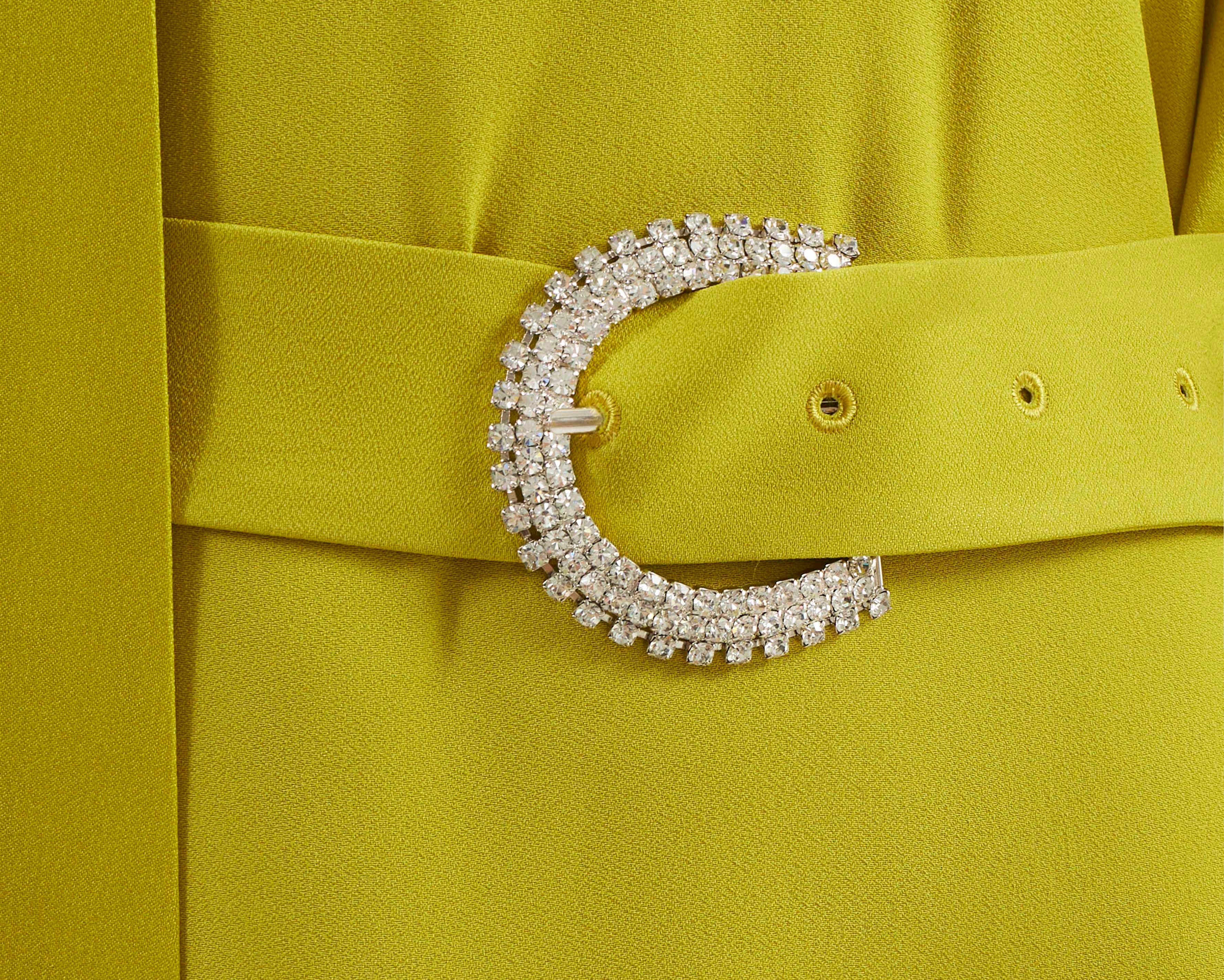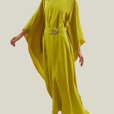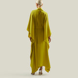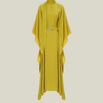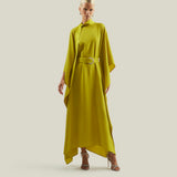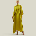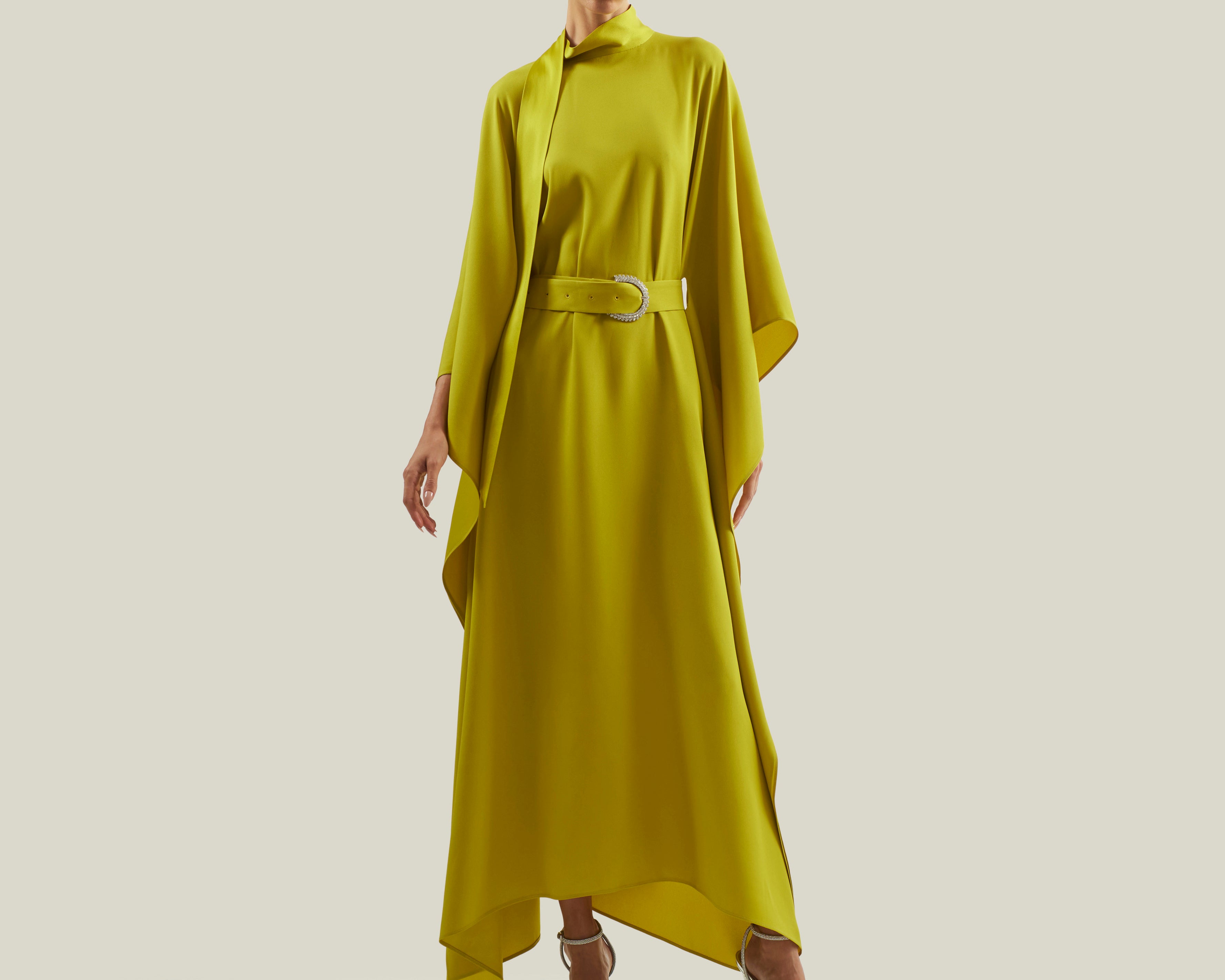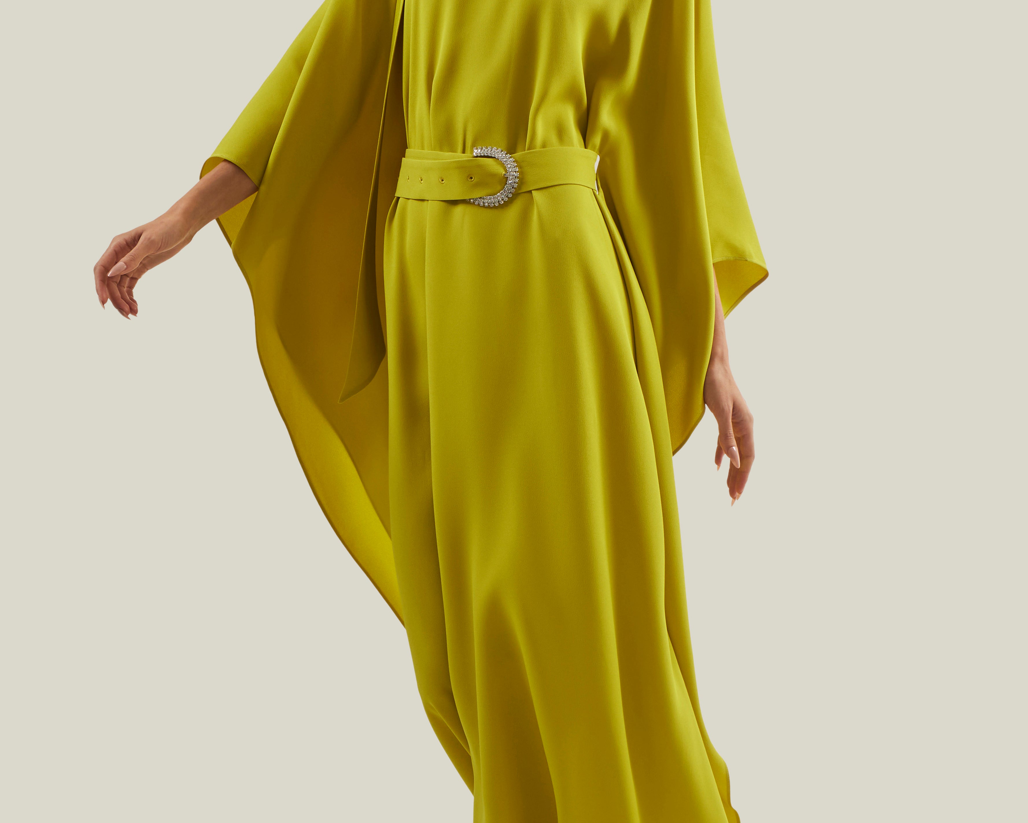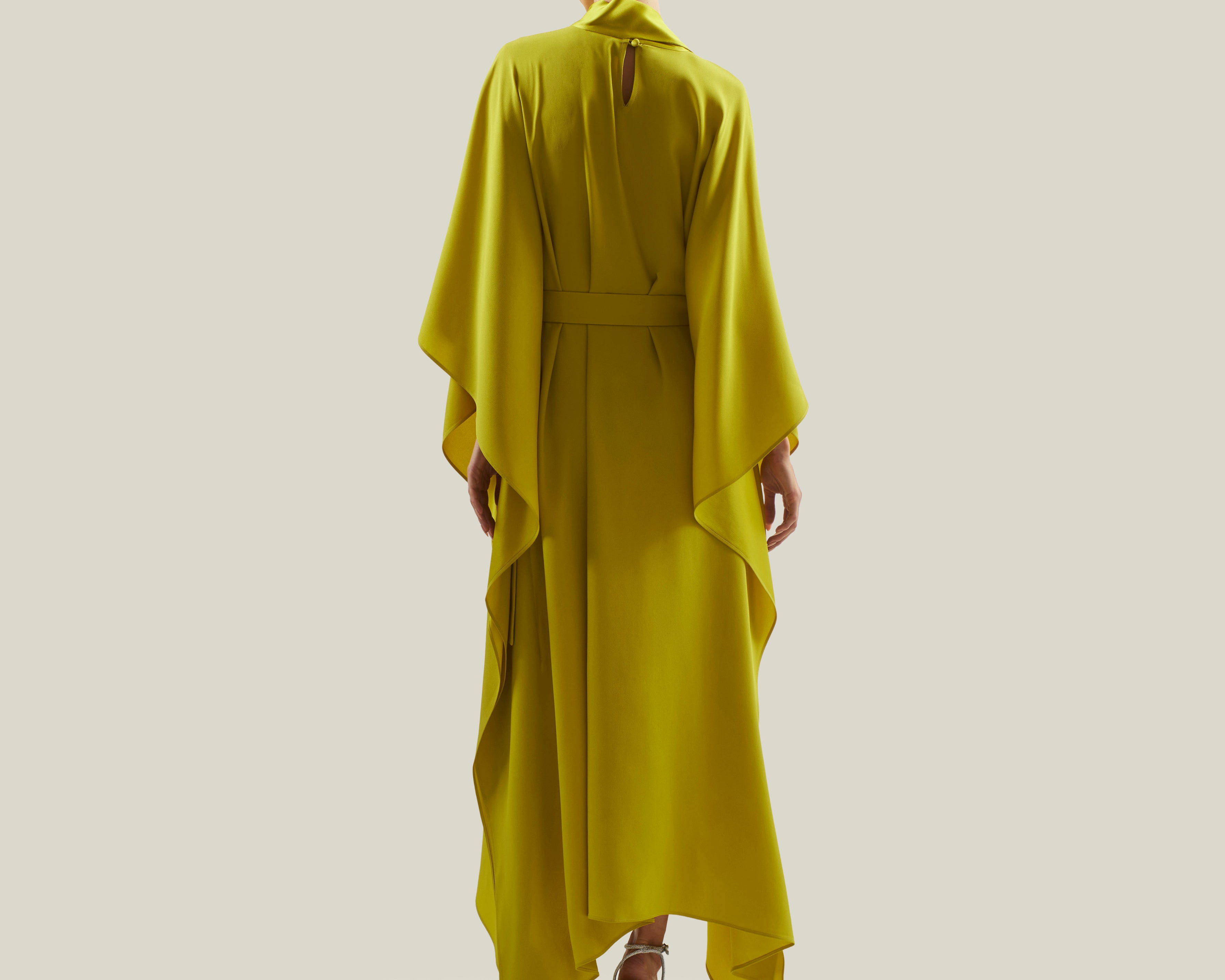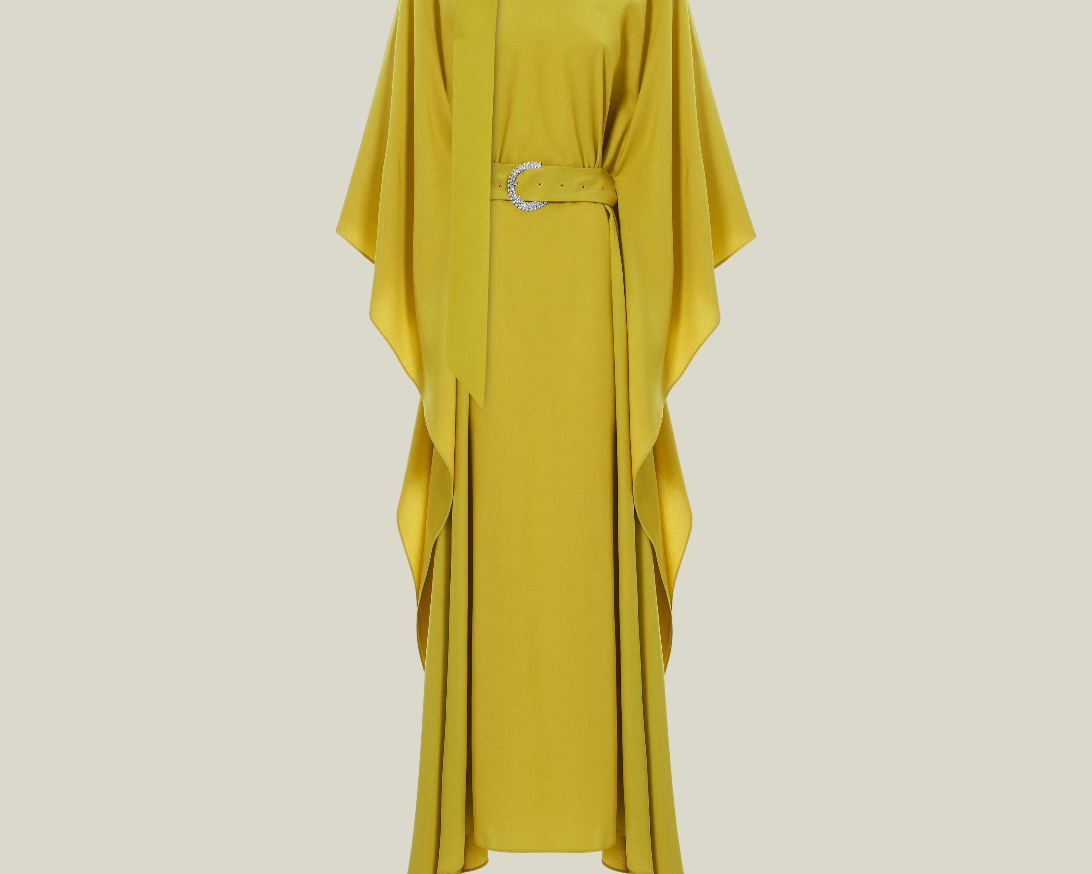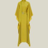 La Luna Kaftan is a high scarf neck kaftan cut from soft viscose-blend crepe cady, featuring a fluid silhouette. A self-fabric belt with a jewel pavé buckle, meticulously made in Italy, cinches the waist to enhance the figure.