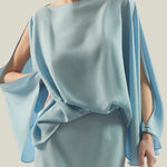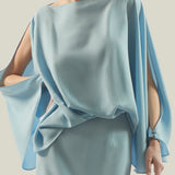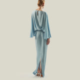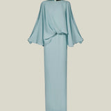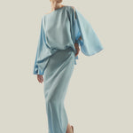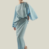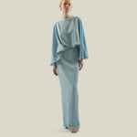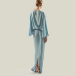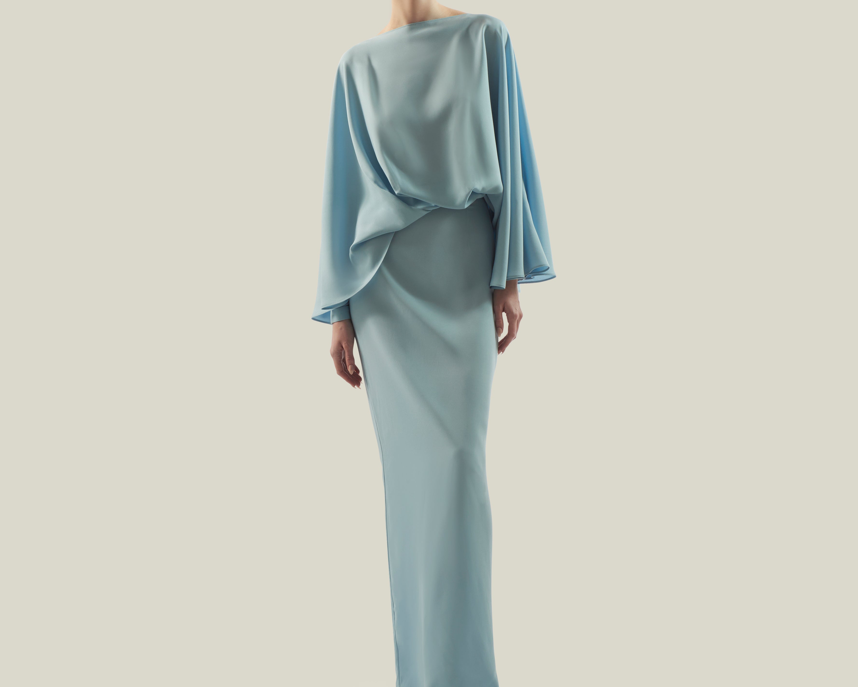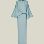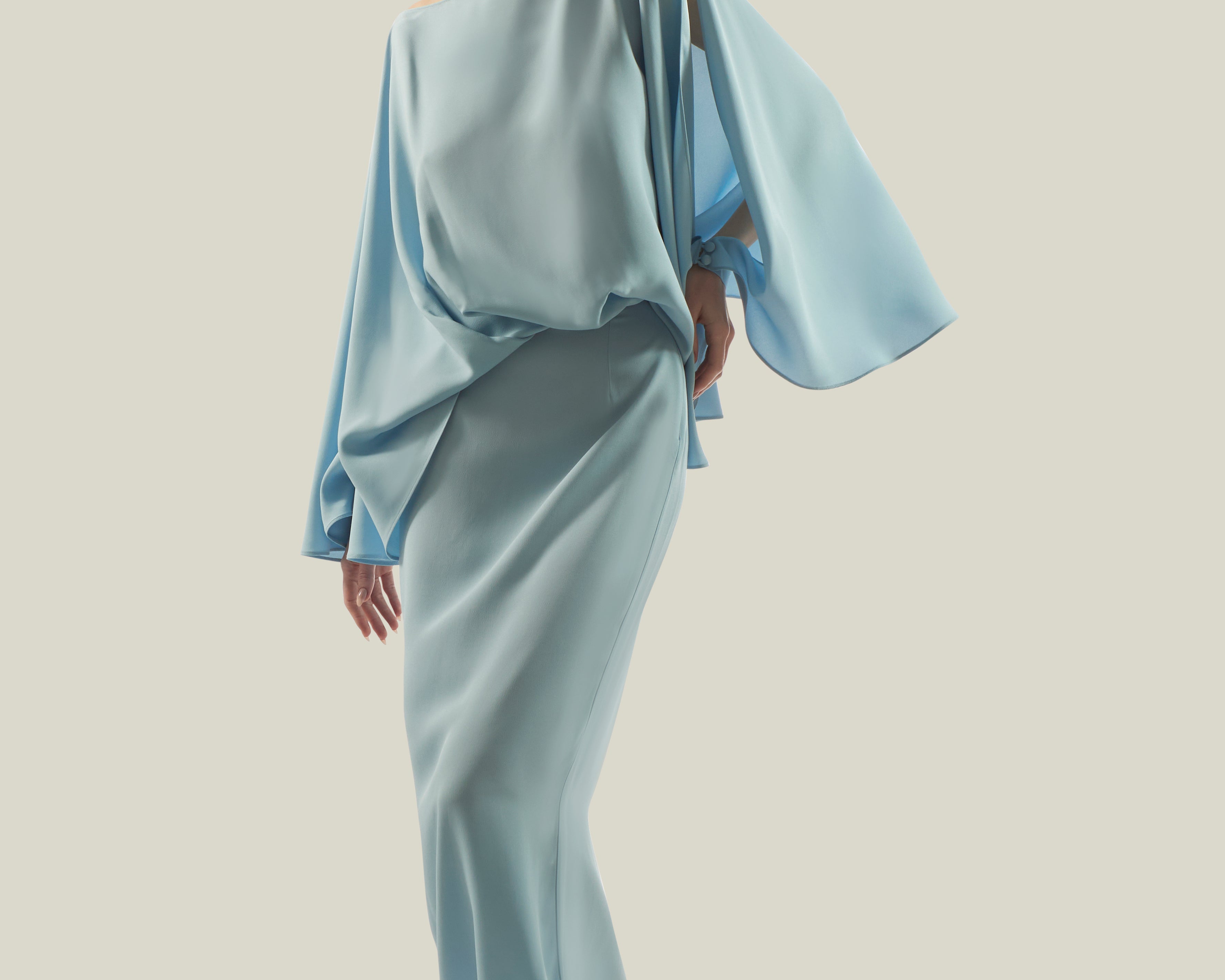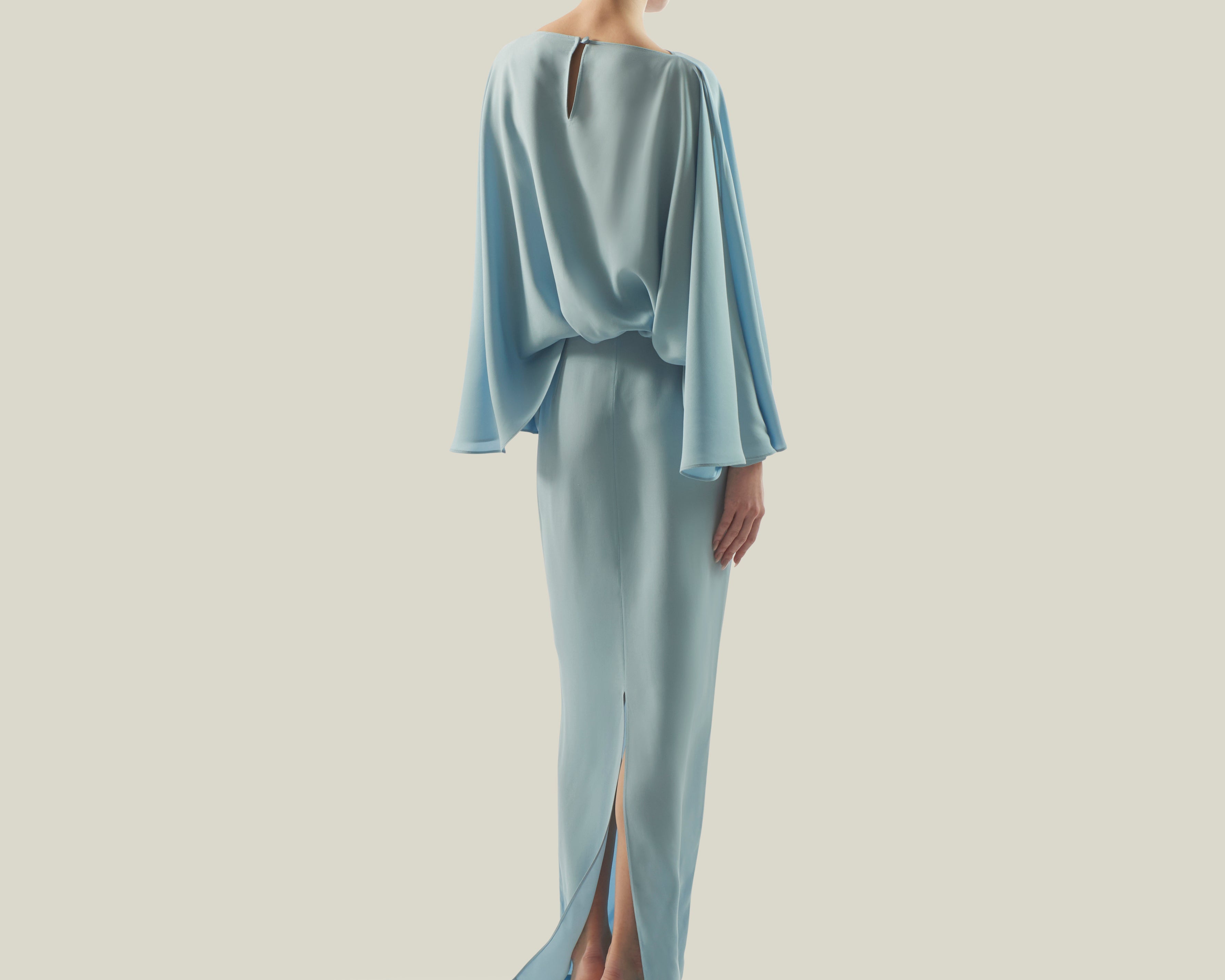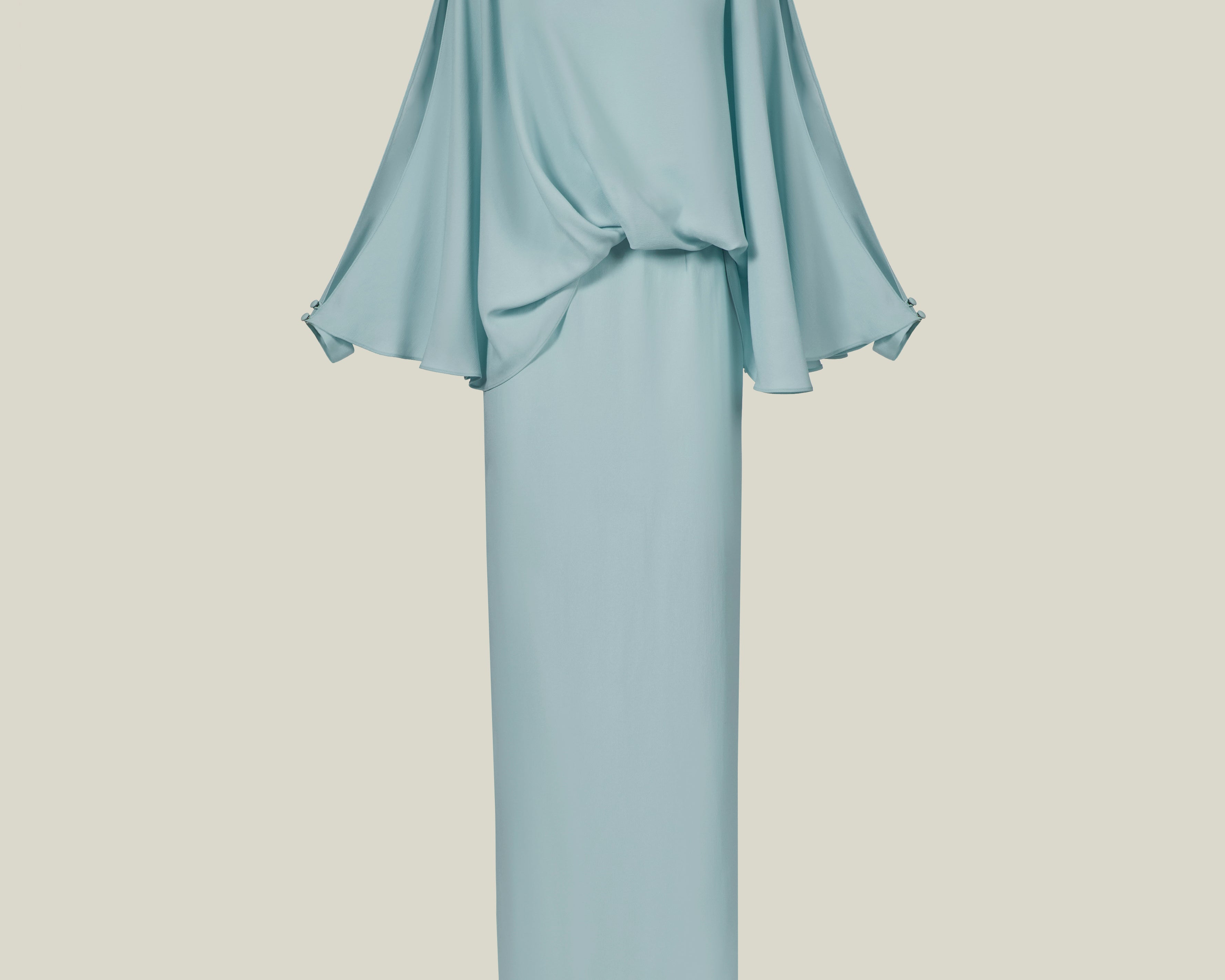 The La Maddalena Dress is crafted from fluid viscose-blend crepe cady. The design pairs a draped, oversized blouson with a sleek floor-length column skirt, creating a striking contrast of volume and structure. The open sleeves, finished with delicate cuffs at the wrists, add a touch of movement and sophistication, making this dress a perfect balance of grace and modernity.