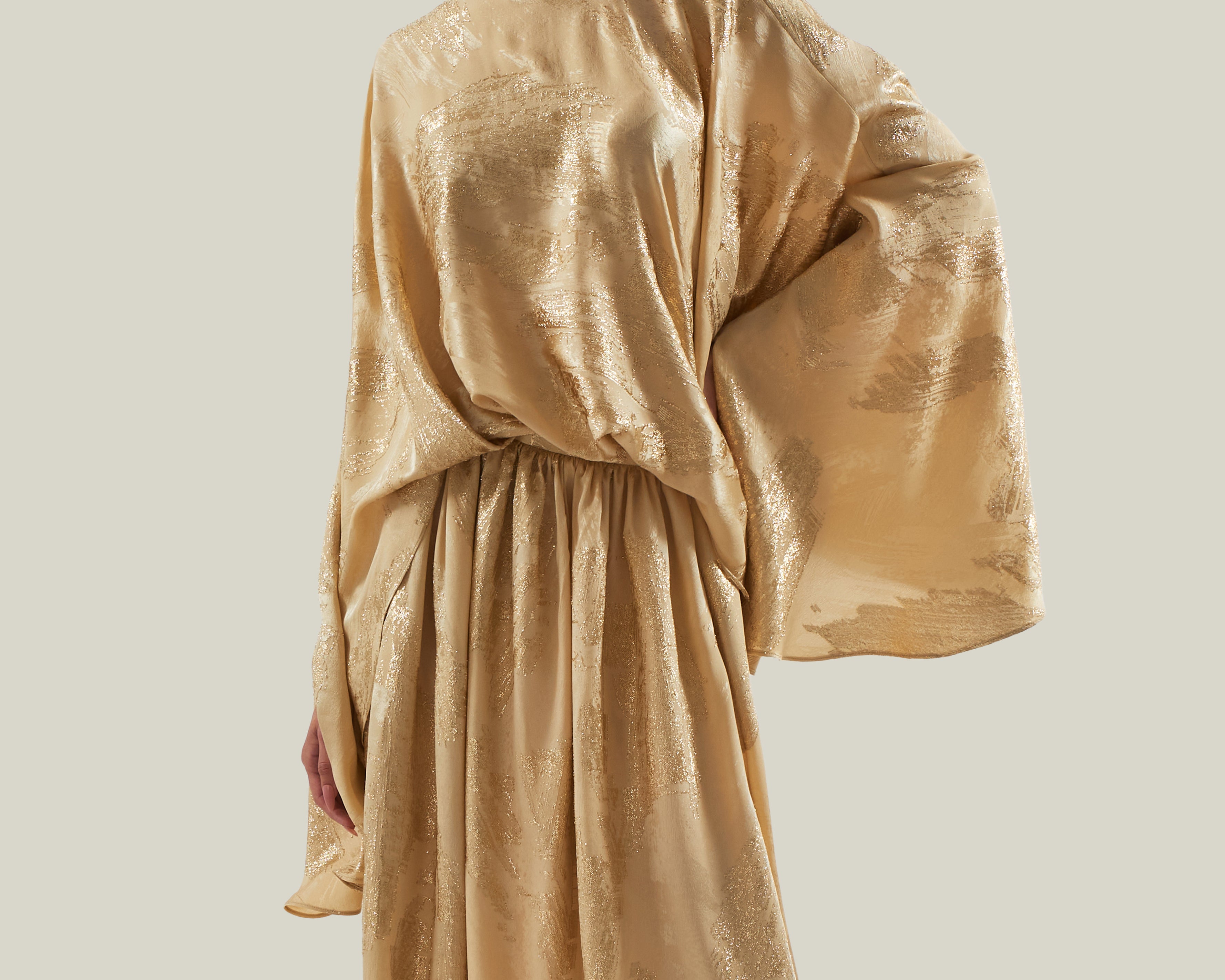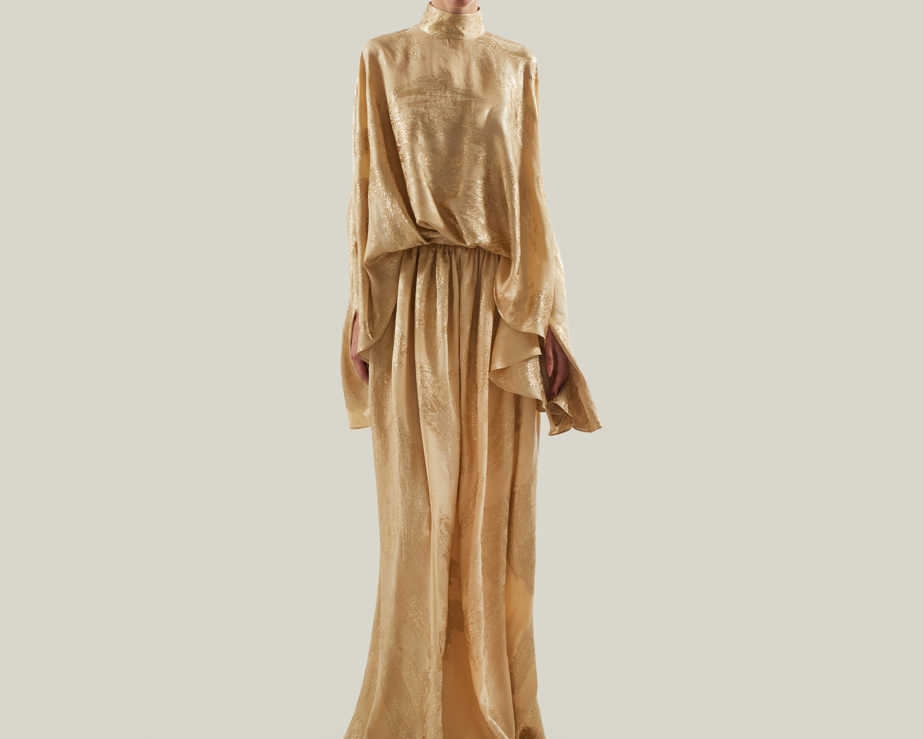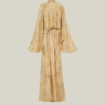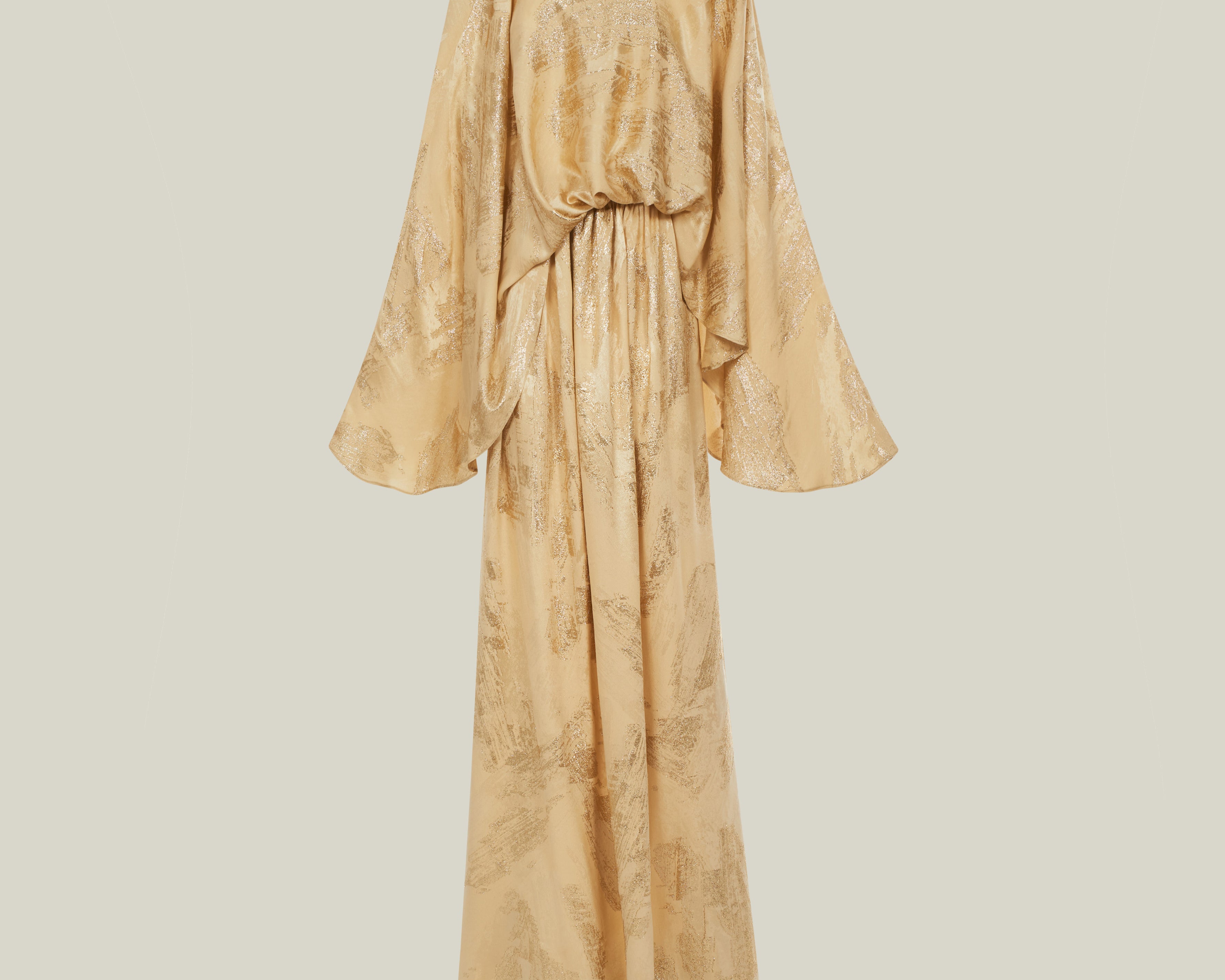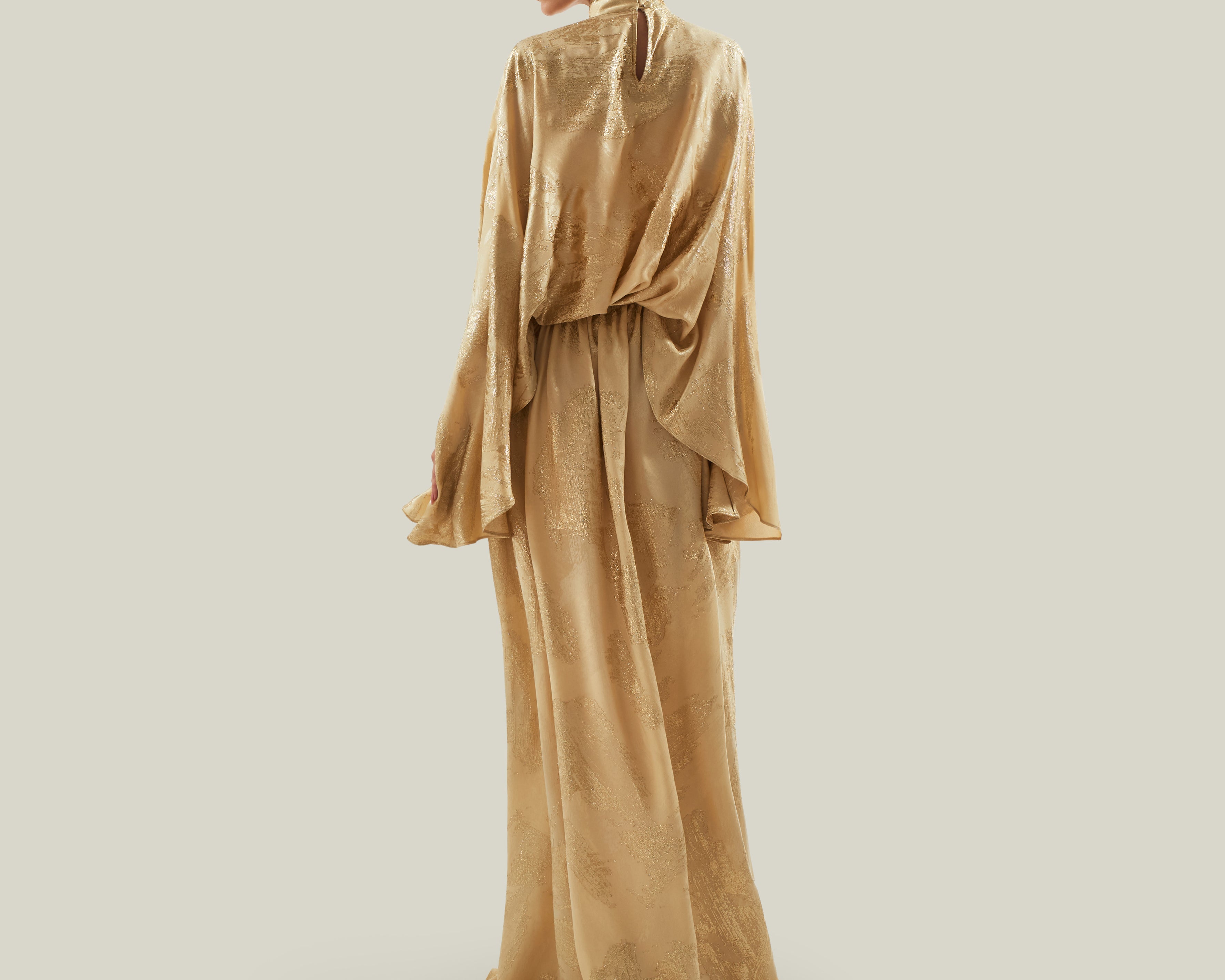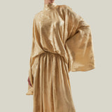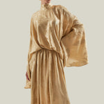 Textured luminosity defines the Lamarr, featuring a relaxed blouson bodice, oversized sleeves, and a flowing maxi skirt that moves gracefully with each step. The fabric showcases a delicate woven motif that catches the light with every movement, creating a subtle interplay of texture and shine.
