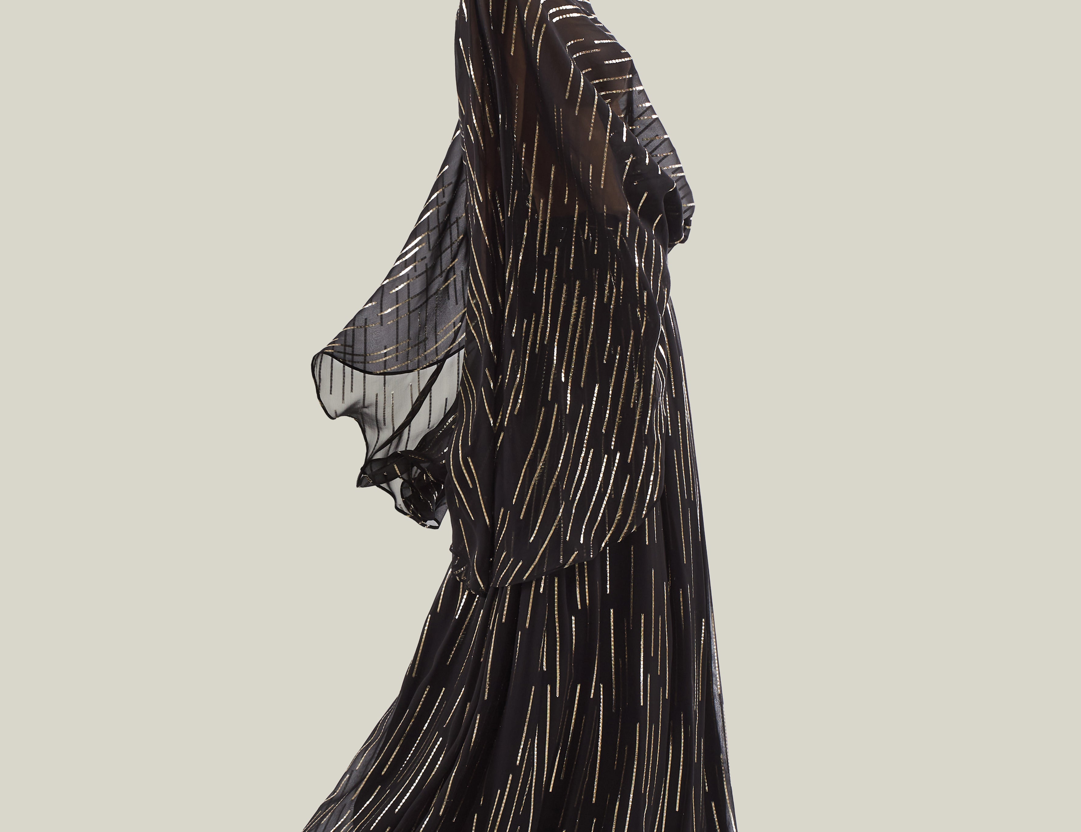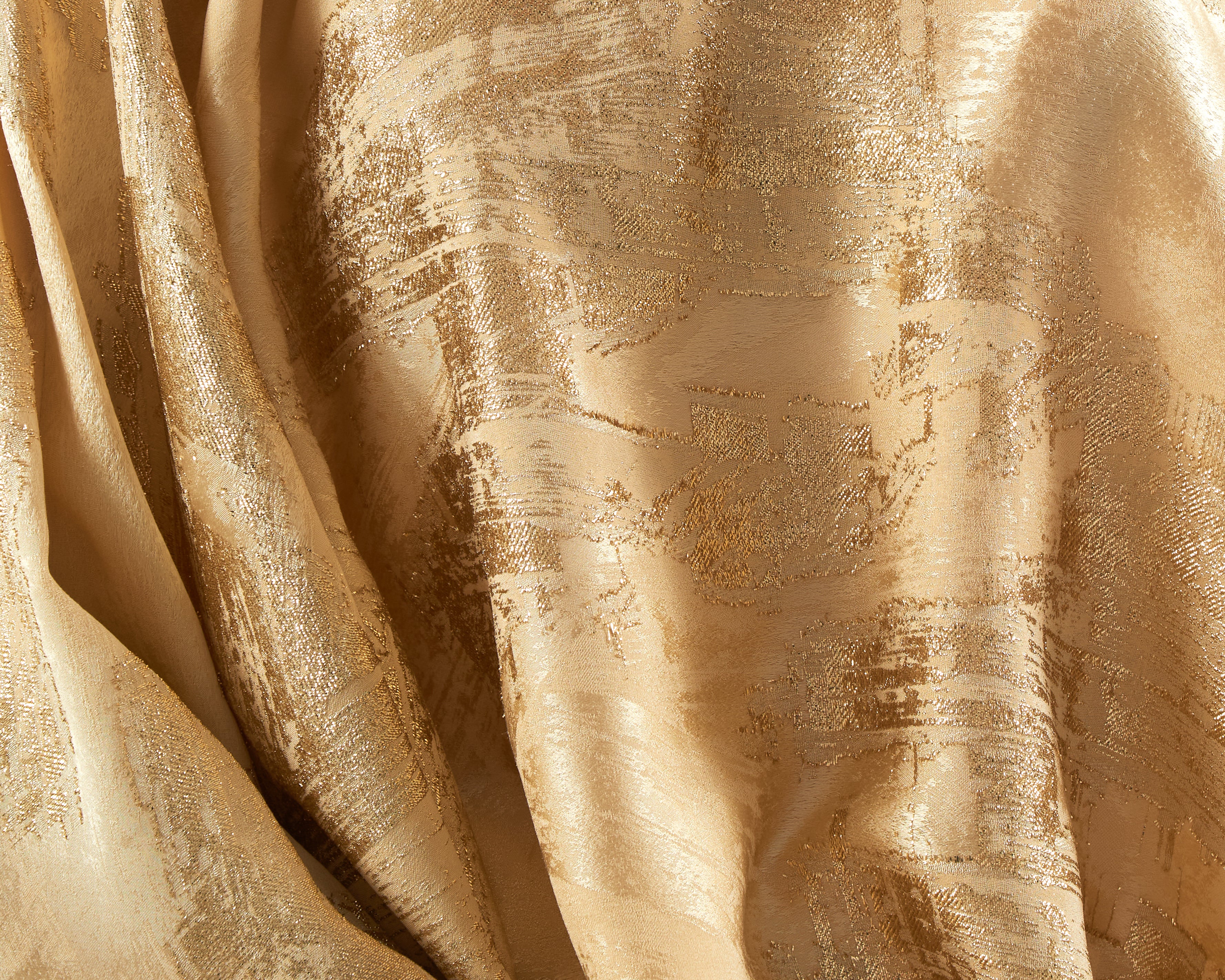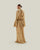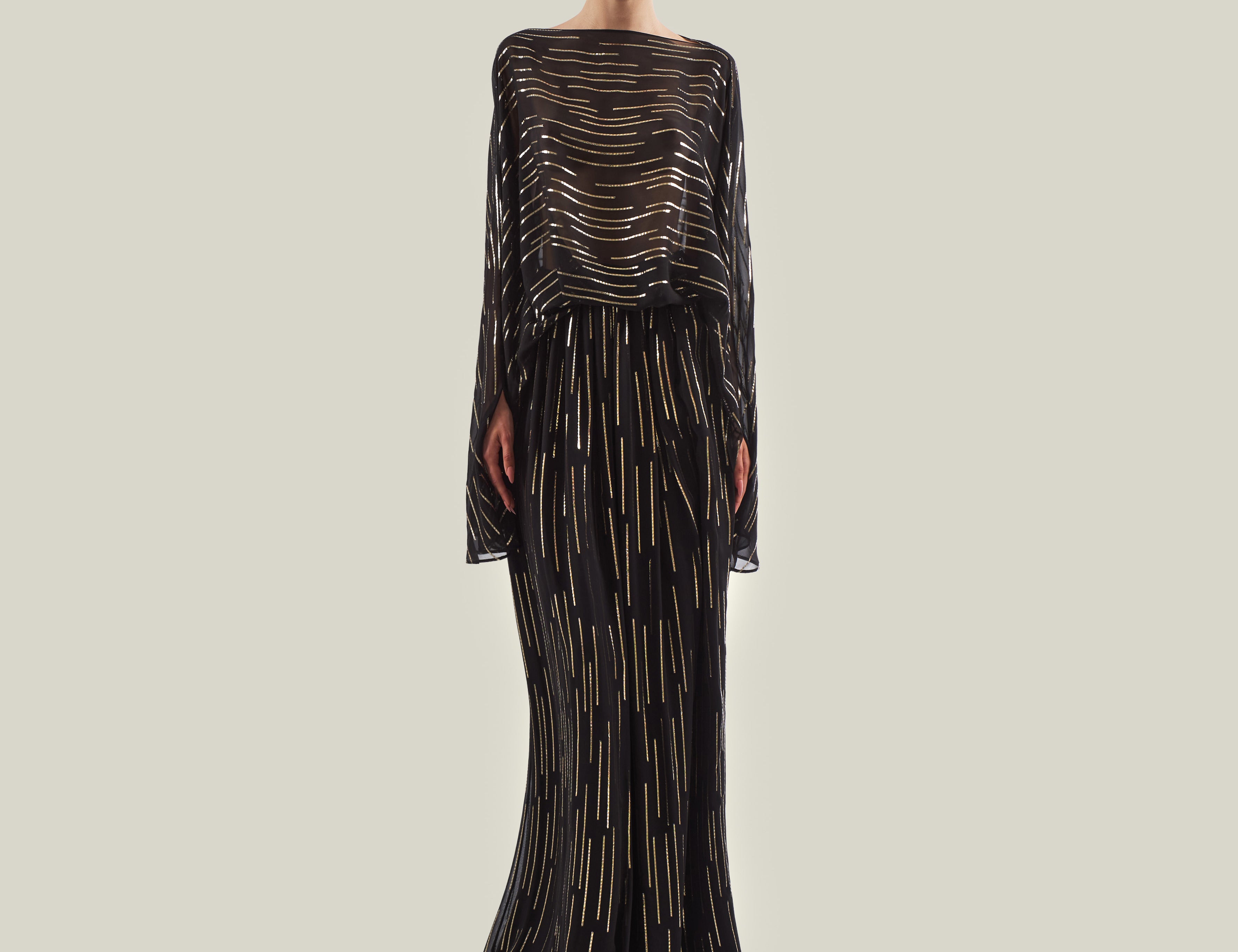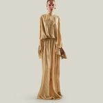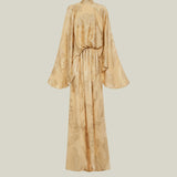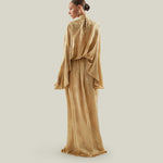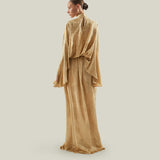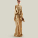 Textured luminosity defines the Lamarr, featuring a relaxed blouson bodice, oversized sleeves, and a flowing maxi skirt that moves gracefully with each step. The fabric showcases a delicate woven motif that catches the light with every movement, creating a subtle interplay of texture and shine.