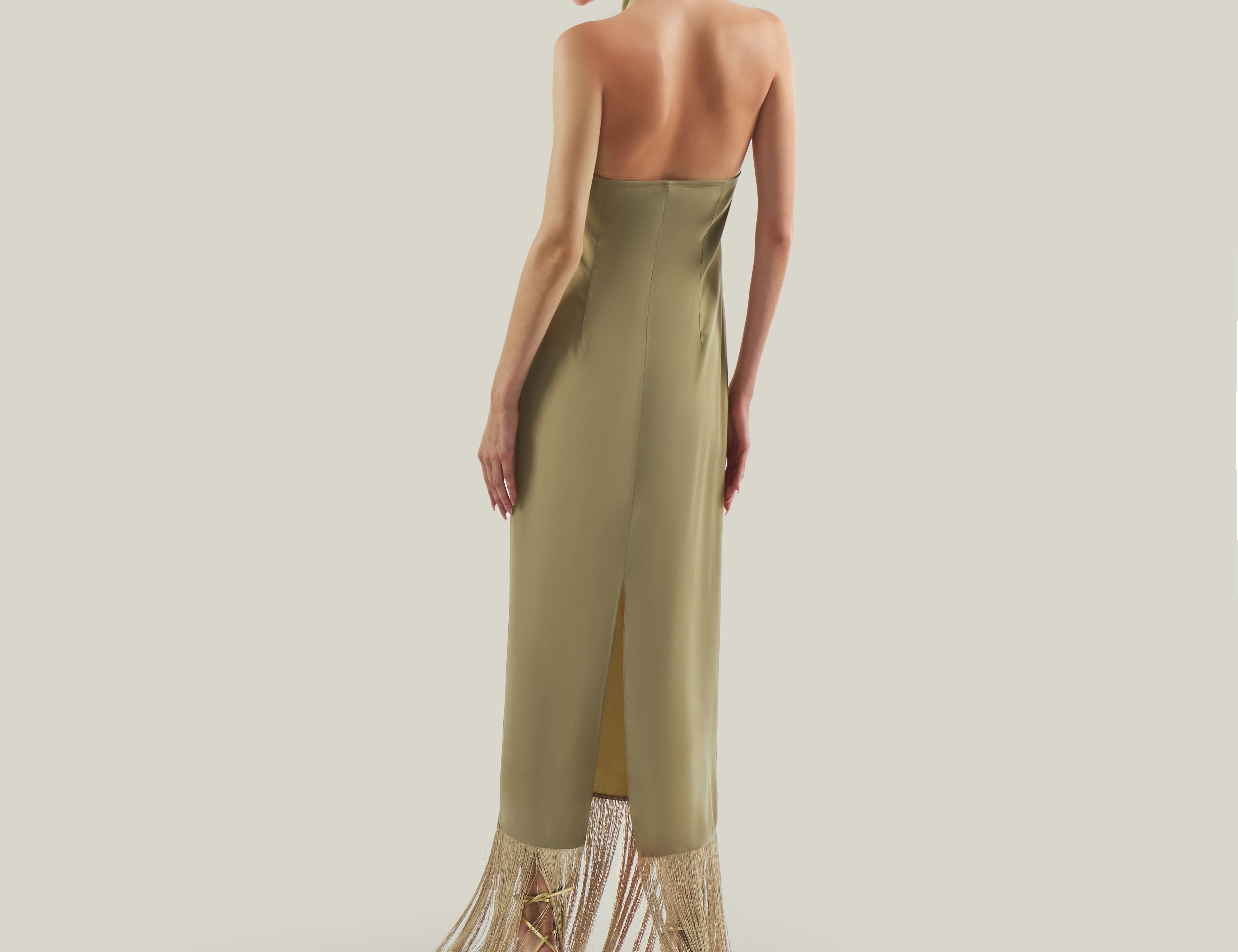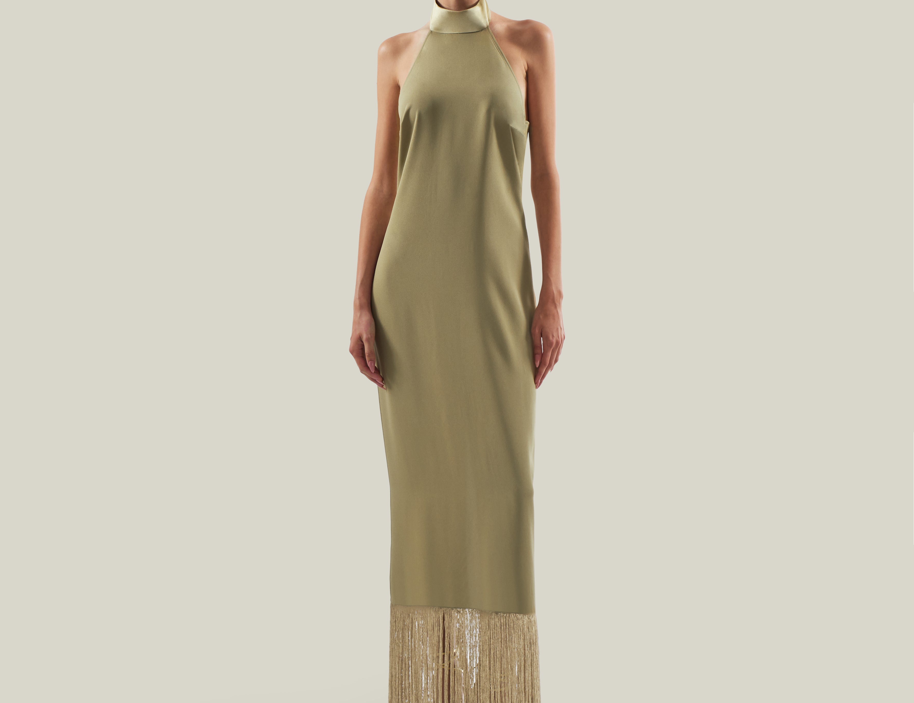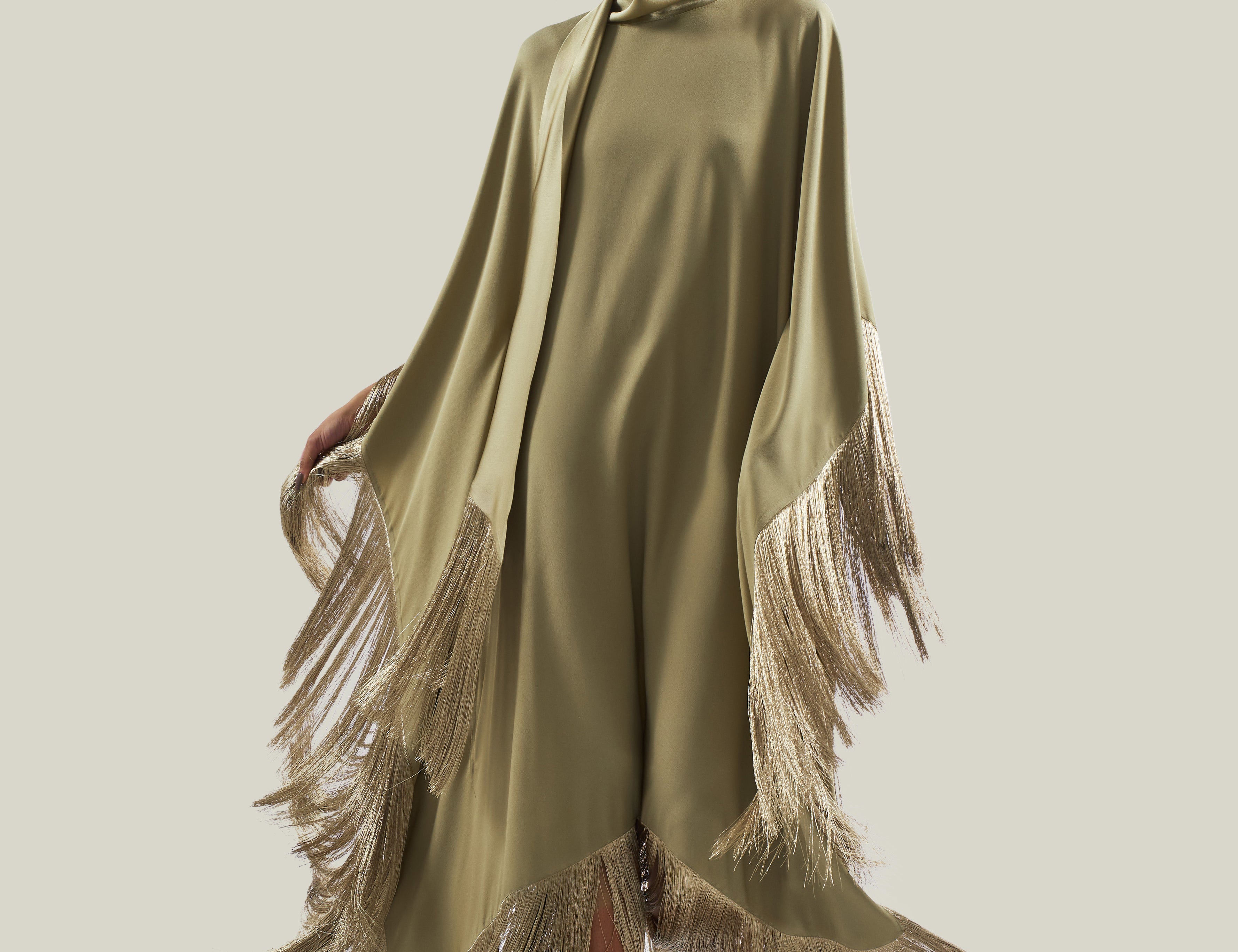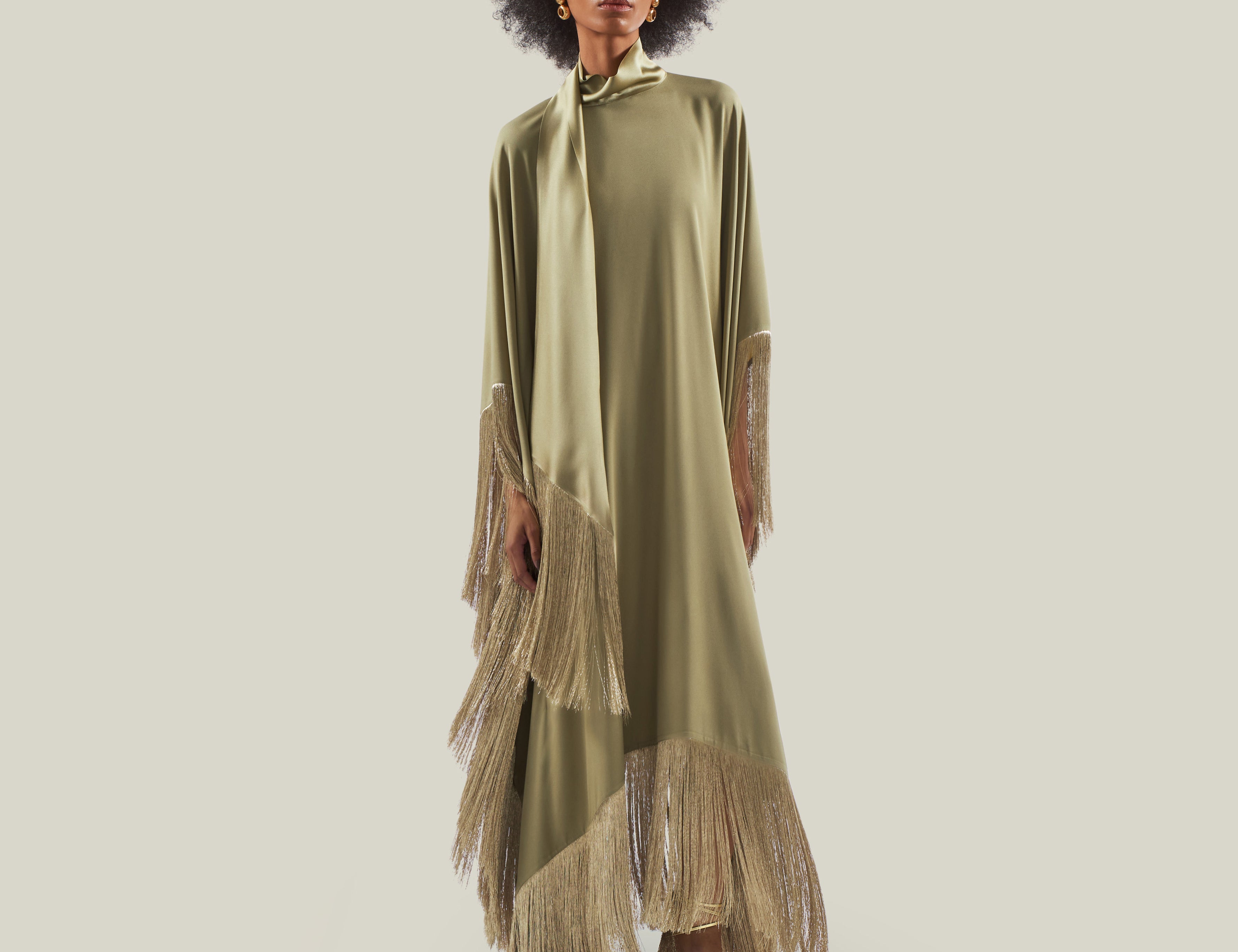 Textured luminosity defines the Lamarr, featuring a relaxed blouson bodice, oversized sleeves, and a flowing maxi skirt that moves gracefully with each step. The fabric showcases a delicate woven motif that catches the light with every movement, creating a subtle interplay of texture and shine.