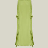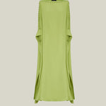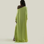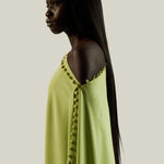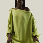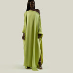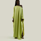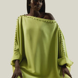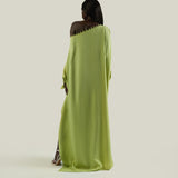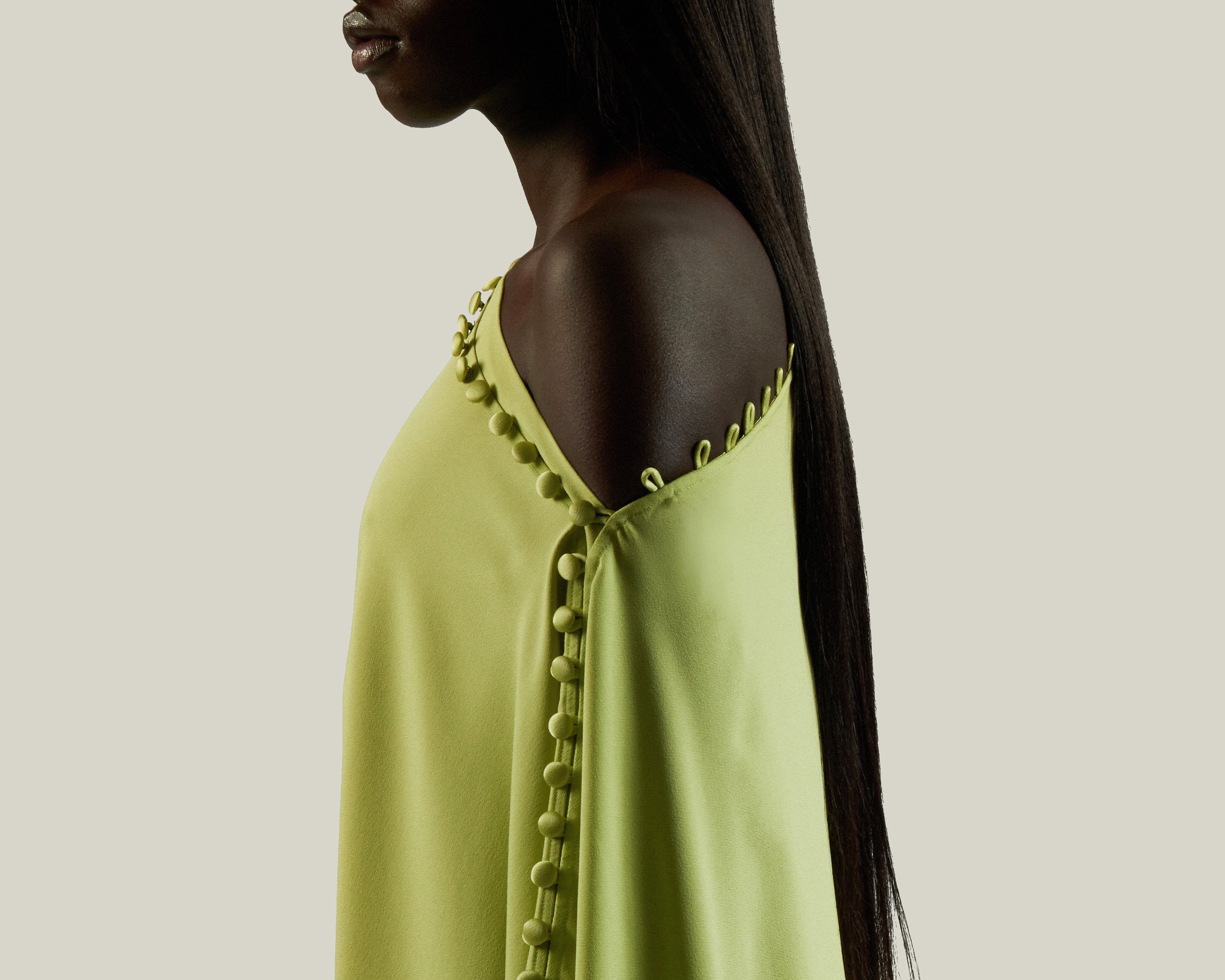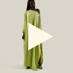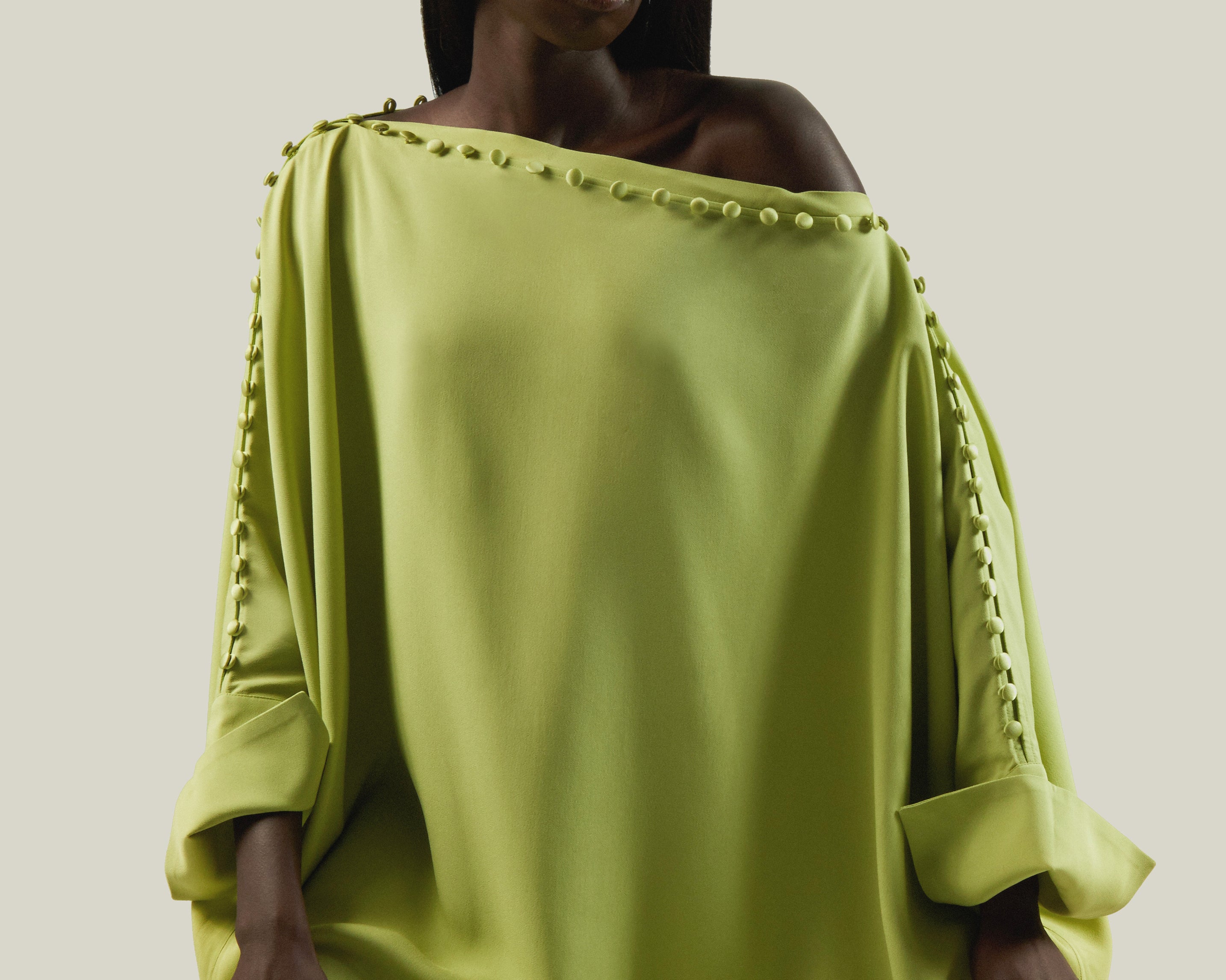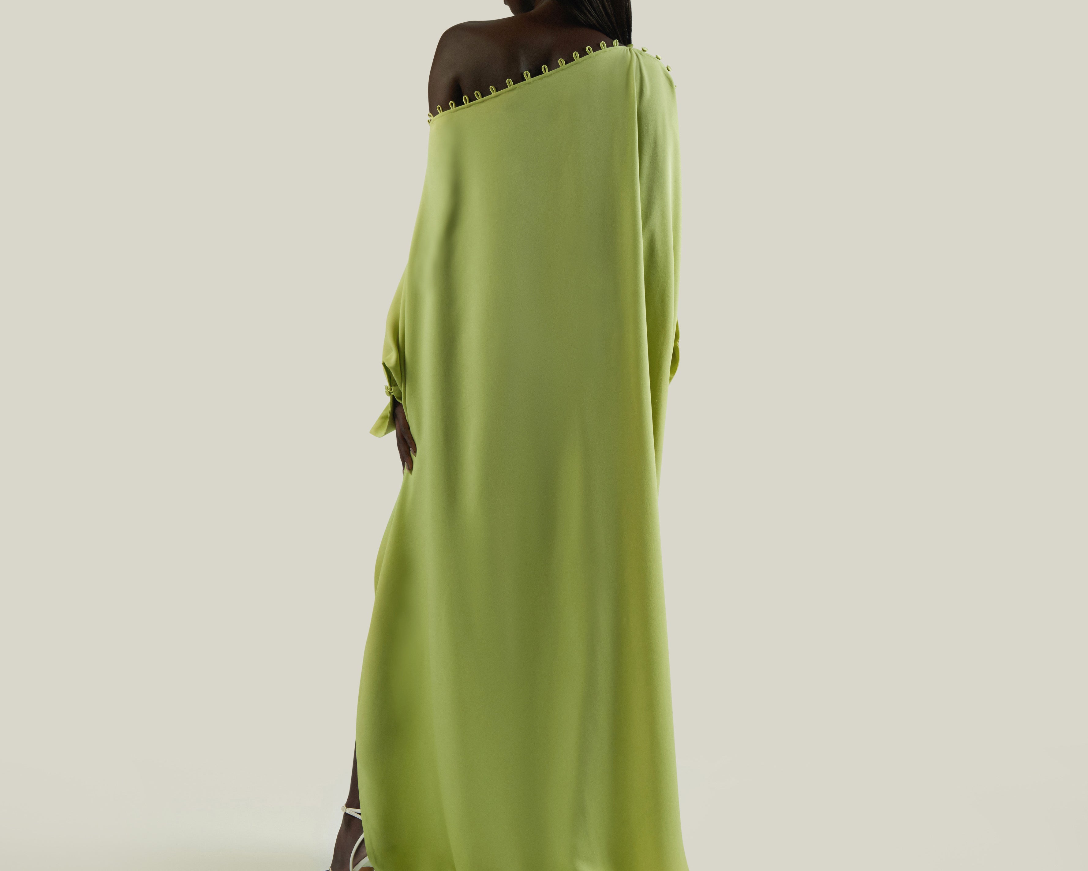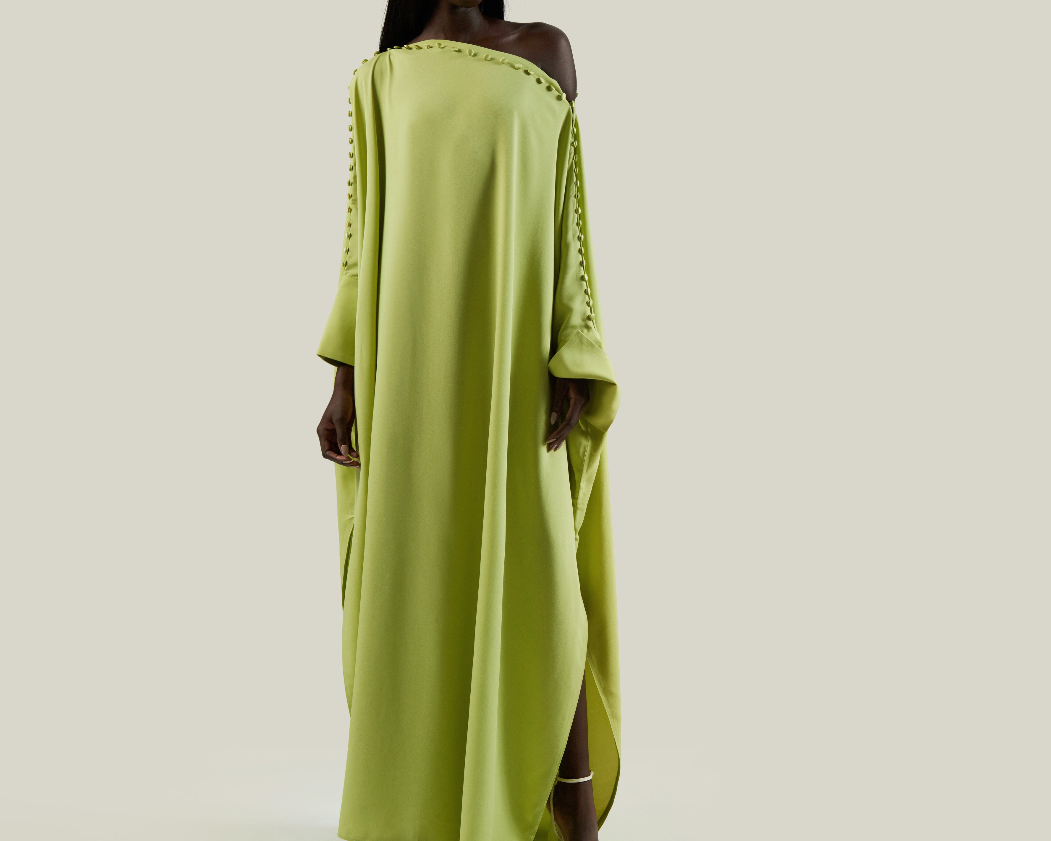 Minimalism and maximalism combined. The Mila Kaftan is made from soft crepe cady and features a neckline formed by 60 hand-sewn buttons that allow you to choose how to wear it: off-the-shoulders, boat neckline, or one-shoulder. On its sides, two slits reveal your legs, making it even more playful.