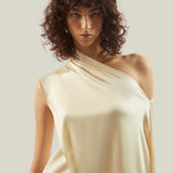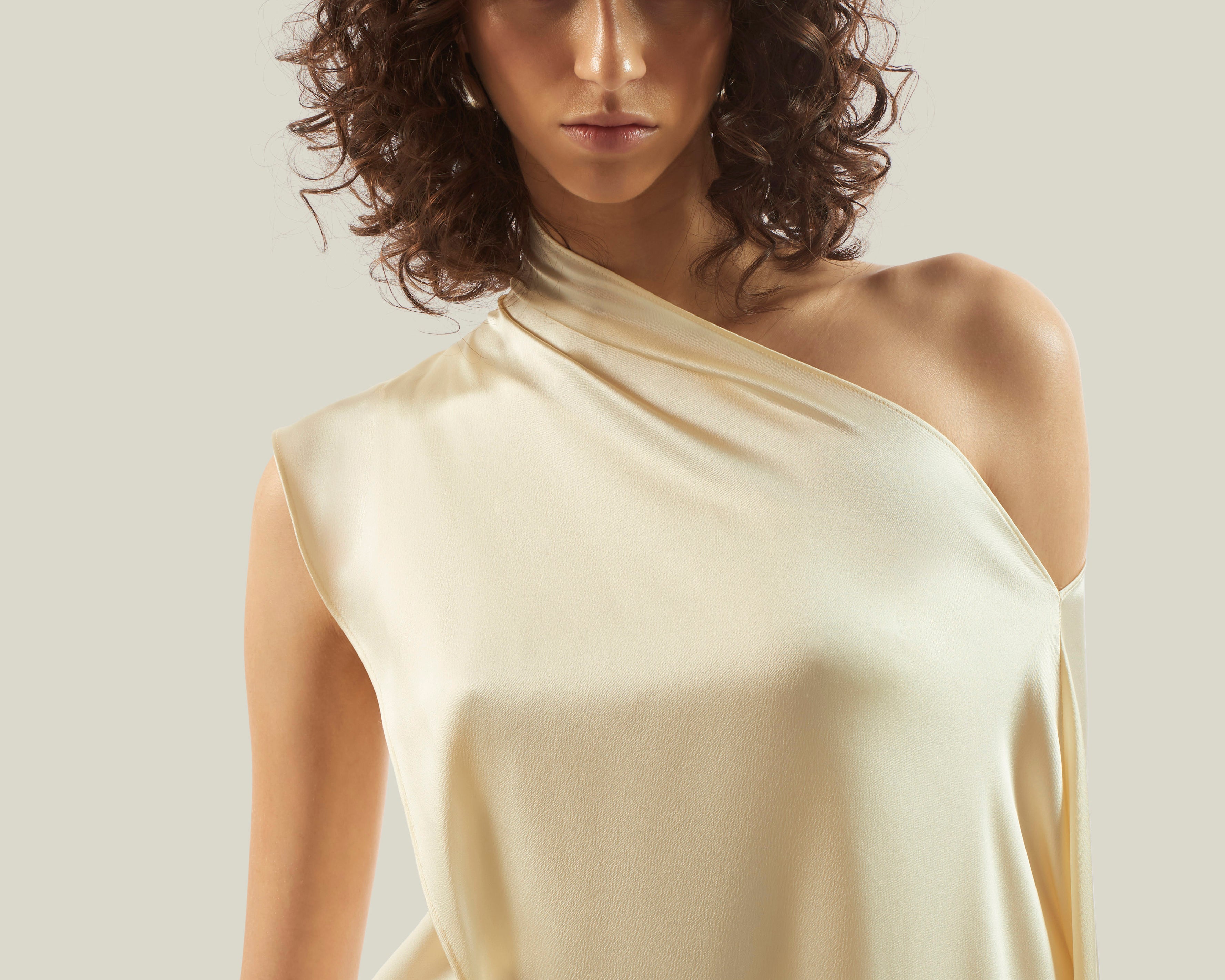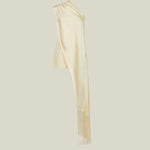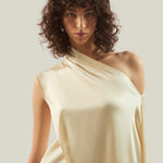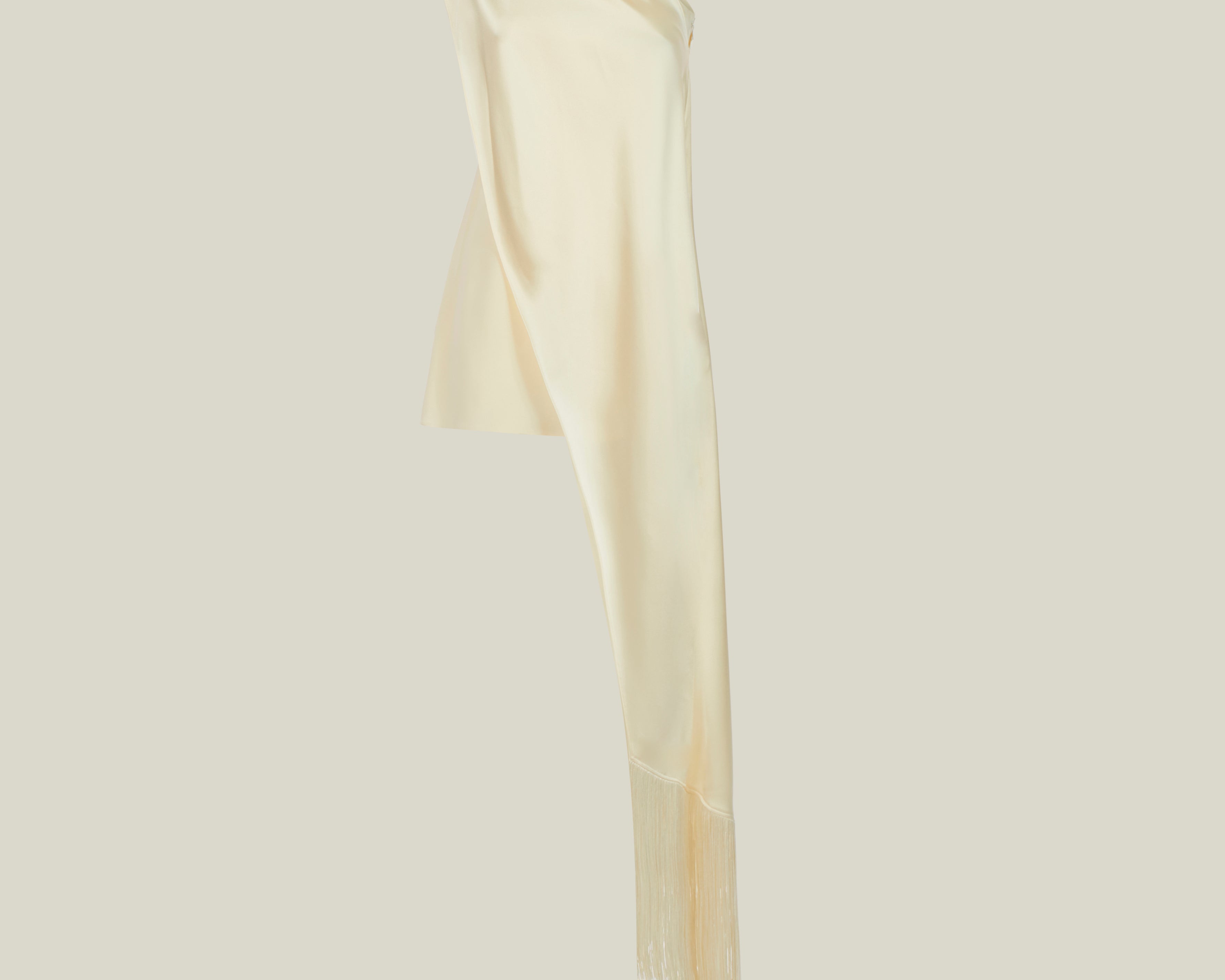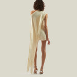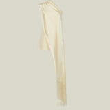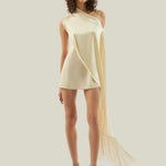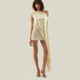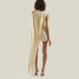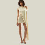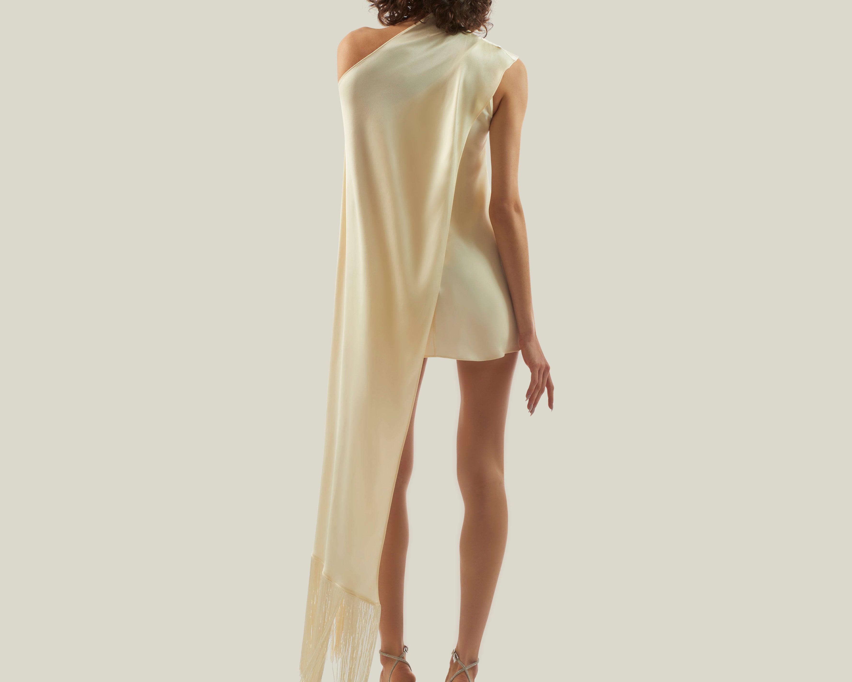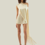 The Mini Berenson is a short one-shoulder column dress crafted from soft crepe cady. It features an elegant attached cape, fully trimmed with soft tonal fringes at the hem. This refined piece combines timeless style with a touch of dramatic flair.