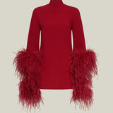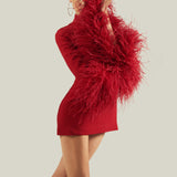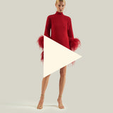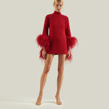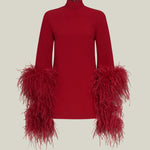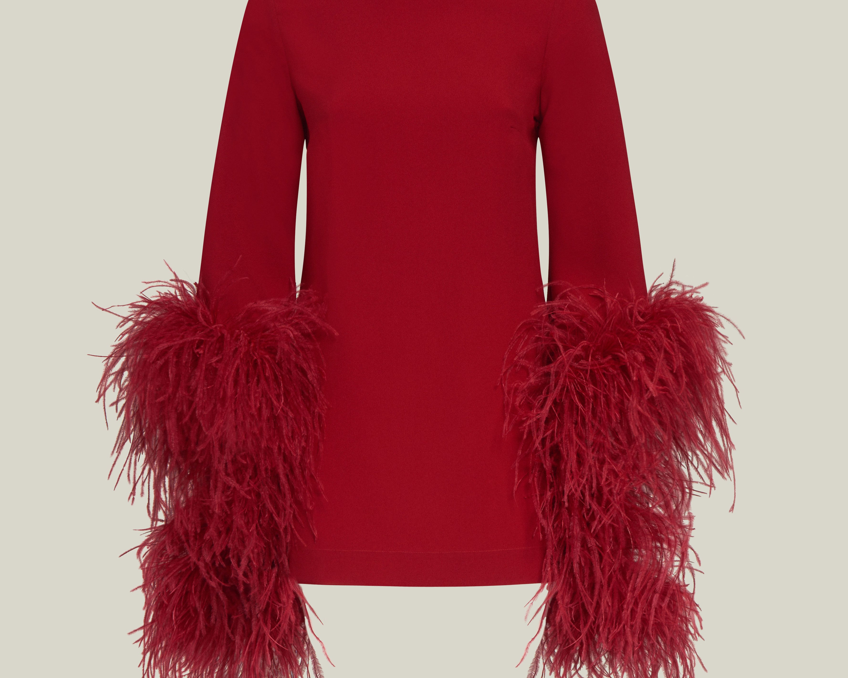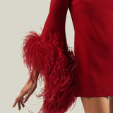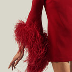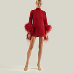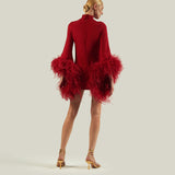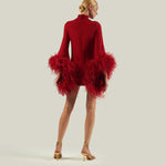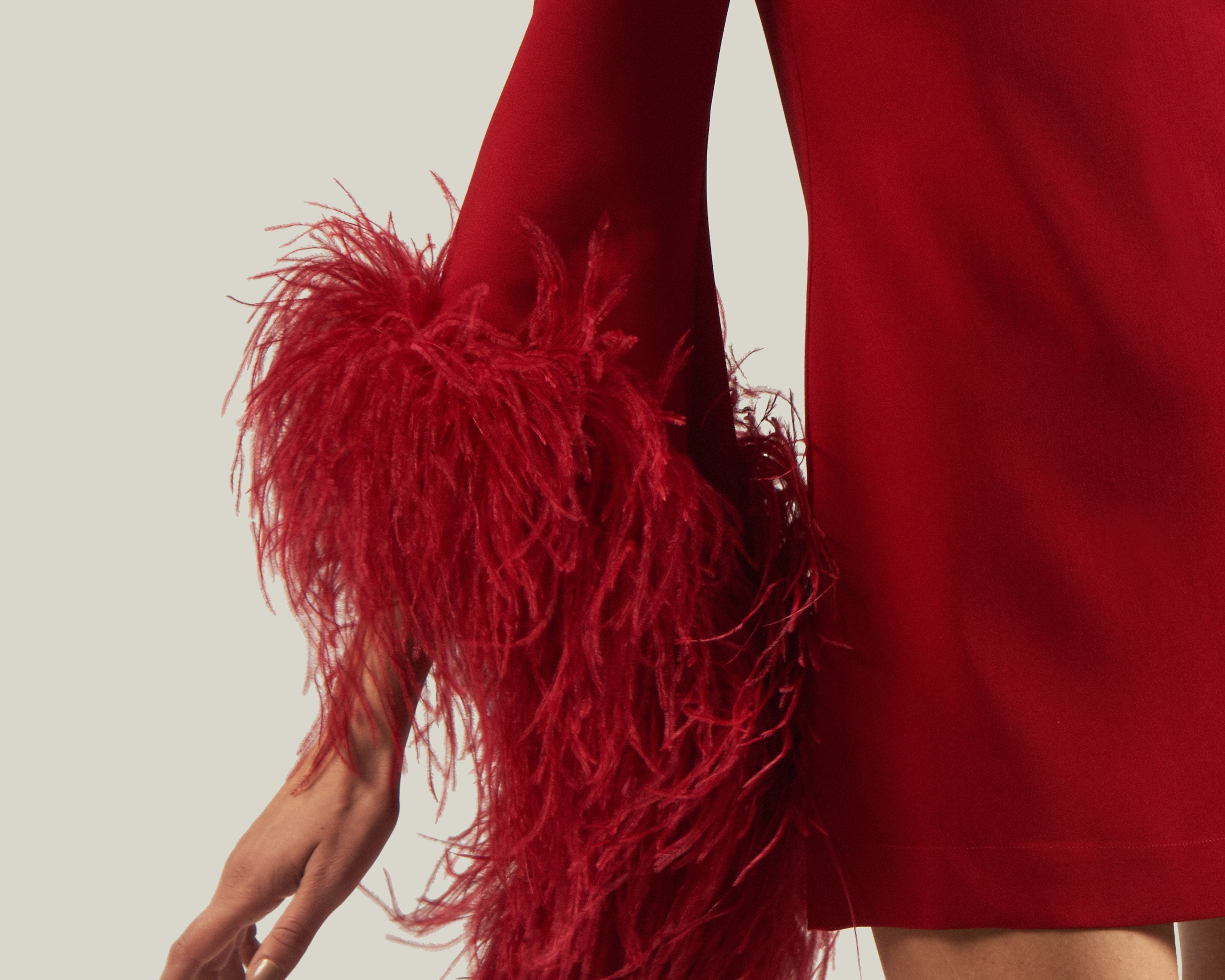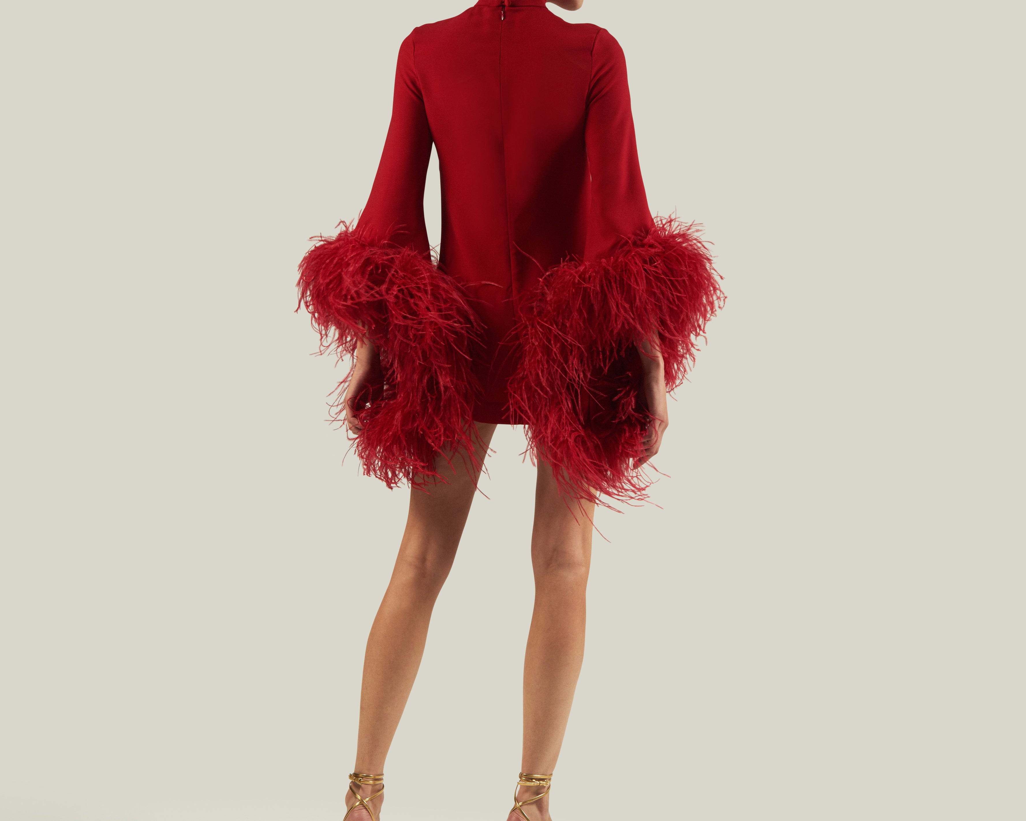 Sensual and playful, the Mini Del Rio is a short dress made from soft crepe cady featuring a high neck and dramatic bell sleeves fully trimmed with ostrich feathers that evoke pure Old Hollywood Glamour. A "Taller Marmo" Classic.
