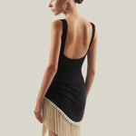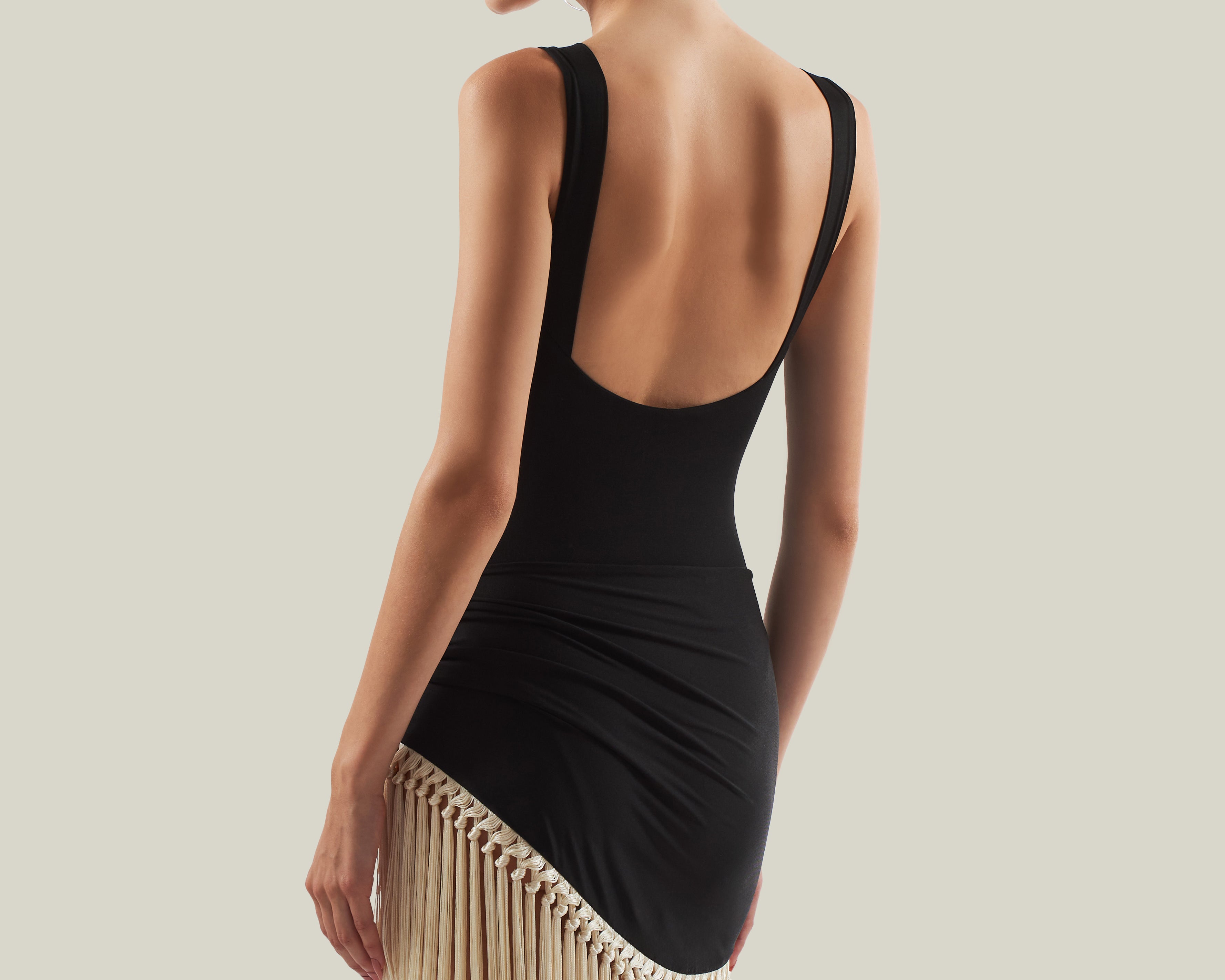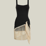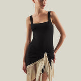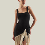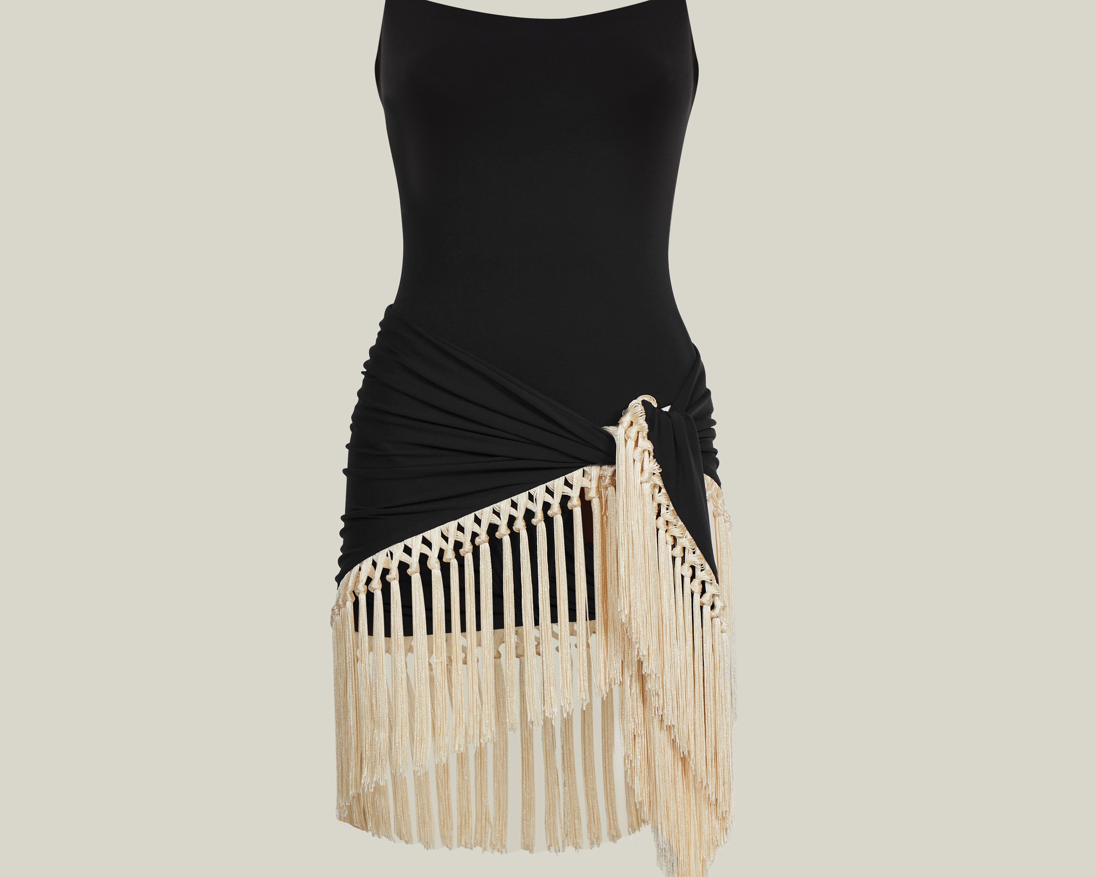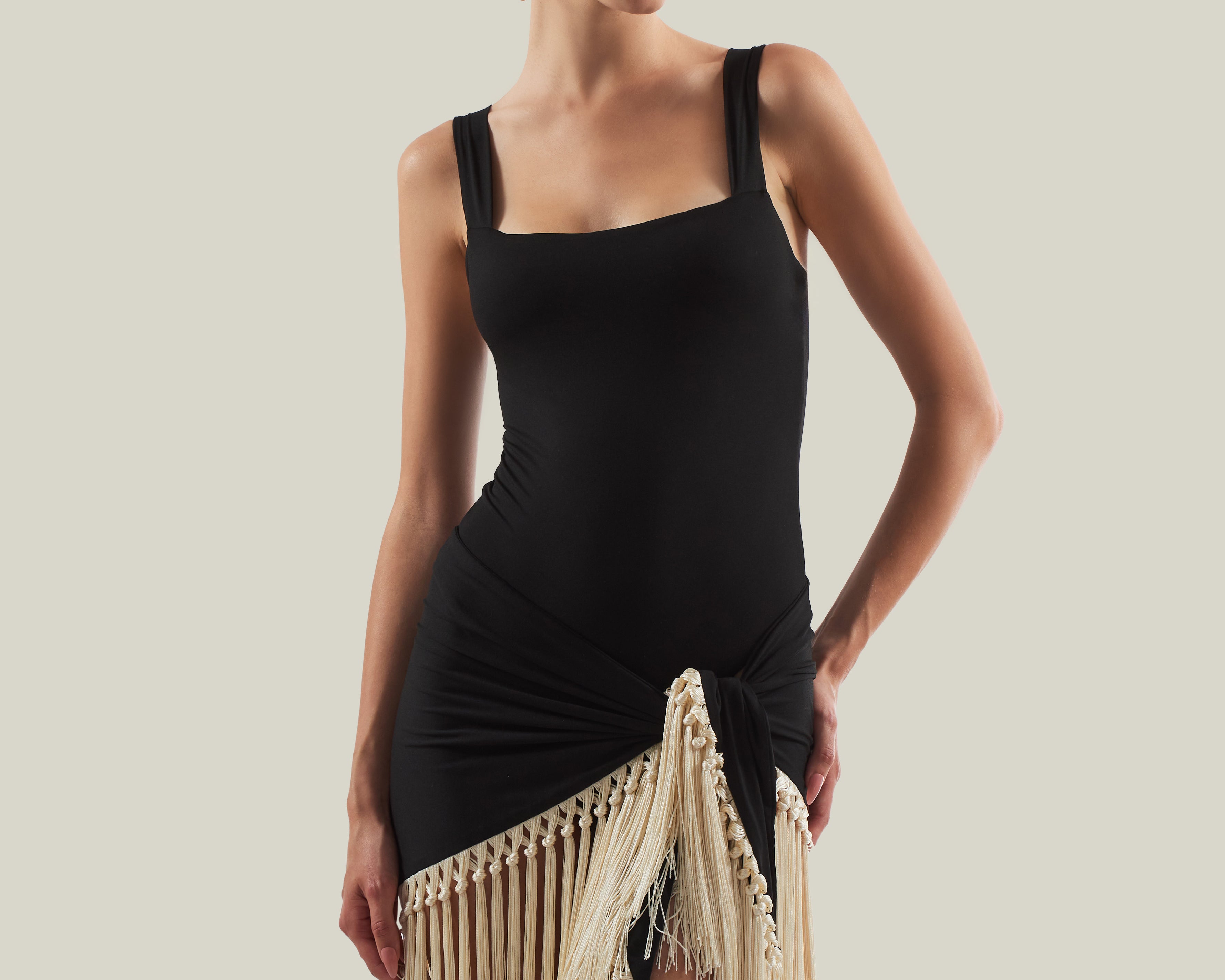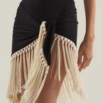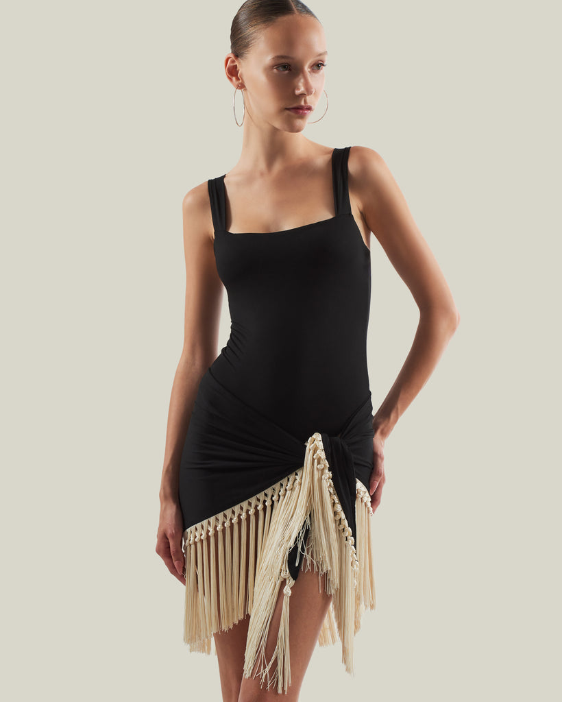 The Mini Lido is a tank-style swimsuit that features double oversized bead straps crafted from smooth stretch fabric, paired with a detachable hand-tied fringed pareo contrast ivory fringes for versatile styling. It offers light coverage while enhancing movement and texture, creating a relaxed yet chic ensemble for sun-soaked days.