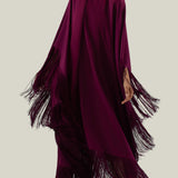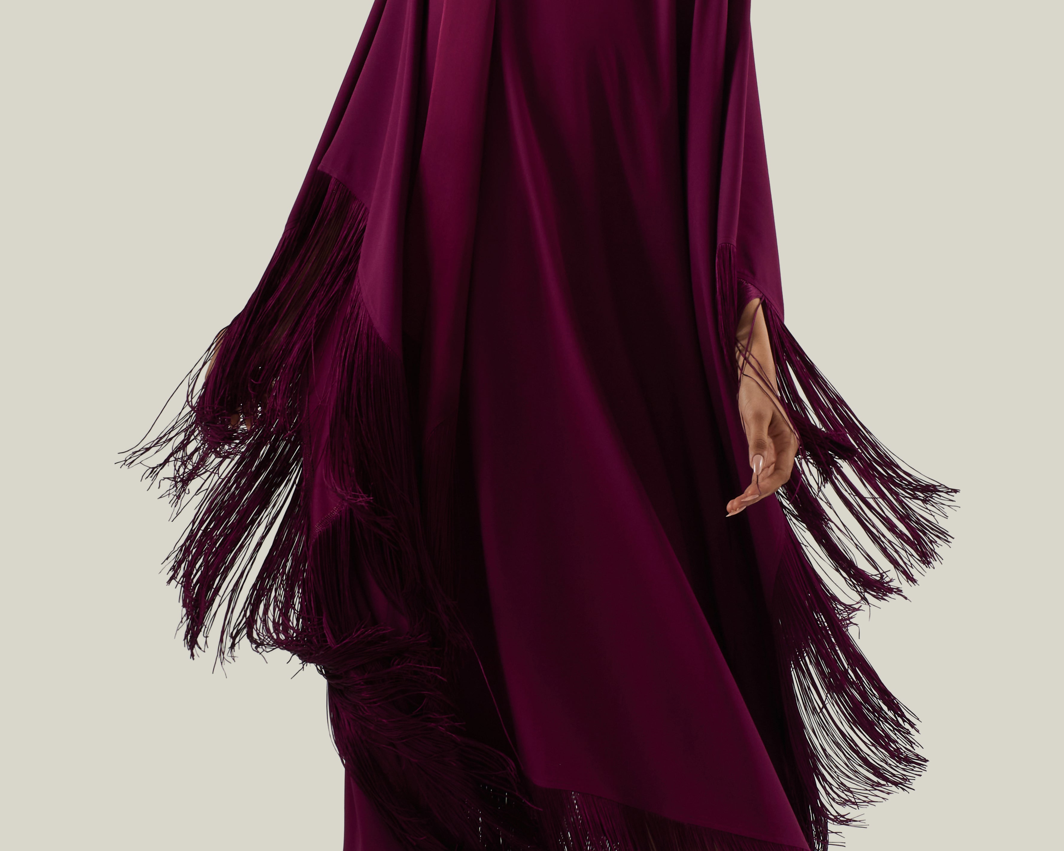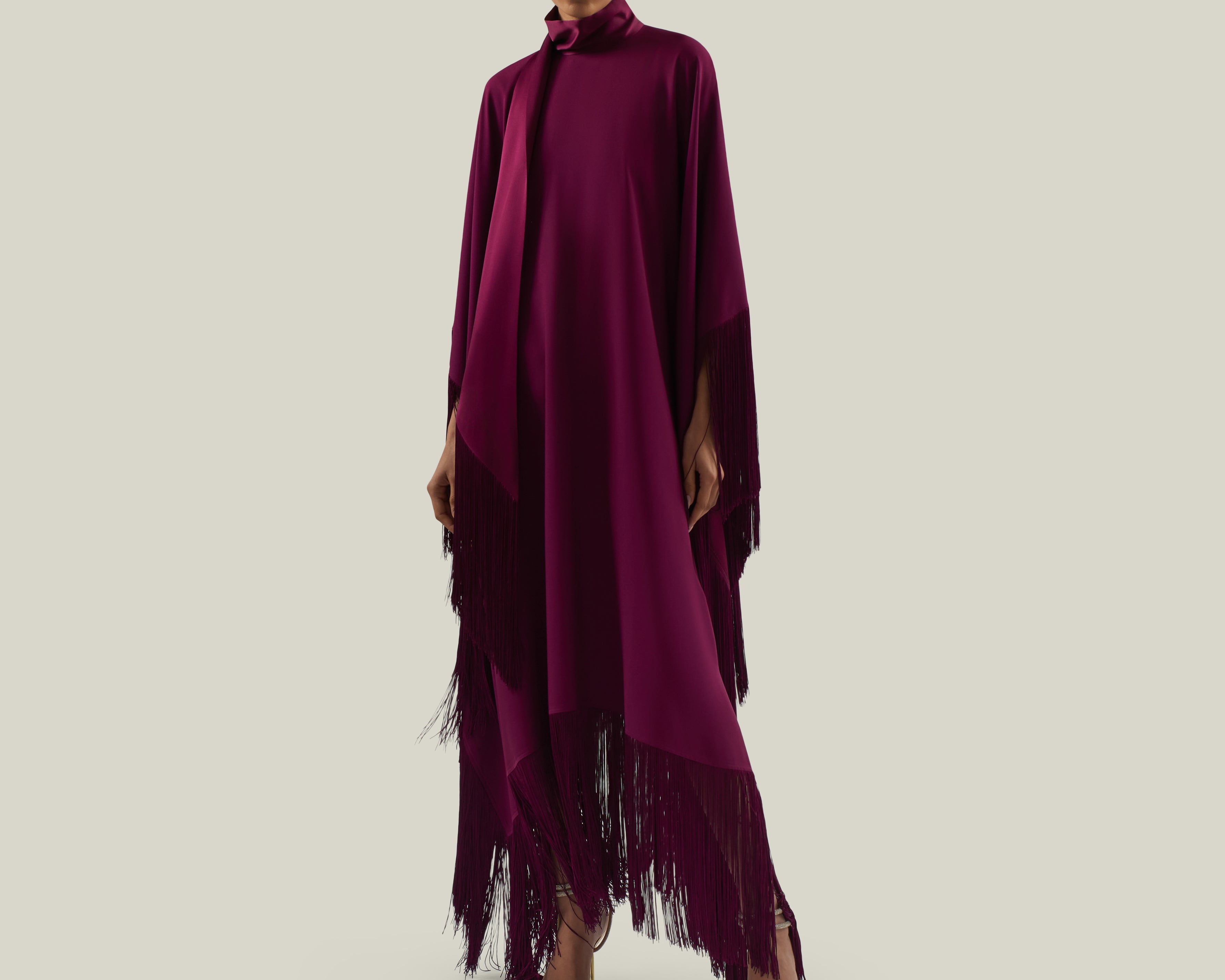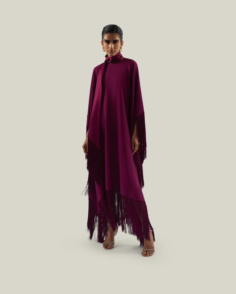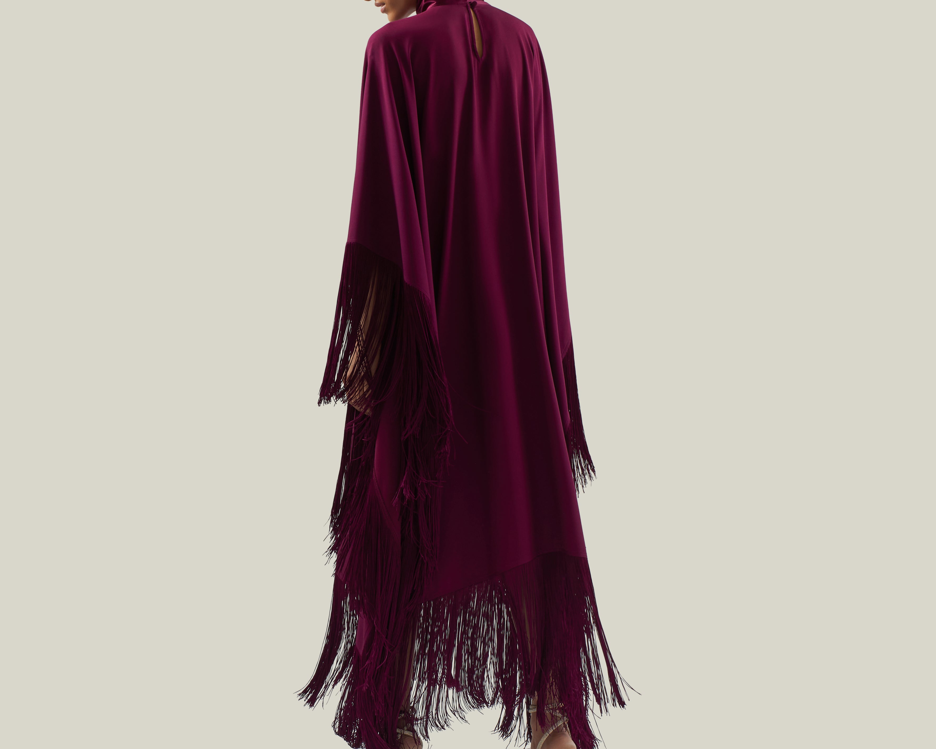 Inspired by the one and only Diana, the Mrs. Ross is a relaxed-fit kaftan made from sleek viscose-blend crepe cady, fully trimmed with tonal soft fringes, and featuring a scarf-style high neckline. A Taller Marmo Classic.