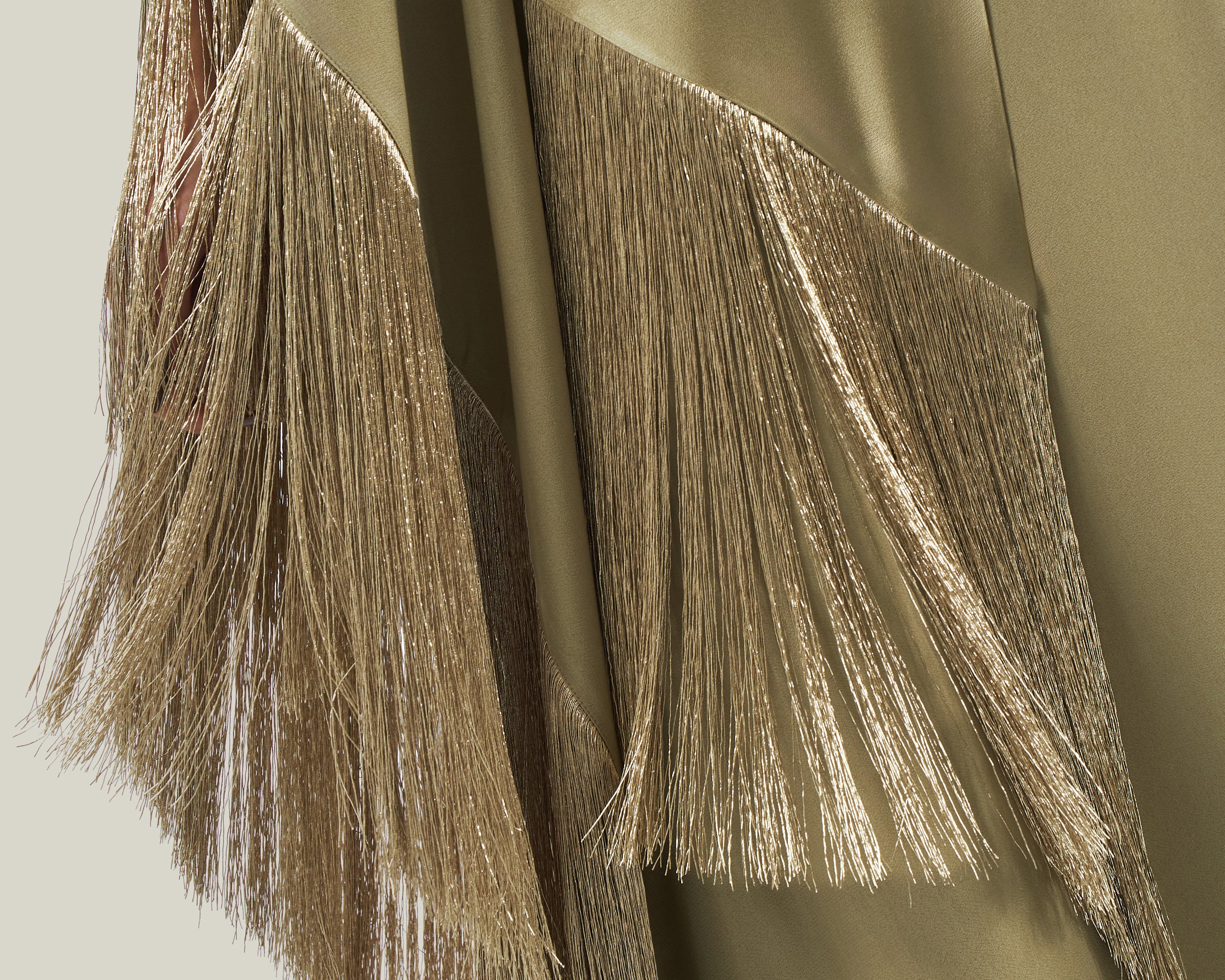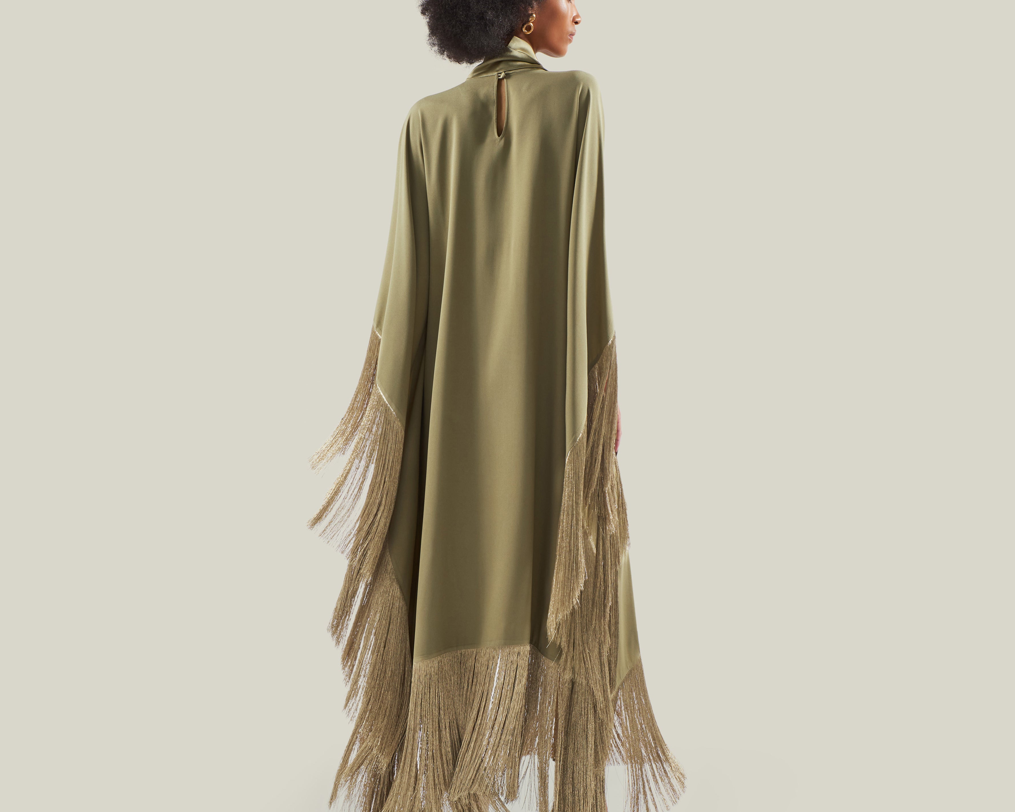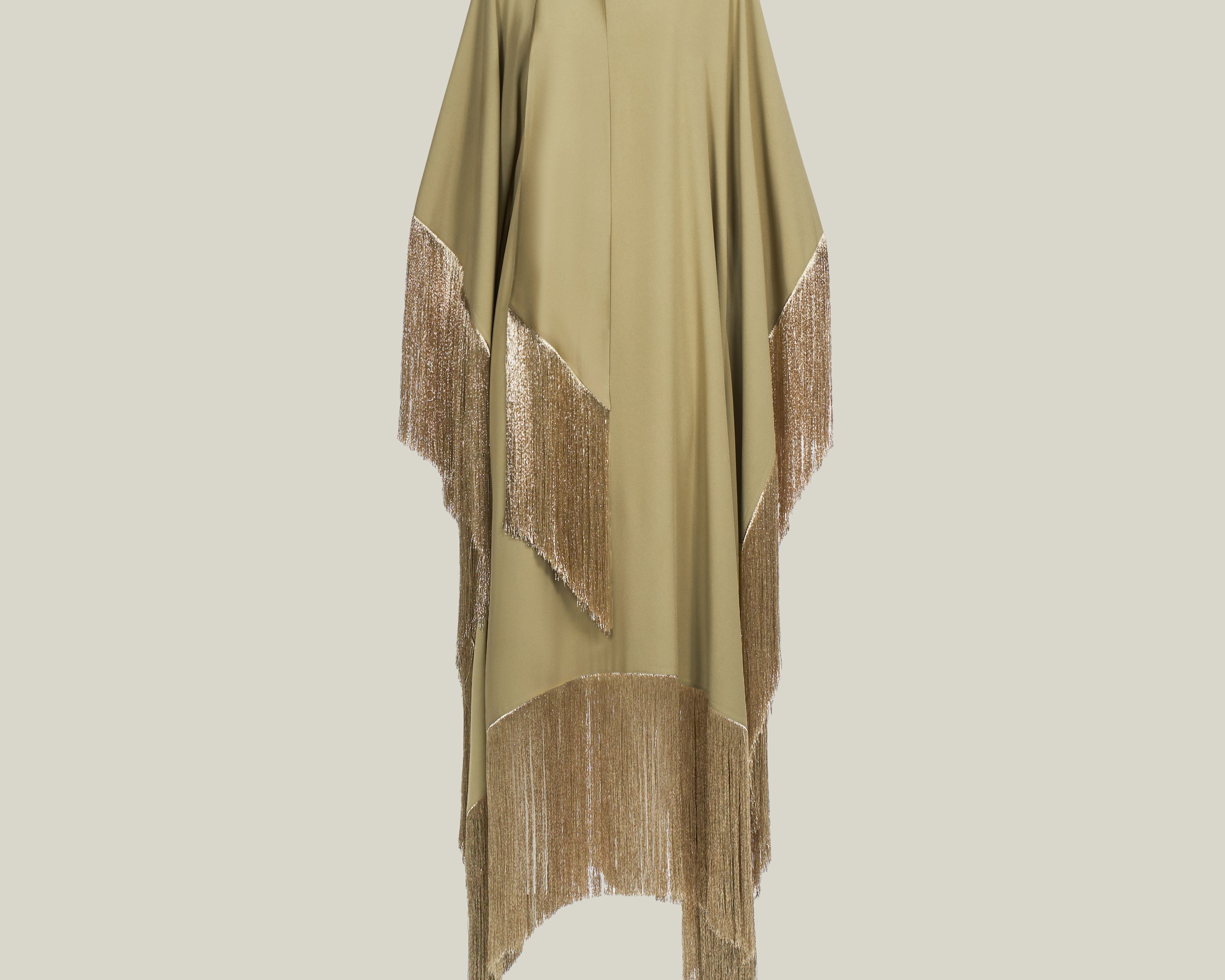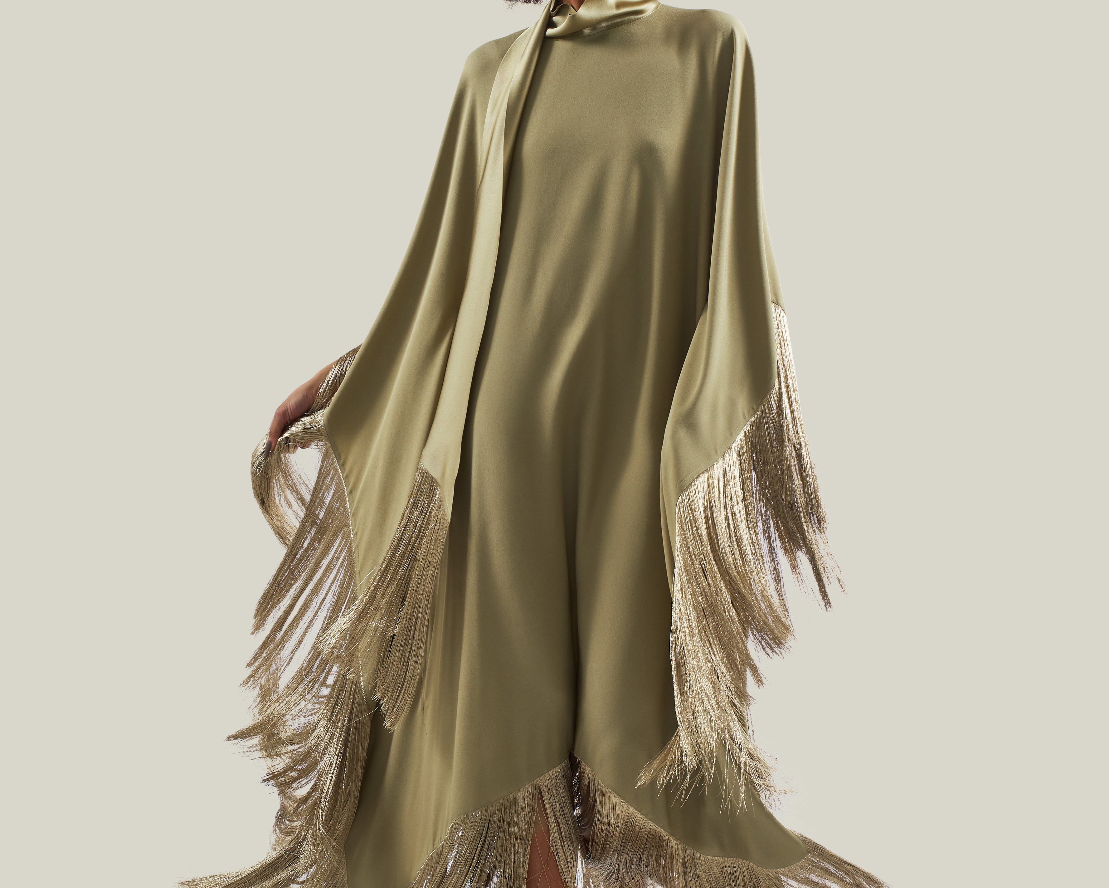 Named after the theatrical world of revue shows, the Mrs. Ross Revue reinterprets our iconic Mrs. Ross kaftan with a touch of party glamour. Crafted from sleek viscose-blend crepe cady, it features a relaxed fit, a scarf-style high neckline, and is fully adorned with gilded metallic fringes that catch the light with every movement. A Taller Marmo classic, now sparkling more than ever.