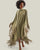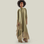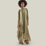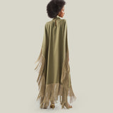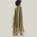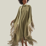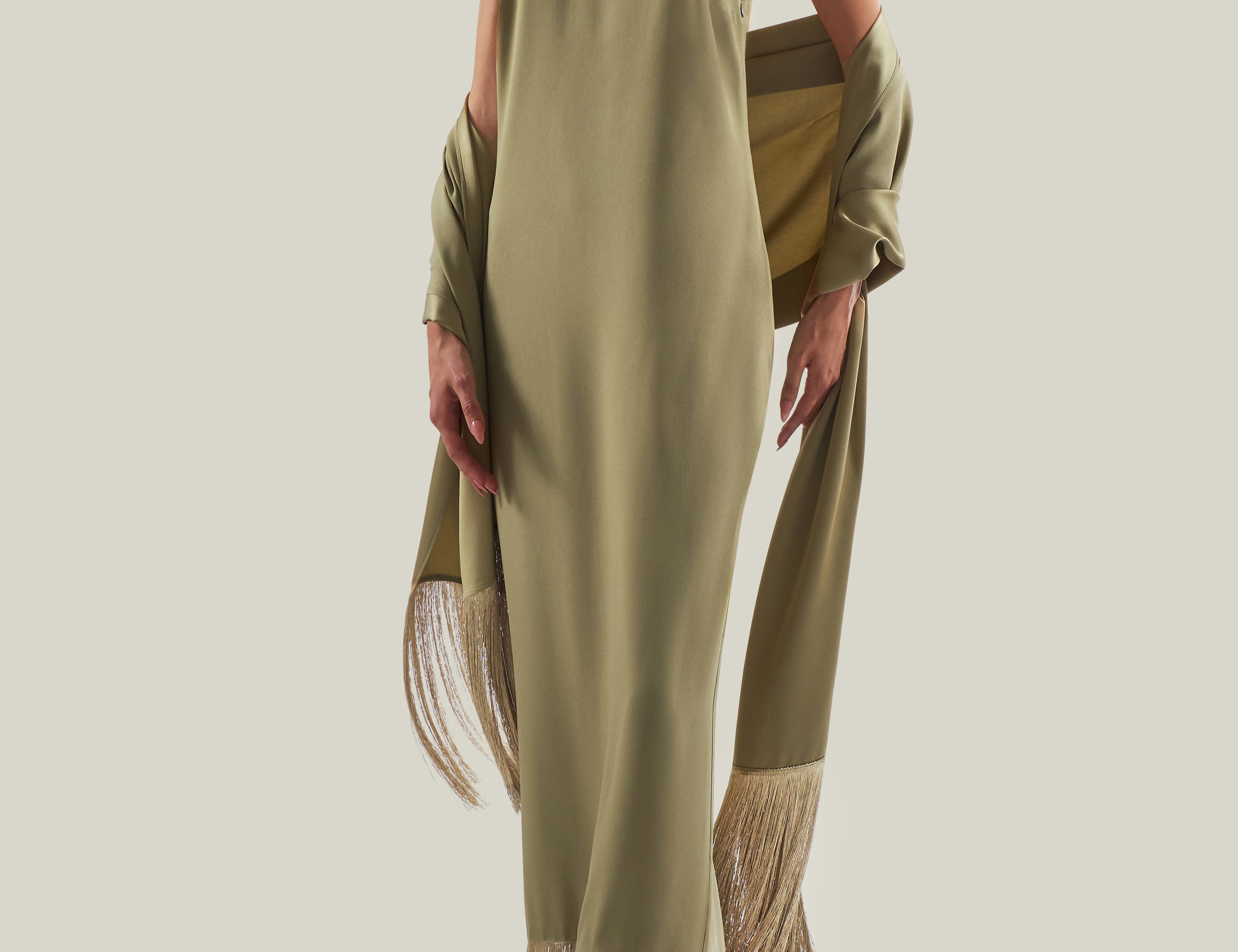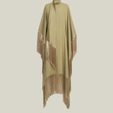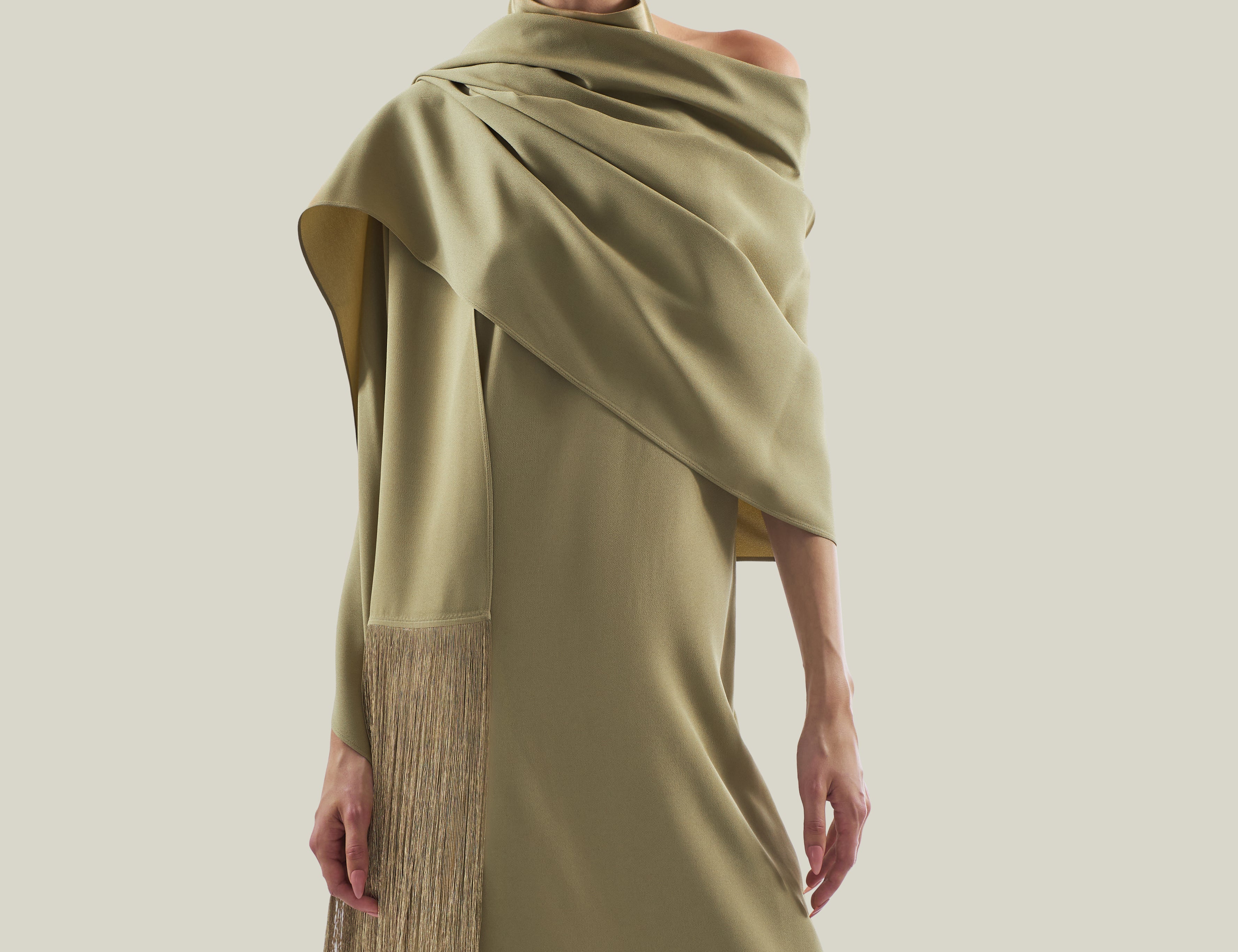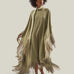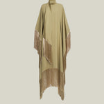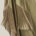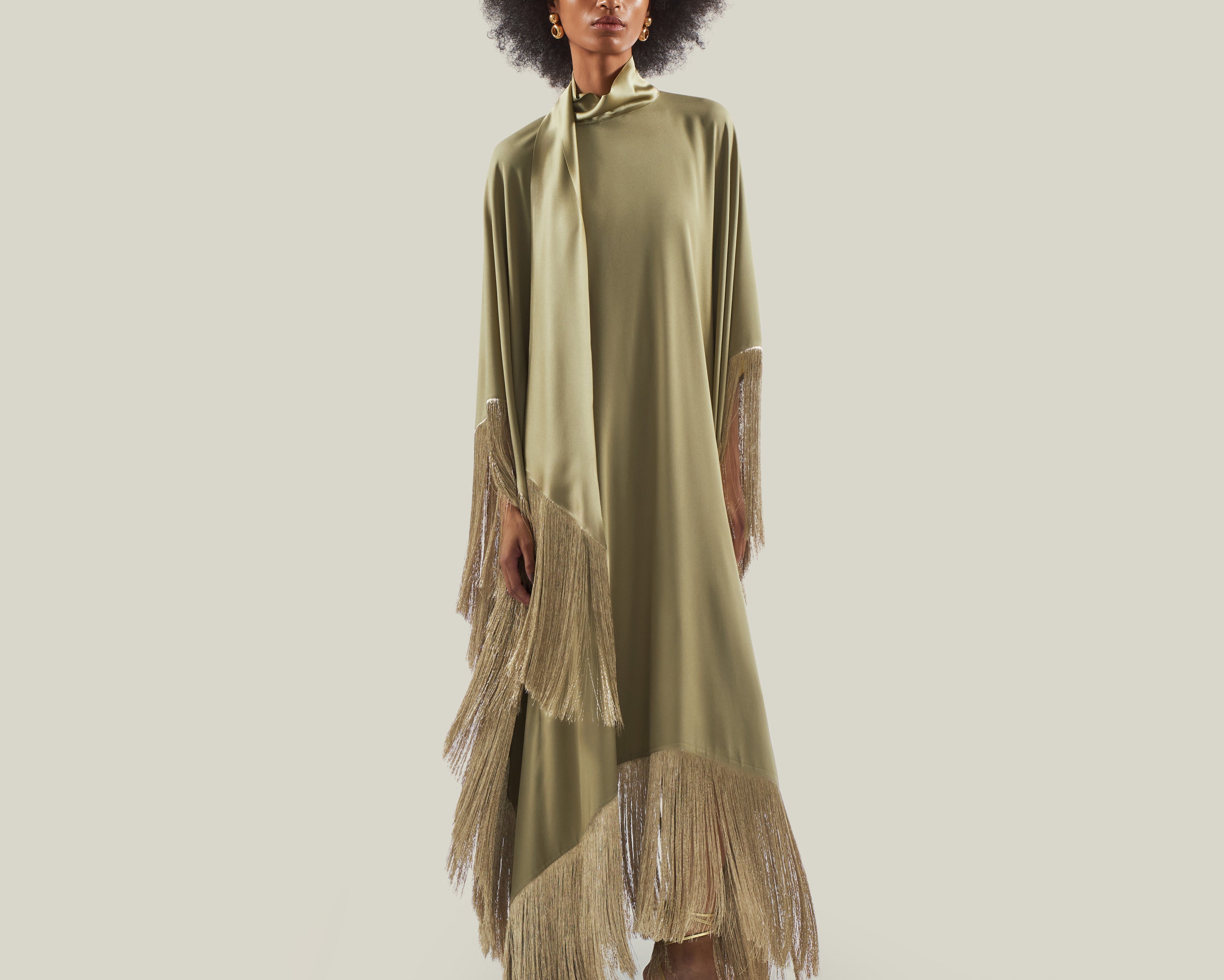 Named after the theatrical world of revue shows, the Mrs. Ross Revue reinterprets our iconic Mrs. Ross kaftan with a touch of party glamour. Crafted from sleek viscose-blend crepe cady, it features a relaxed fit, a scarf-style high neckline, and is fully adorned with gilded metallic fringes that catch the light with every movement. A Taller Marmo classic, now sparkling more than ever.
