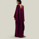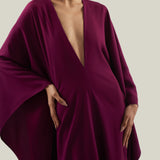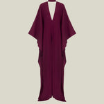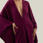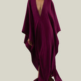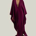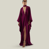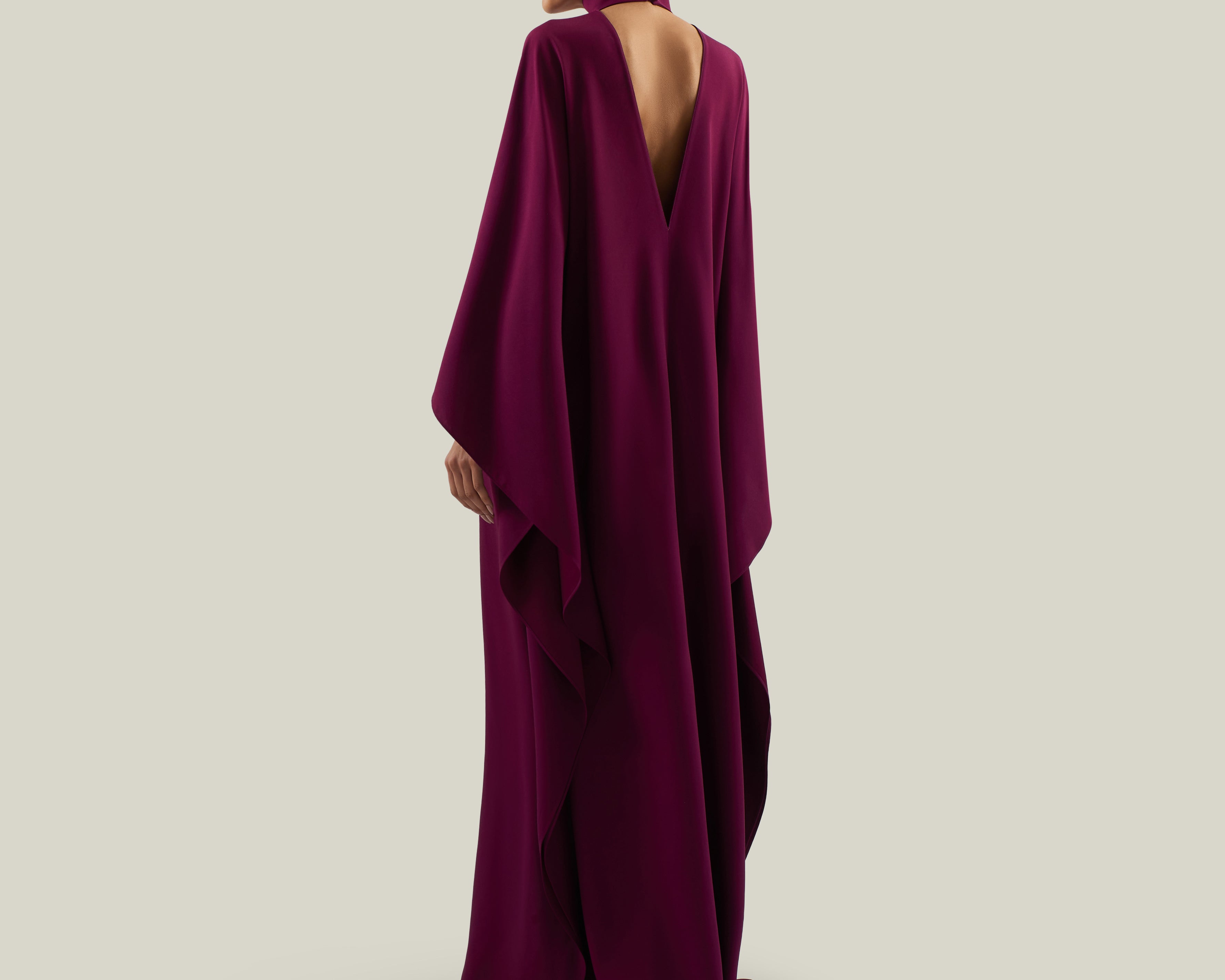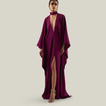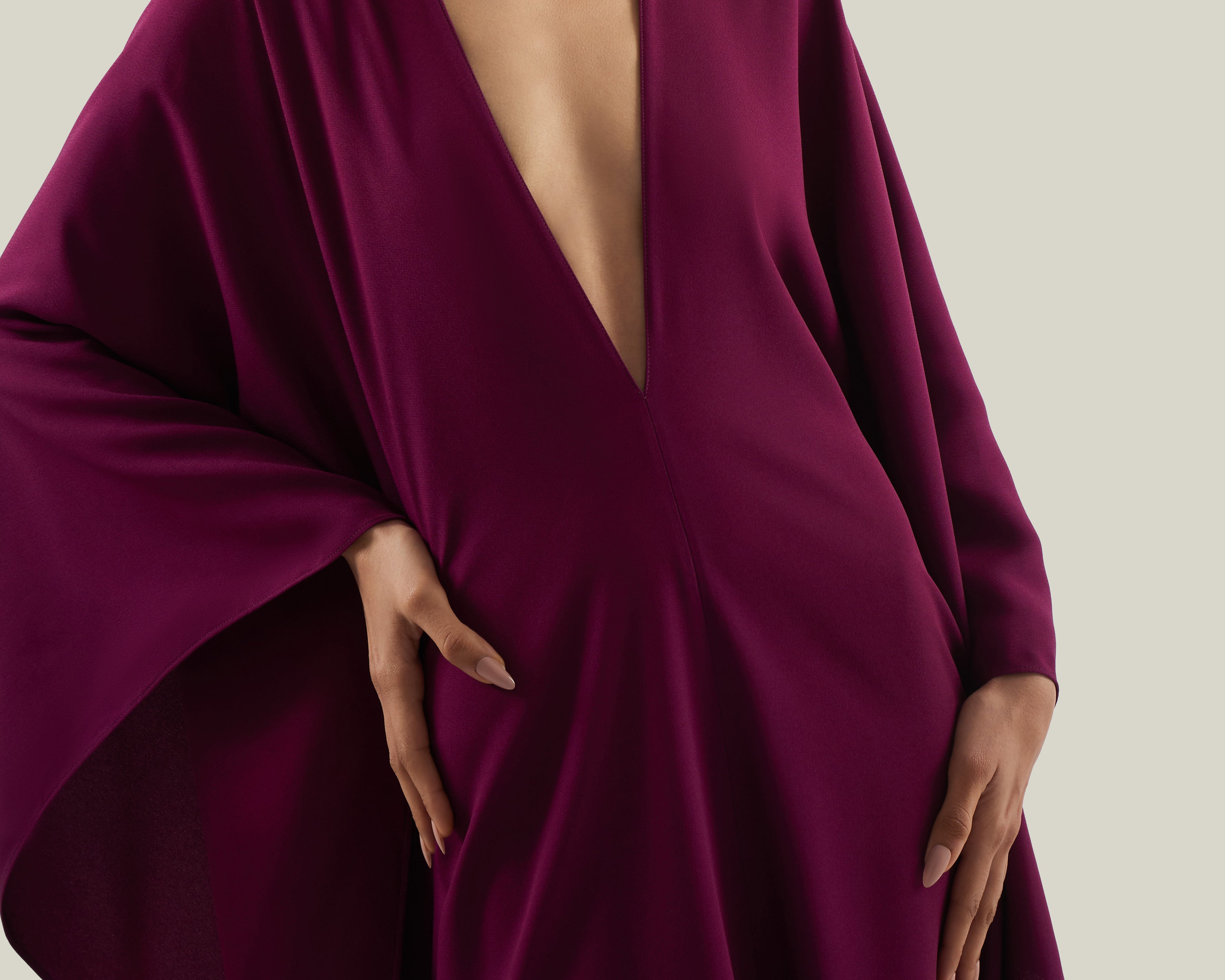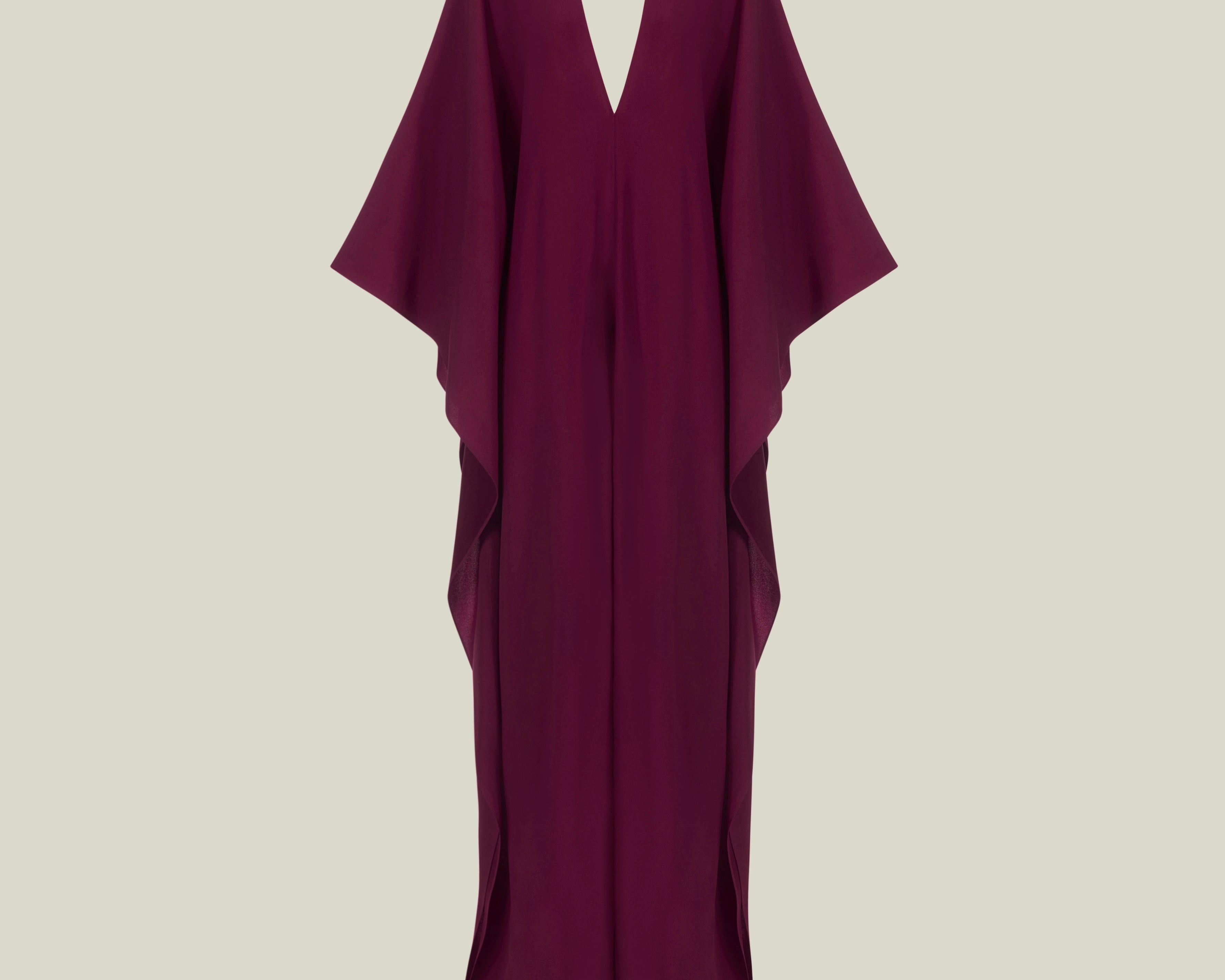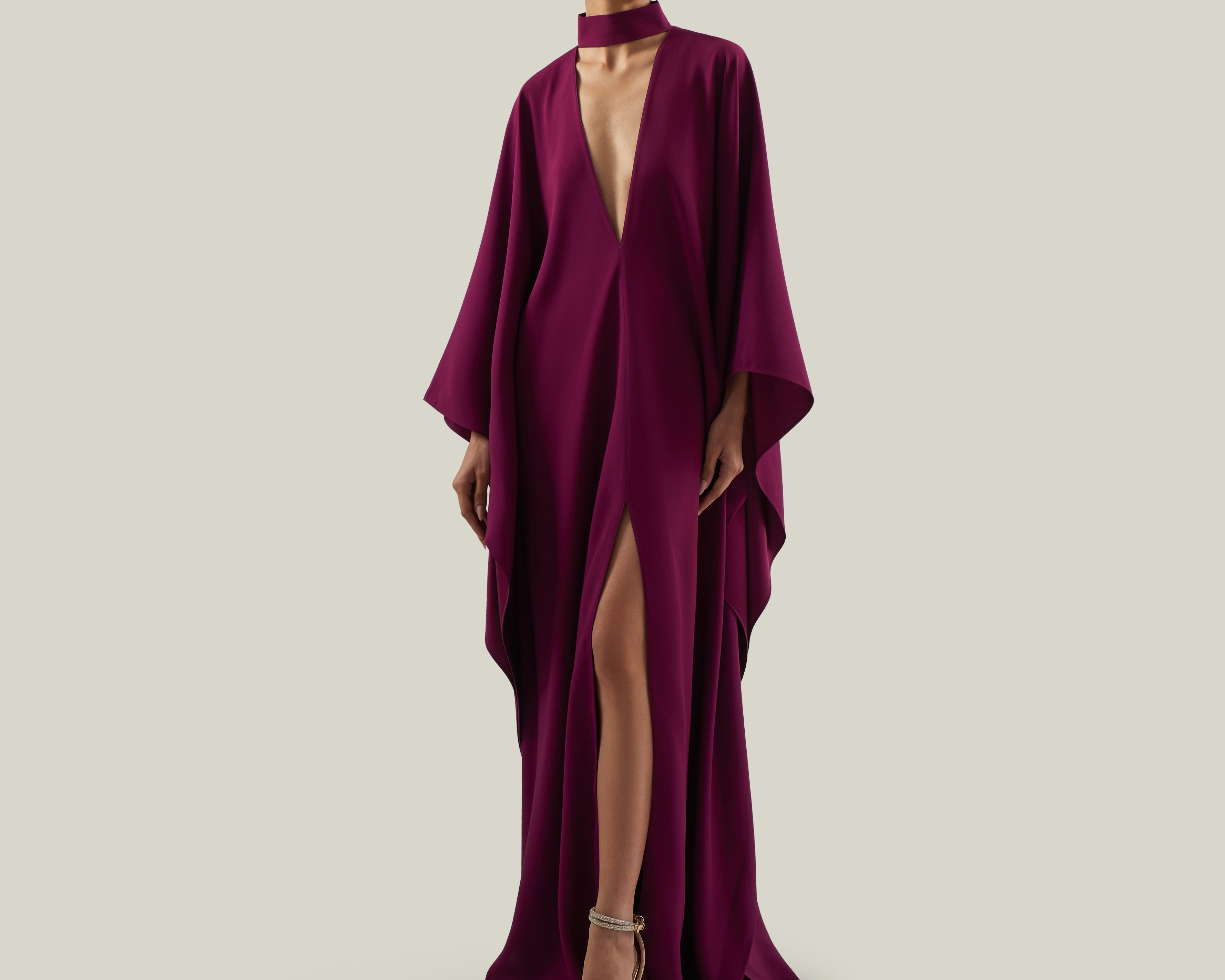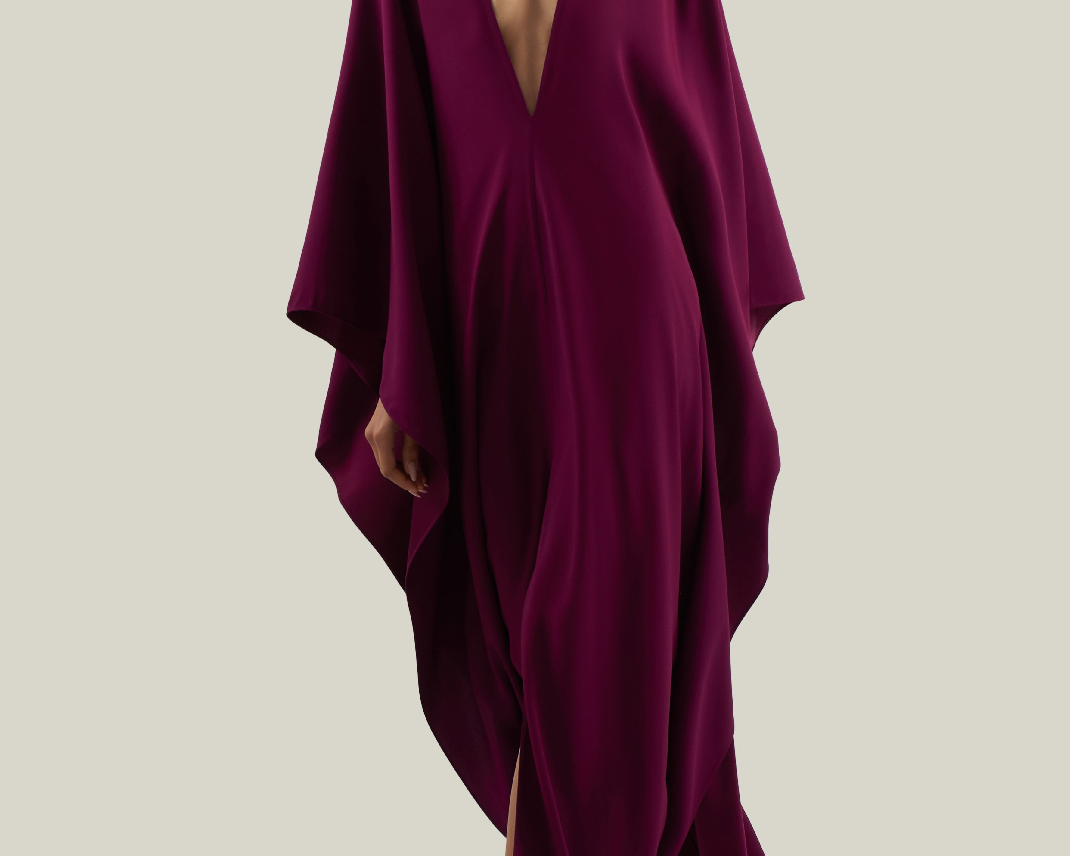 OOO as in "Out Of Office." This fluid and sensual kaftan made of crepe cady features a deep V neckline, a high collar with self-fabric button fastening, and a dramatic front slit.