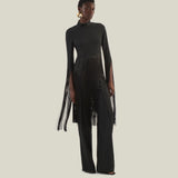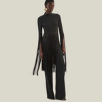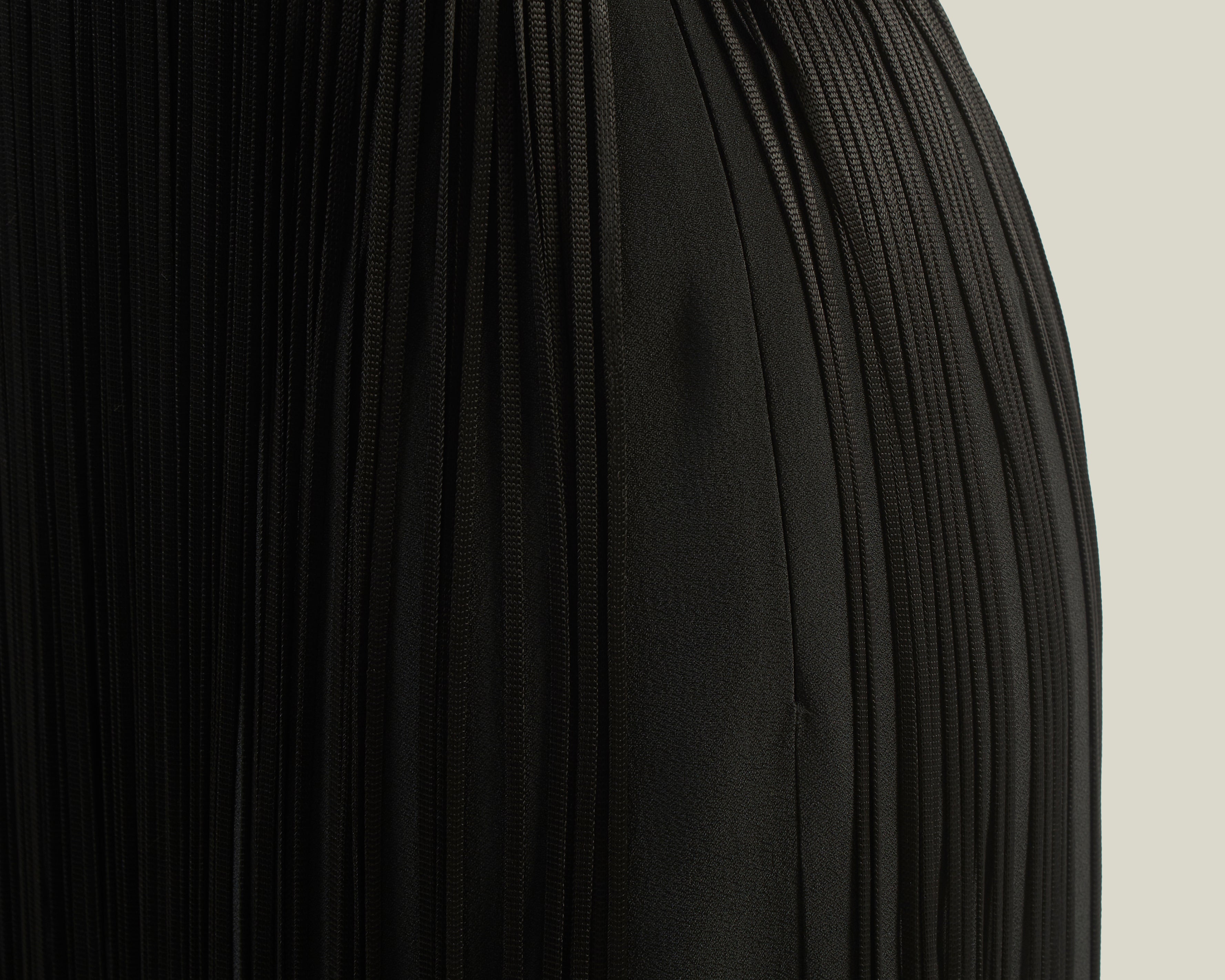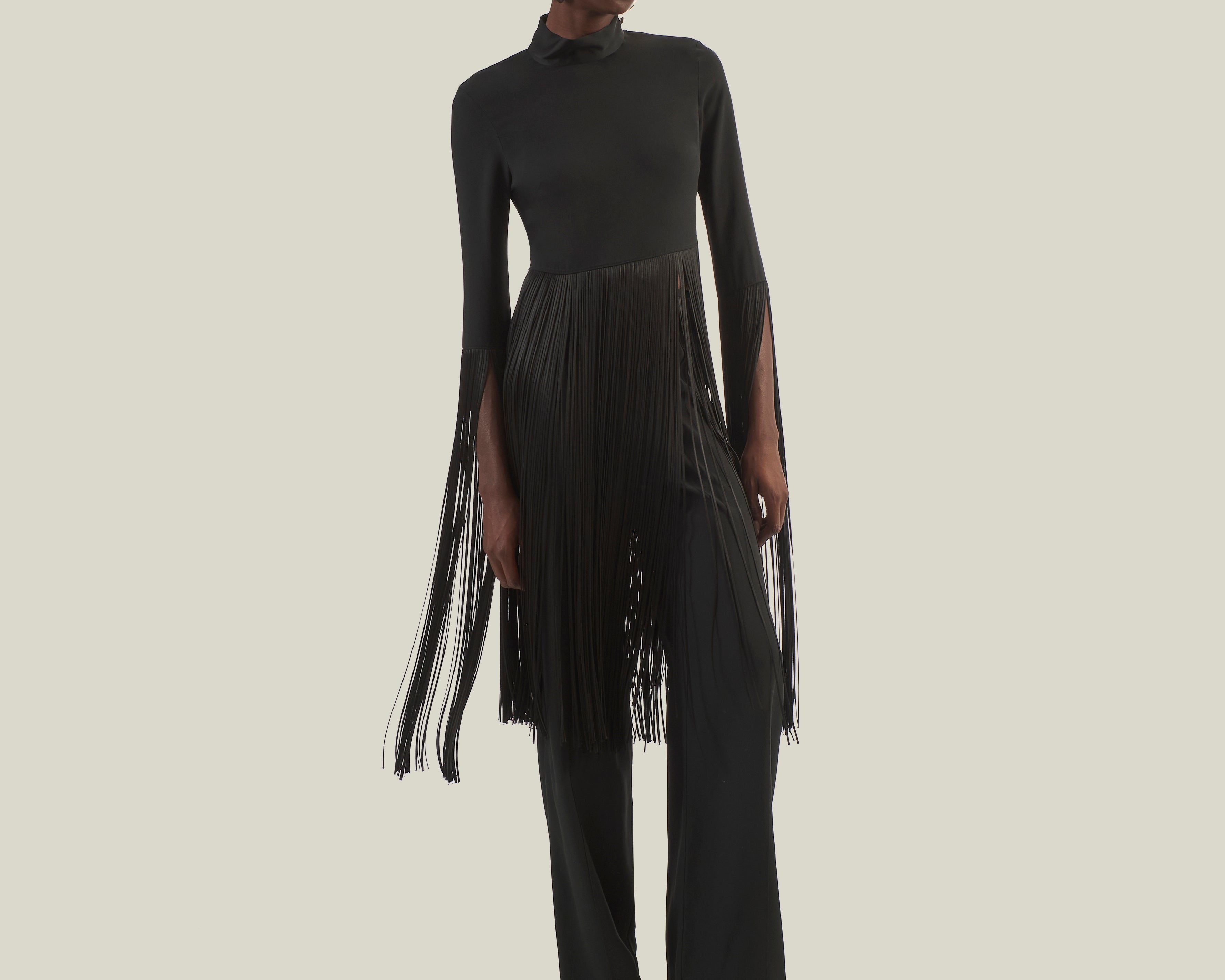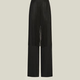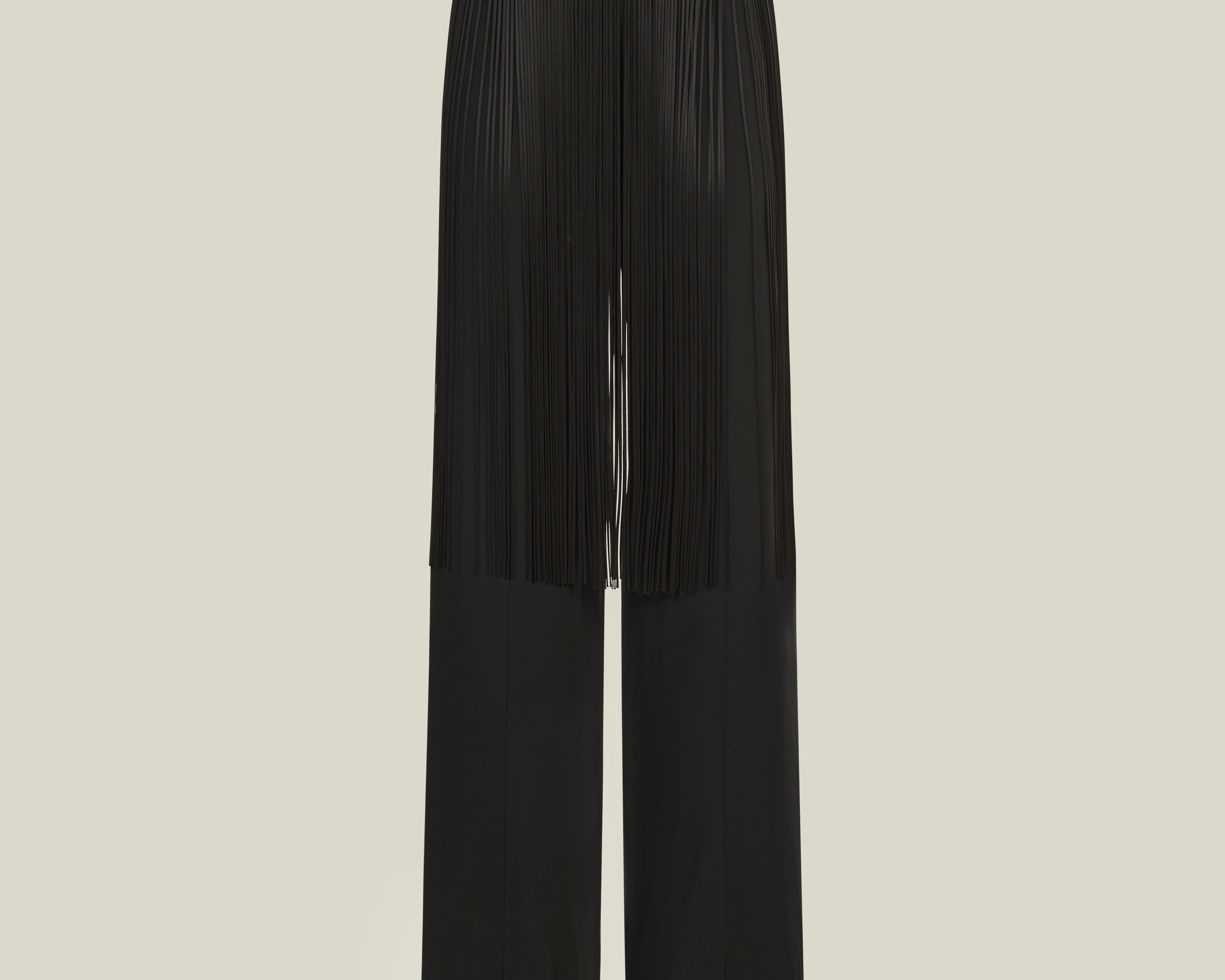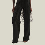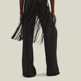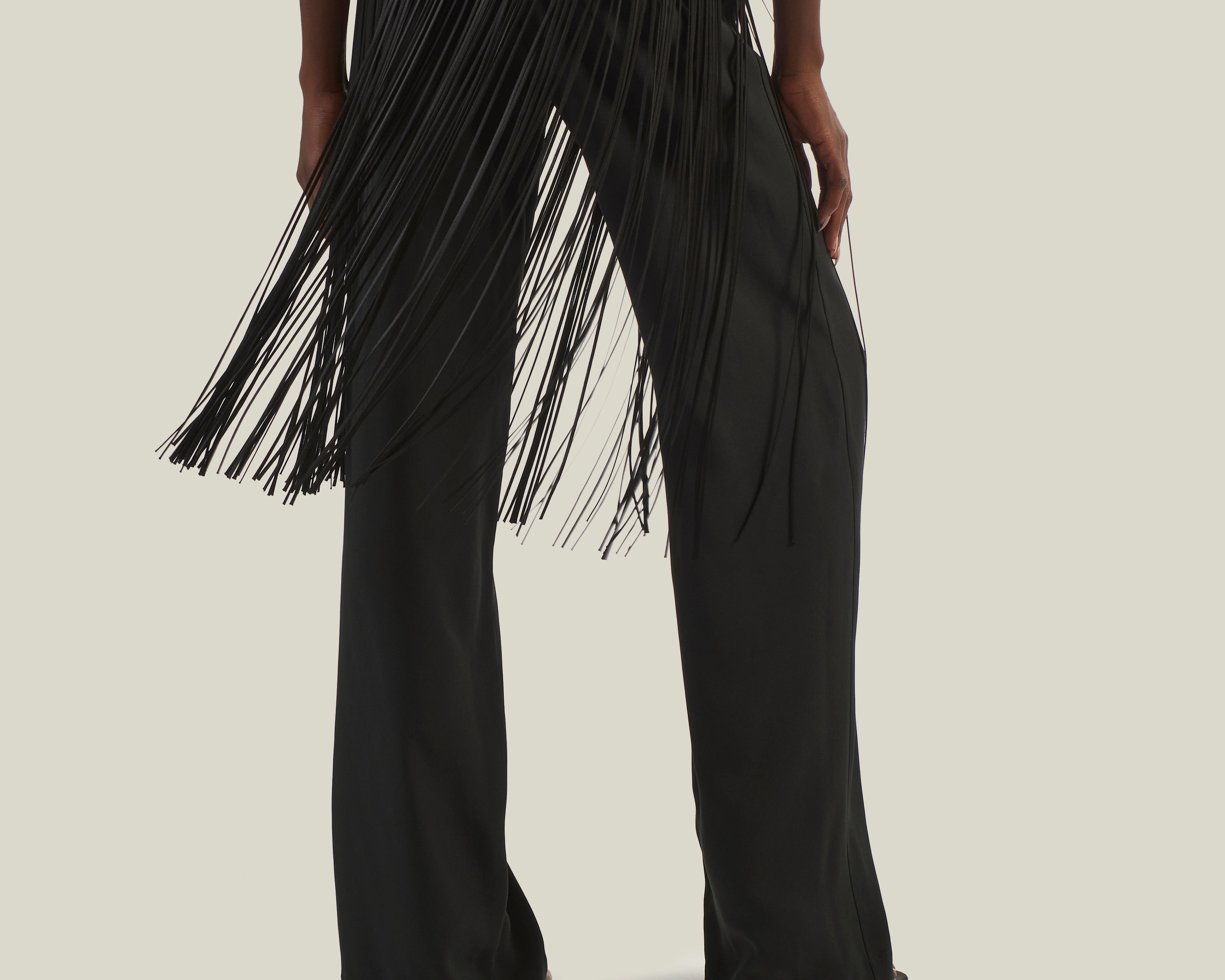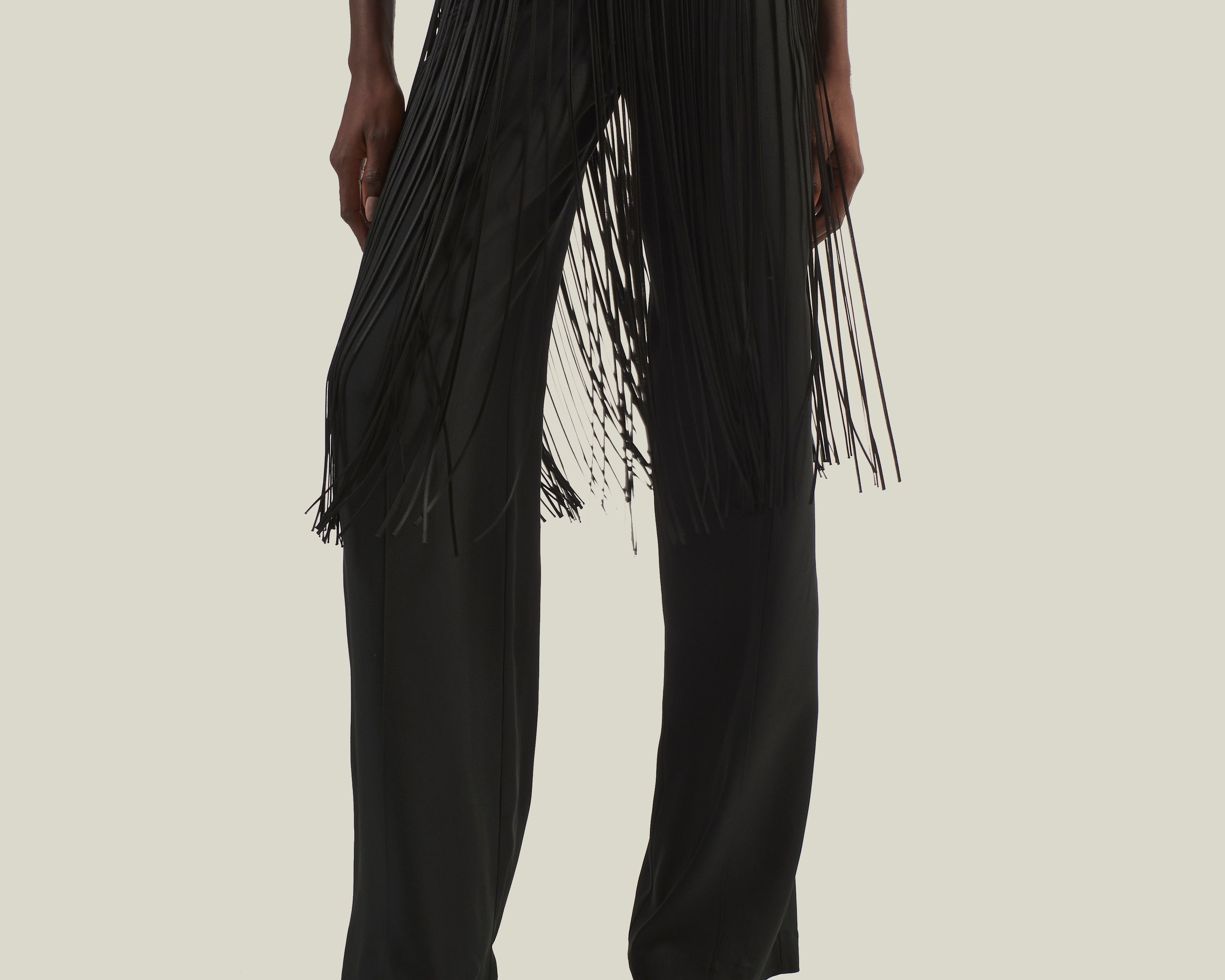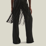 The Oregon is a pair of high-waist palazzo pants made from soft crepe cady, fully trimmed with maxi fringes on the waist. They featuring an elegant front pleat that recalls the tailoring of men's pants. The self-fabric button on the side gracefully fastens the pants. Pair them with the Mila Blouse to create a playful look, perfect for dancing all night.