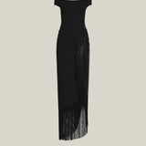 Off-shoulder swimsuit and detached hand-tied fringe-trimmed short pareo set