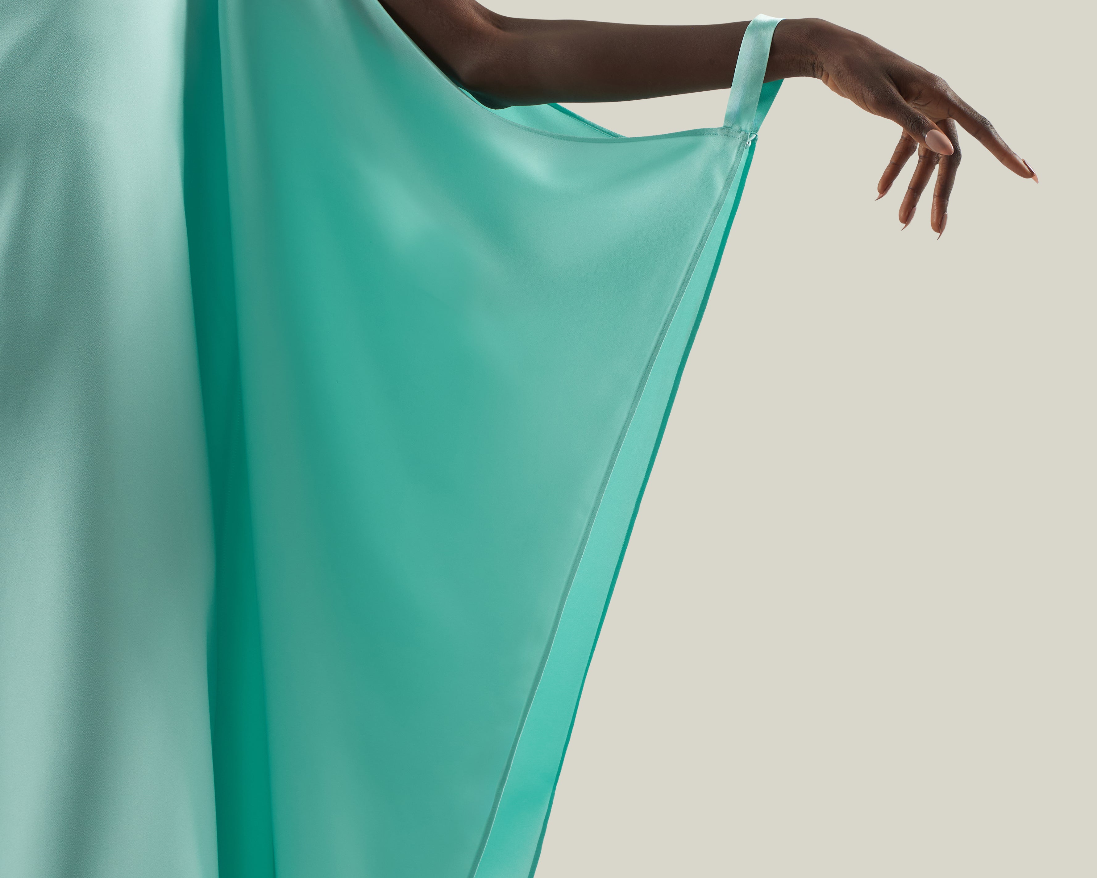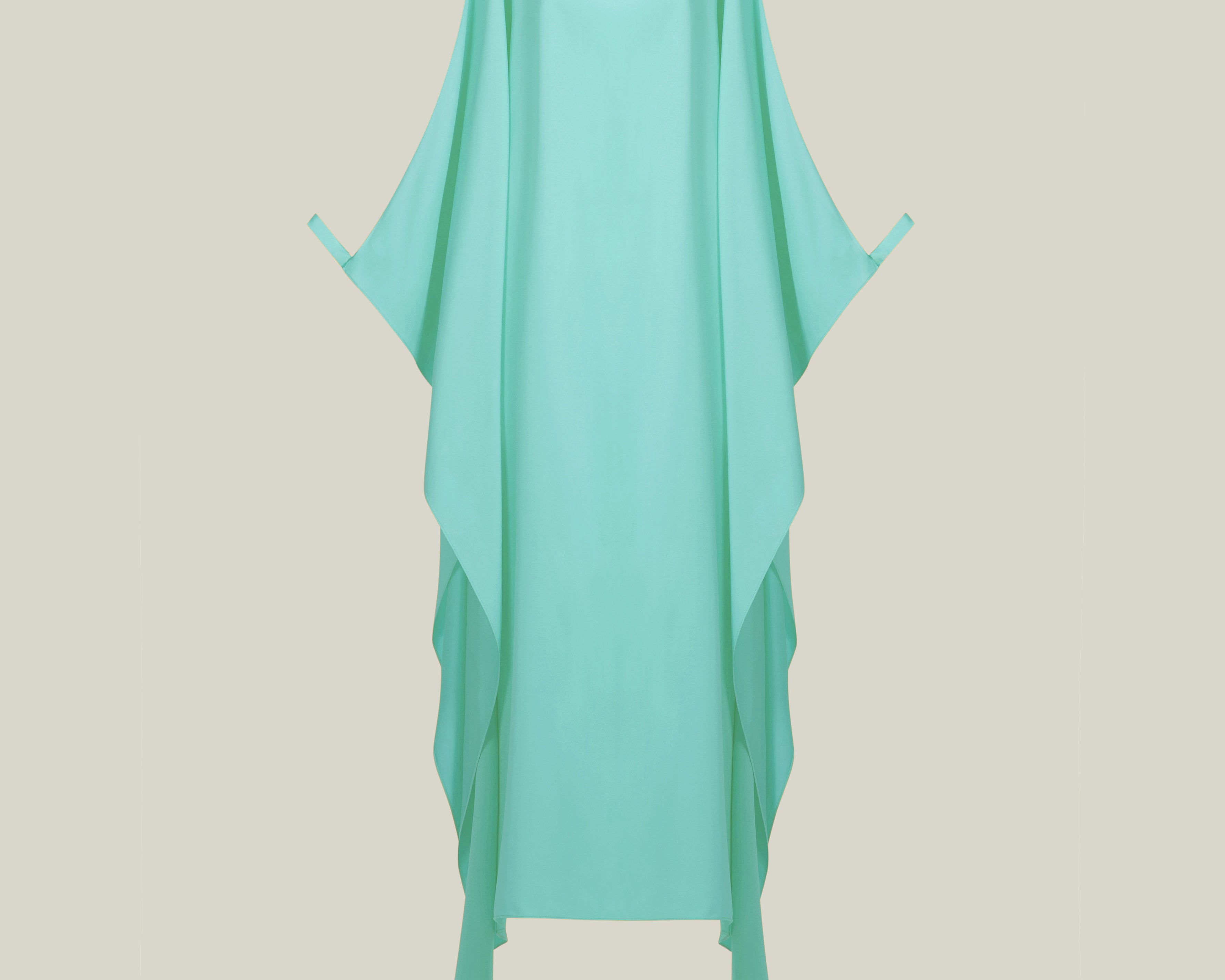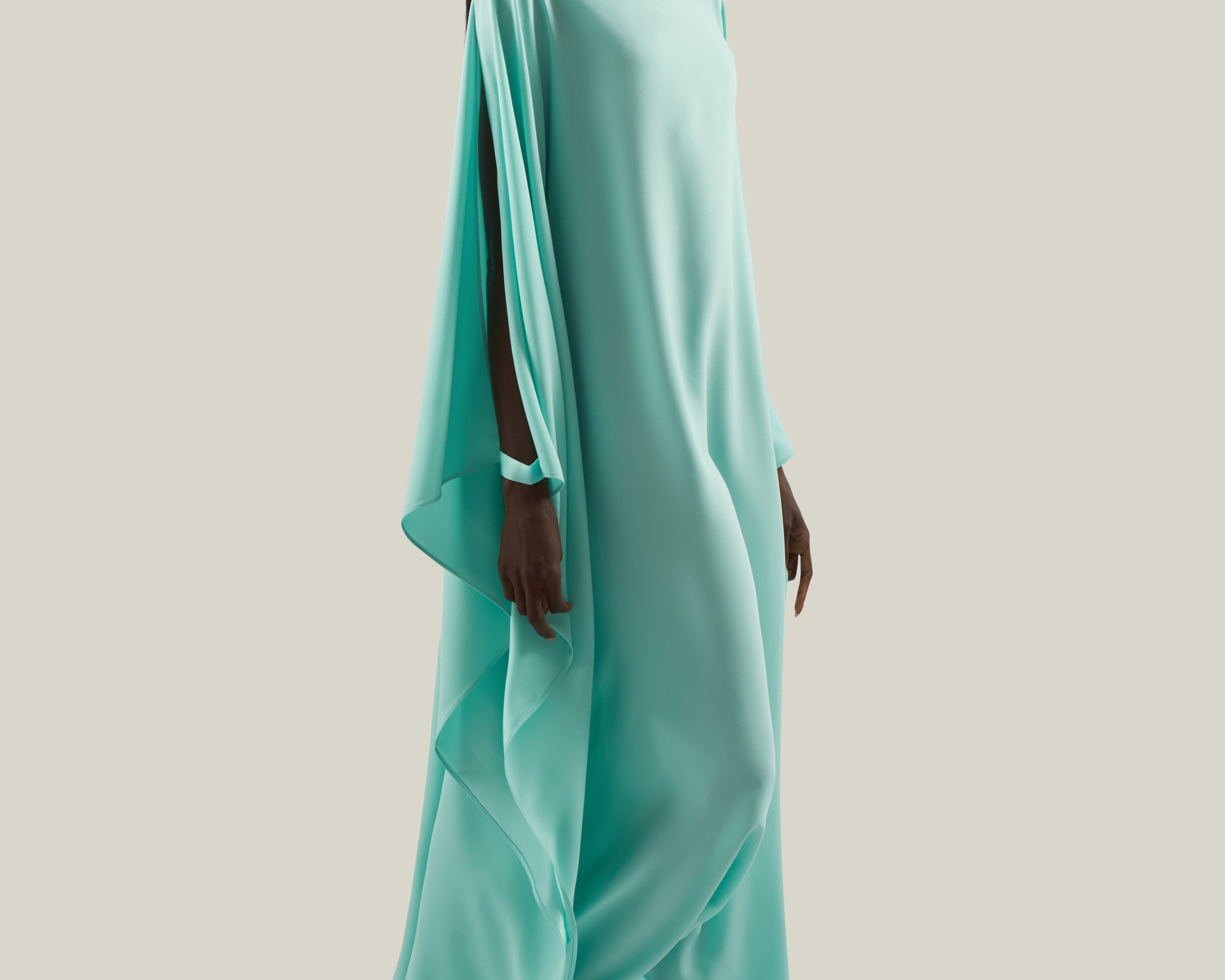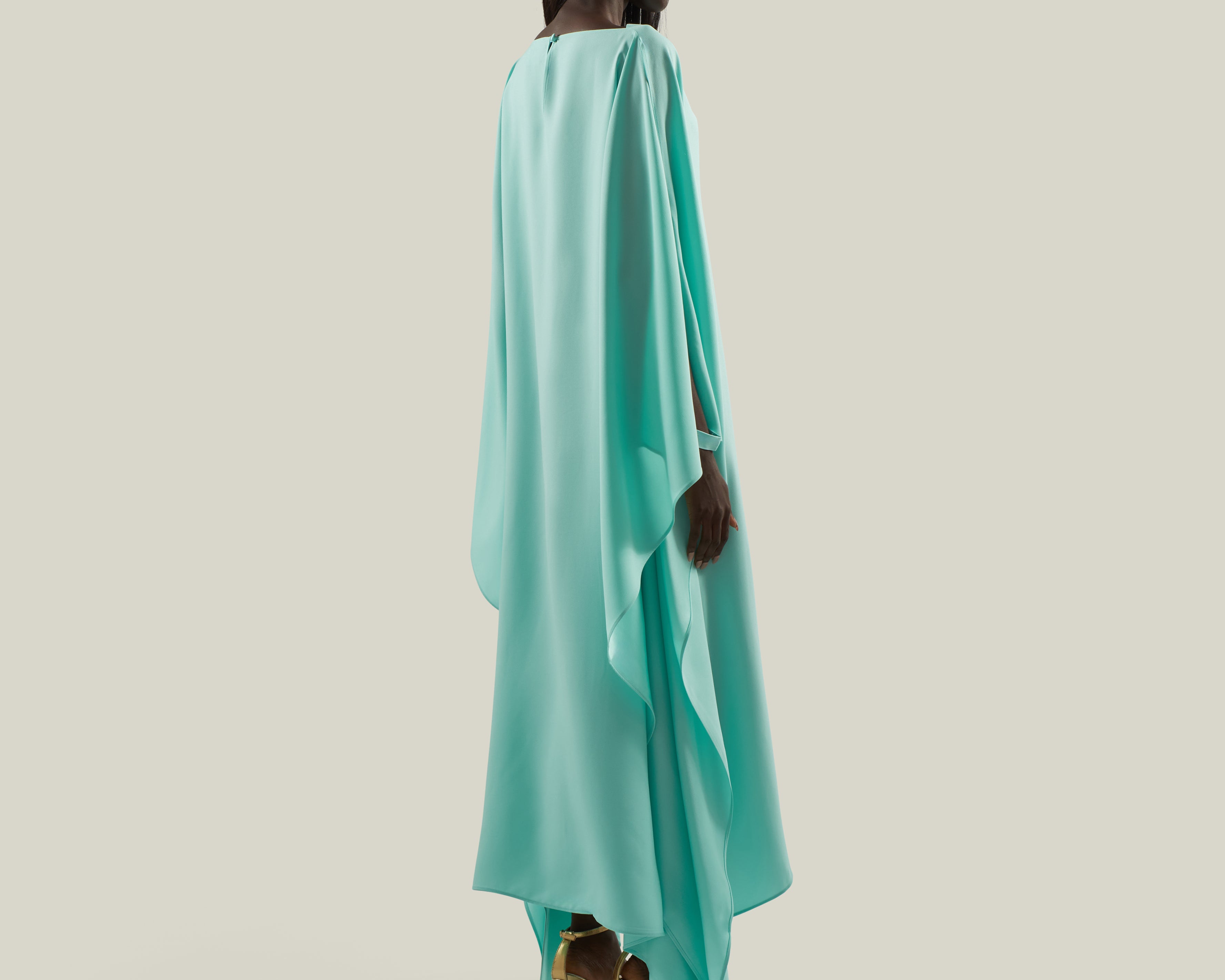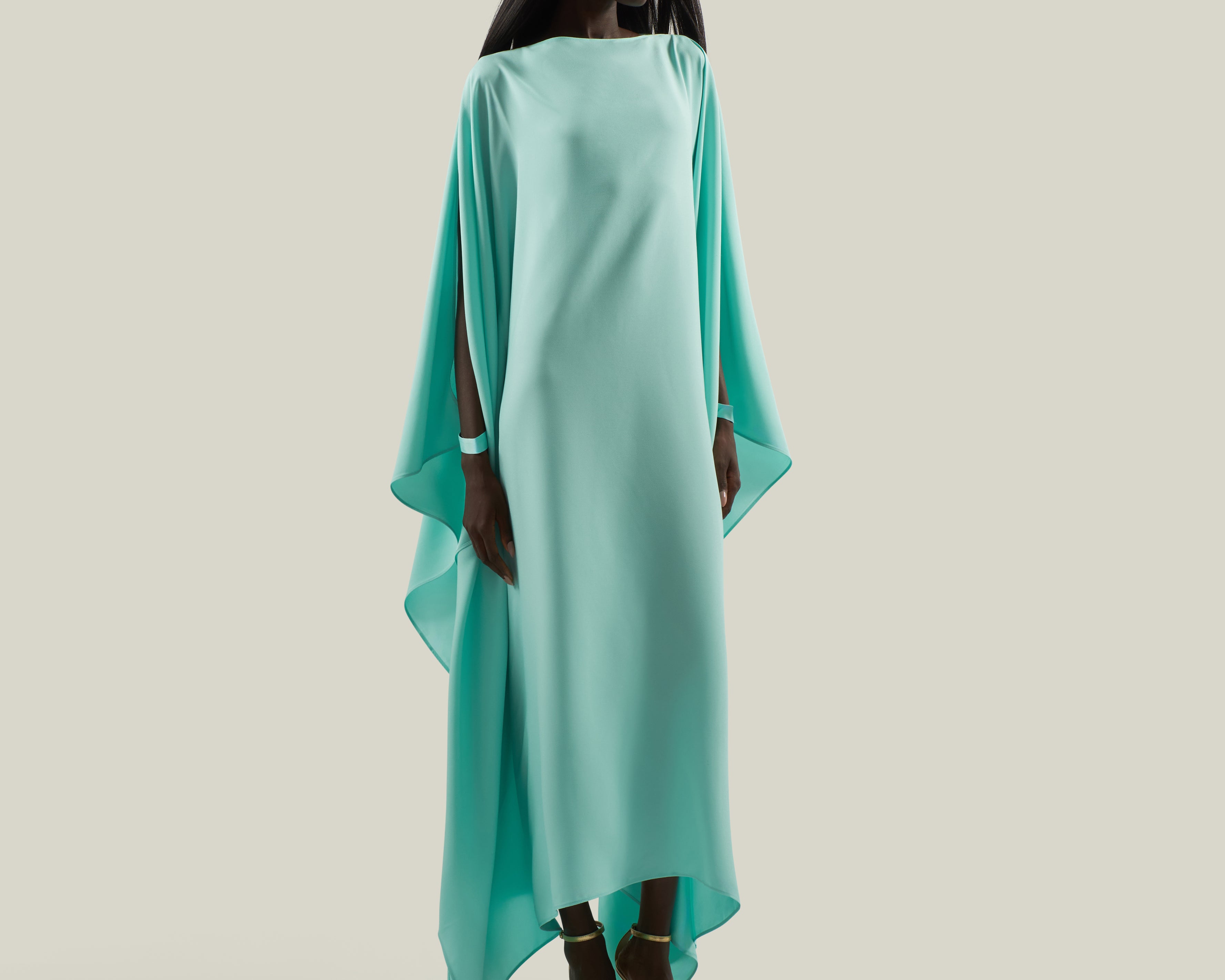 Effortless elegance meets modern minimalism. The Spectacular is a long cuffed kaftan with a flowing, oversized silhouette, crafted from soft crepe cady. Featuring a sleek bateau neckline and wide, cape-like sleeves, it reveals open arms that are elegantly fastened with tailored cuffs. This sophisticated piece combines comfort and drama, making it perfect for both day and evening occasions.