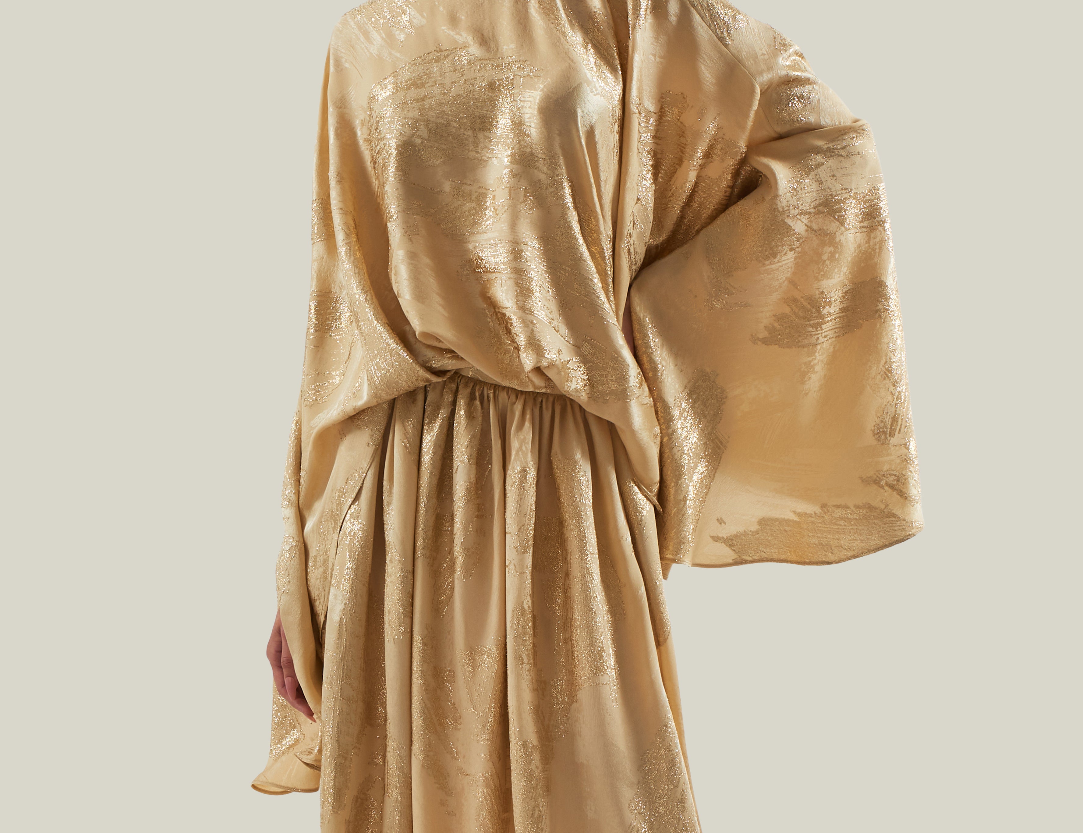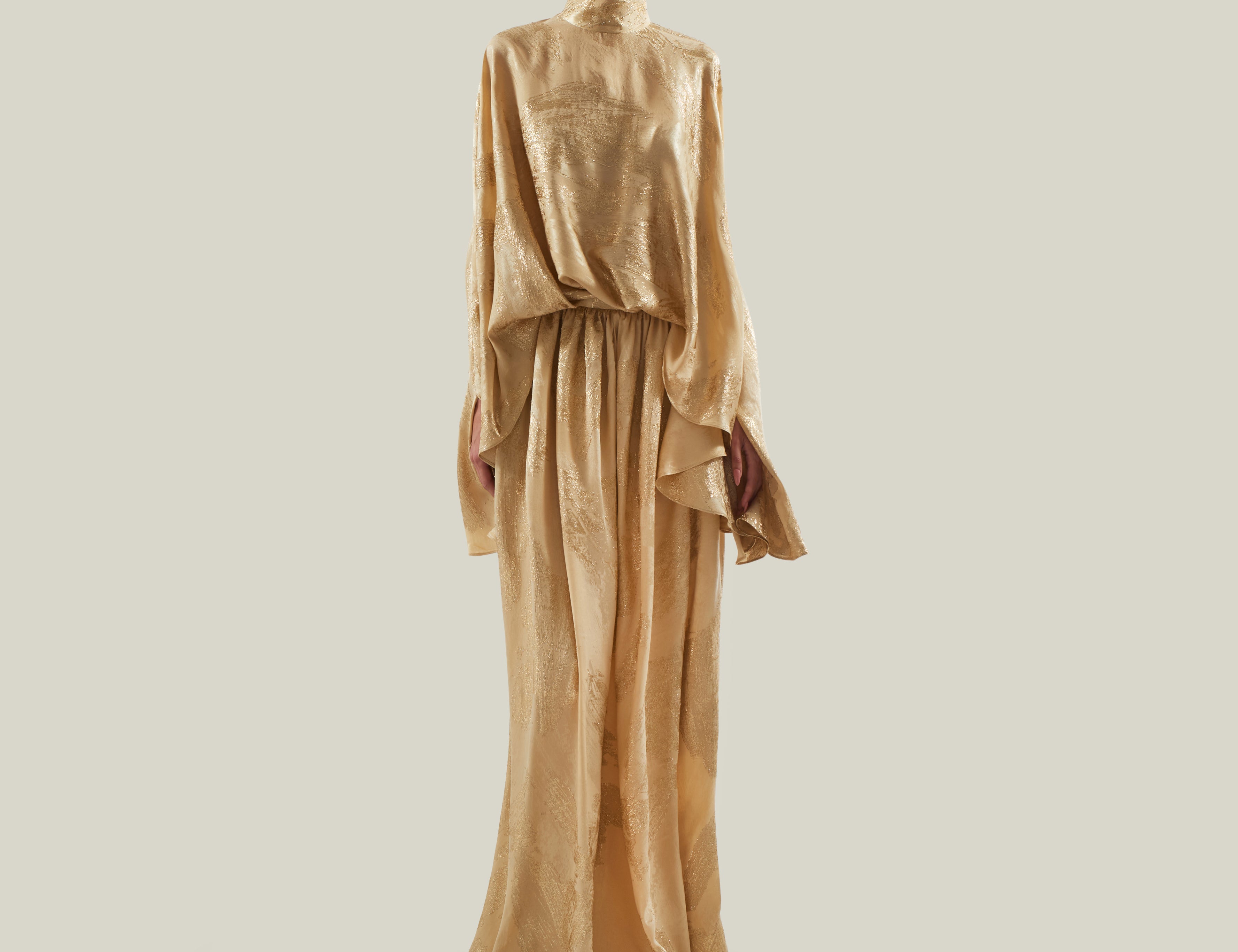 The Sphinx is a high neck kaftan designed for effortless glamour. Crafted from delicate metallic organza made in Como, Italy, it drapes elegantly over a detachable tonal slip dress made from crepe cady. Its sheer fabric makes it the perfect statement piece for sophisticated soirées.