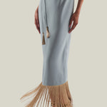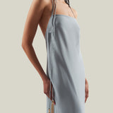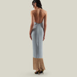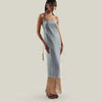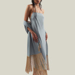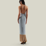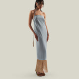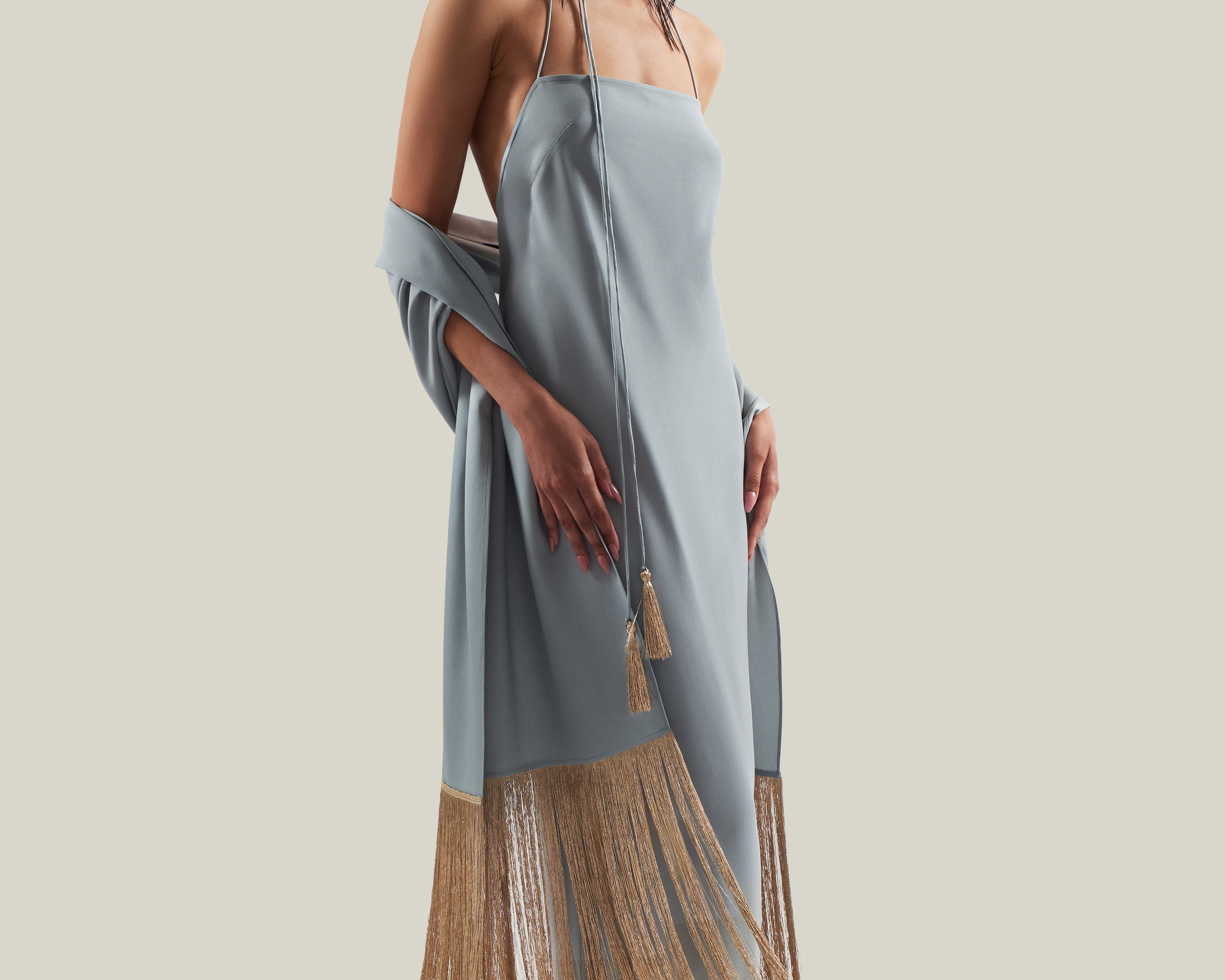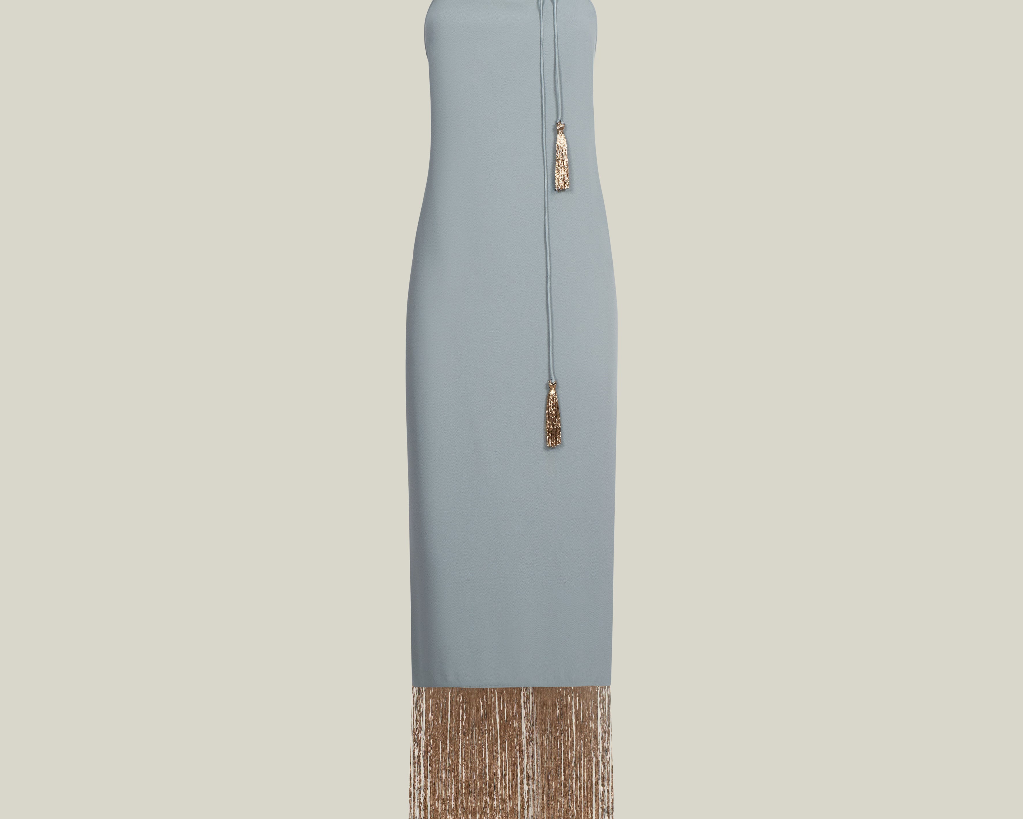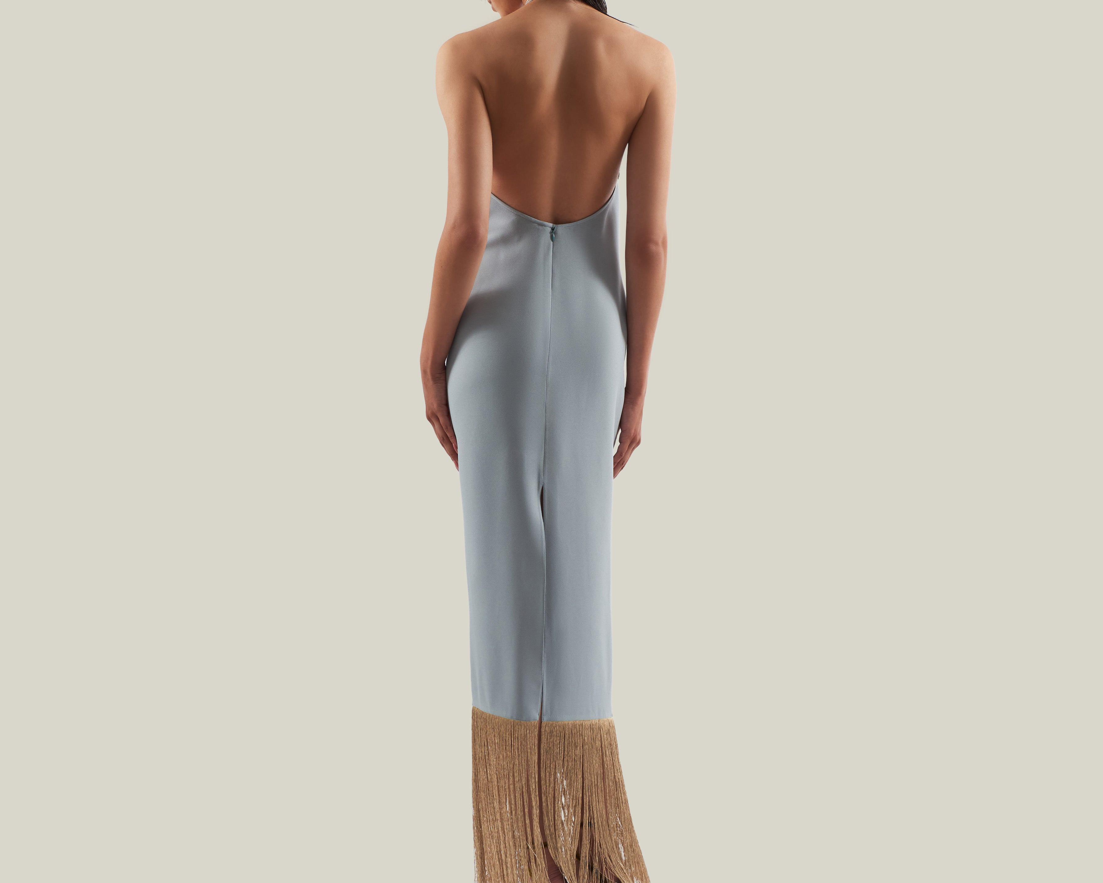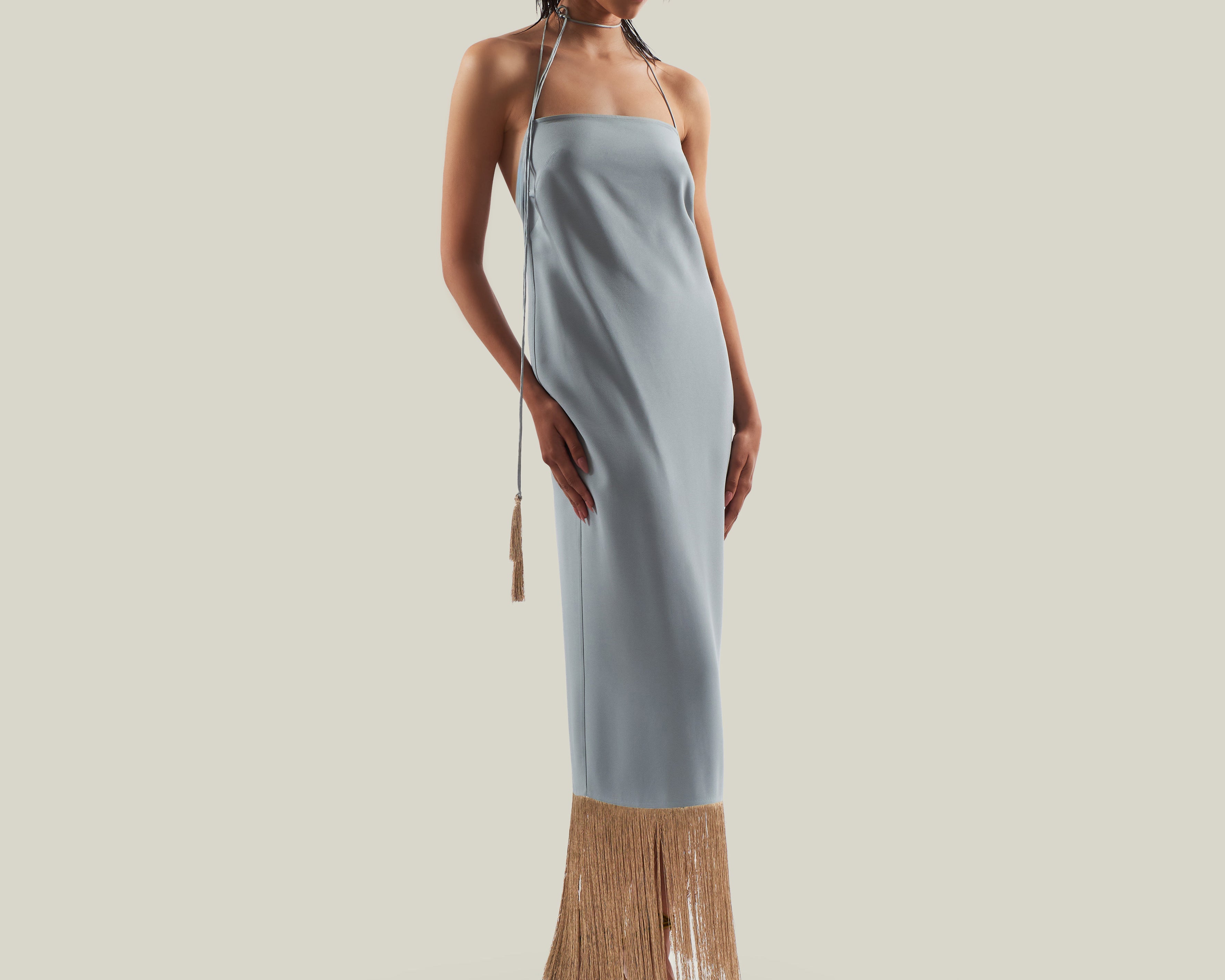 Made from fluid viscose-blend crepe cady, the Starlet is a minimalist yet striking dress defined by its clean silhouette and radiant details. The design features delicate straps that wrap elegantly around the neck, ending in tassels of metallic fringes that echo the shimmering hemline. The open back enhances its sensual appeal, while the back slit allows ease of movement. Refined and luminous, it is a contemporary interpretation of evening glamour.