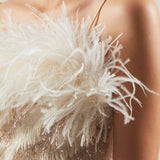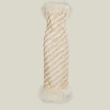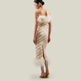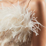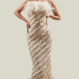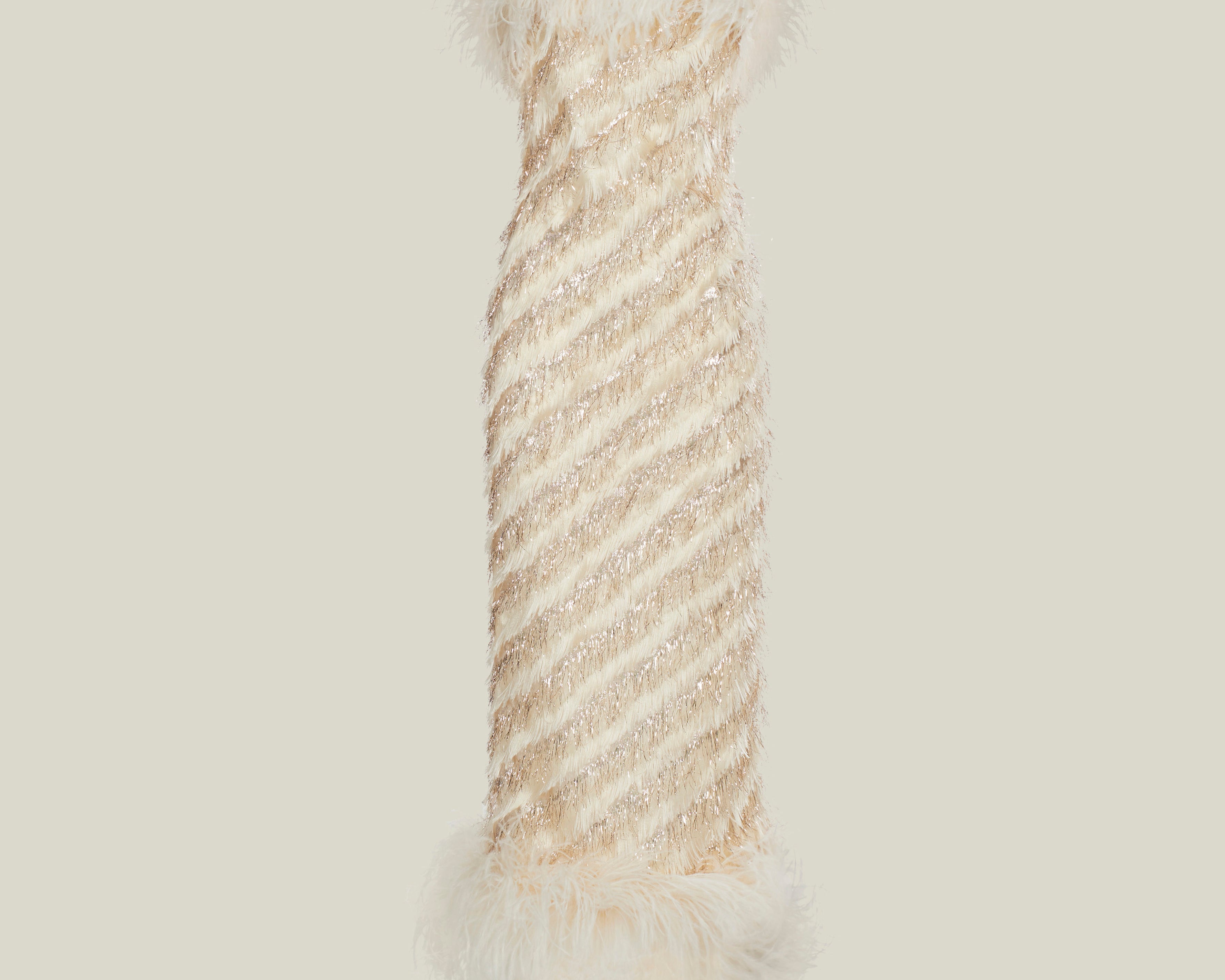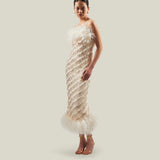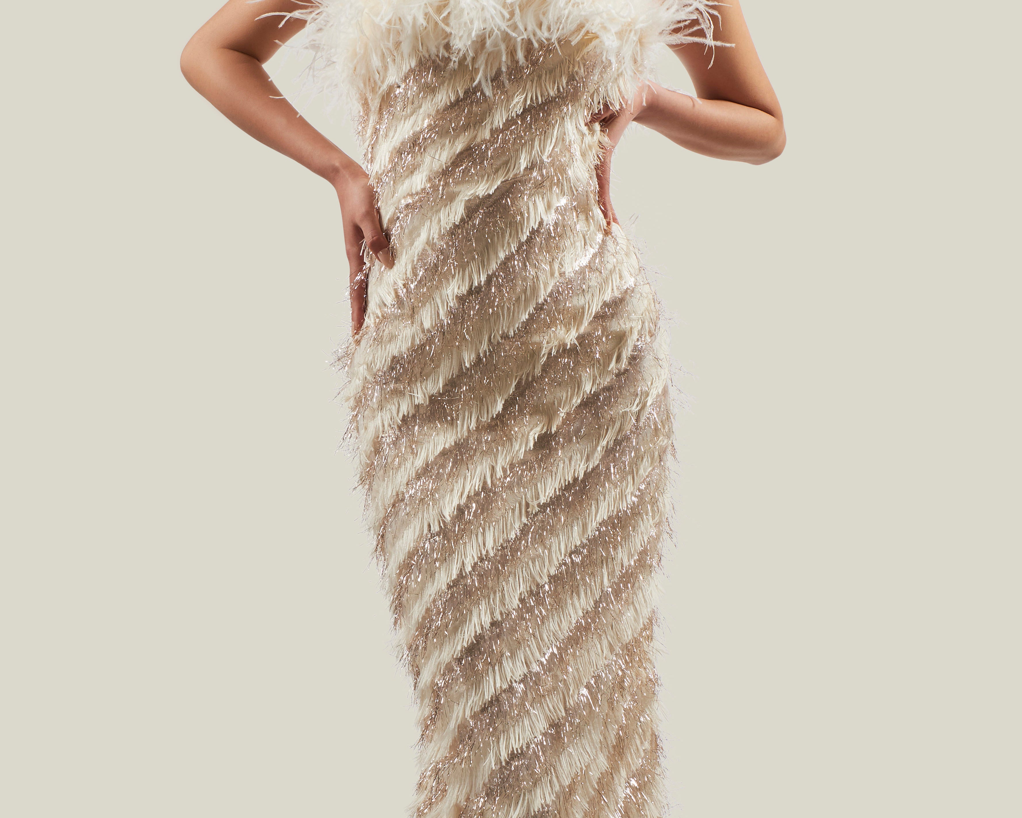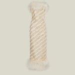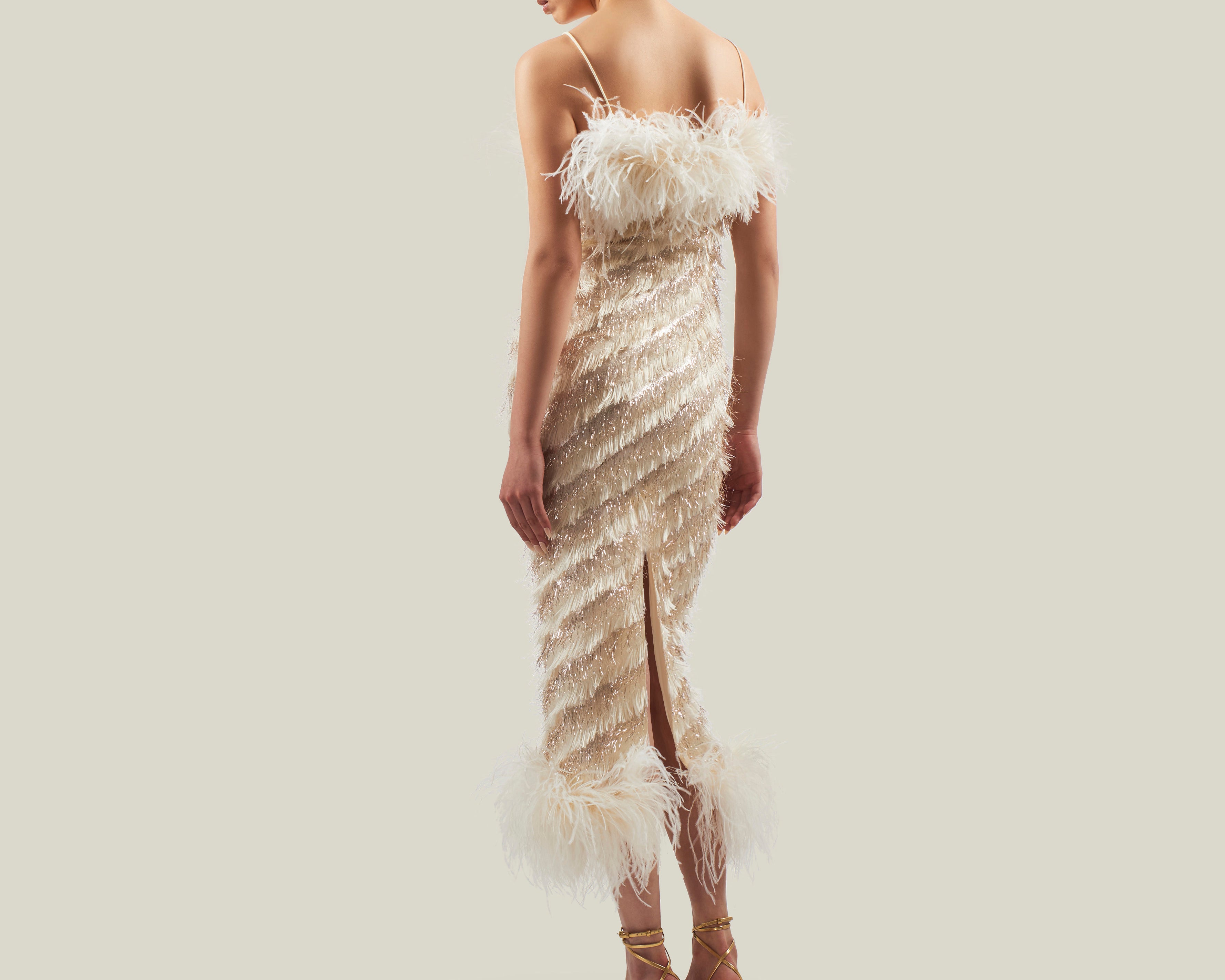 The Sunset Boulevard is a sleek midi slip dress crafted in lustrous fringed lurex fil coupé from Como, Italy. Featuring fine straps and a slim-fitting silhouette, it is fully trimmed with feathers along both the upper and lower hems, adding movement and refined glamour. A contemporary piece that combines shine, texture, and delicate sophistication.