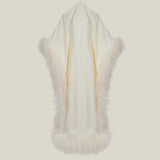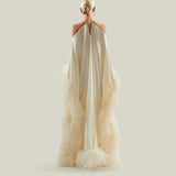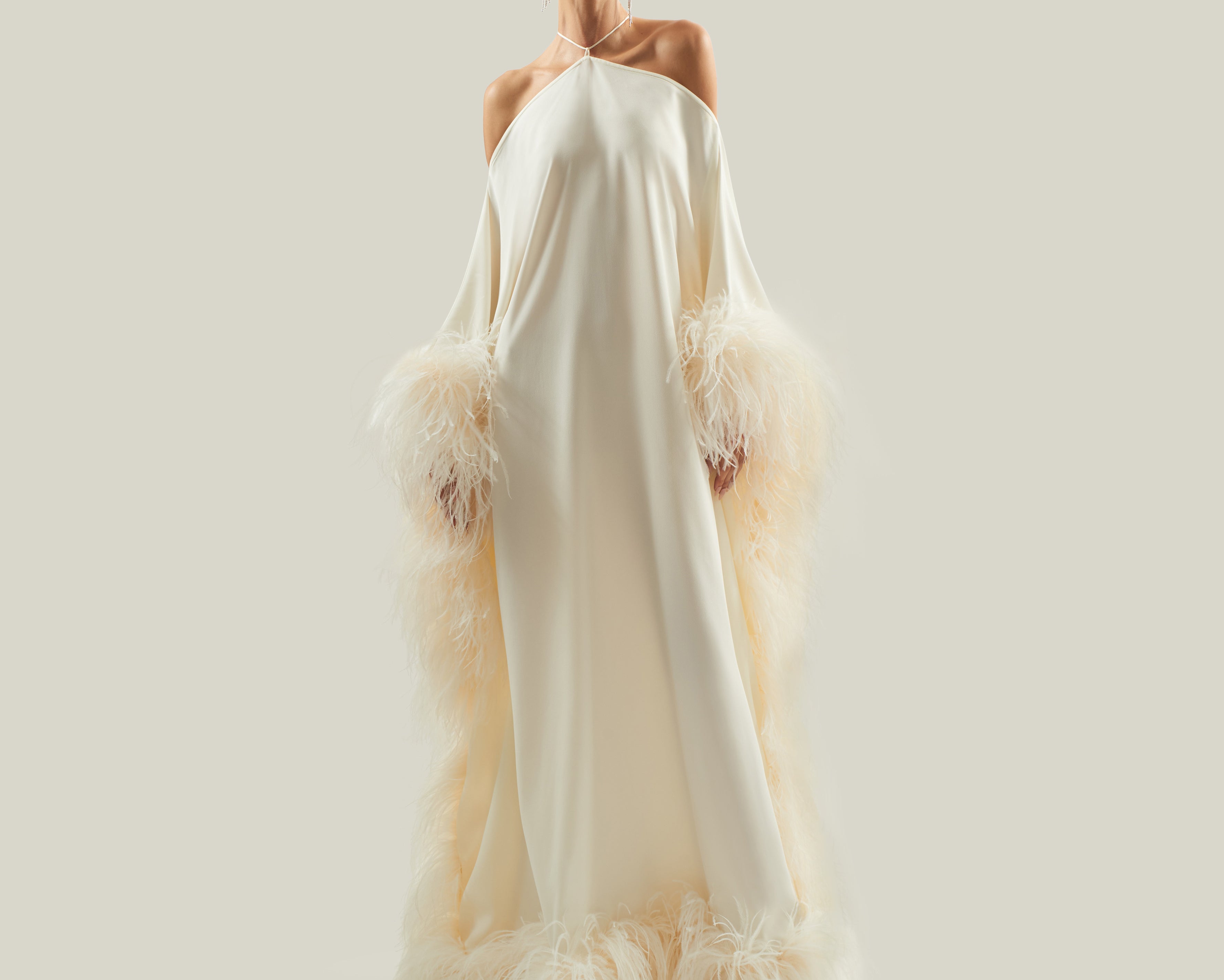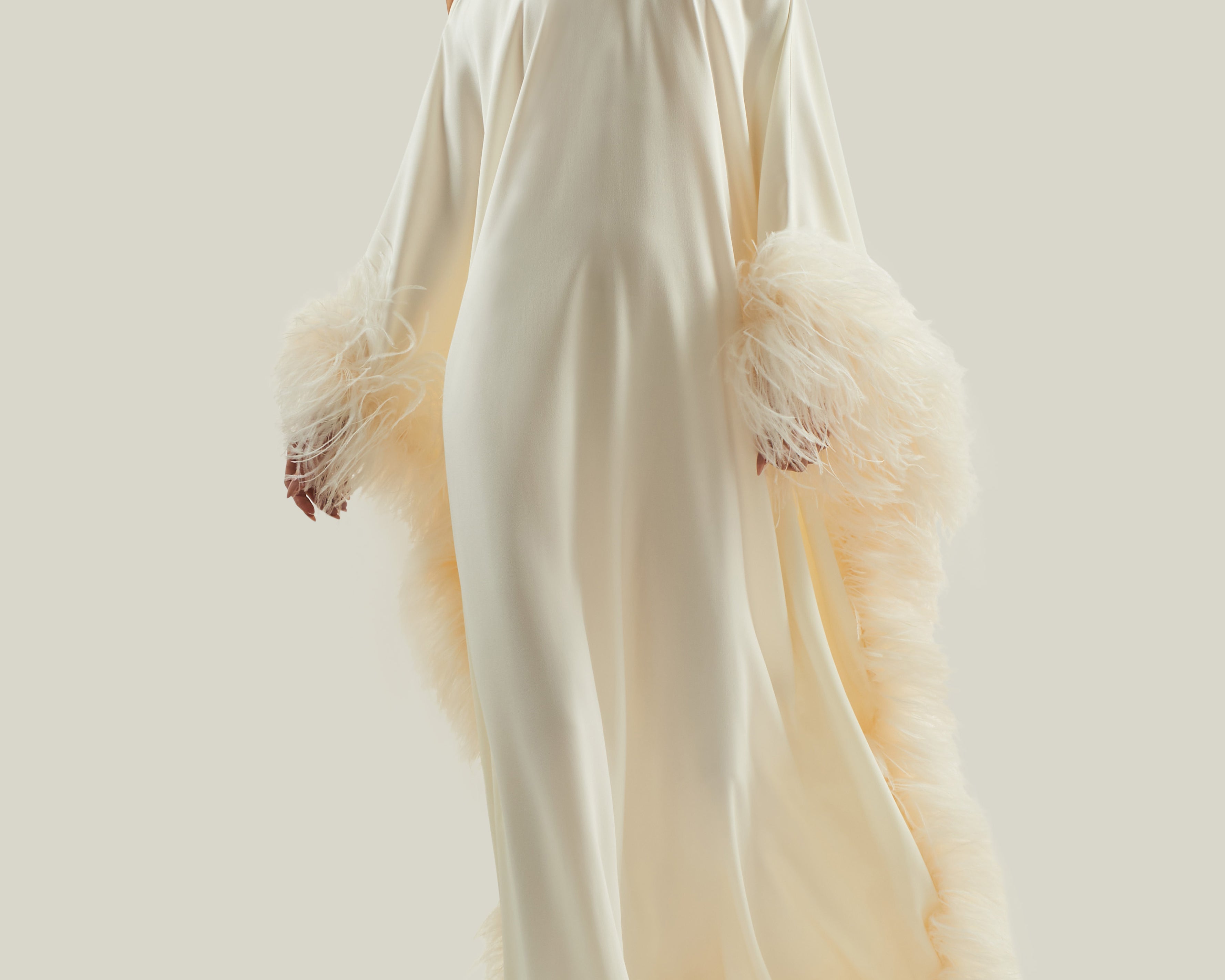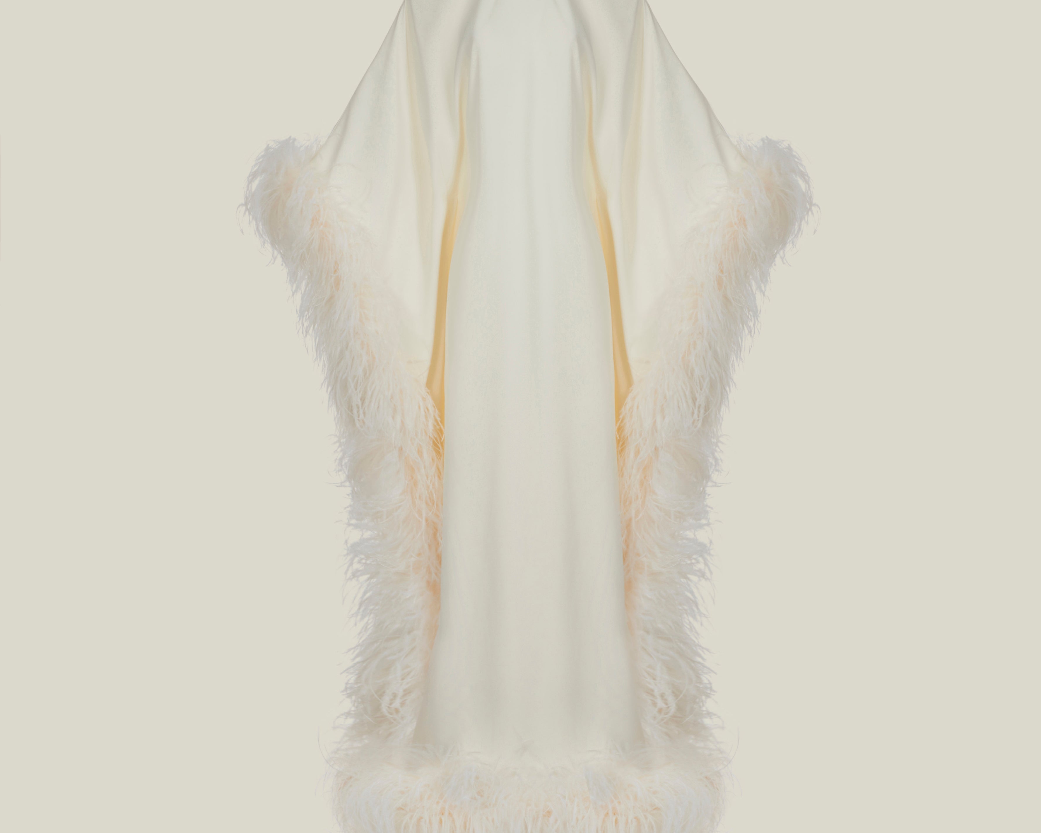 A celebration of glamour and grace, wrapped in refined opulence. The Sza Sza Extravaganza Kaftan is crafted from soft viscose-blend crepe cady, featuring a graceful halter neckline that leaves the shoulders beautifully bare. Fully trimmed with eight meters of delicate ostrich feathers, it moves with ethereal lightness, capturing the essence of sophistication and glamour.