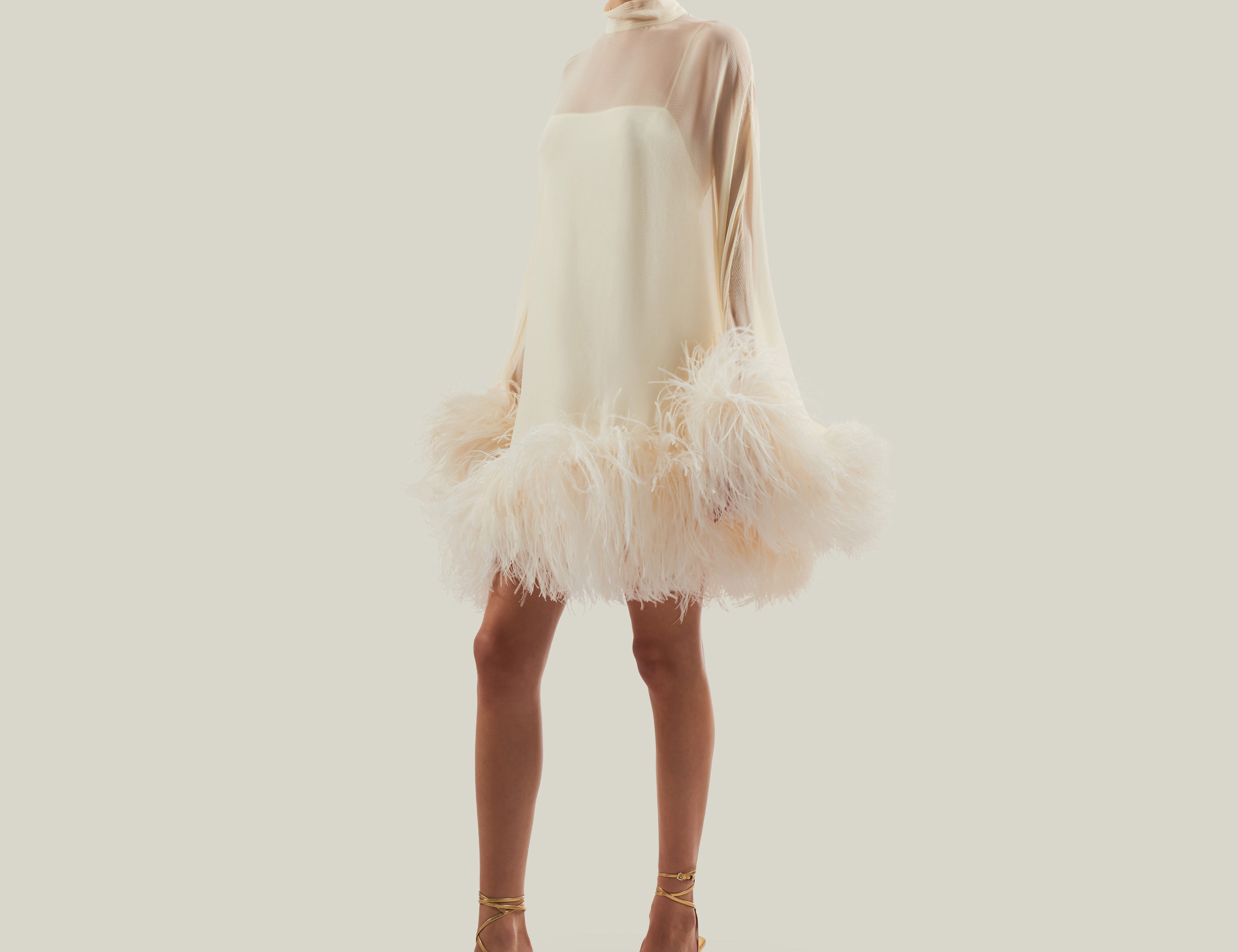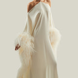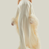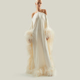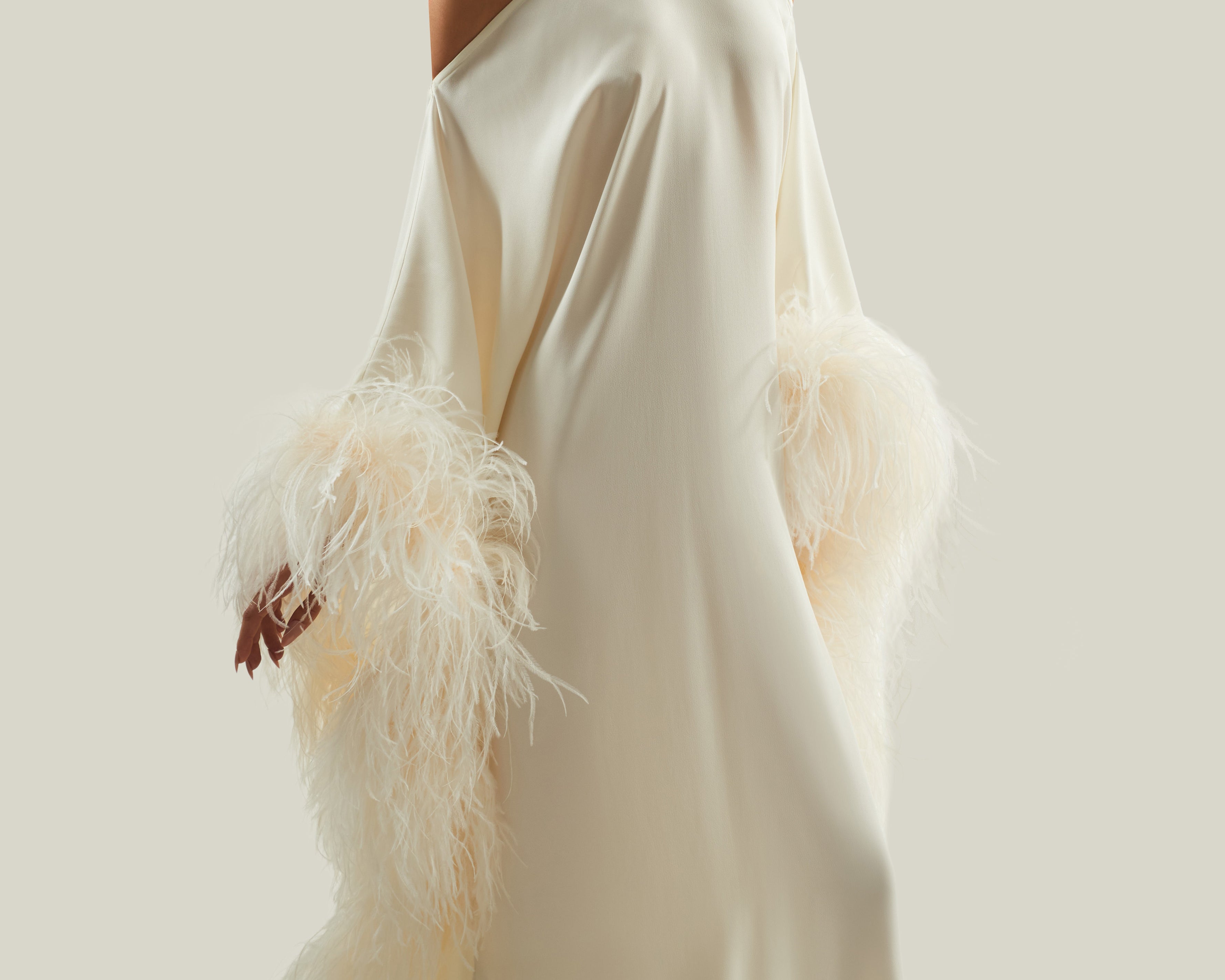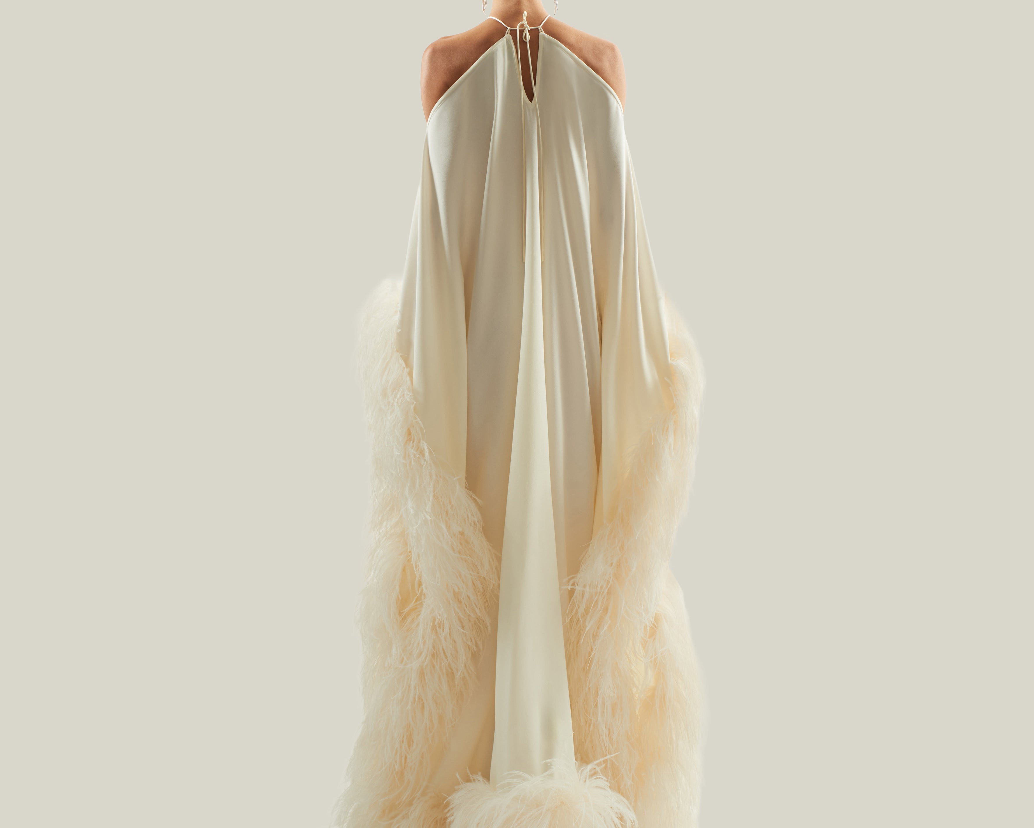 A celebration of glamour and grace, wrapped in refined opulence. The Sza Sza Extravaganza Kaftan is crafted from soft viscose-blend crepe cady, featuring a graceful halter neckline that leaves the shoulders beautifully bare. Fully trimmed with eight meters of delicate ostrich feathers, it moves with ethereal lightness, capturing the essence of sophistication and glamour.
