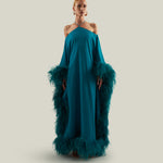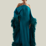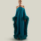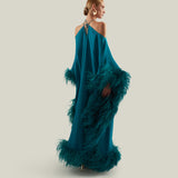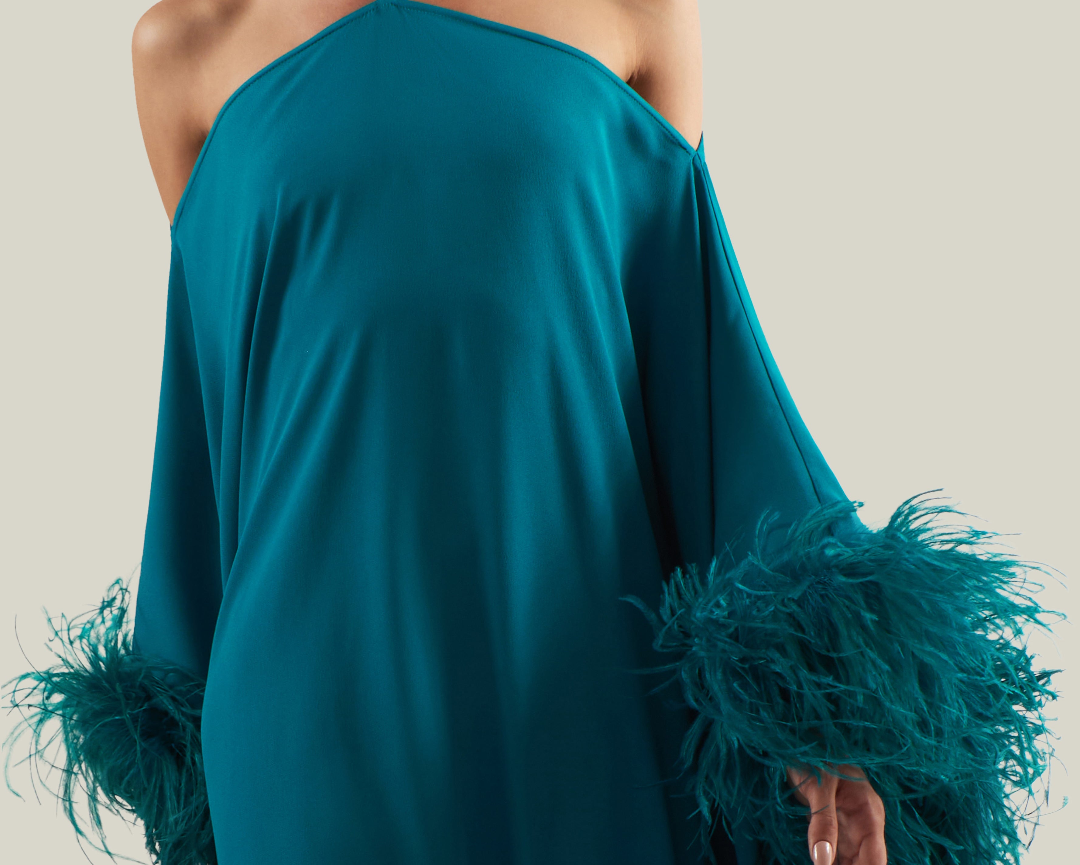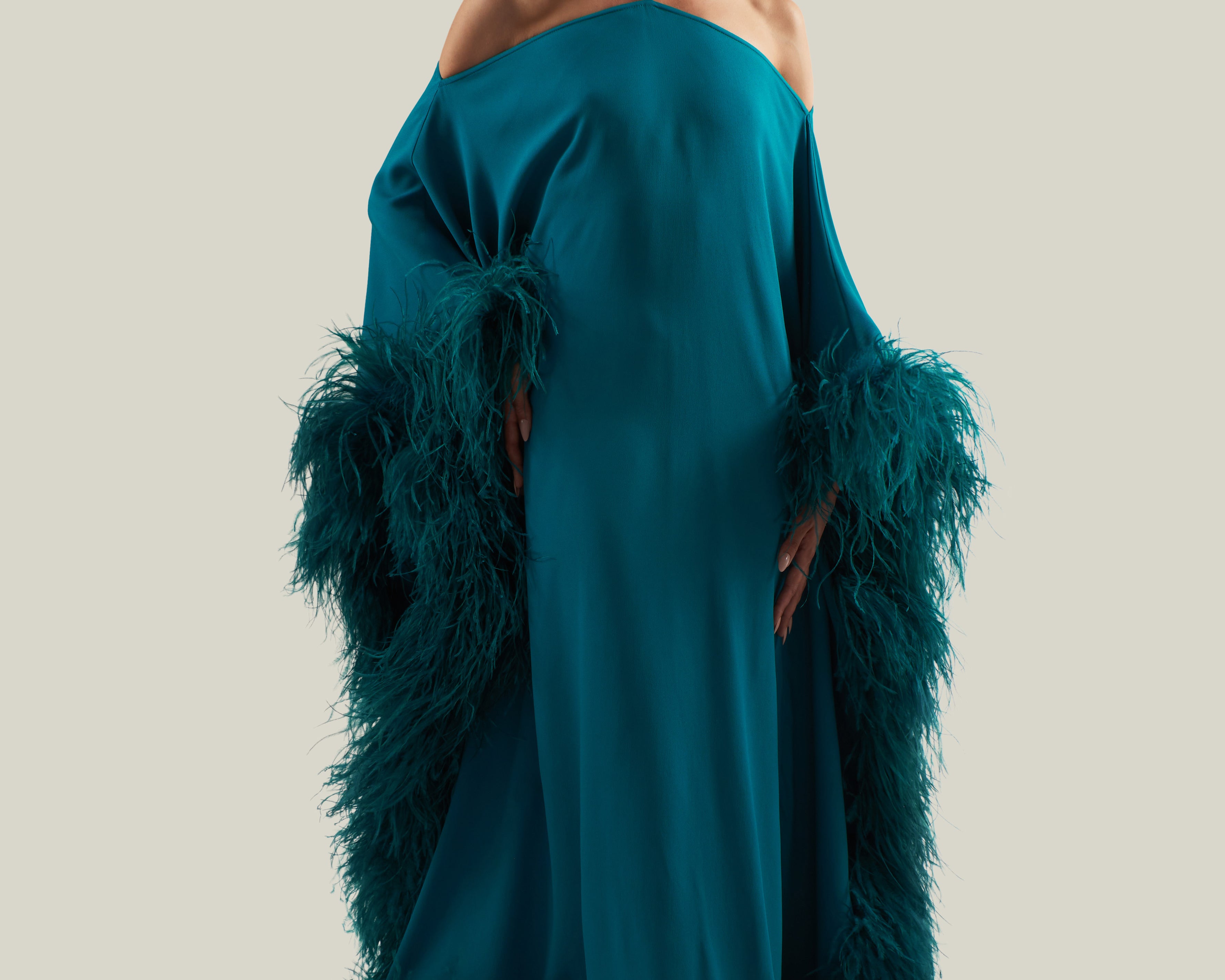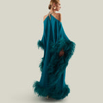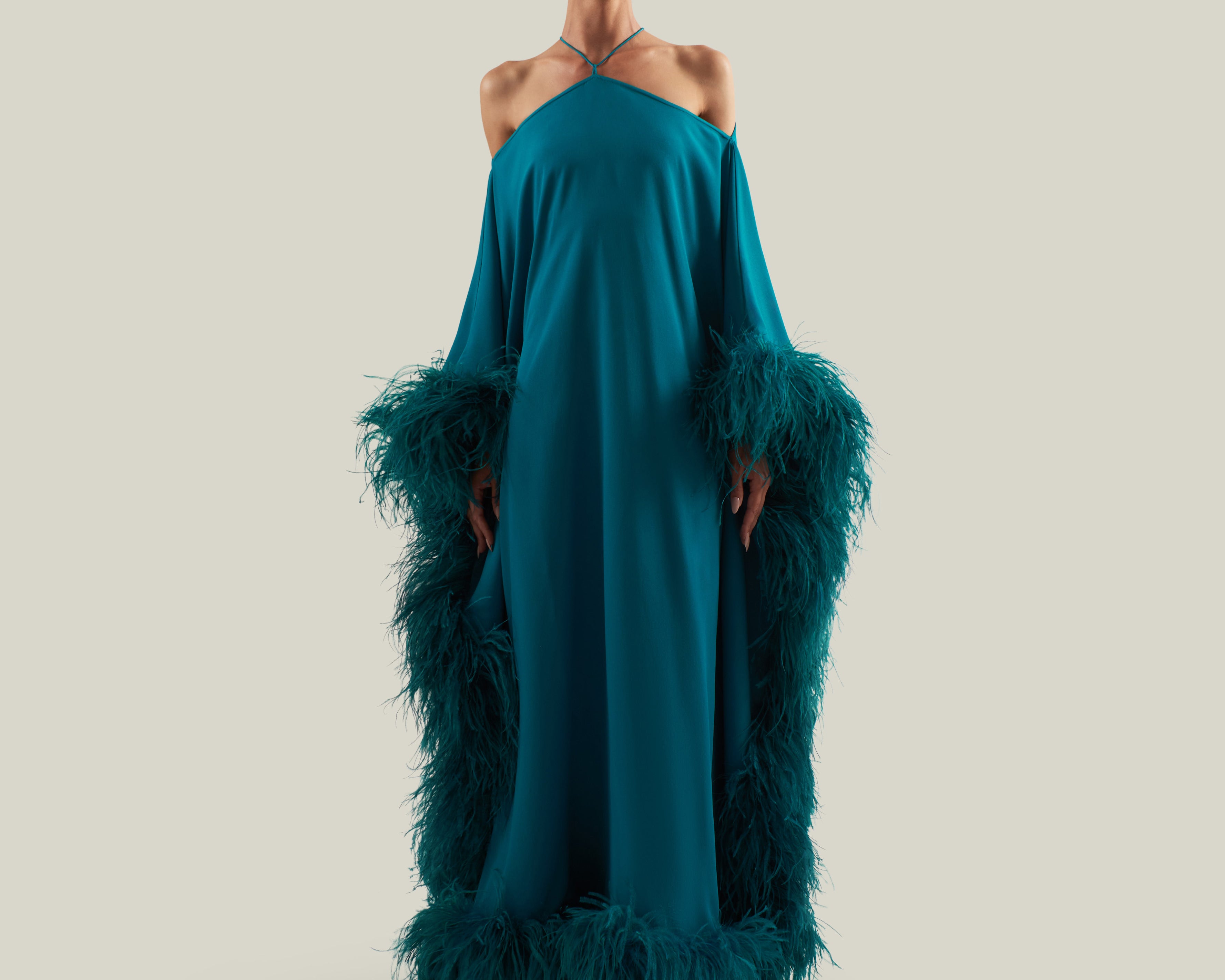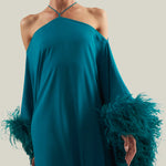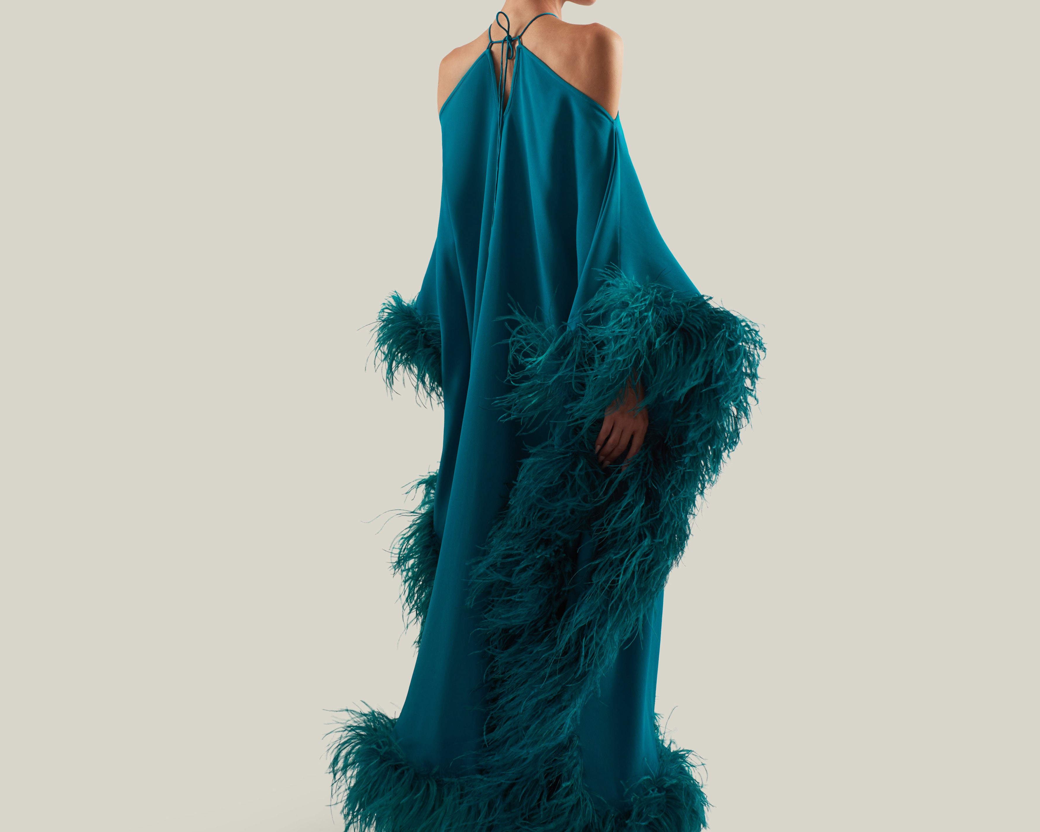 Made to be remembered. The Sza Sza Extravaganza is a halter-neck kaftan made of viscose-blend crepe cady, fully trimmed with almost 8 meters of airy ostrich feathers. This lightweight piece is finished with a choker-style necklace adorned with soft tassels.
