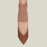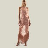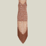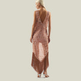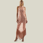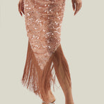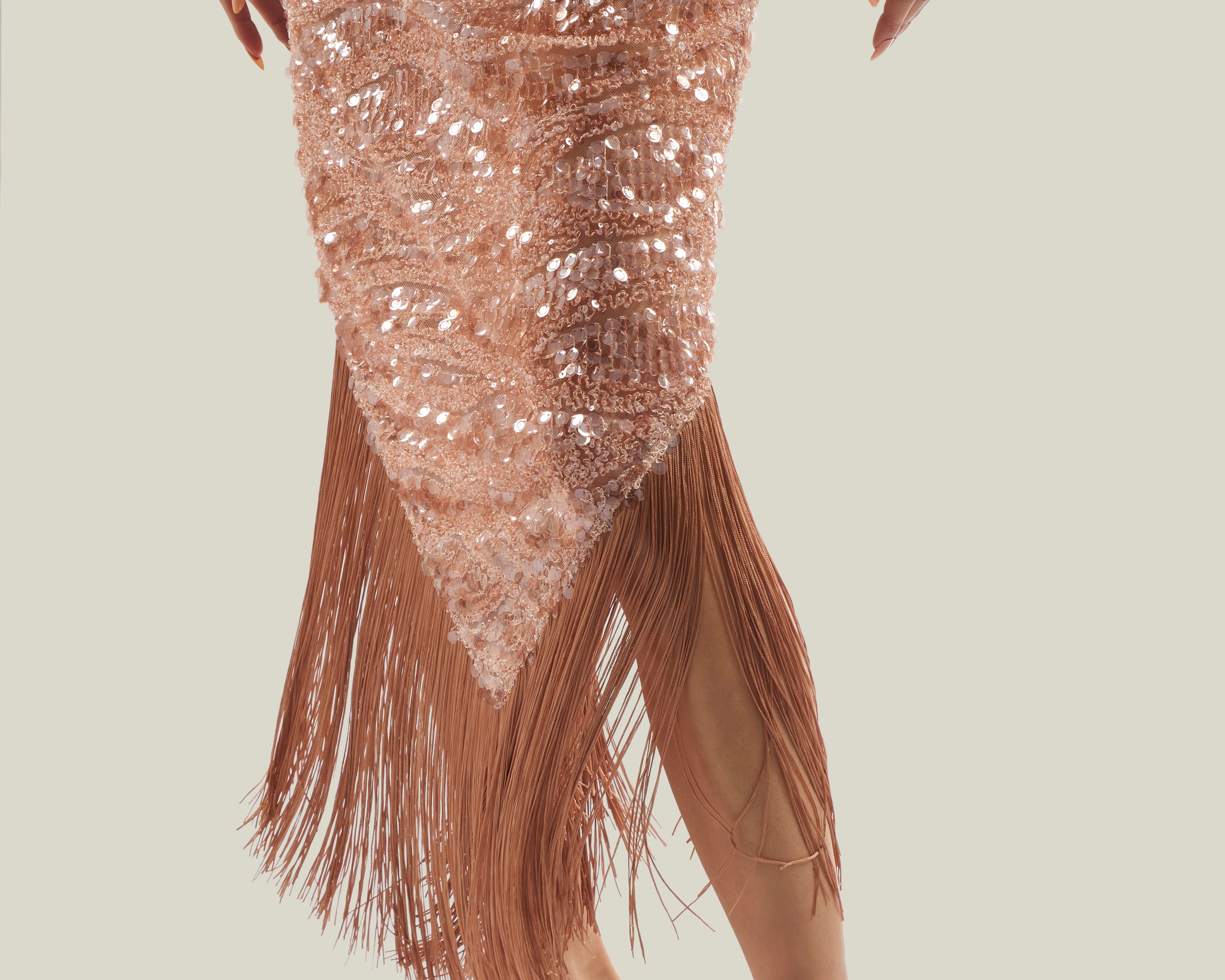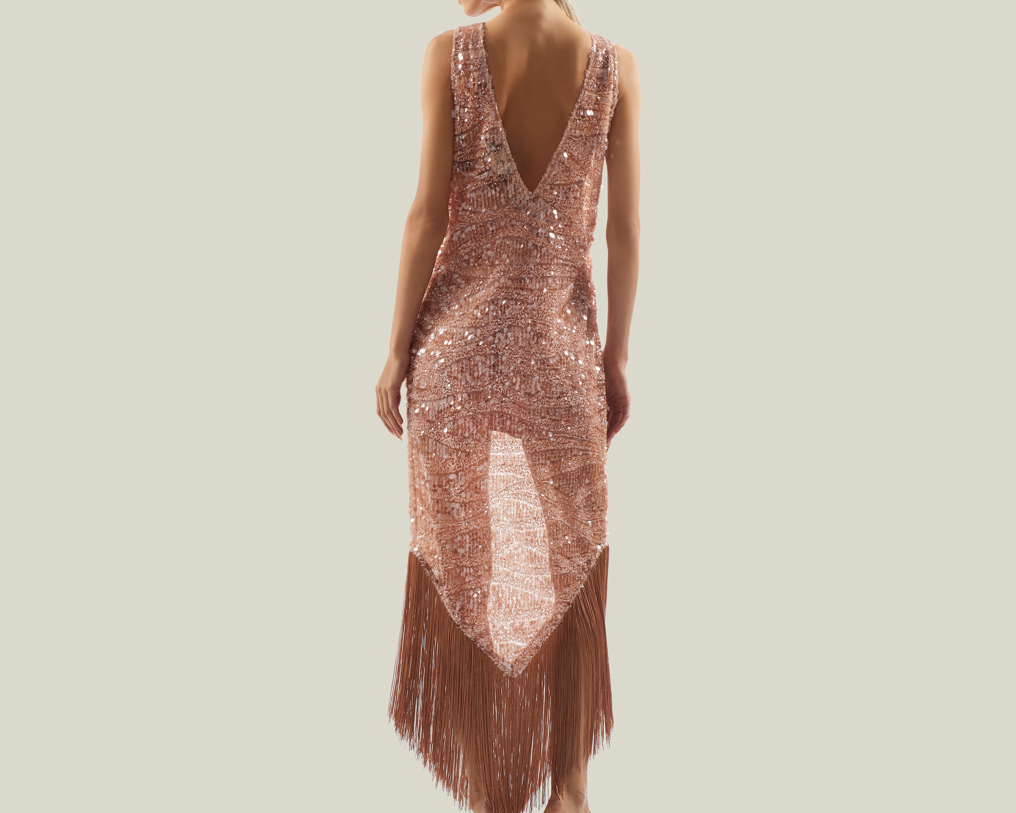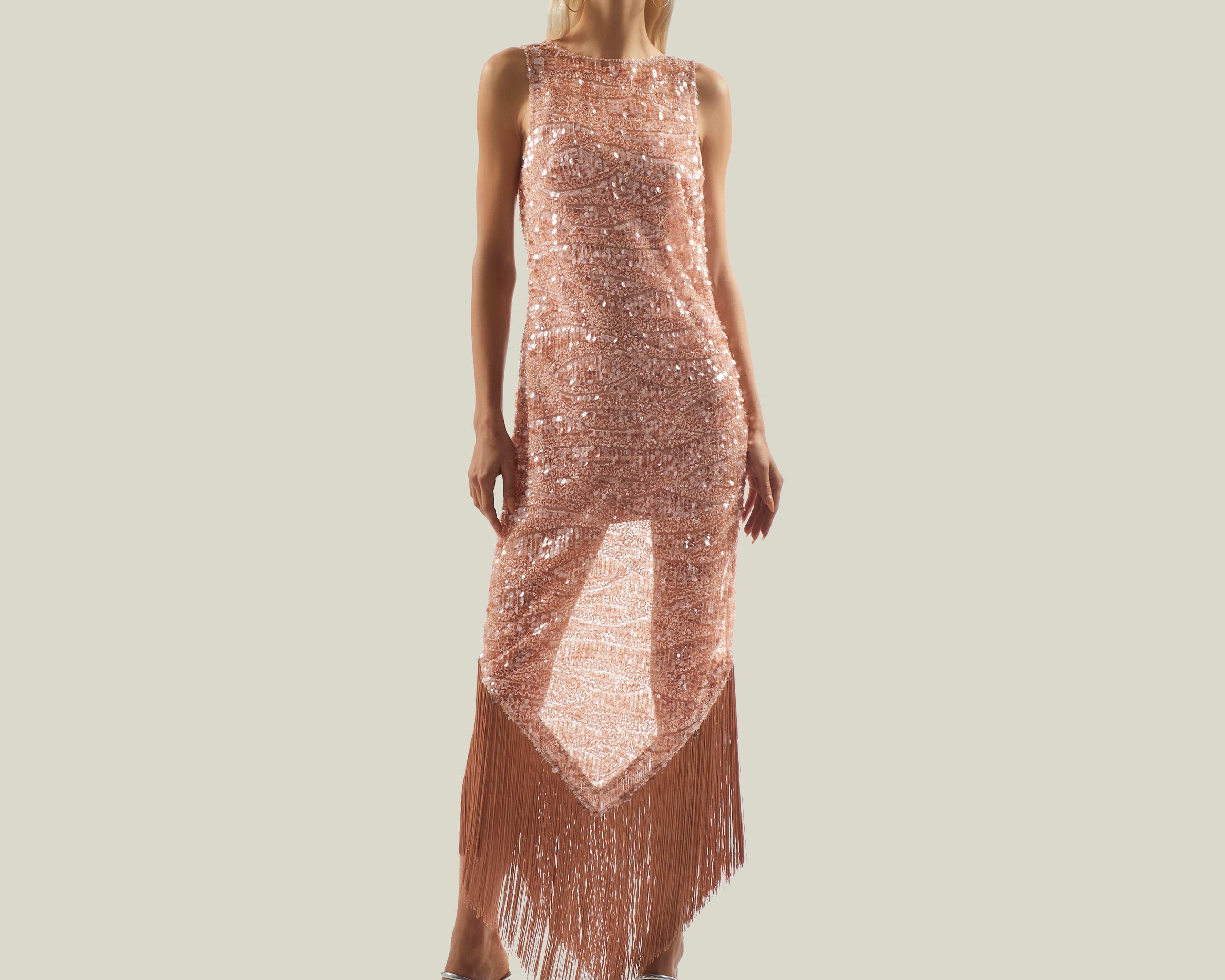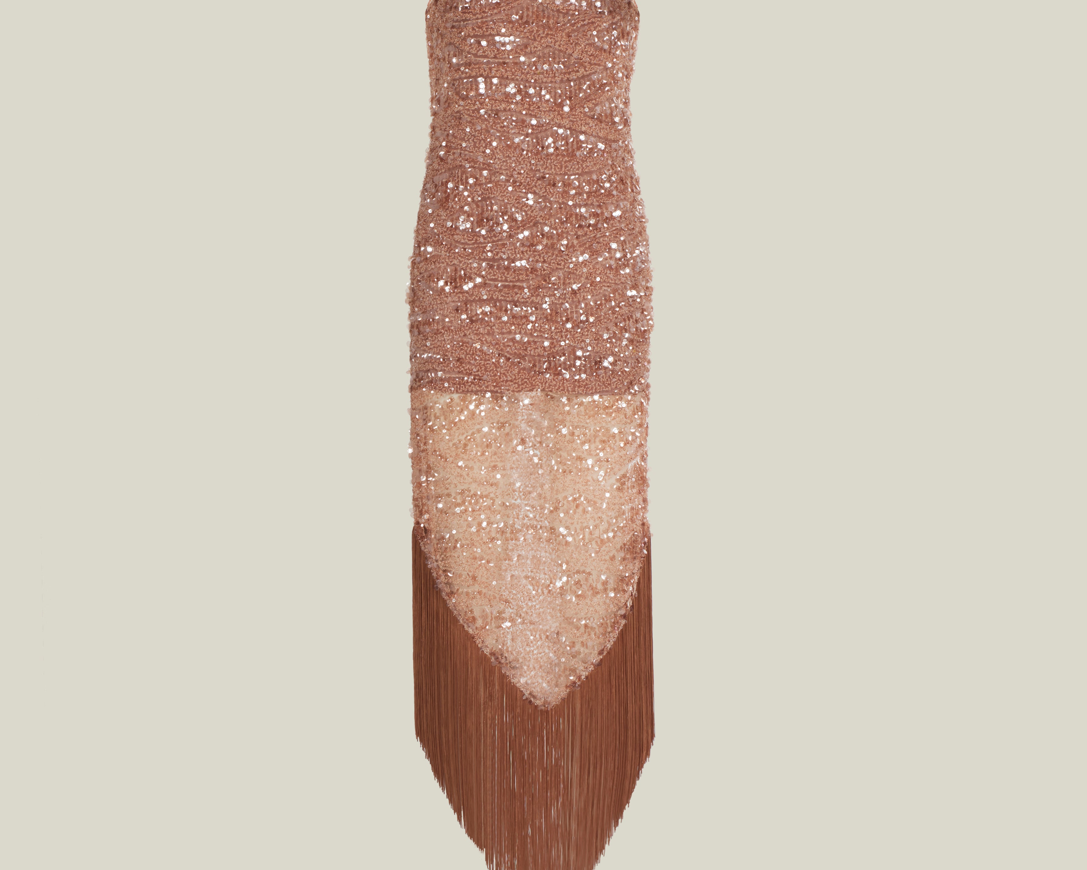 A celebration of light and movement. Sleeveless and cut with a deep V-back, the Taormina is a dazzling column dress crafted from shimmering tulle embroidered with crystal-inspired sequins, creating a spectacle of radiance from every angle. The silhouette is lined with a short slip in fluid viscose-blend crepe cady, subtly enhancing the brilliance and transparency of the outer layer. It finishes in a striking V-shaped hem, entirely trimmed with swaying fringes.