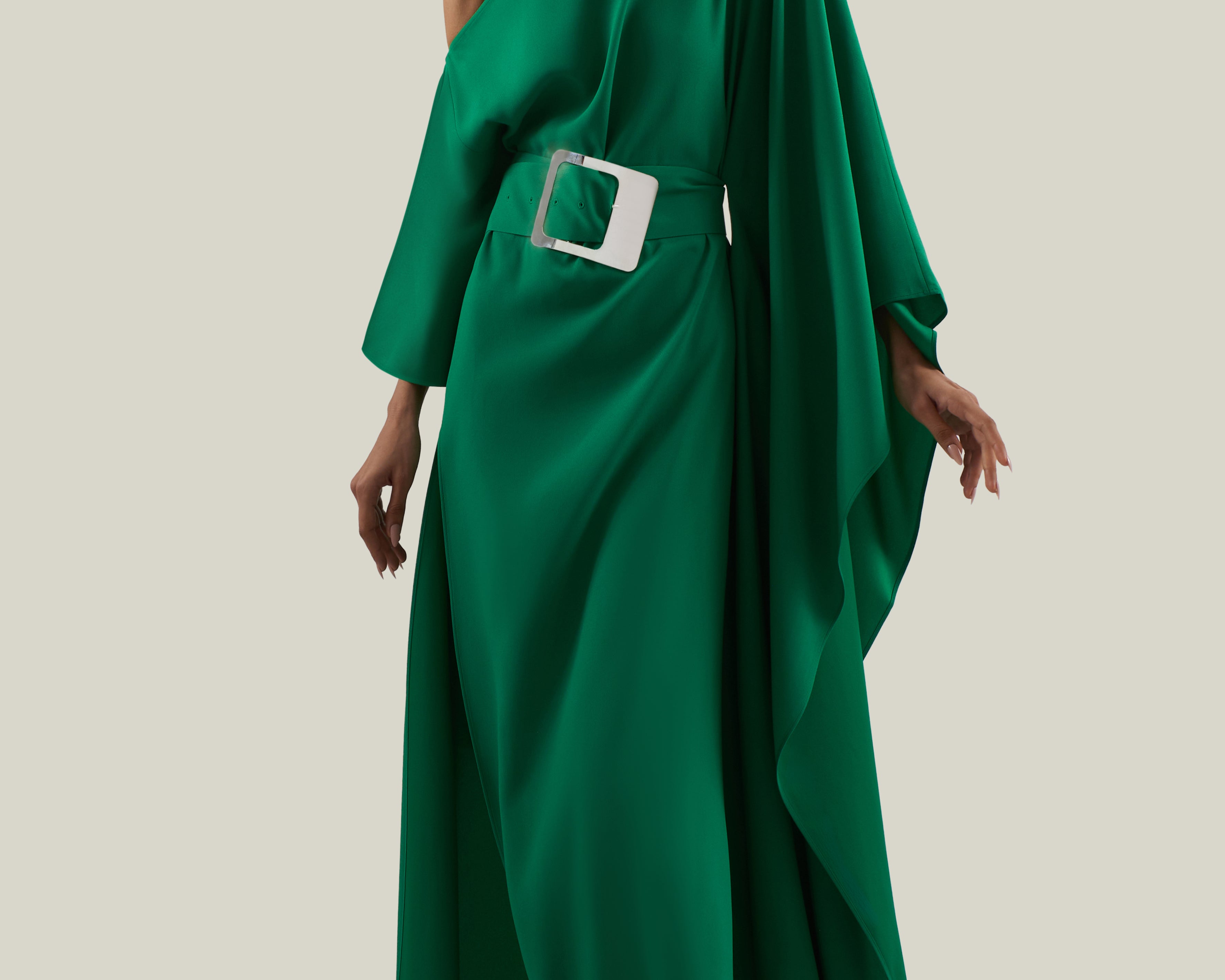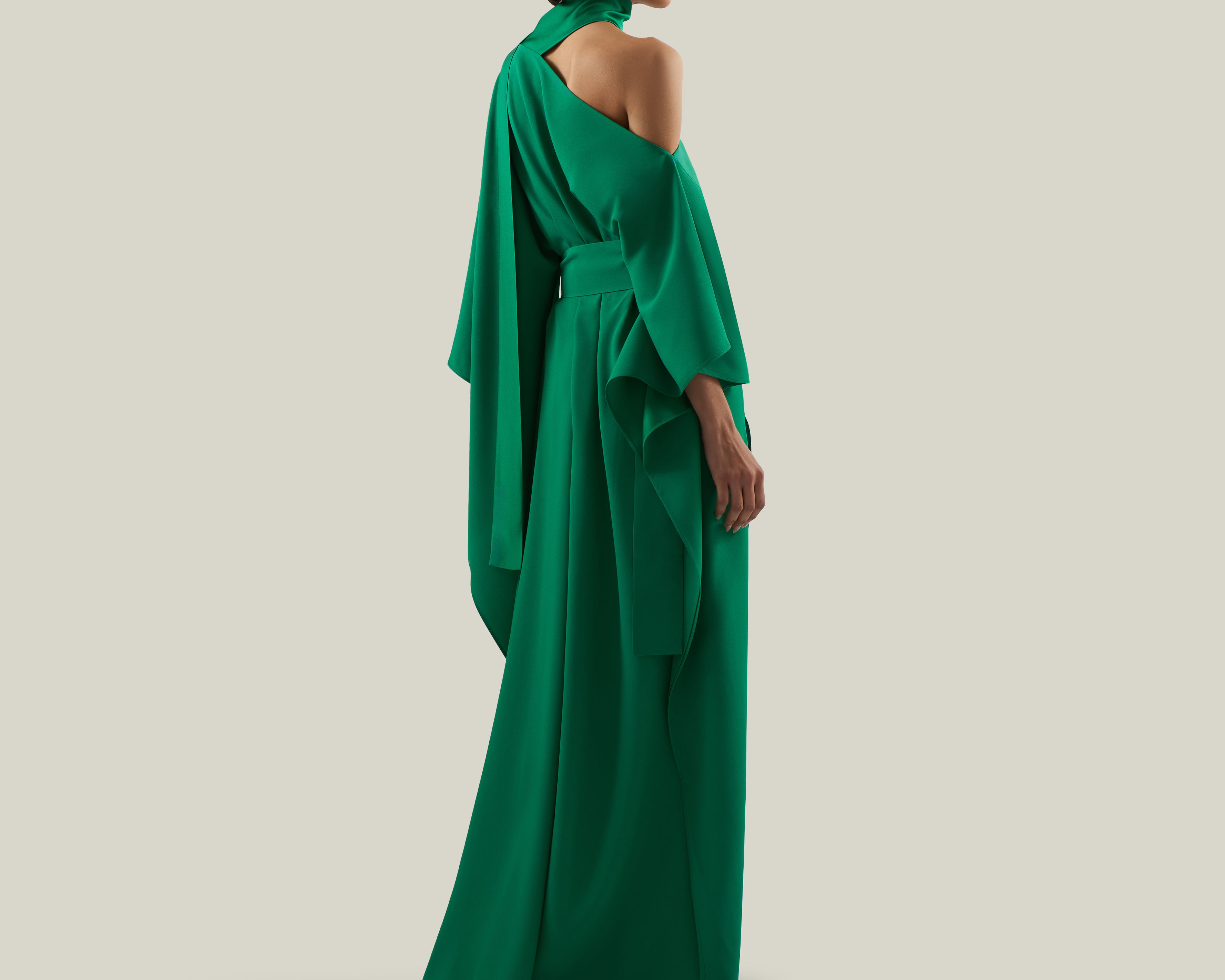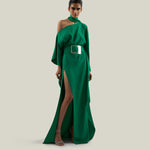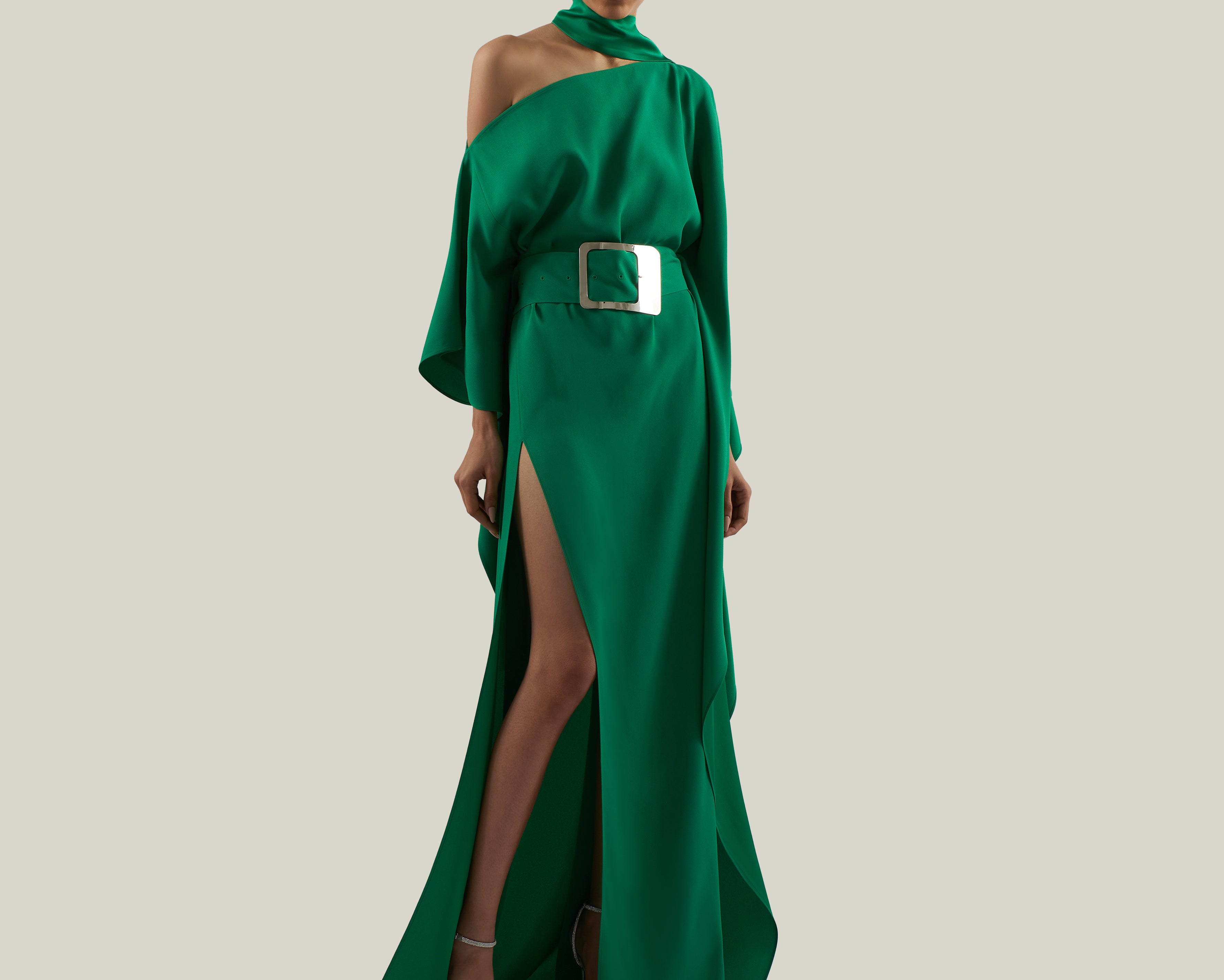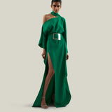 Unstructured glamour. The Taylor Kaftan was designed to make a grand entrance. It features a thigh-high side slit, a cold-shoulder neckline with a scarf. To complete this sleek crepe cady kaftan, a belt with a Space Age-inspired buckle cinches the waist.