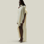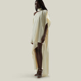 The Trebbia Kaftan was made for sun lovers. It is a one-shoulder deconstructed asymmetrical kaftan made from soft crepe cady. An attached scarf finishes the neckline, giving movement and a laid-back attitude to the garment.